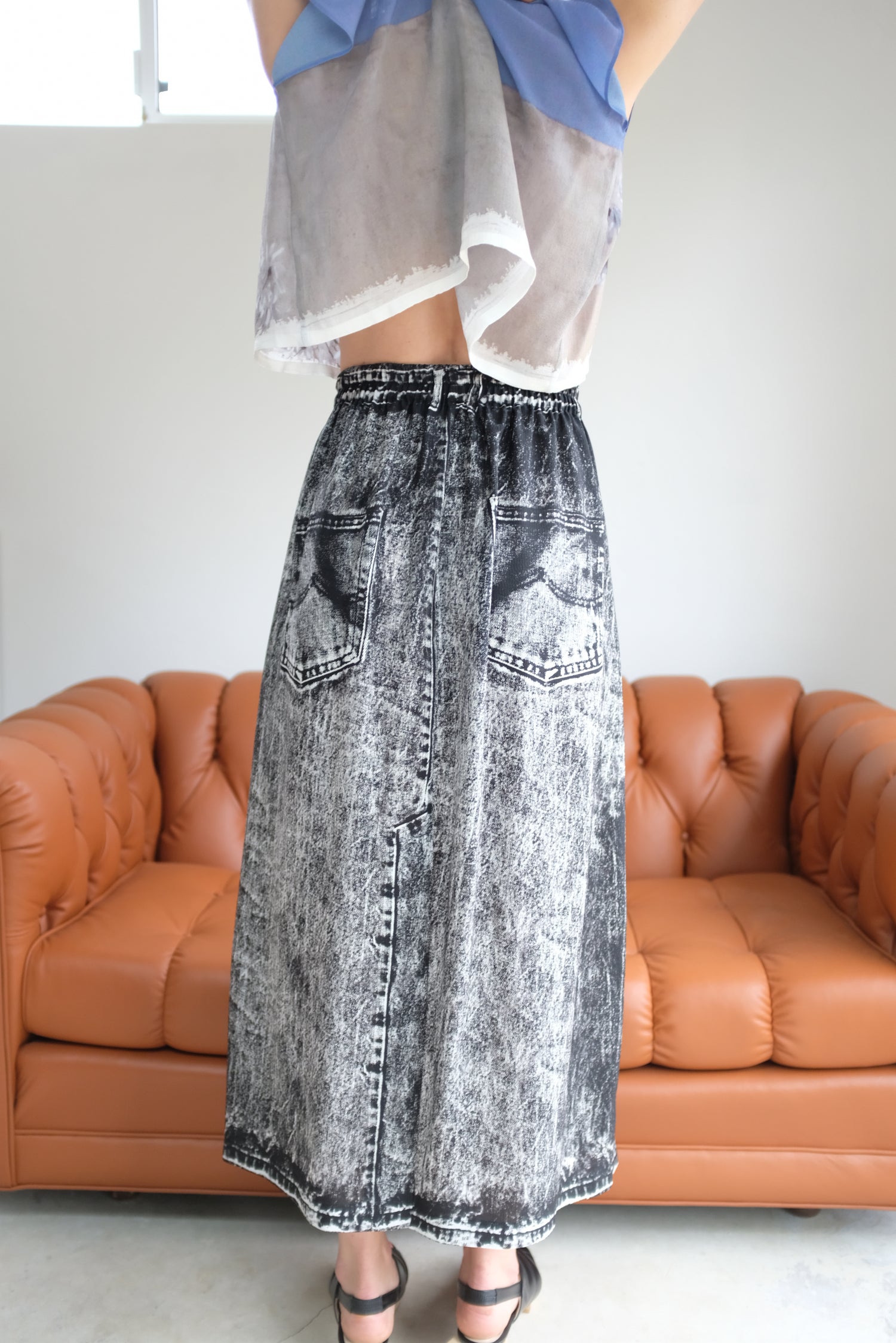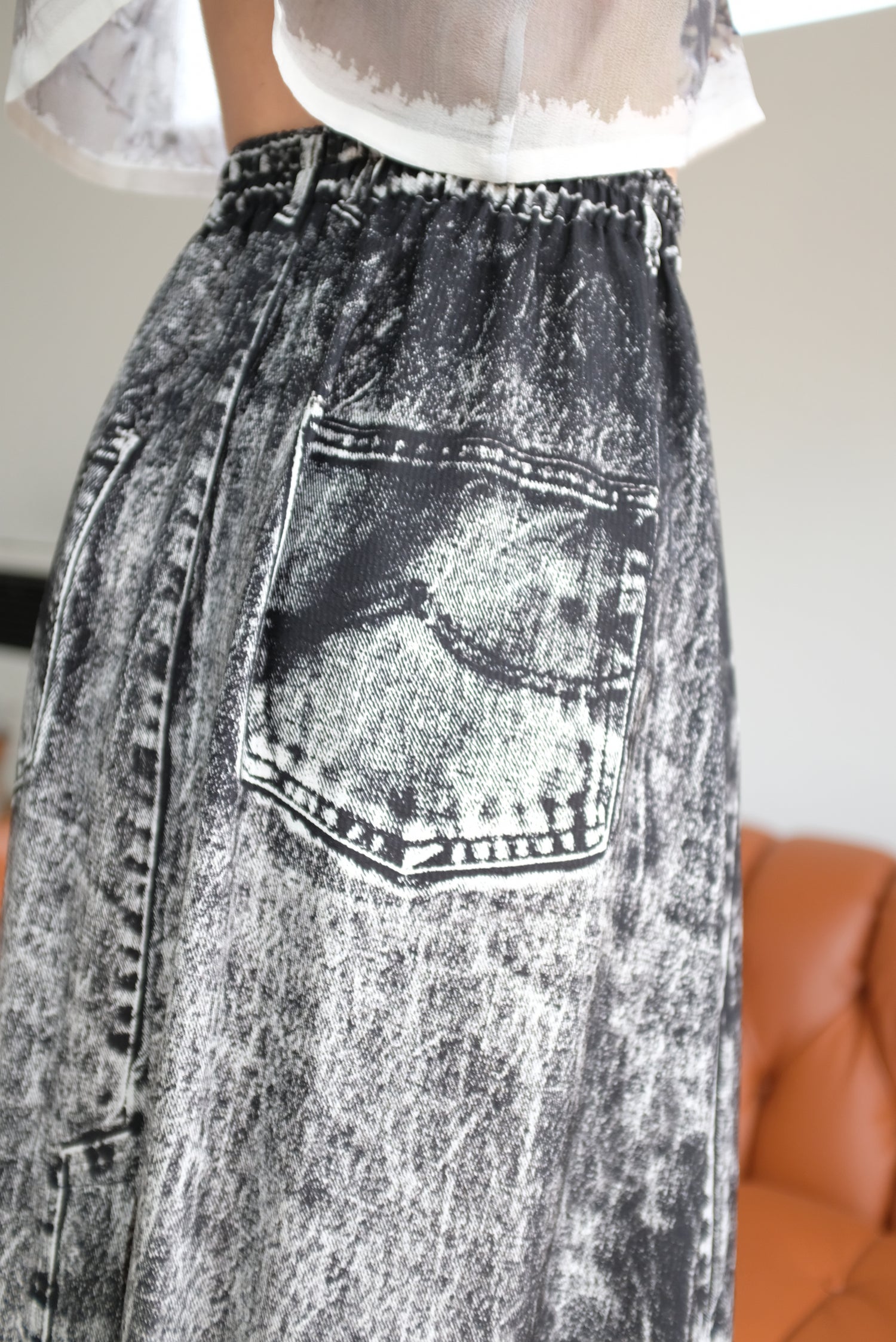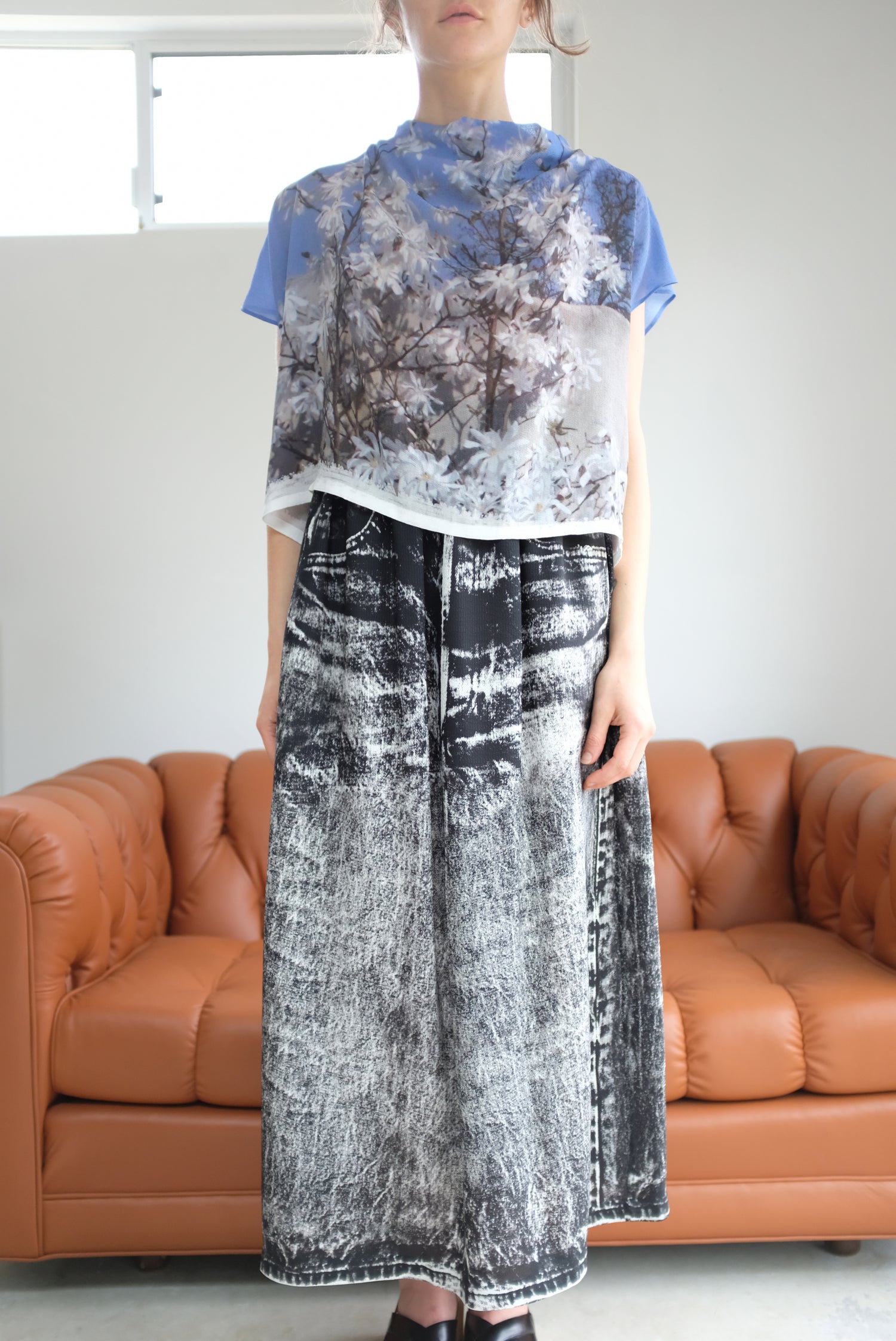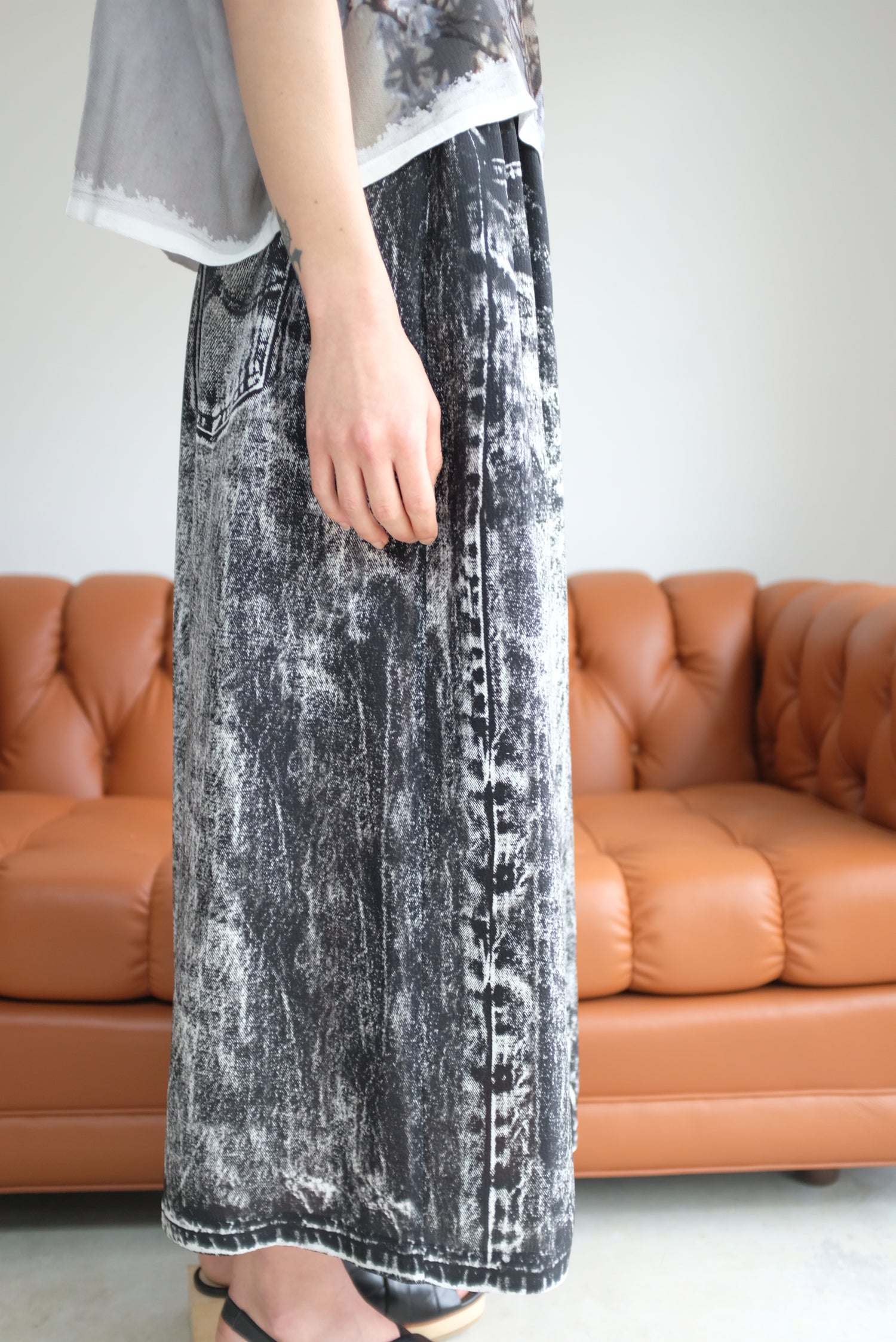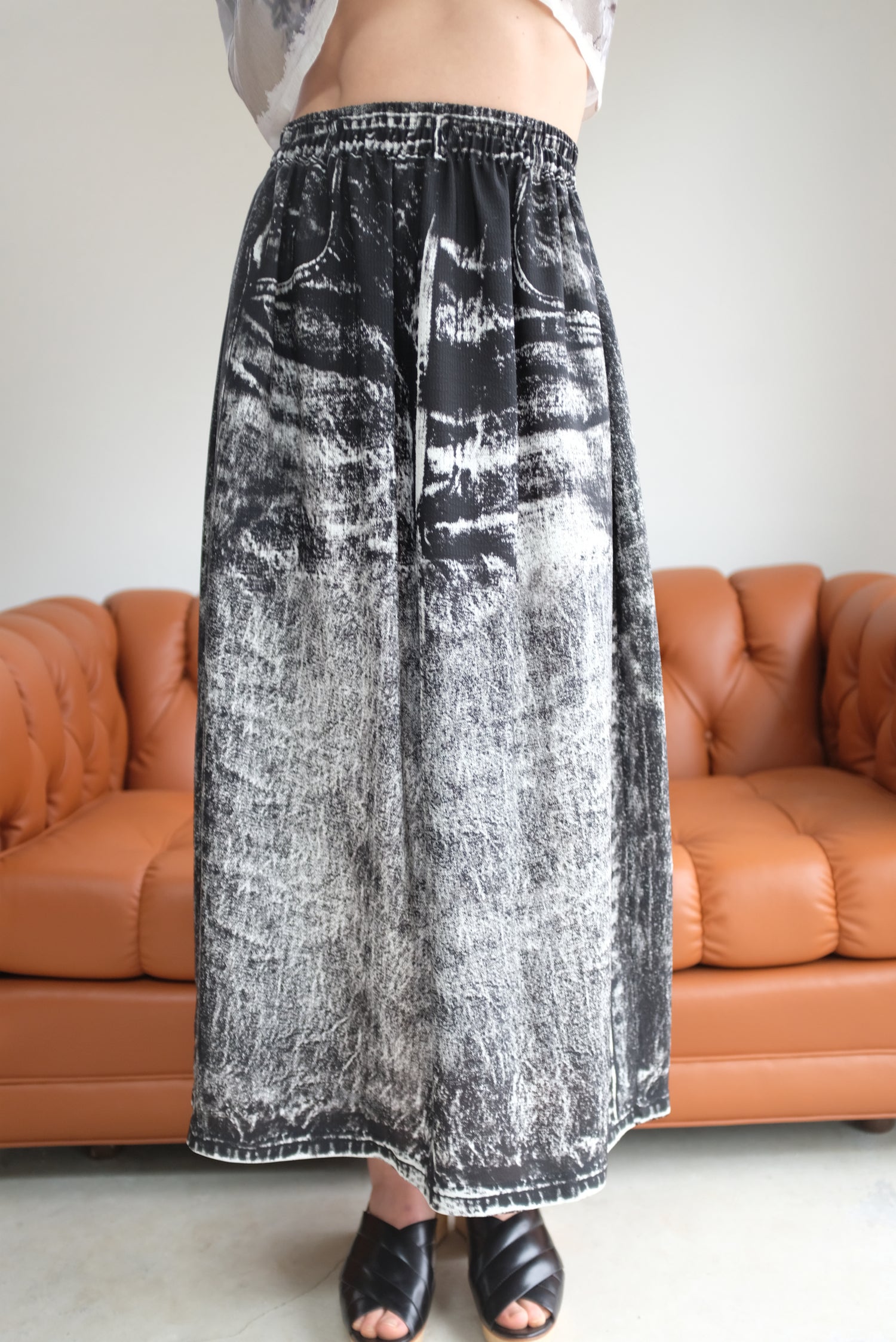 100% Silk. Elastic waist, flowing and easy fitting silk, hidden side pockets, enclosed seams, back slit.