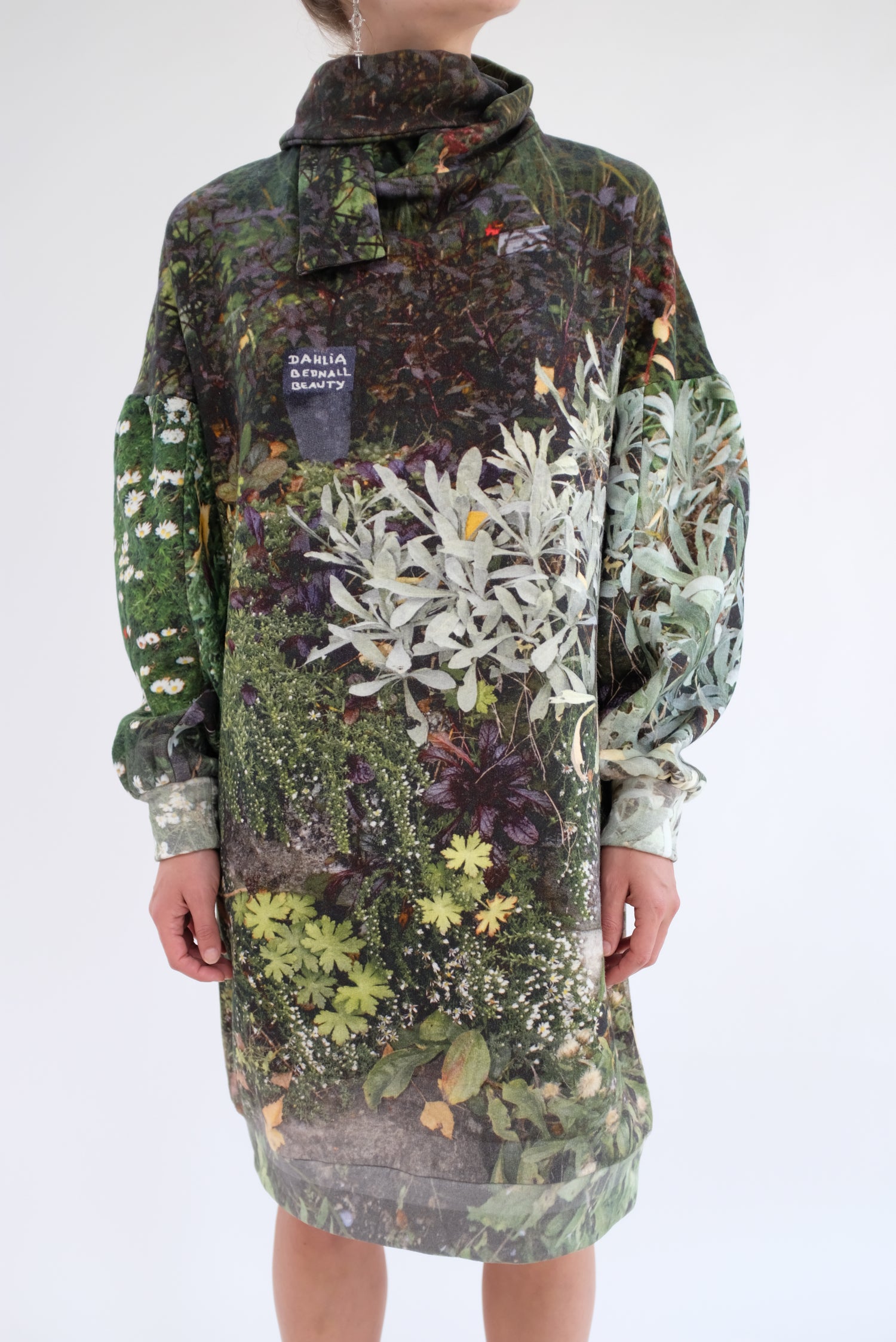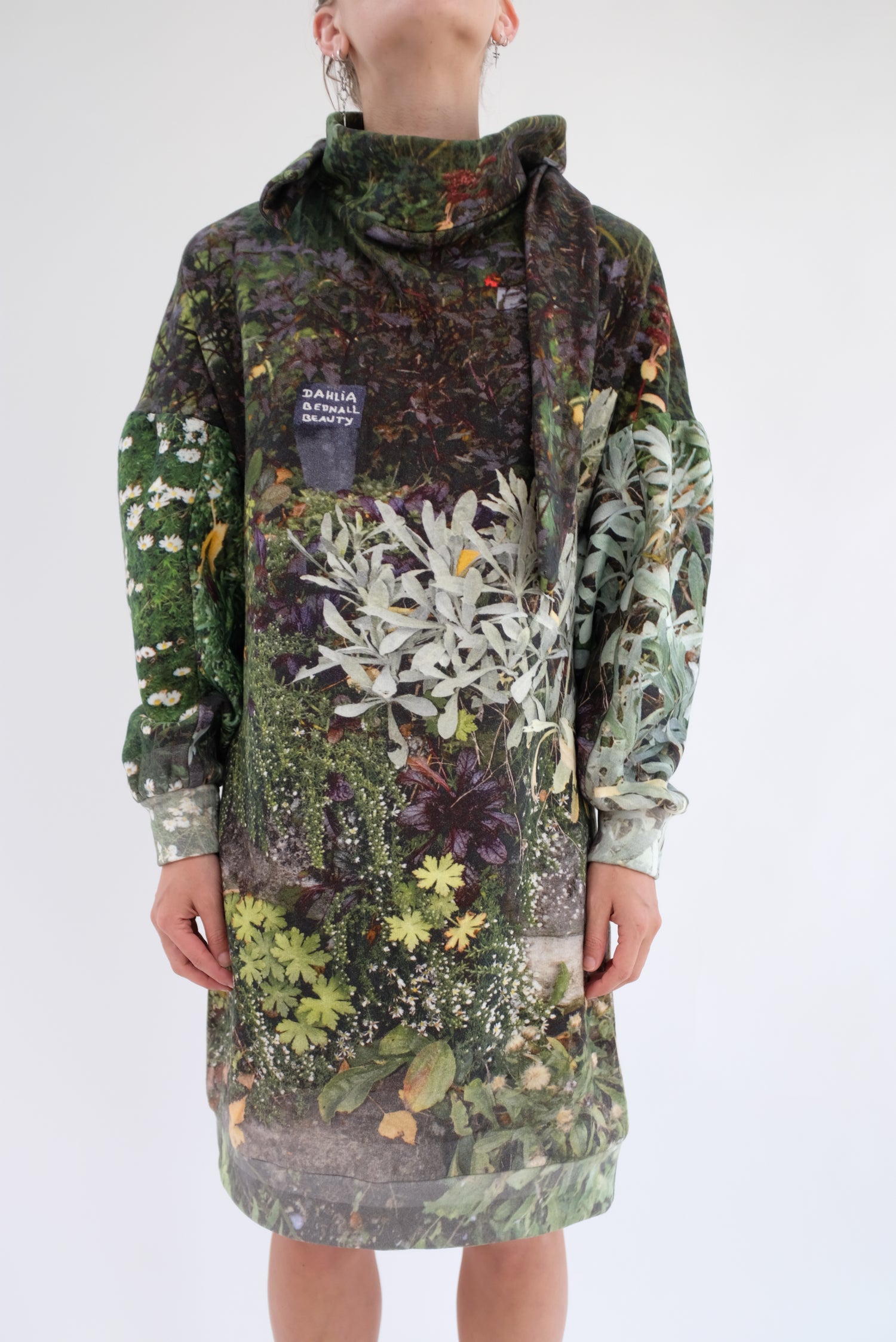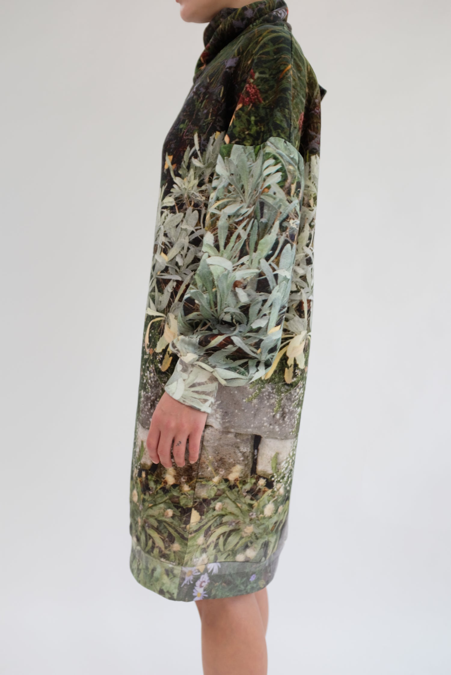 Luxurious soft thick fleece dress, gorgeous floral print, one size fits most. Mock neck with ties, long full sleeves, loose fitting. 100% Organic Cotton.