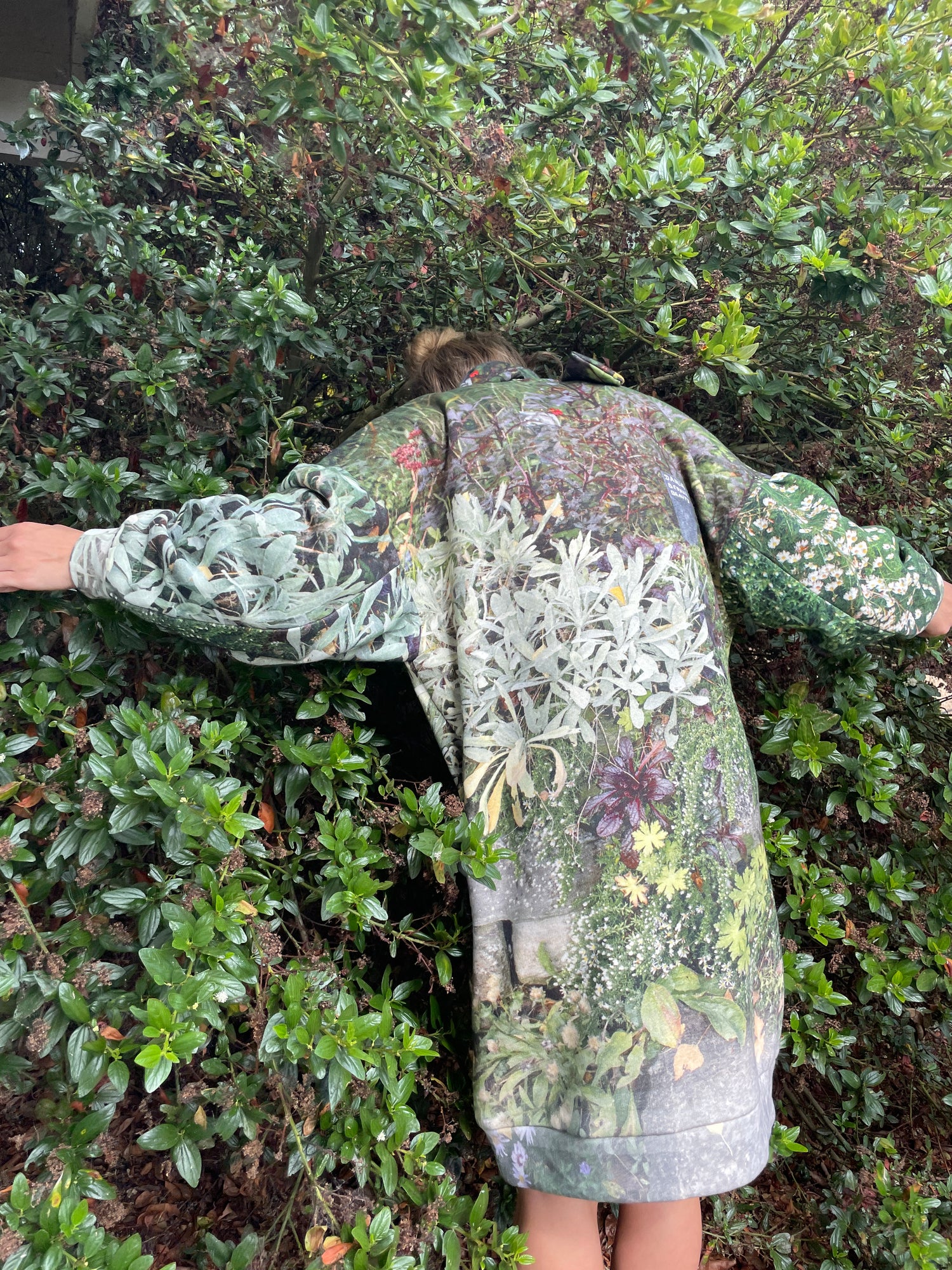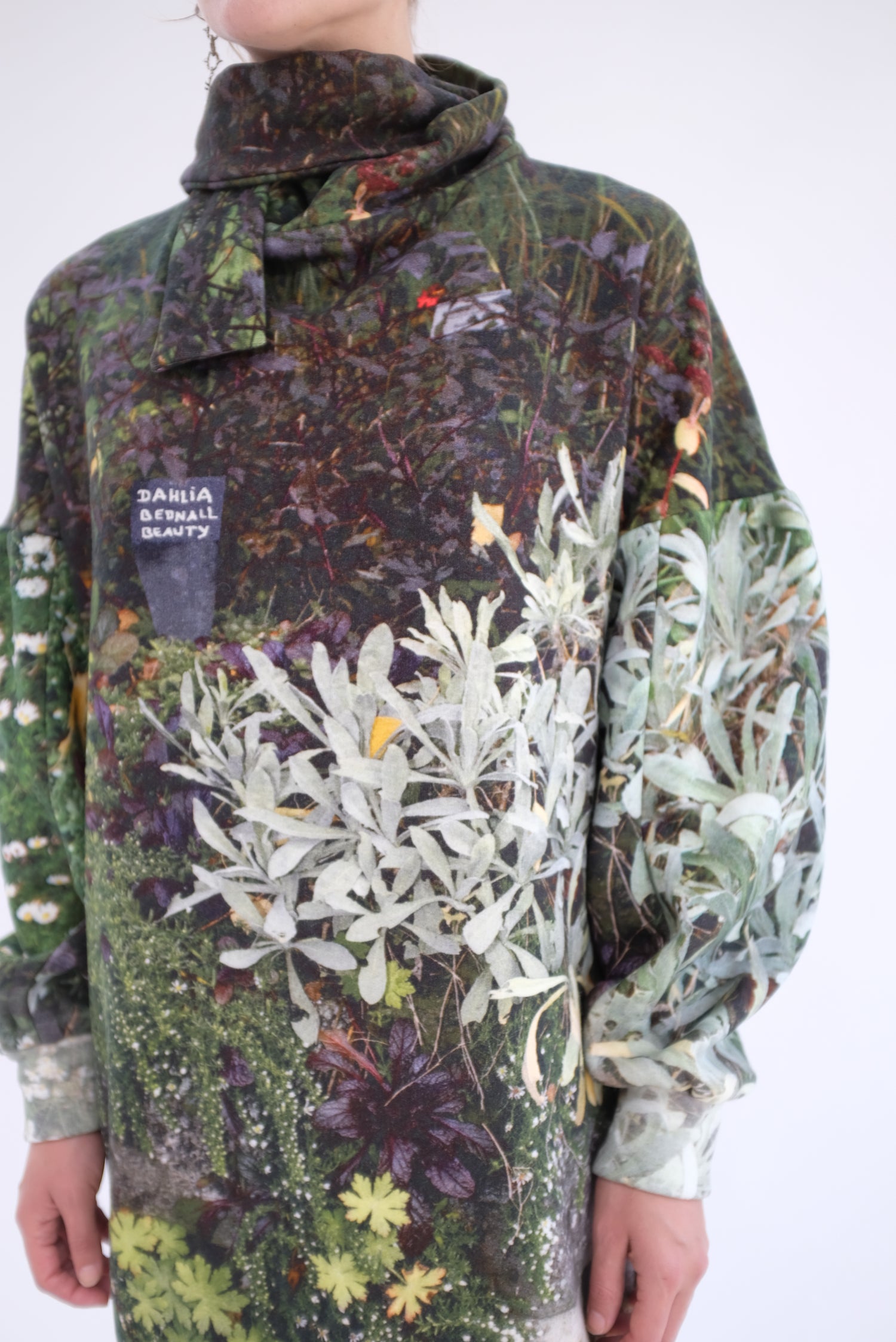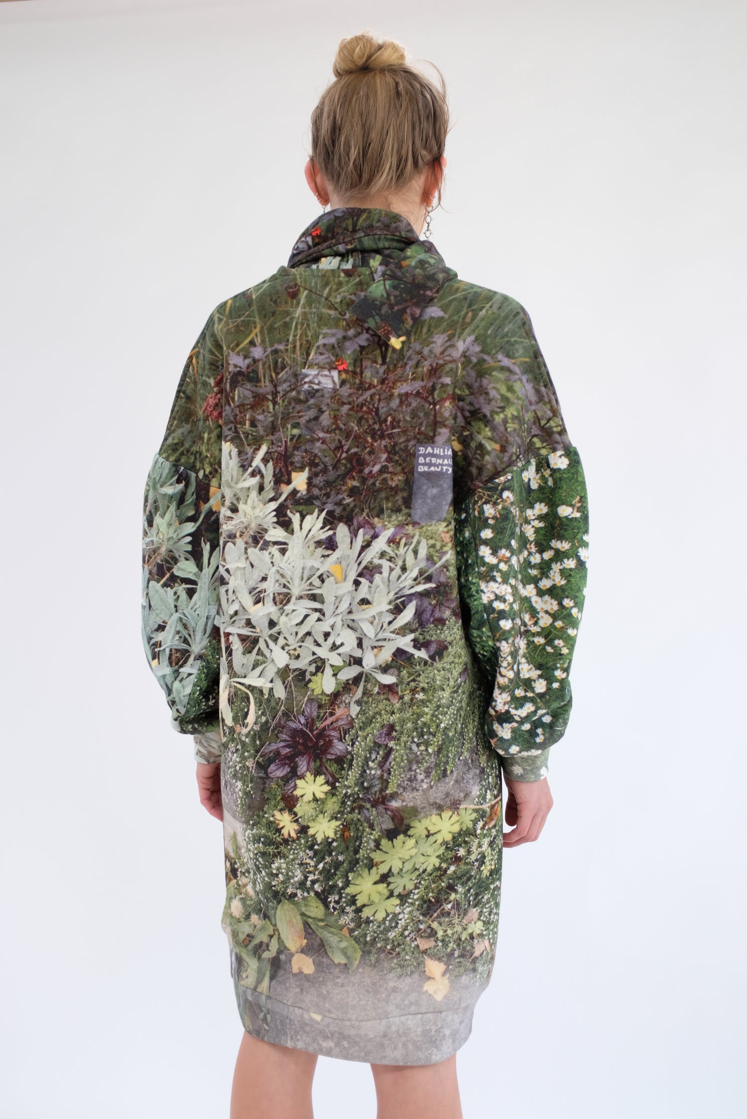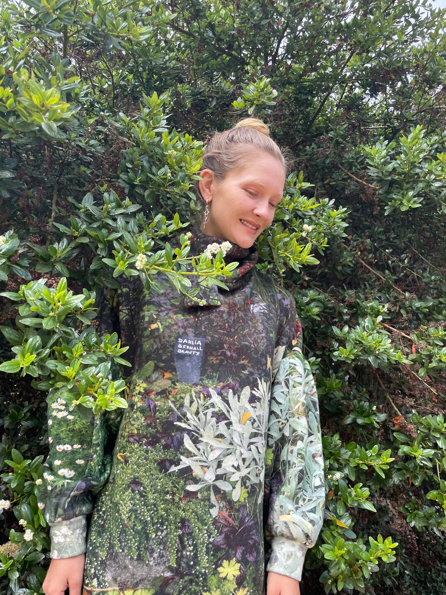 Luxurious soft thick fleece dress, gorgeous floral print, one size fits most. Mock neck with ties, long full sleeves, loose fitting. 100% Organic Cotton.