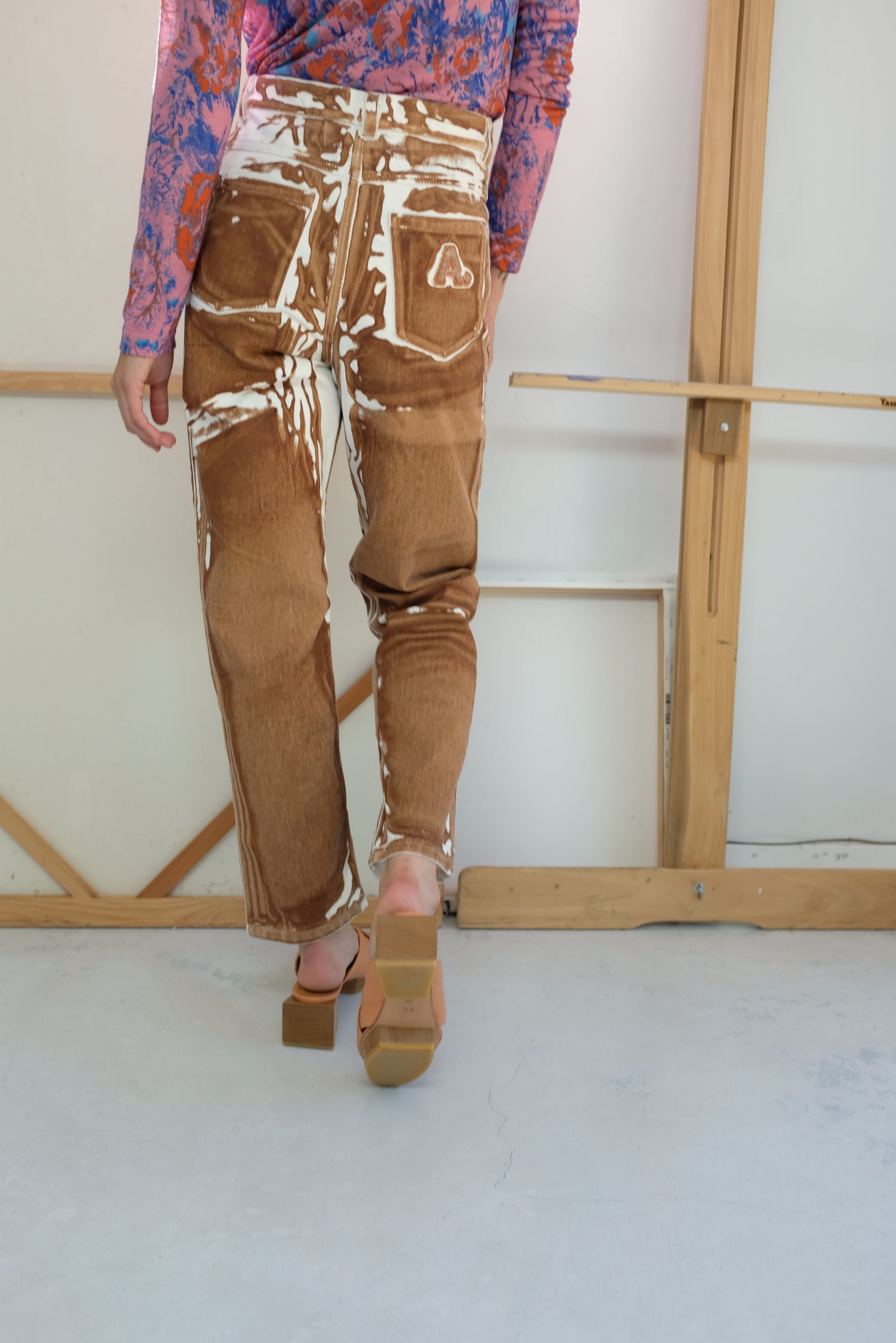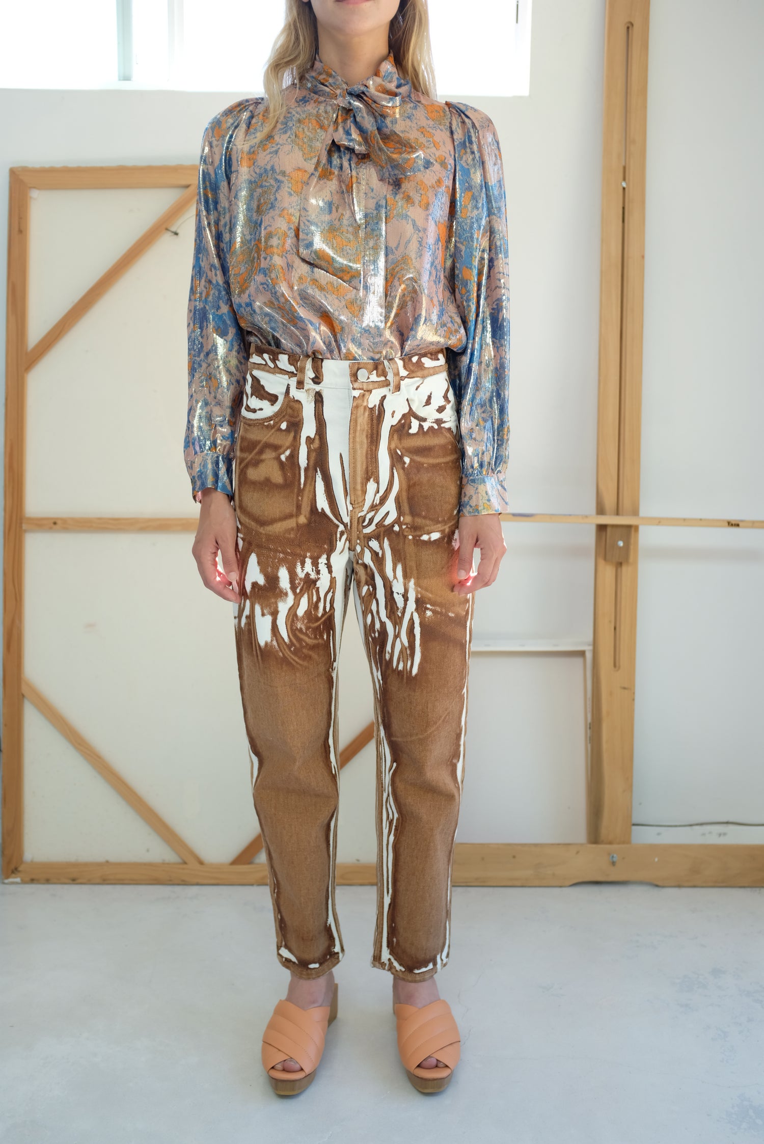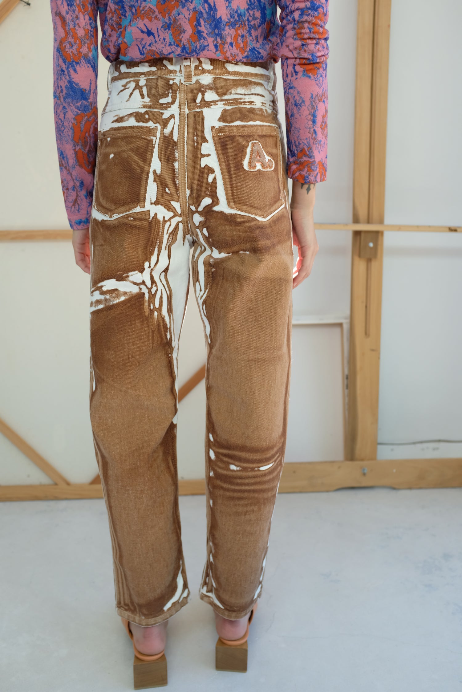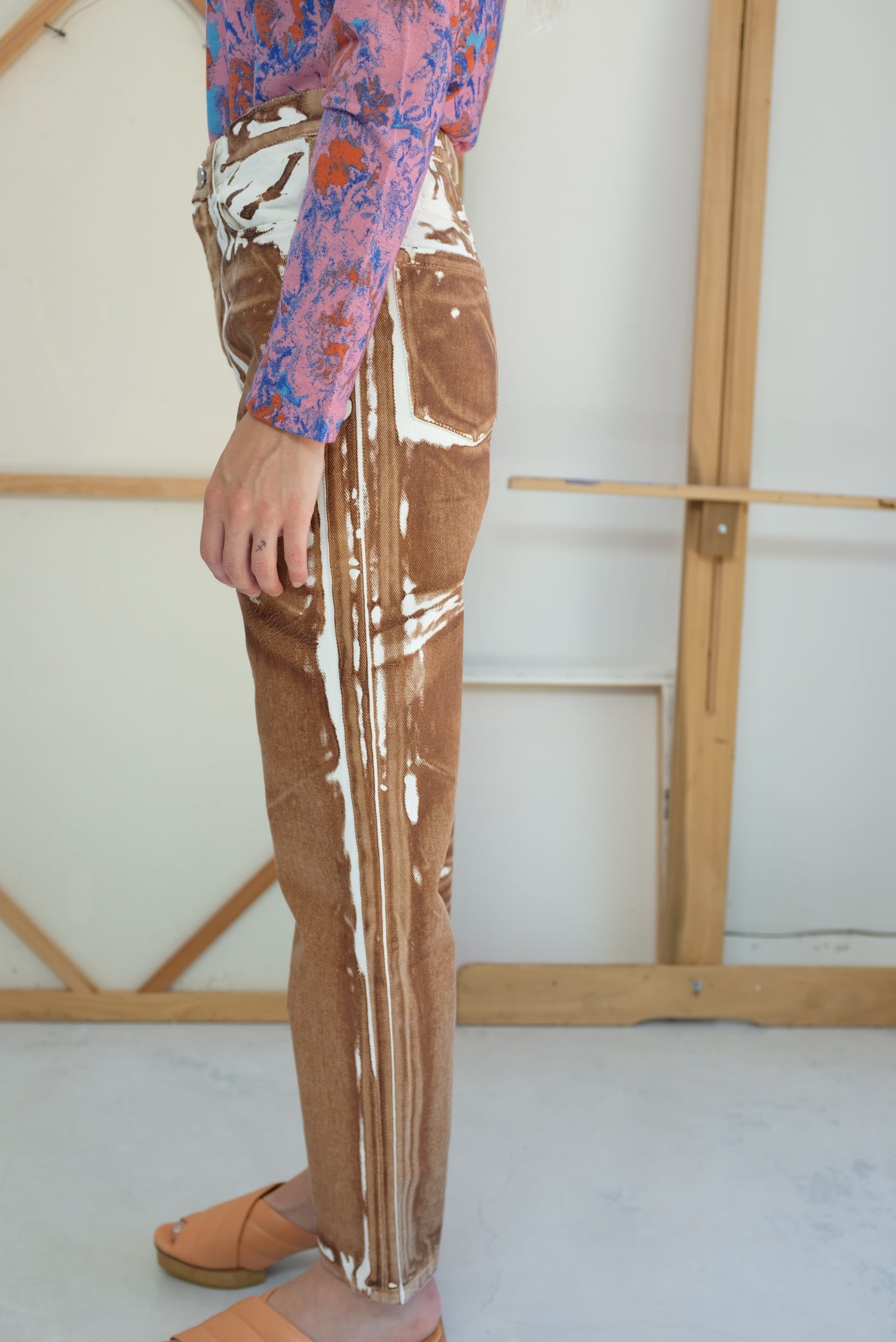 Denim screen printed pant. Zippered and button closure at waist, 4 pocket jean. Relaxed fit. 100% Cotton.