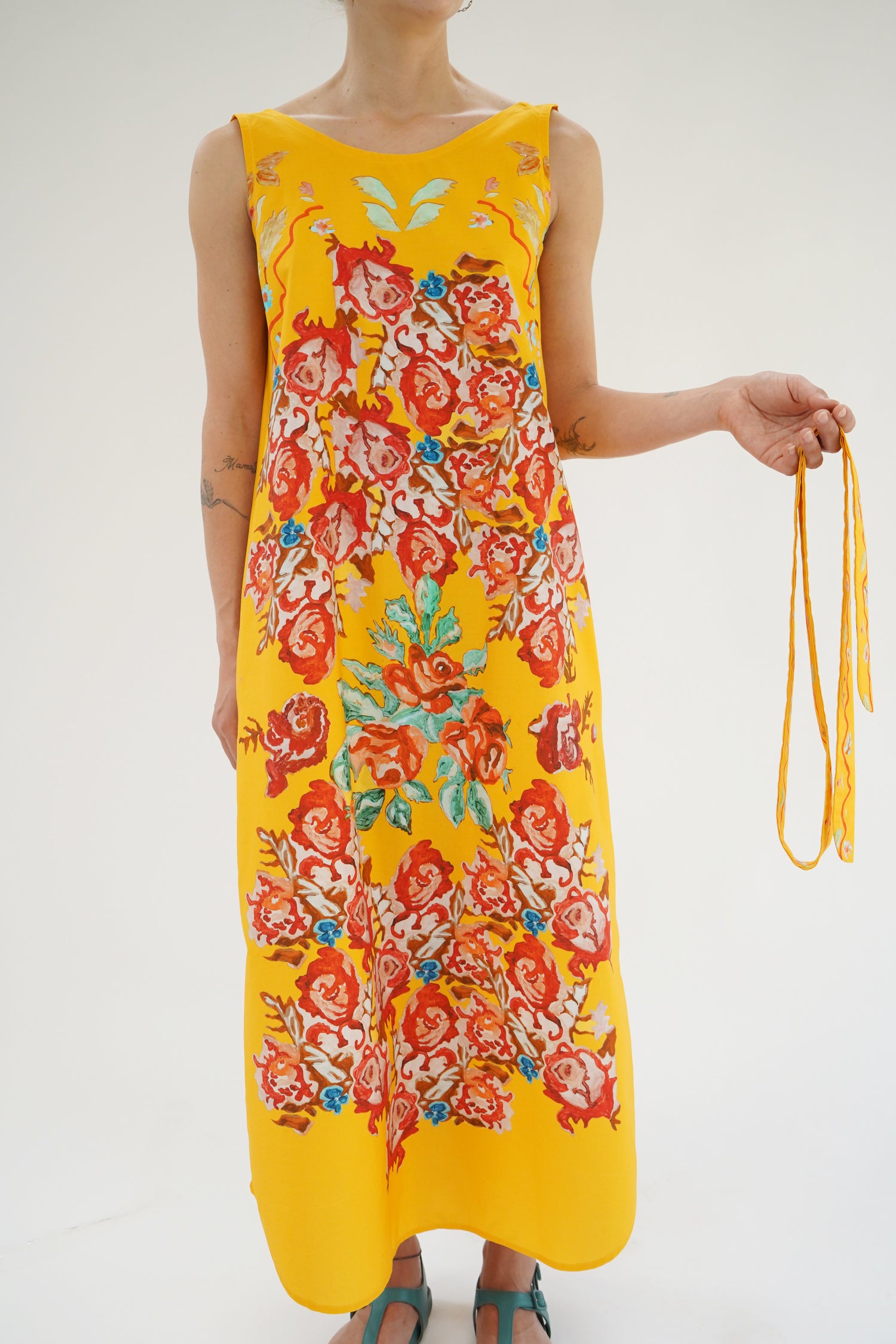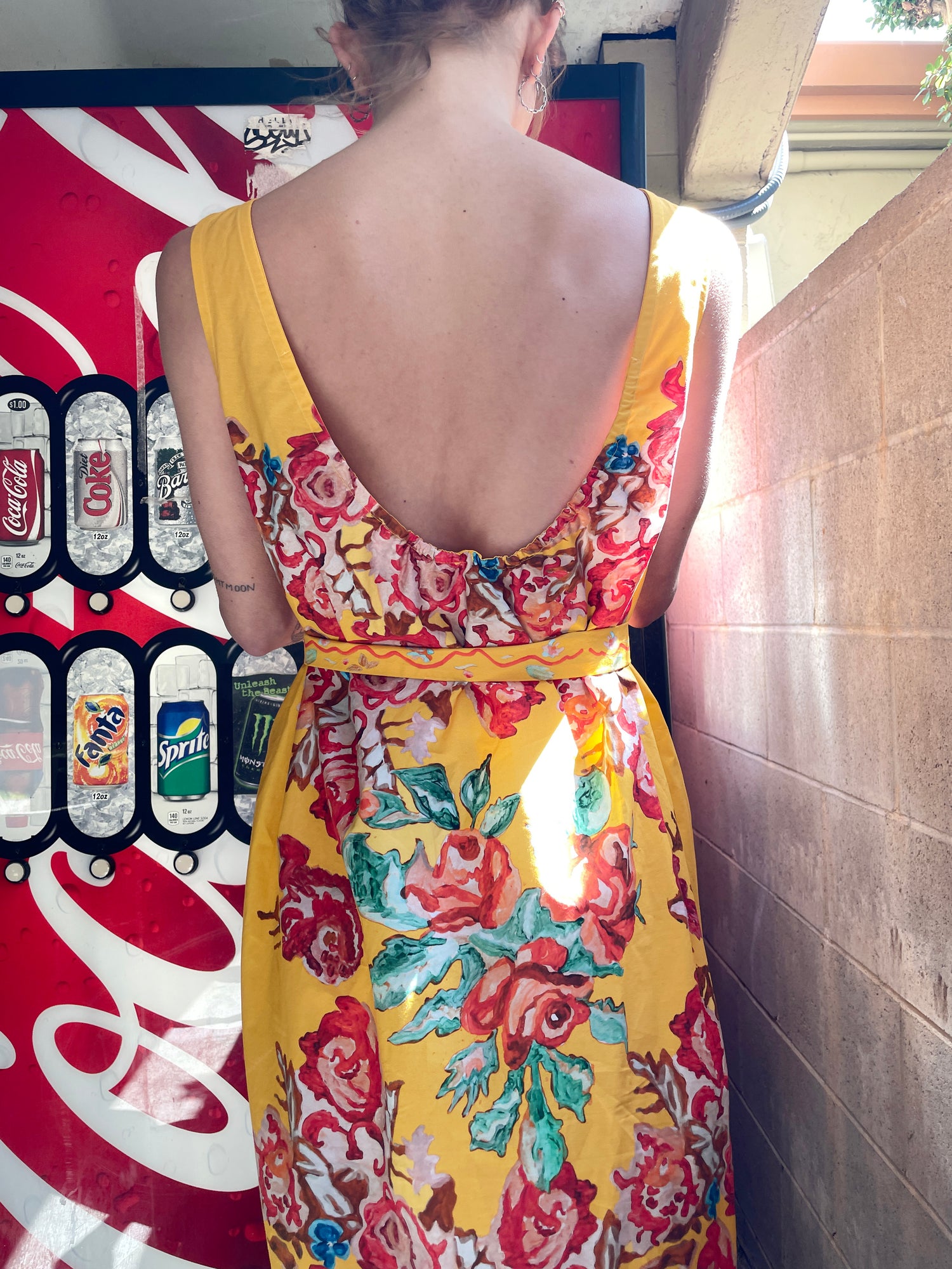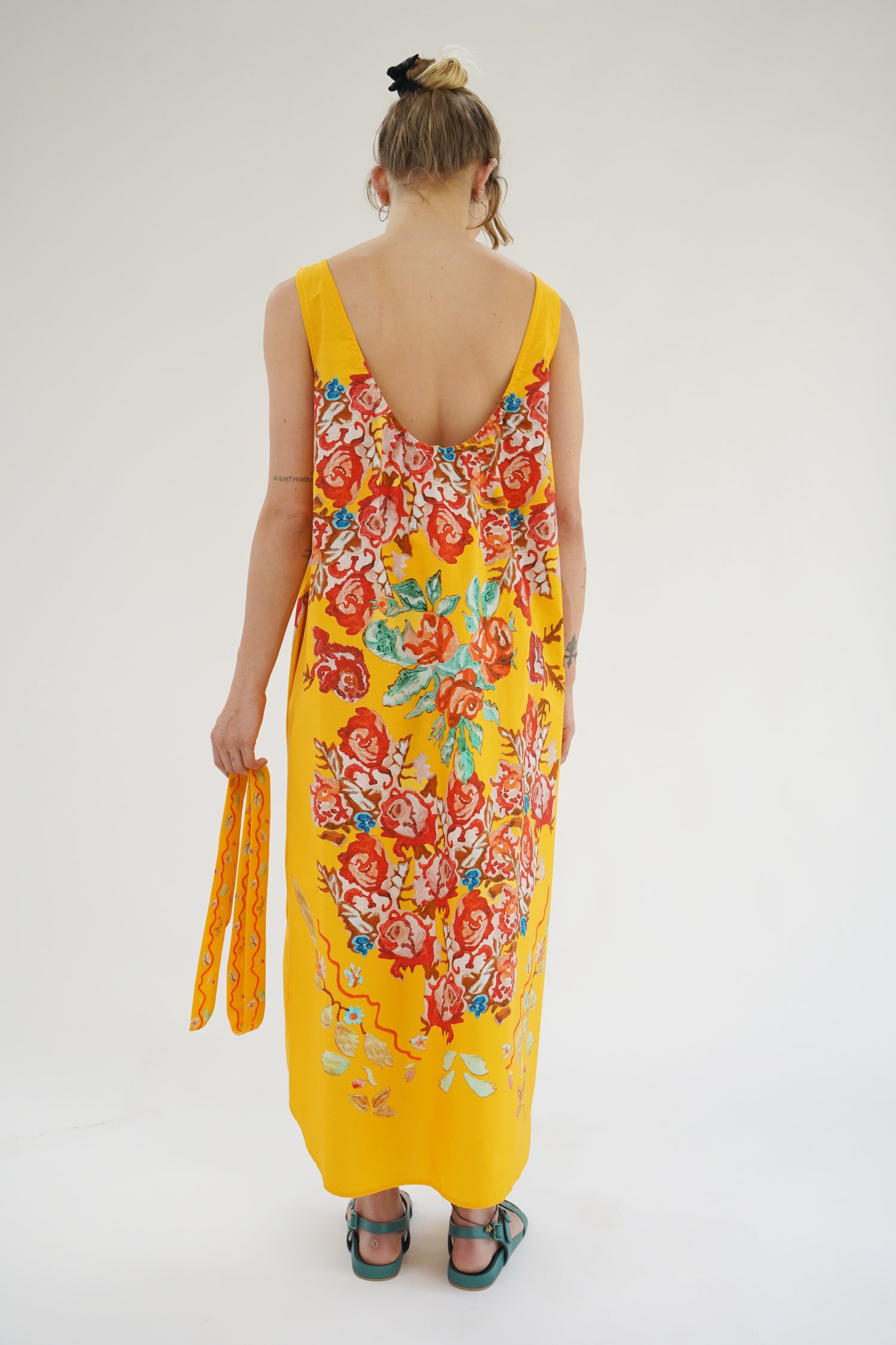 Stunning vibrant yellow tank dress with gorgeous flower print. Low scooped back, side pockets, matching tie belt, loose fitting, enclosed seams. One size fits most. 100% Organic Cotton.
