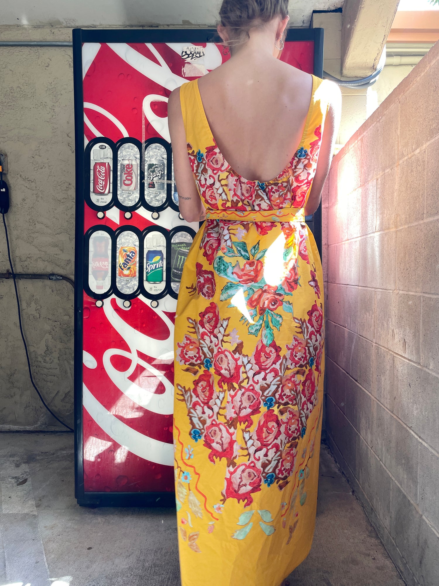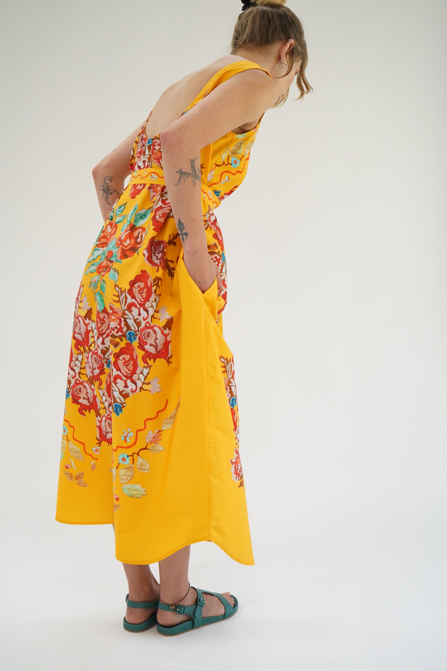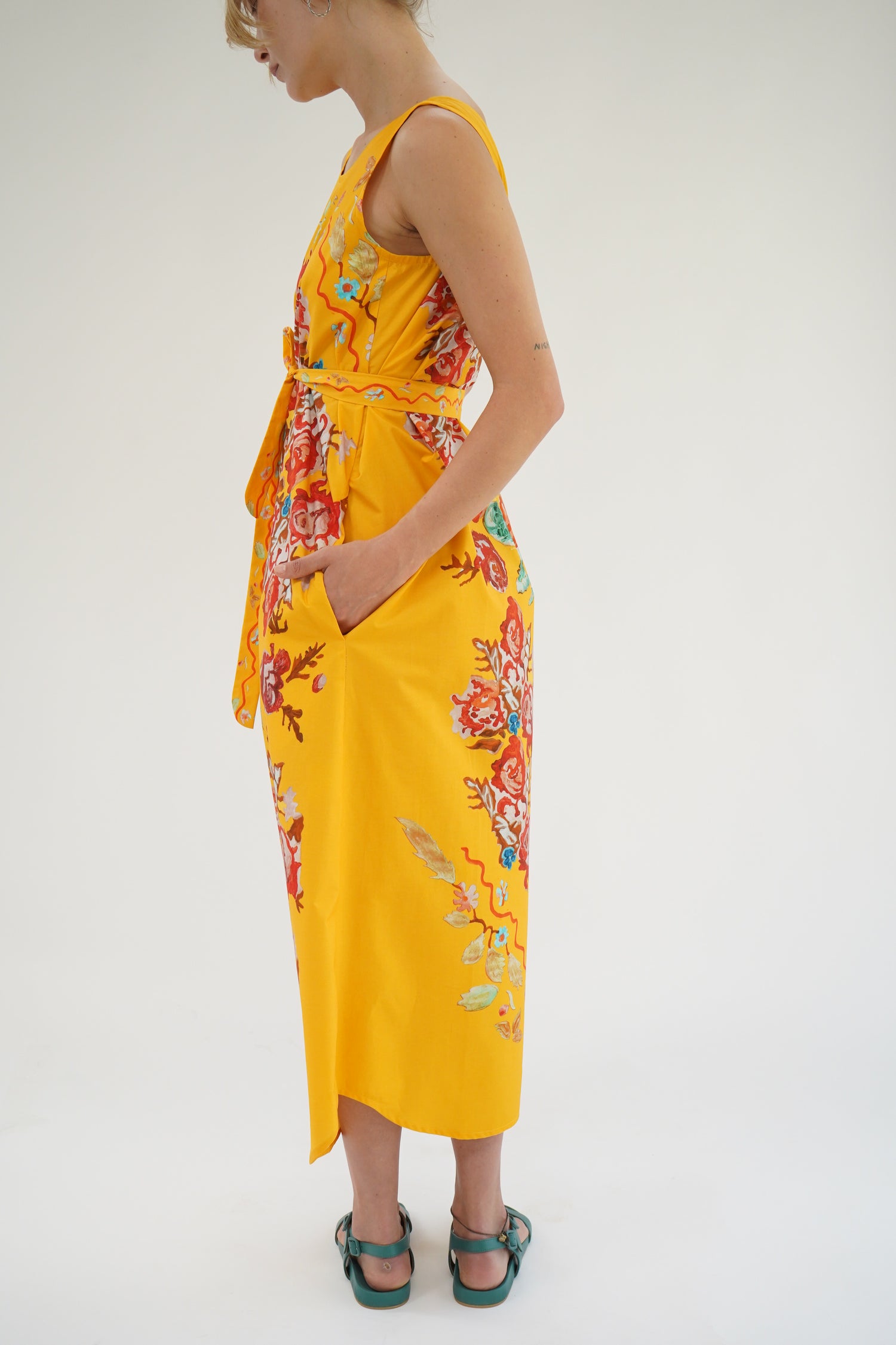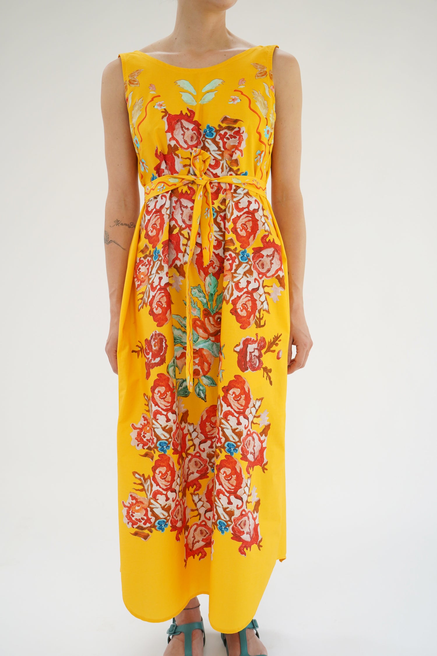 Stunning vibrant yellow tank dress with gorgeous flower print. Low scooped back, side pockets, matching tie belt, loose fitting, enclosed seams. One size fits most. 100% Organic Cotton.