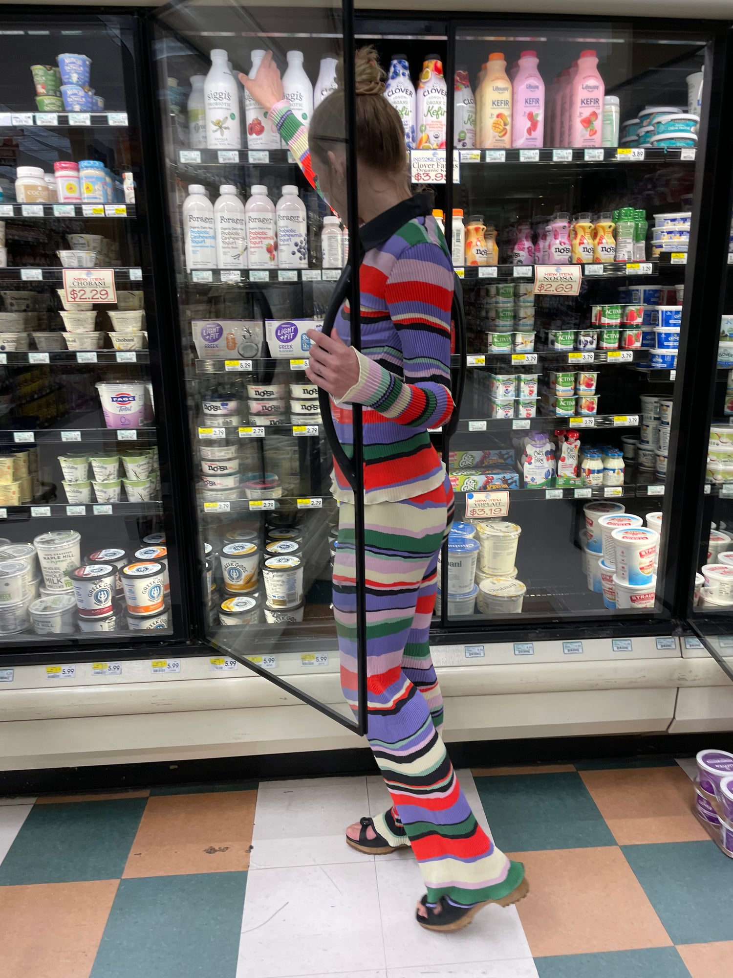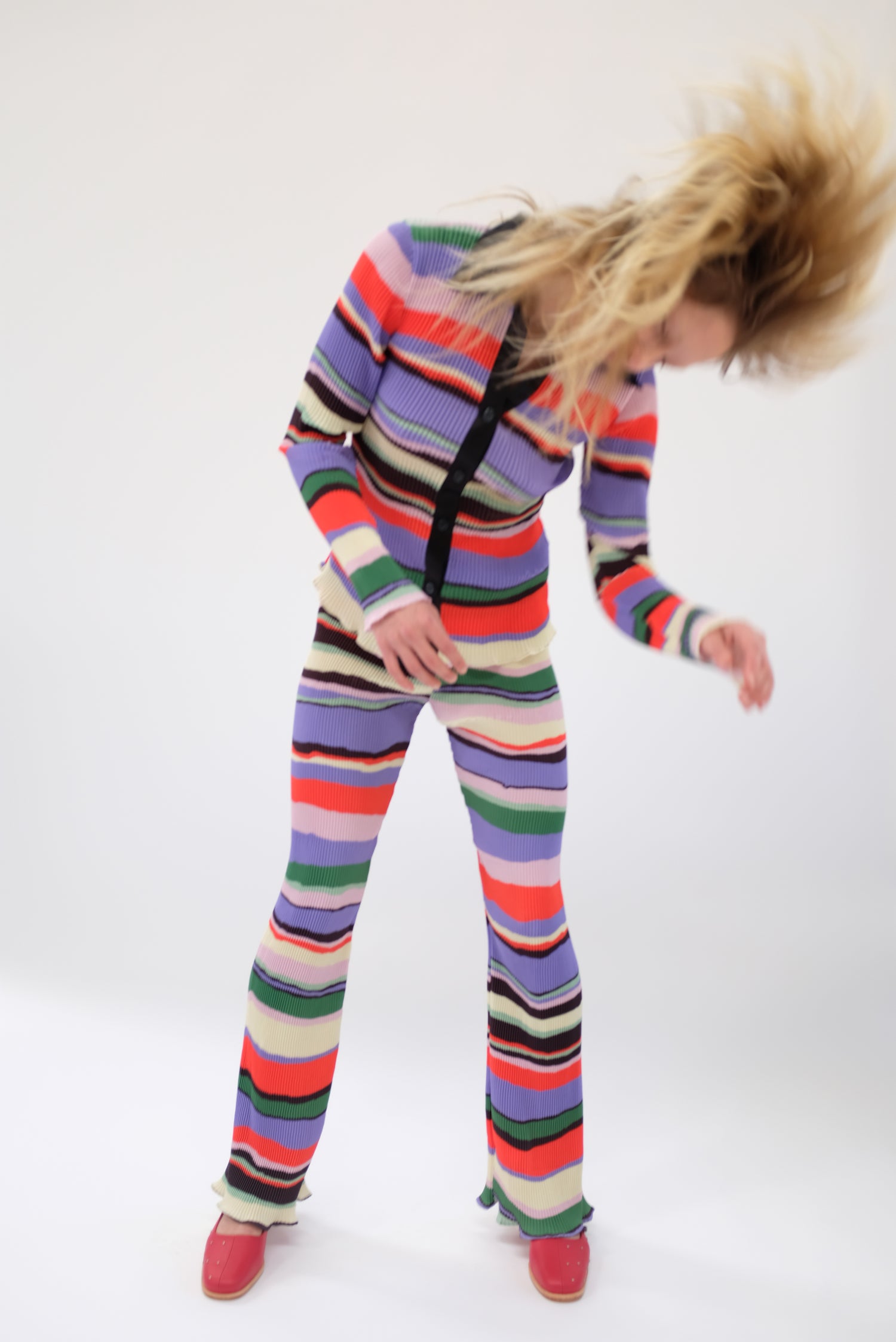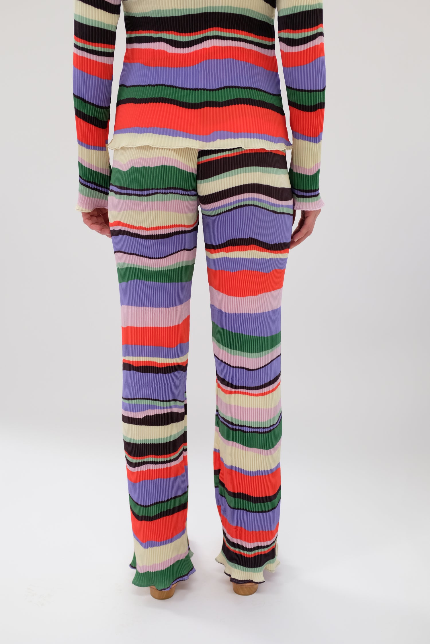 Lovingly handmade pleated pants, straight leg, designed for a close fit. High, gentle elastic waist. Baby overlocked hems create slight fluting at hem. Pleats allow for substantial stretch through body. 100% Polyester.
