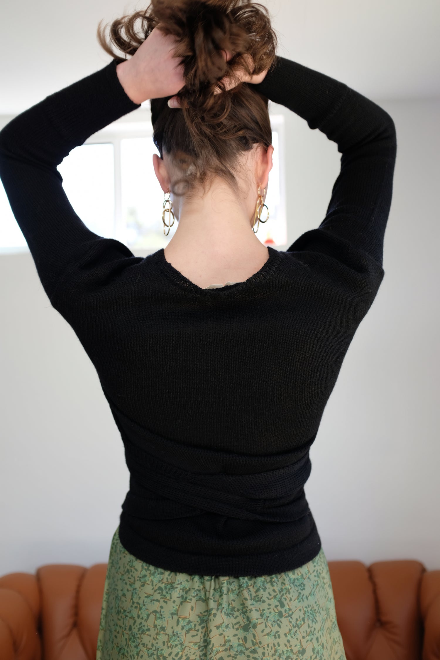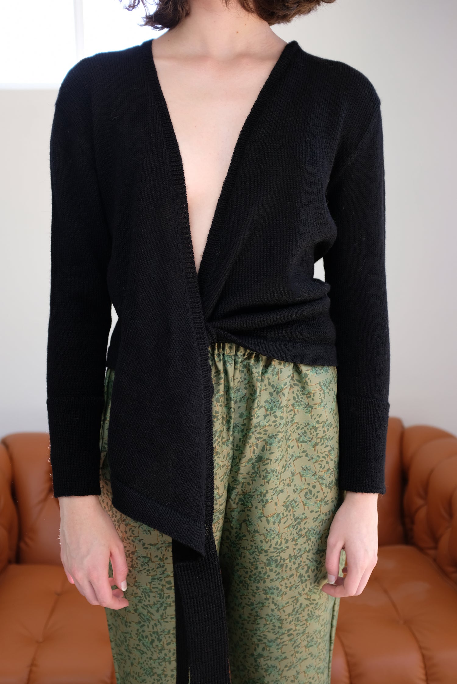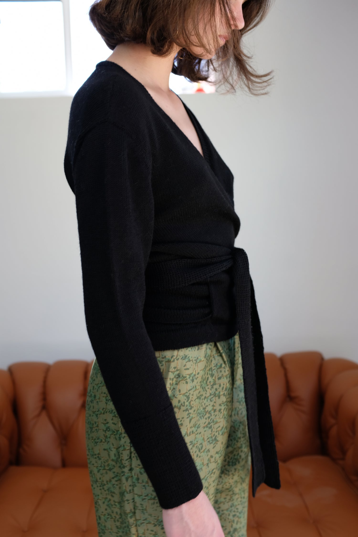 100% Alpaca classic ballet wrap cardigan sweater, medium weight, 4” ribbed cuffs, long sleeves, 2" wide adjustable wrap ties, ties can be worn in front or back, etc. Model is wearing size small/medium. Exclusive to Beklina.