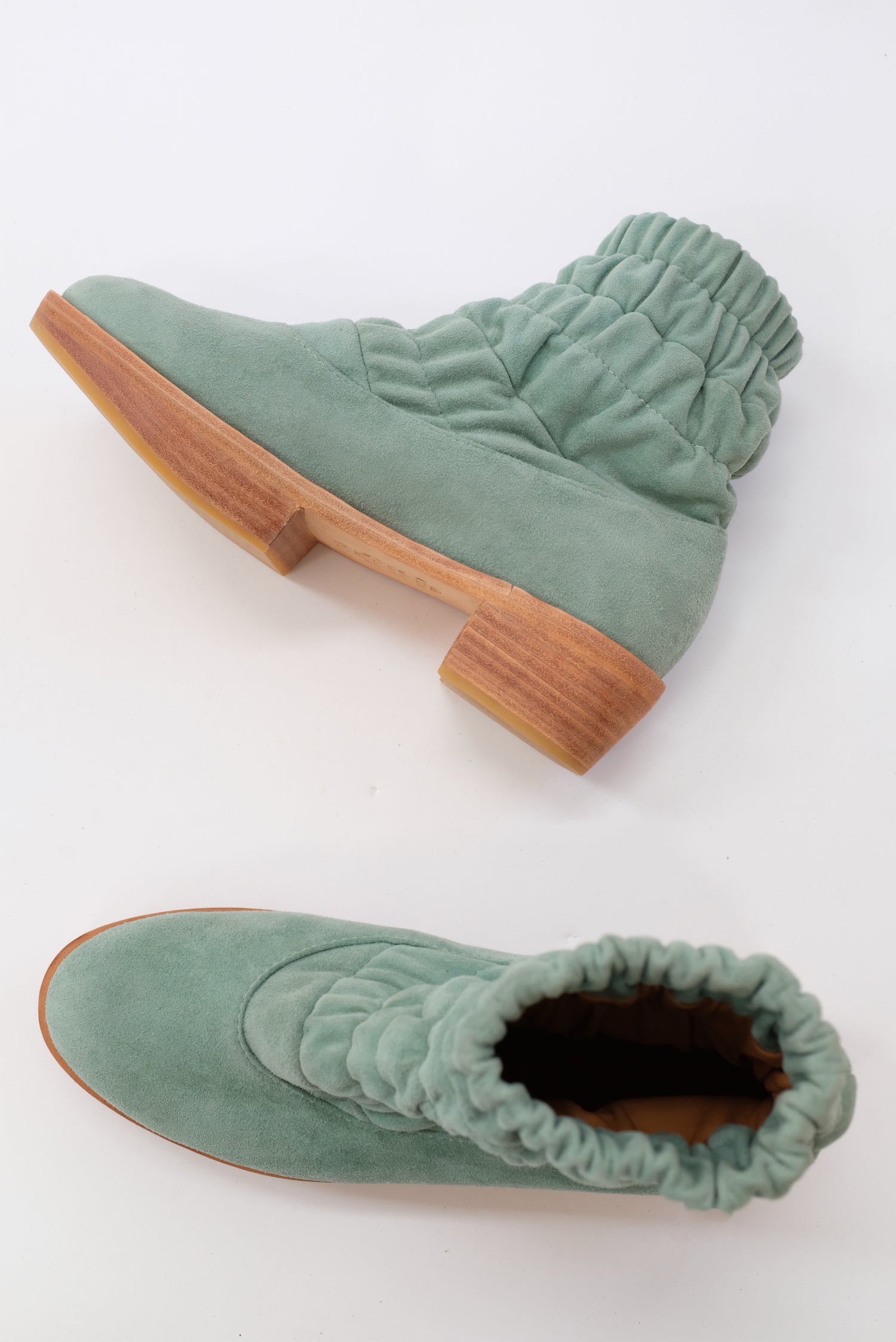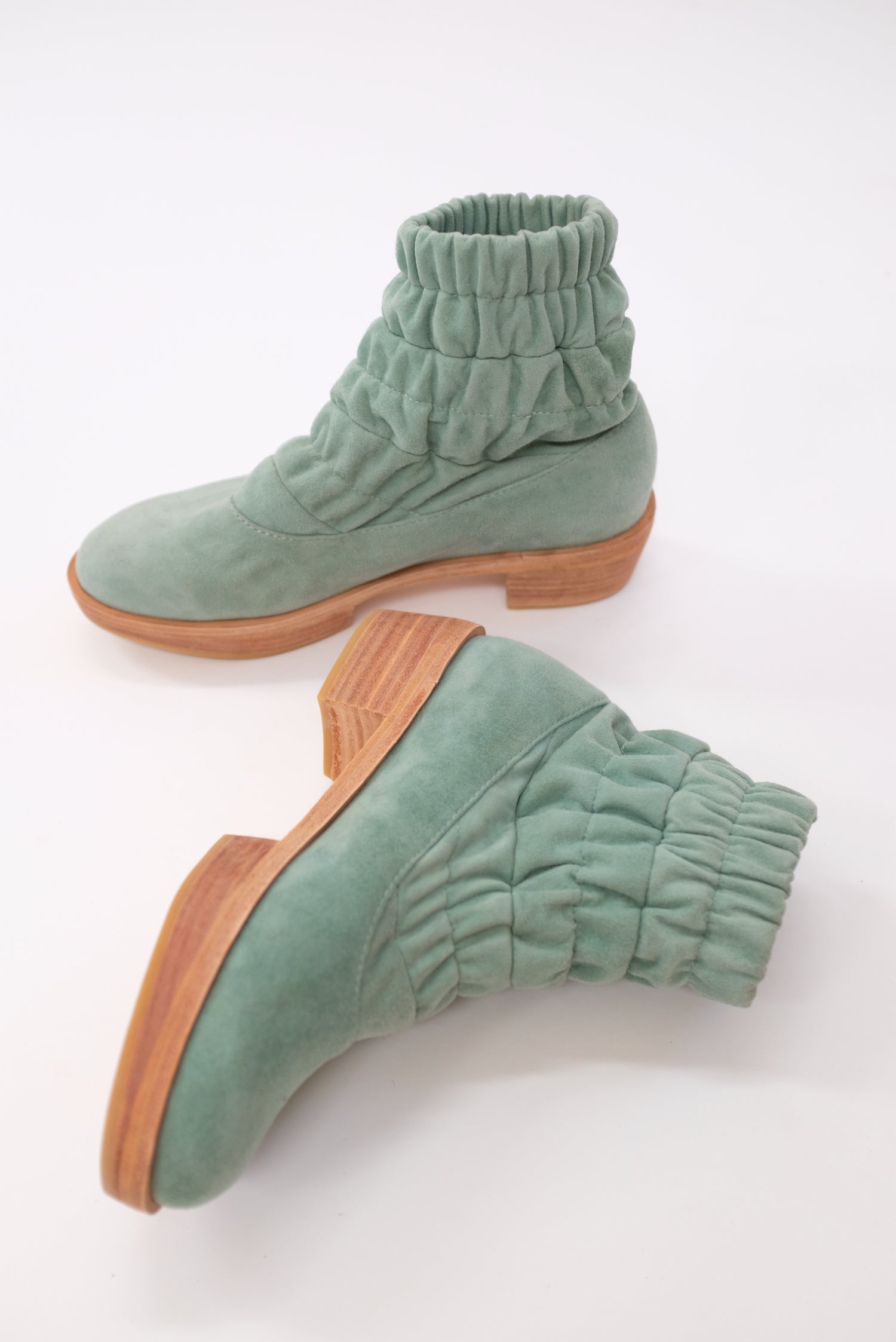 Buttery soft suede leather upper, with a luxurious fit that molds to your feet. Gathered leather elastic covered shaft. Heel is in two parts so they feel like you're wearing flats.