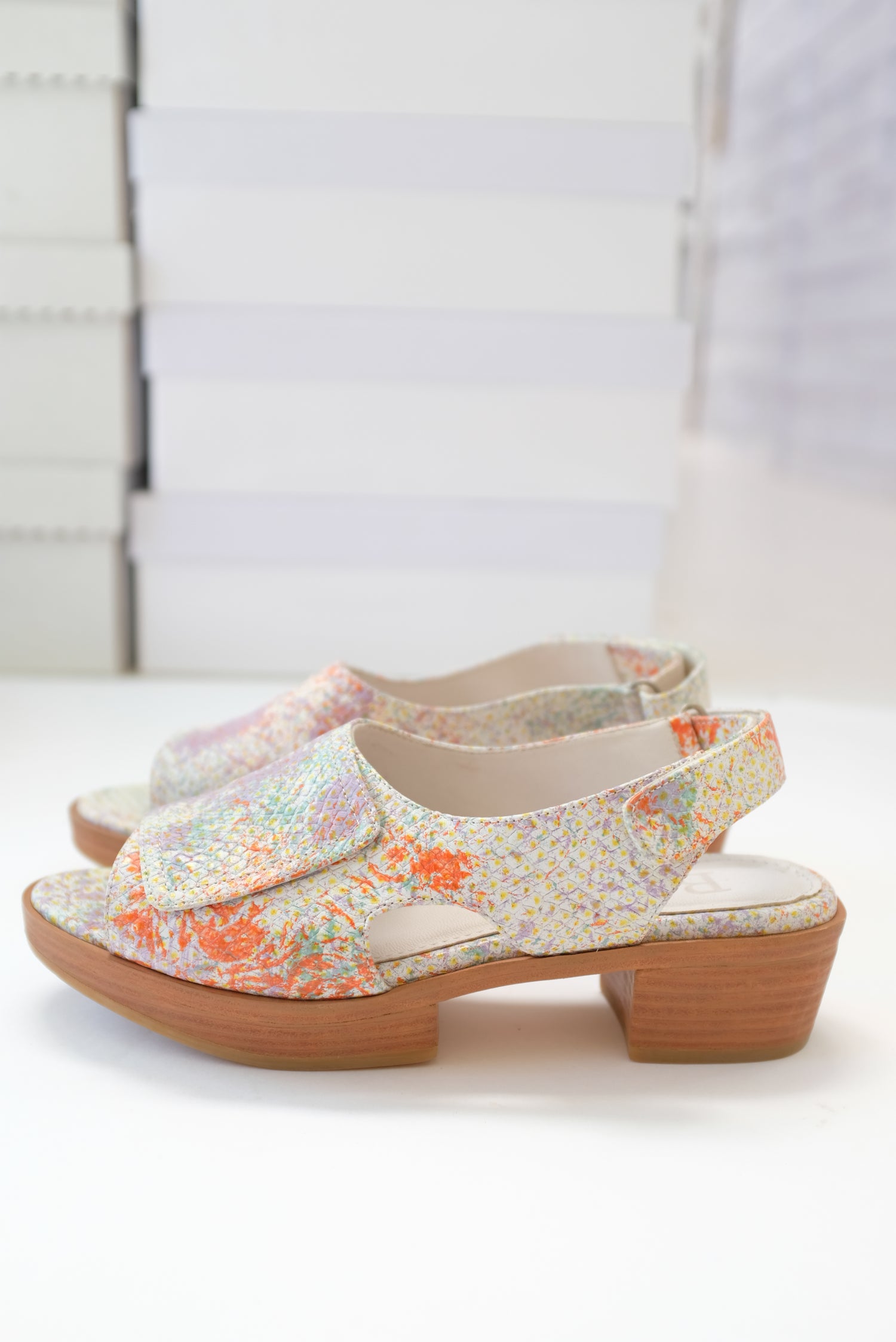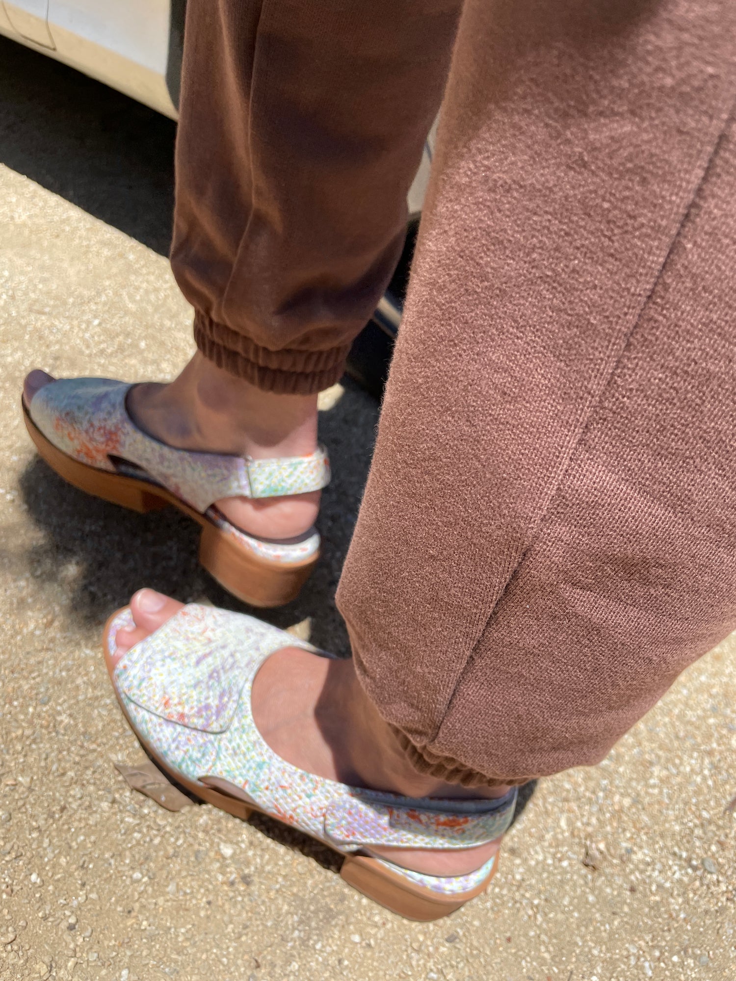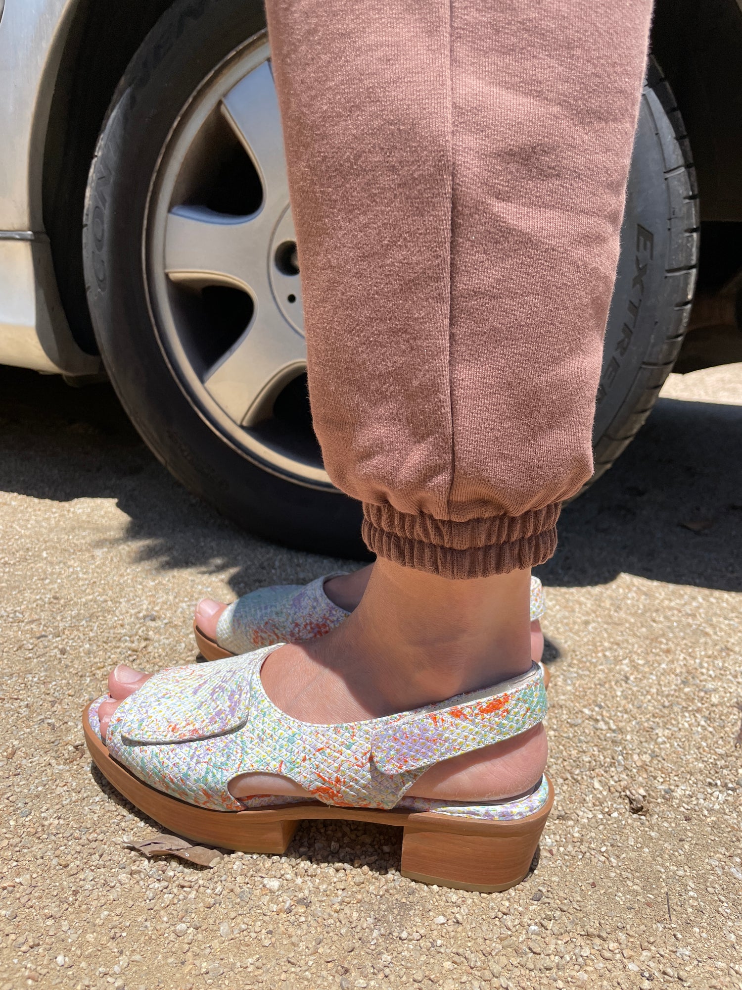 Hand carved platform split heel in the new classic sandal with adjustable velcro closure around heel. 100% Italian leather uppers and leather lined. 1.75" back heel and 1" front platform. The heel is split in two parts, allowing the shoe's middle leather layer base to bend, making it very wearable and ultra comfortable.