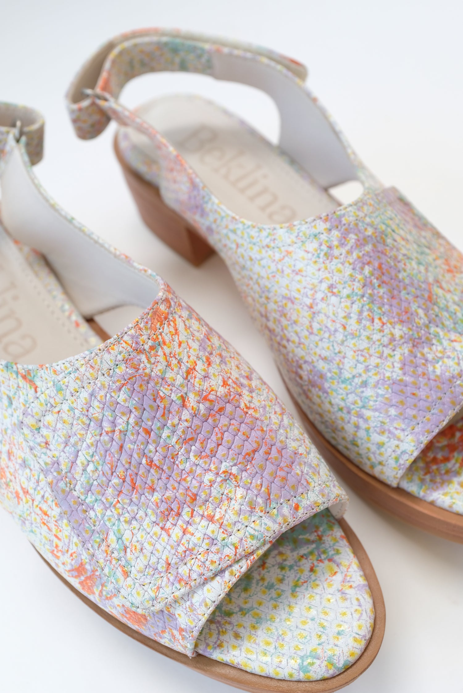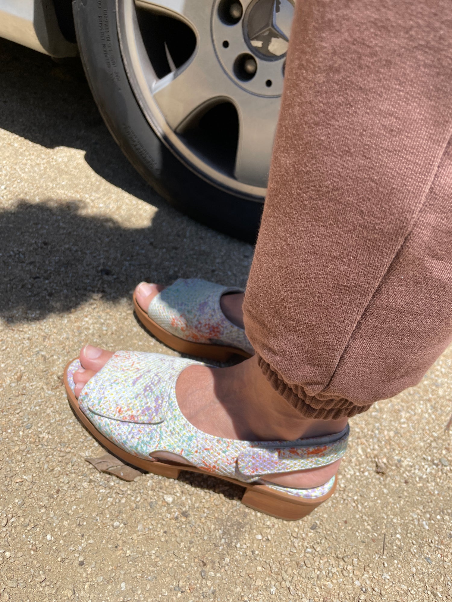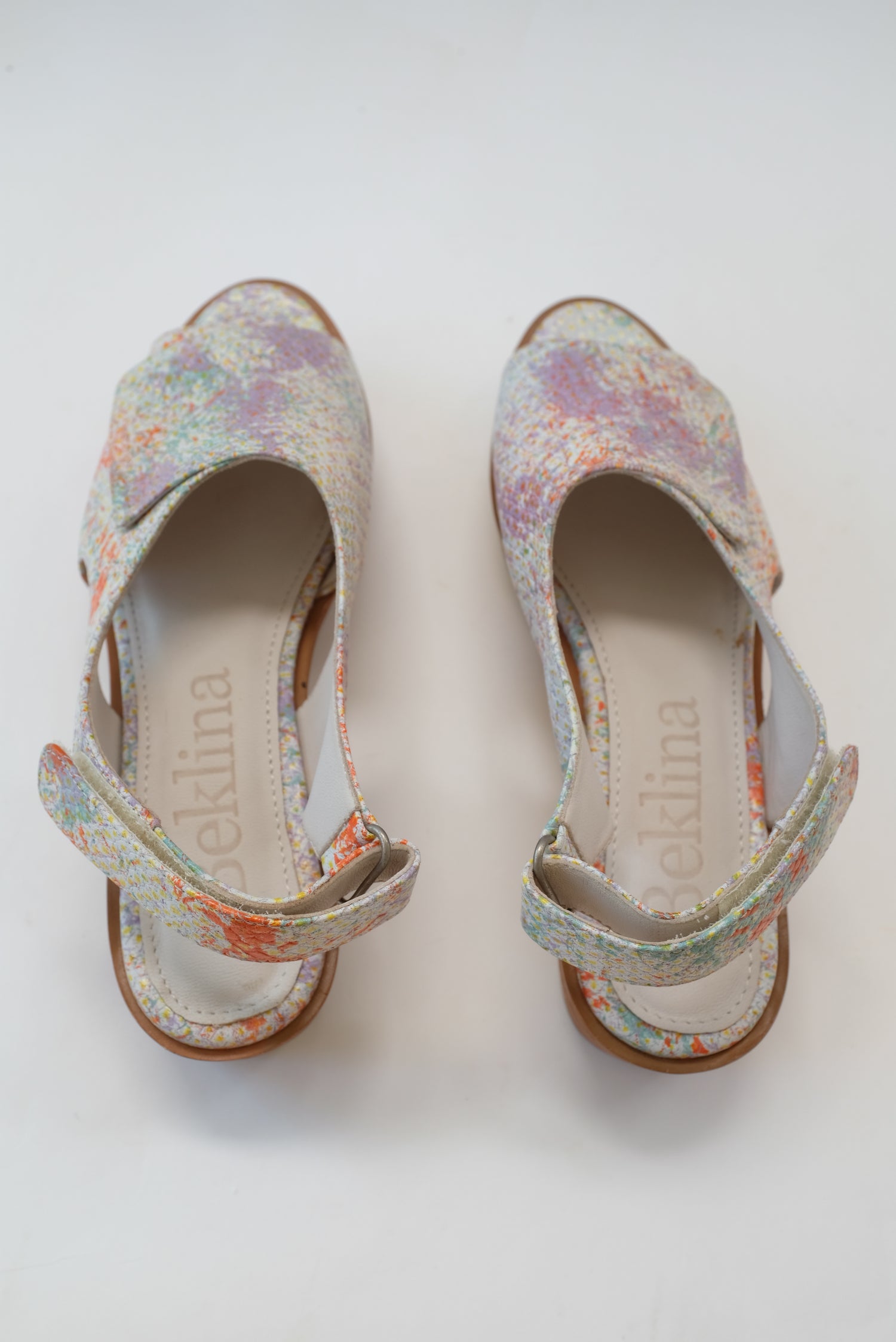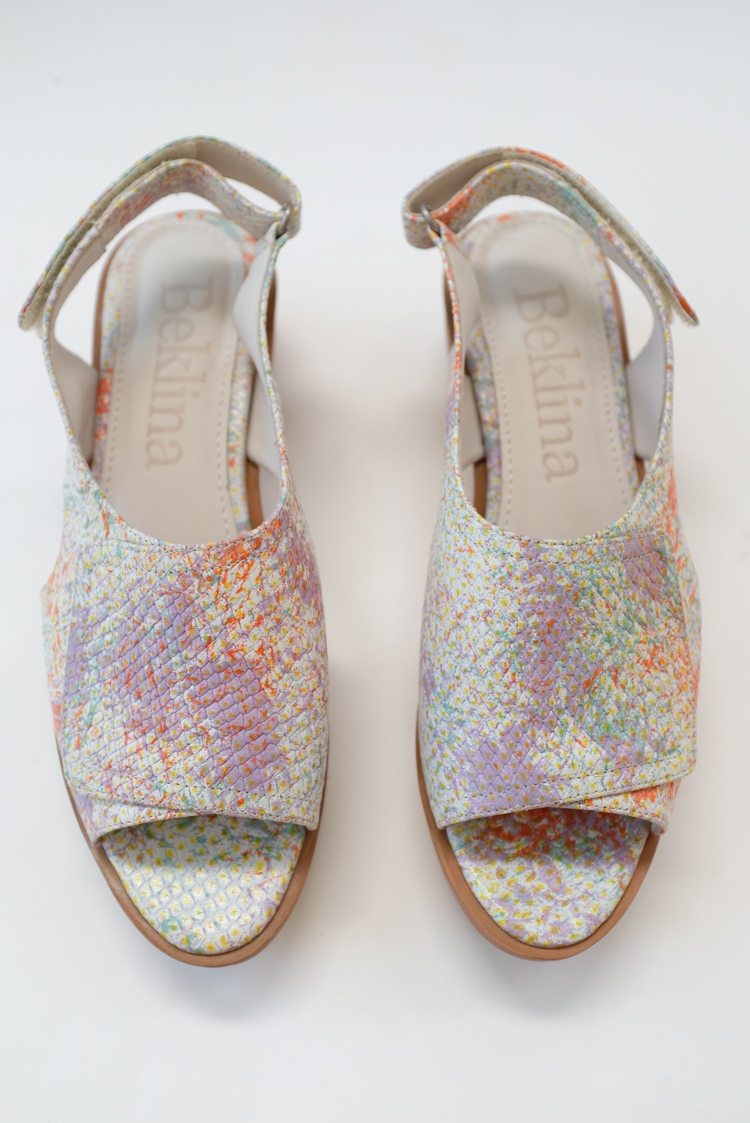 Hand carved platform split heel in the new classic sandal with adjustable velcro closure around heel. 100% Italian leather uppers and leather lined. 1.75" back heel and 1" front platform. The heel is split in two parts, allowing the shoe's middle leather layer base to bend, making it very wearable and ultra comfortable.
