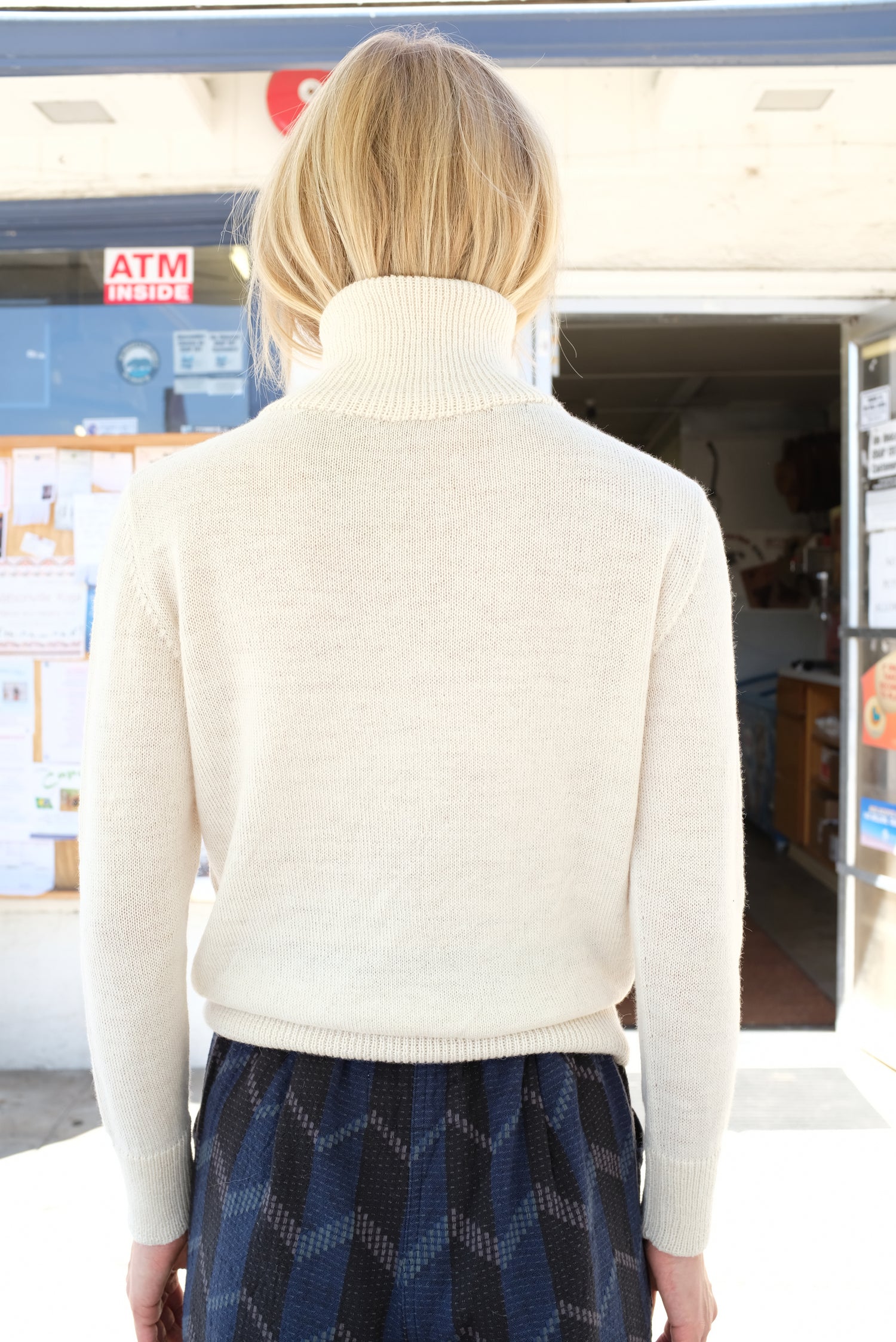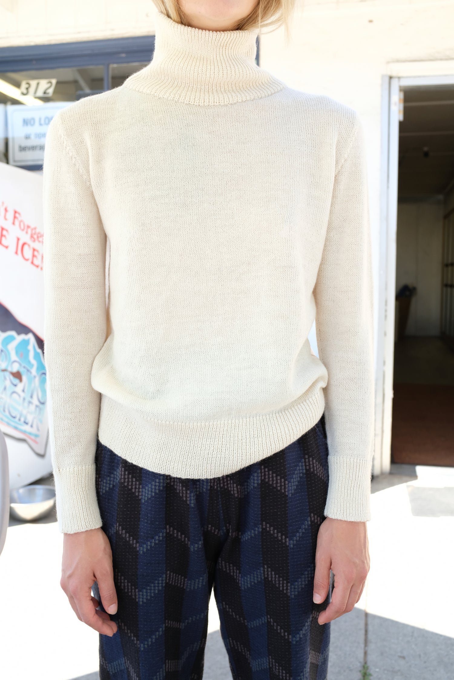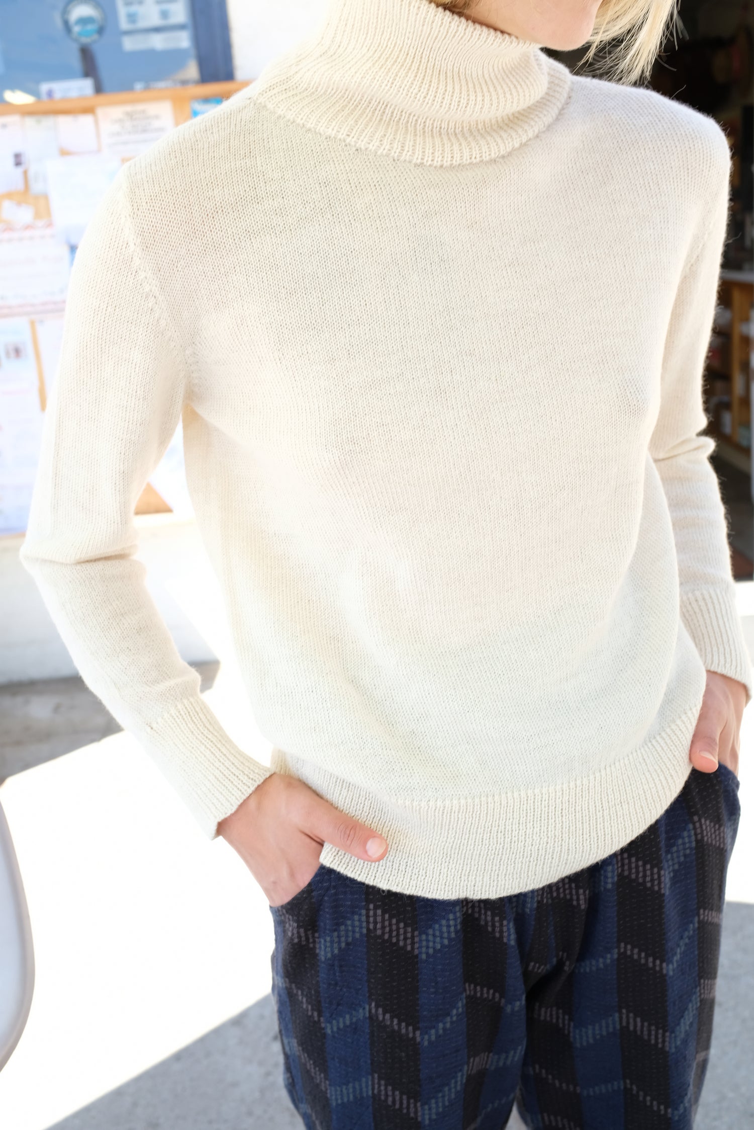 Ultra soft luxurious hand knit 100% baby alpaca. Neck can be worn up, or rolled down. Ribbed cuff, hems and neck. We love these and live in them!