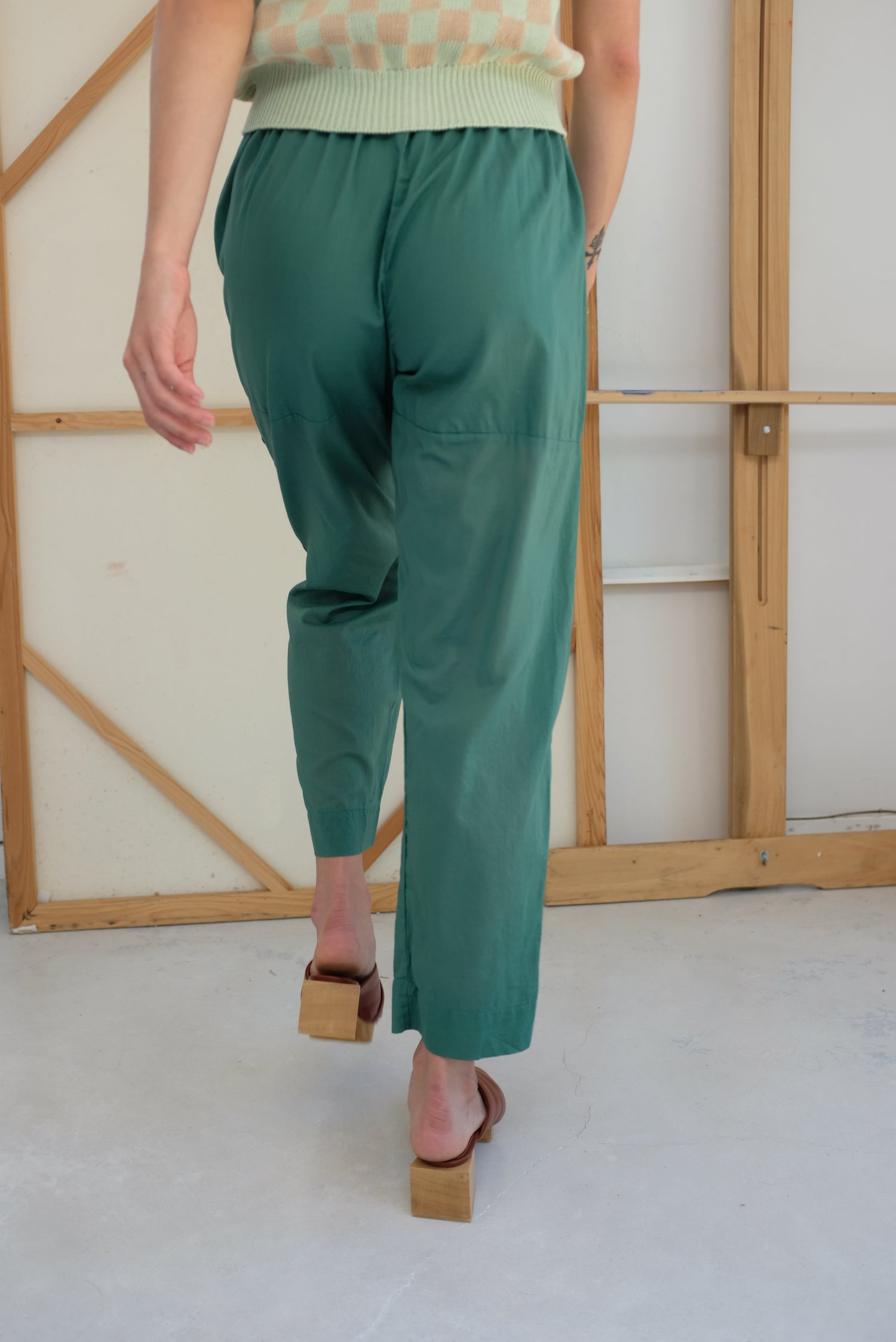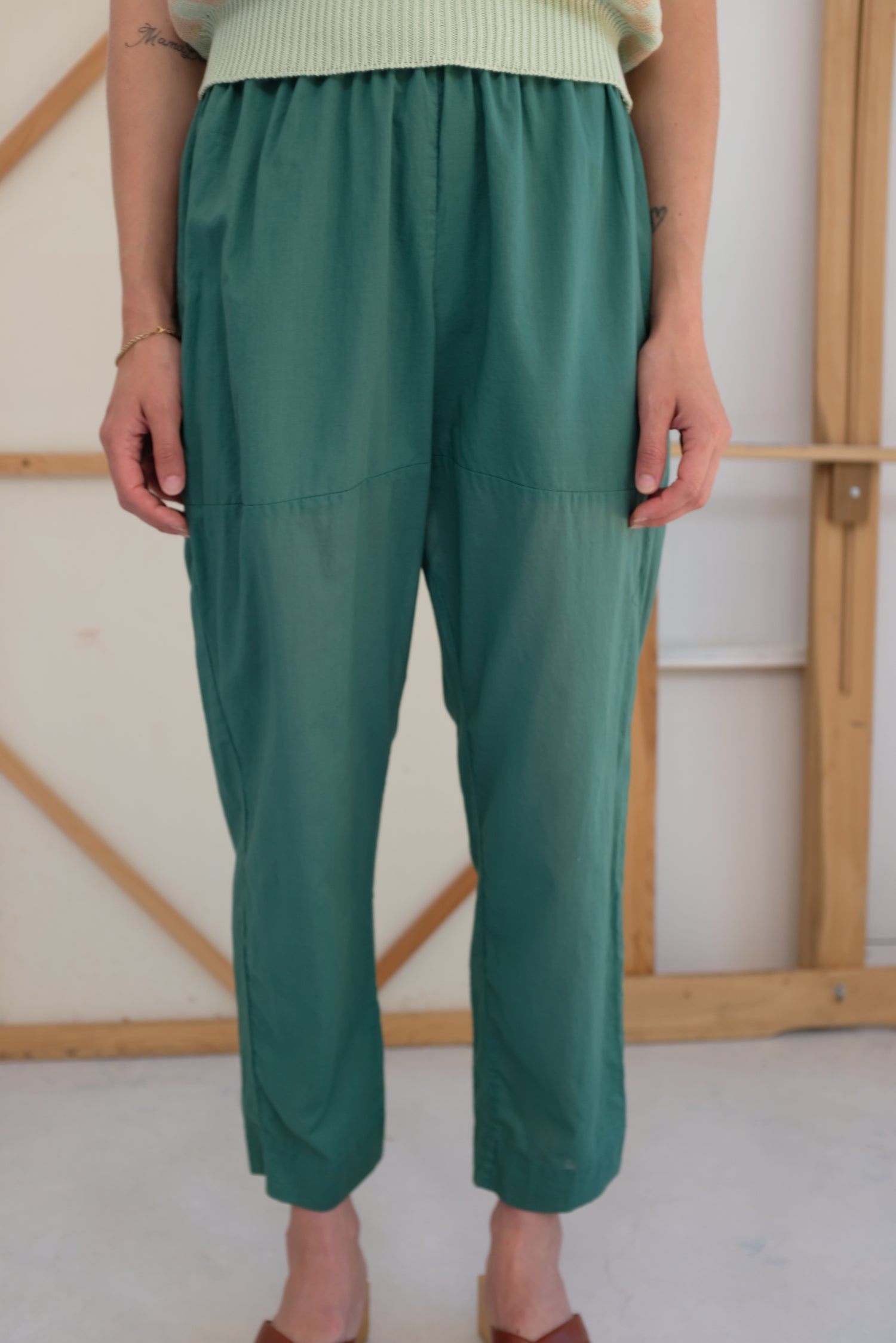100% cotton, double layered top half, upper half is not sheer, lower layer is a little sheer. Best selling pant in summer gauzy cotton. Slightly cropped. To be worn just below true waist but work a little higher or a little lower. Loose drape fit. Model is wearing a small/medium. Total length 34 1/2" Inseam 27"