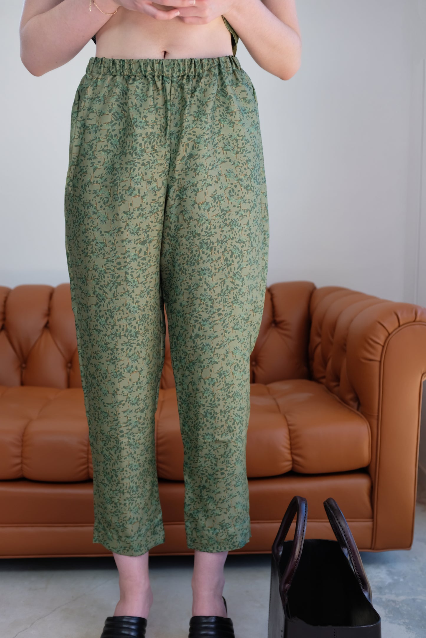 100% Silk twill, gentle elastic waist, crazy comfortable. Slightly cropped. To be worn just below true waist but work a little higher or a little lower. Loose drape fit. Model is wearing a small/medium. Total length 34 1/2" Inseam 27"