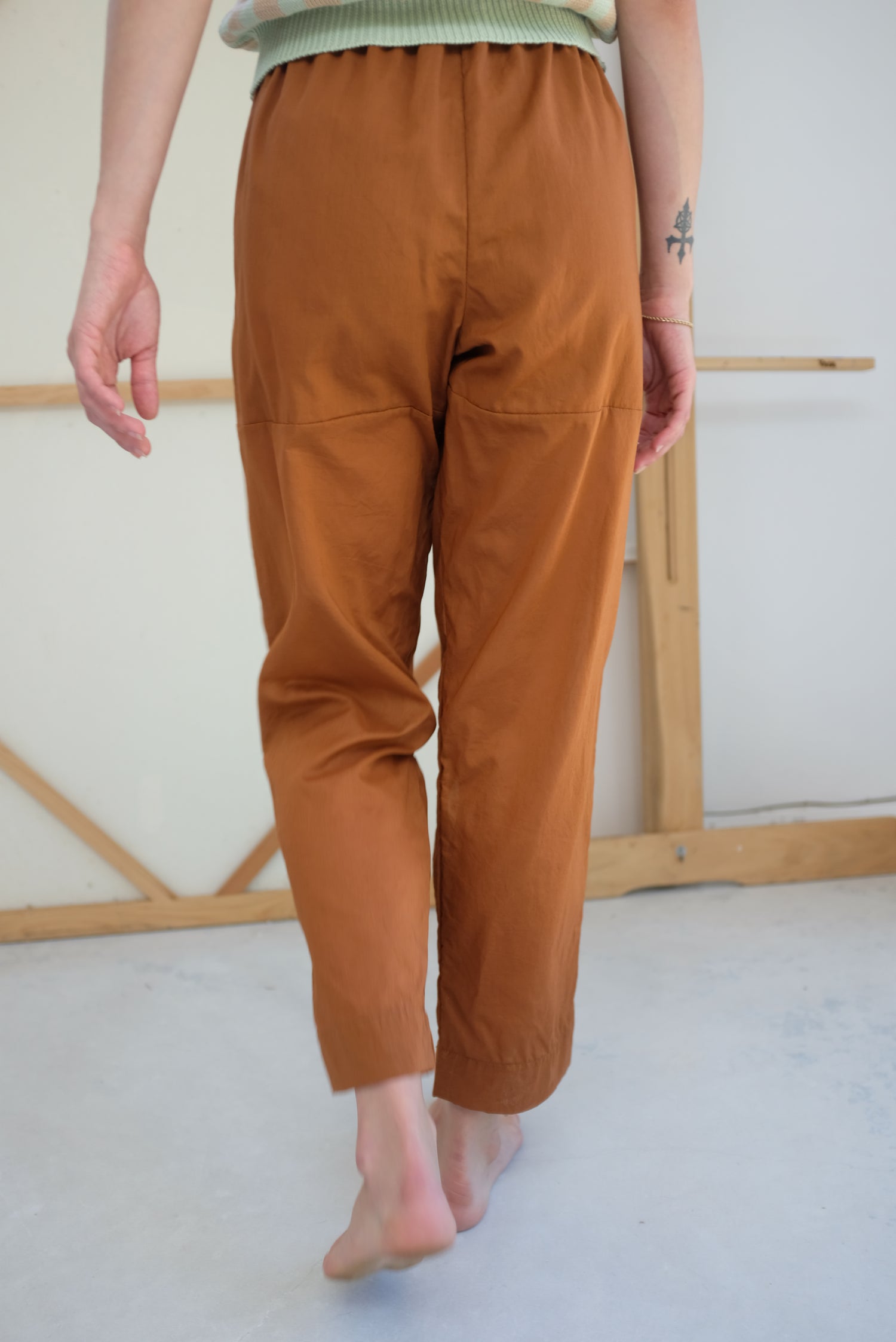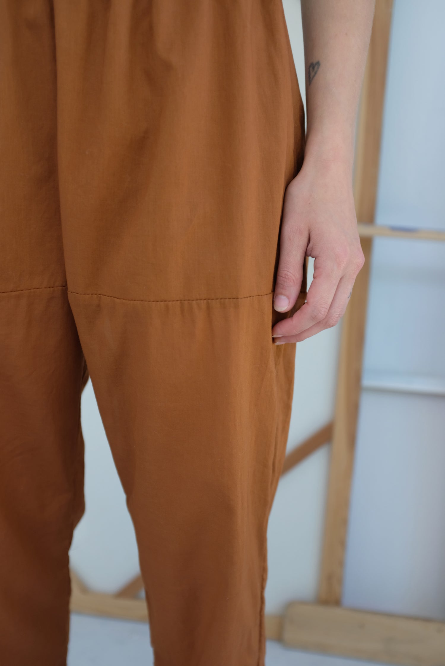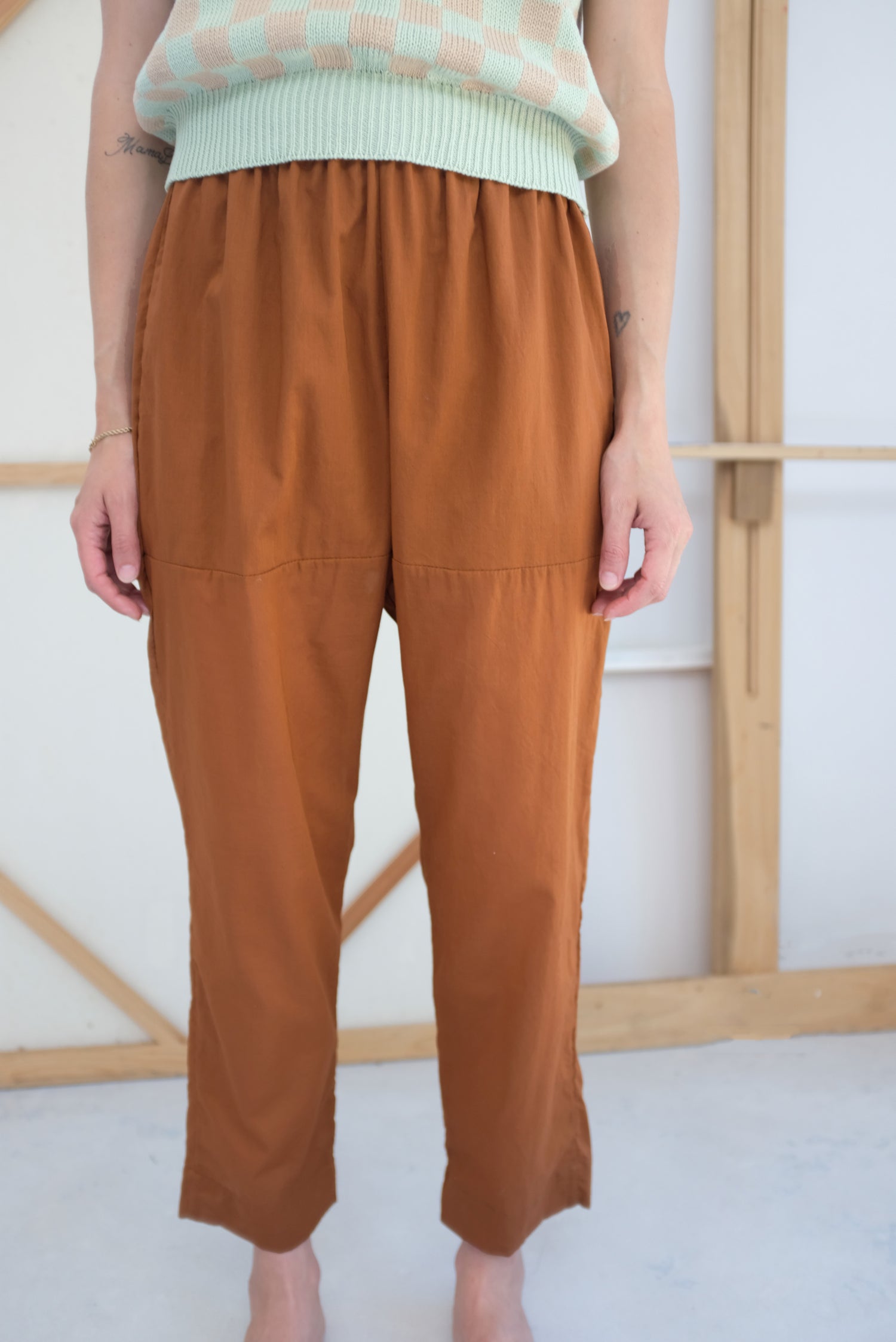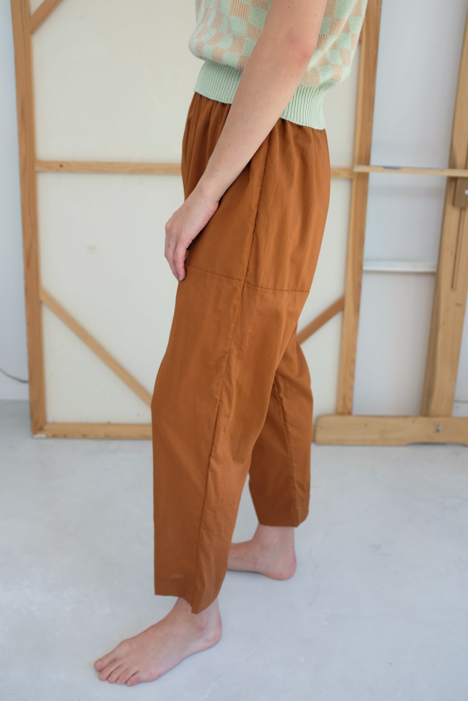 100% cotton, double layered top half, upper half is not sheer, lower layer is a little sheer. Best selling pant in summer gauzy cotton. Slightly cropped. To be worn just below true waist but work a little higher or a little lower. Loose drape fit. Model is wearing a small/medium. Total length 34 1/2" Inseam 27"