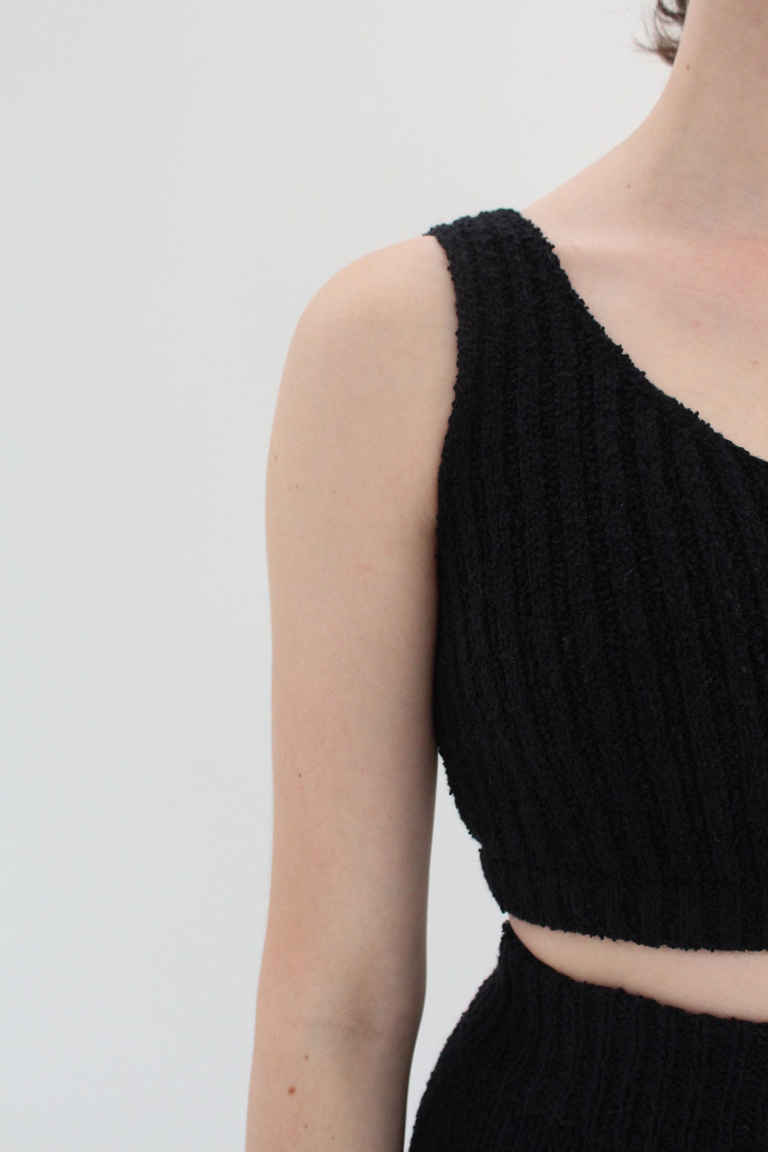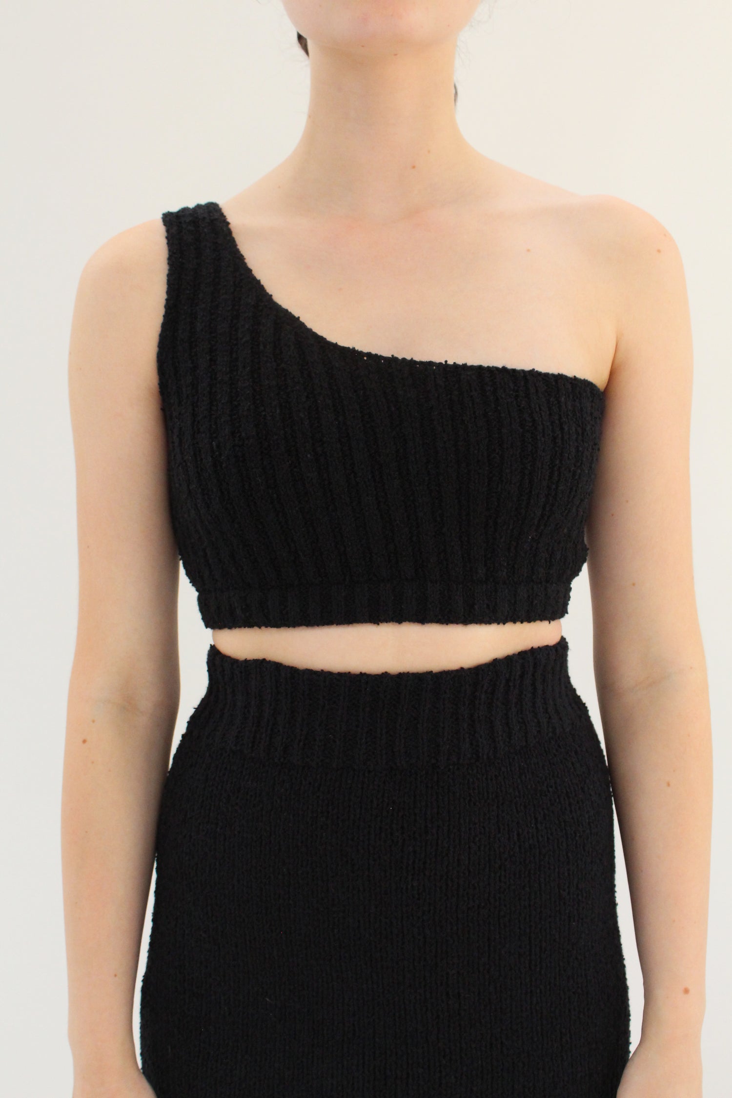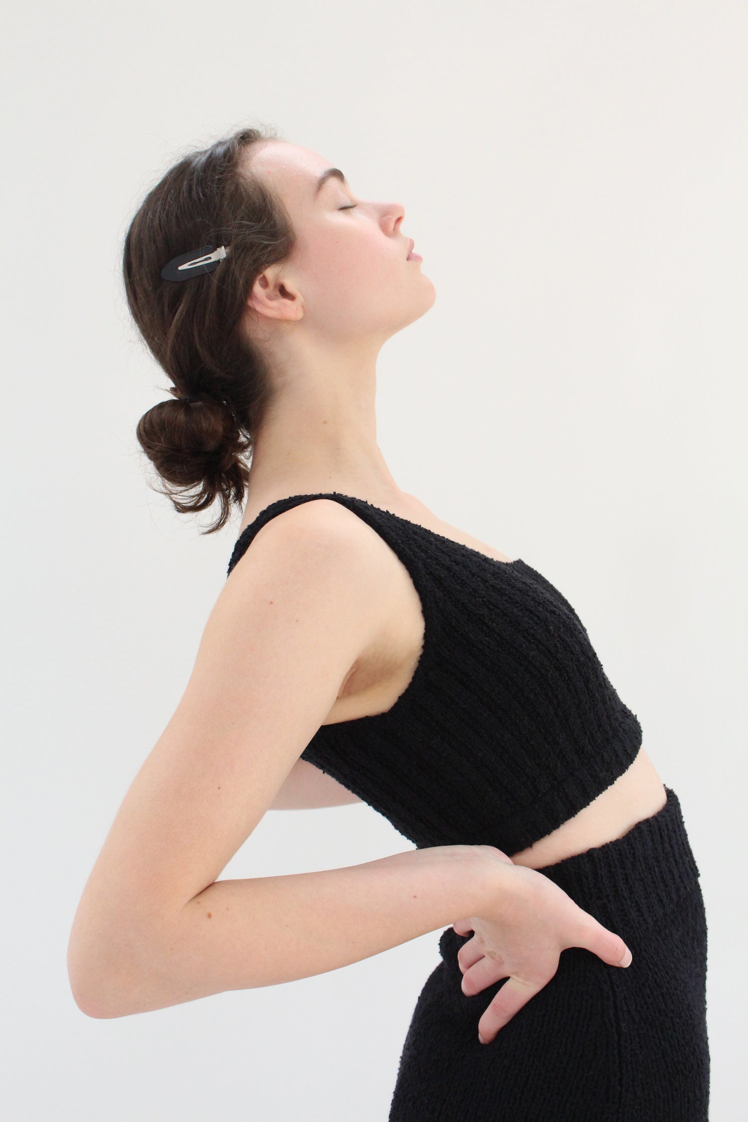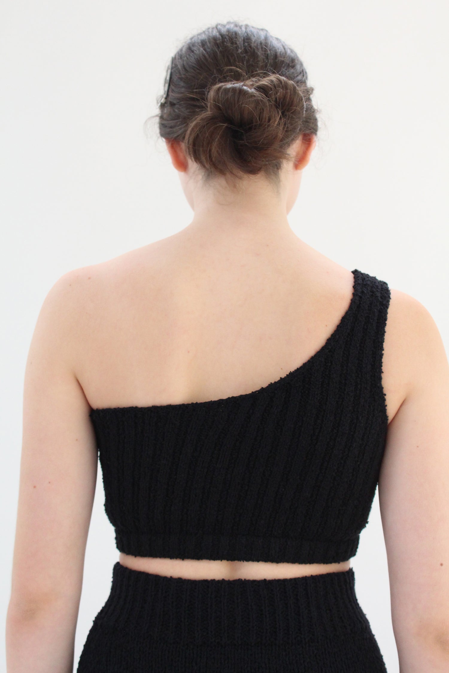 100% Bouclé cotton hand knit bra top. Single shoulder strap, elastic hem. Thick ribbed body, good support. Can be worn under clothing or as a top on it's own.