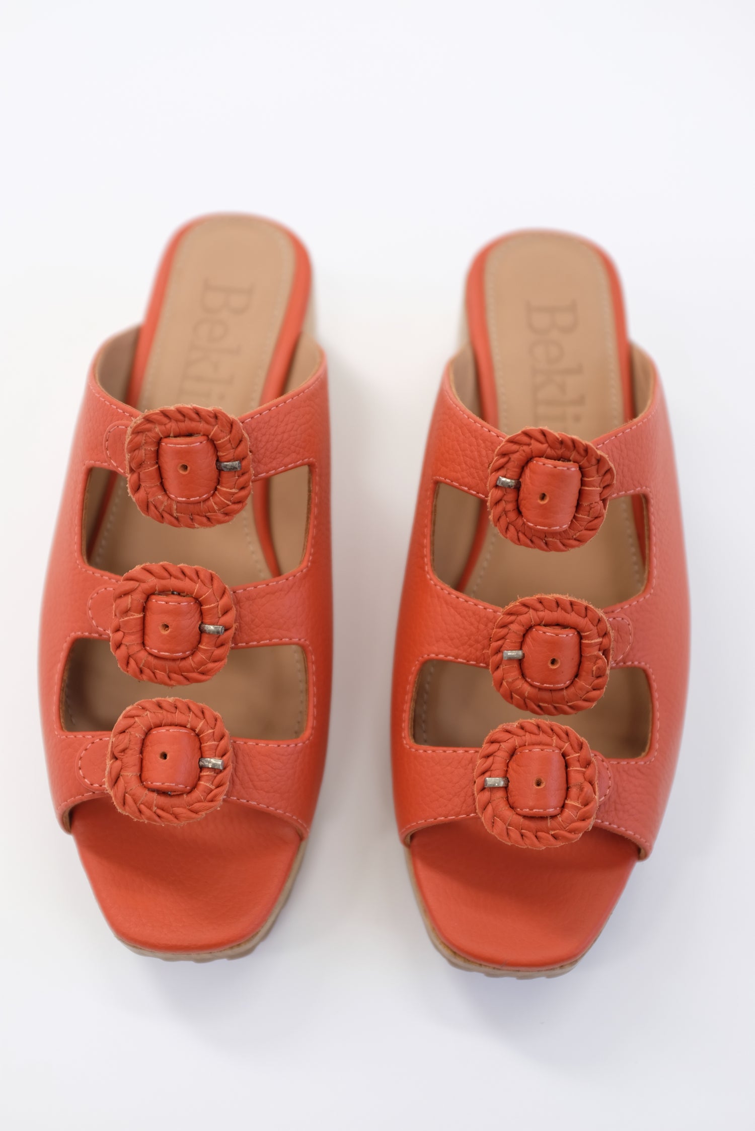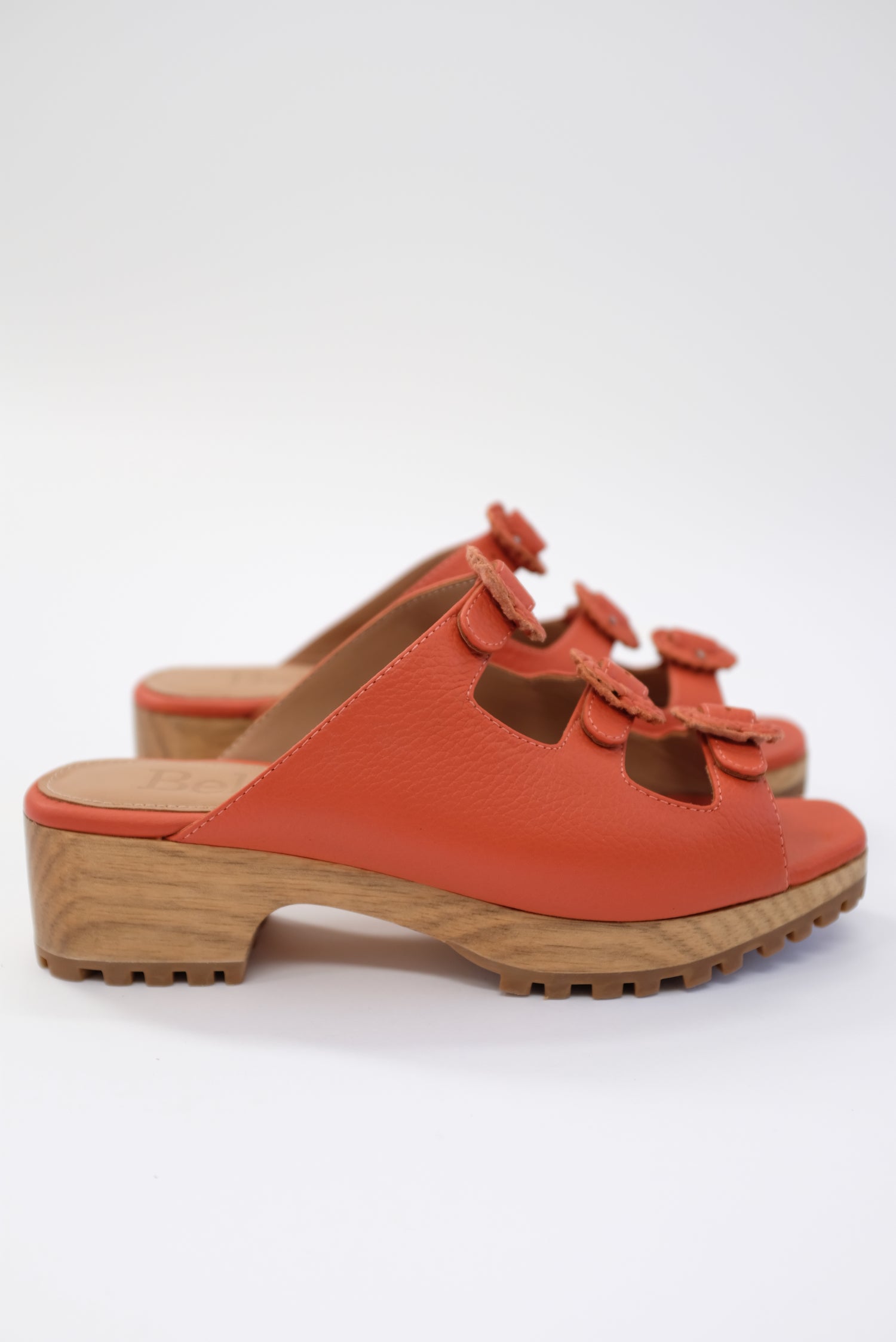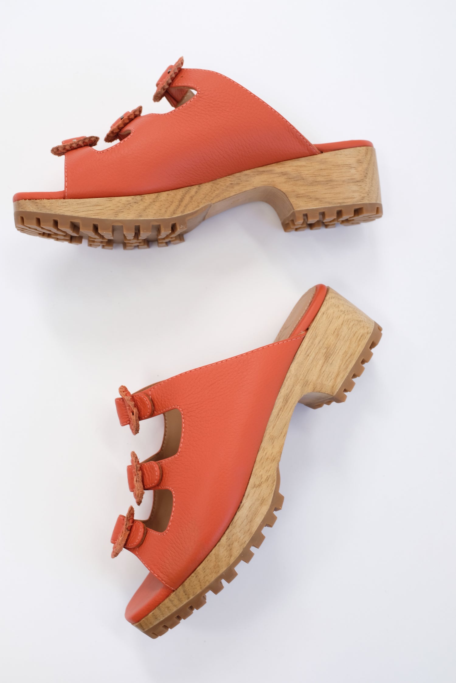 Pebbled leather upper, hand carved wooden platform heel. Ultra cozy comfy low clog with tread bottoms for all day wear. Square toe, 3 adjustable leather wrapped buckles, leather lined. Free of staples. We suggest going with you most common size.
