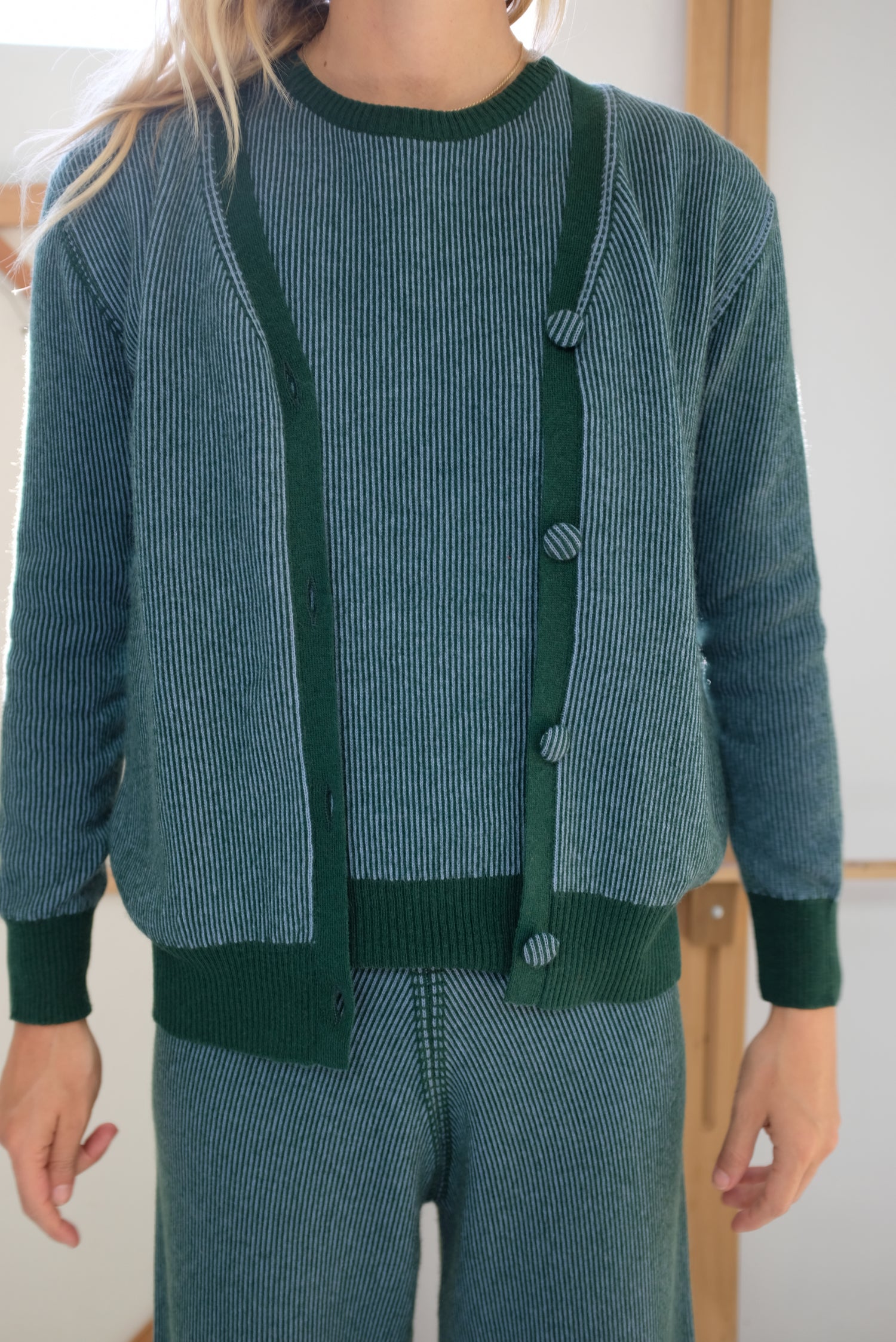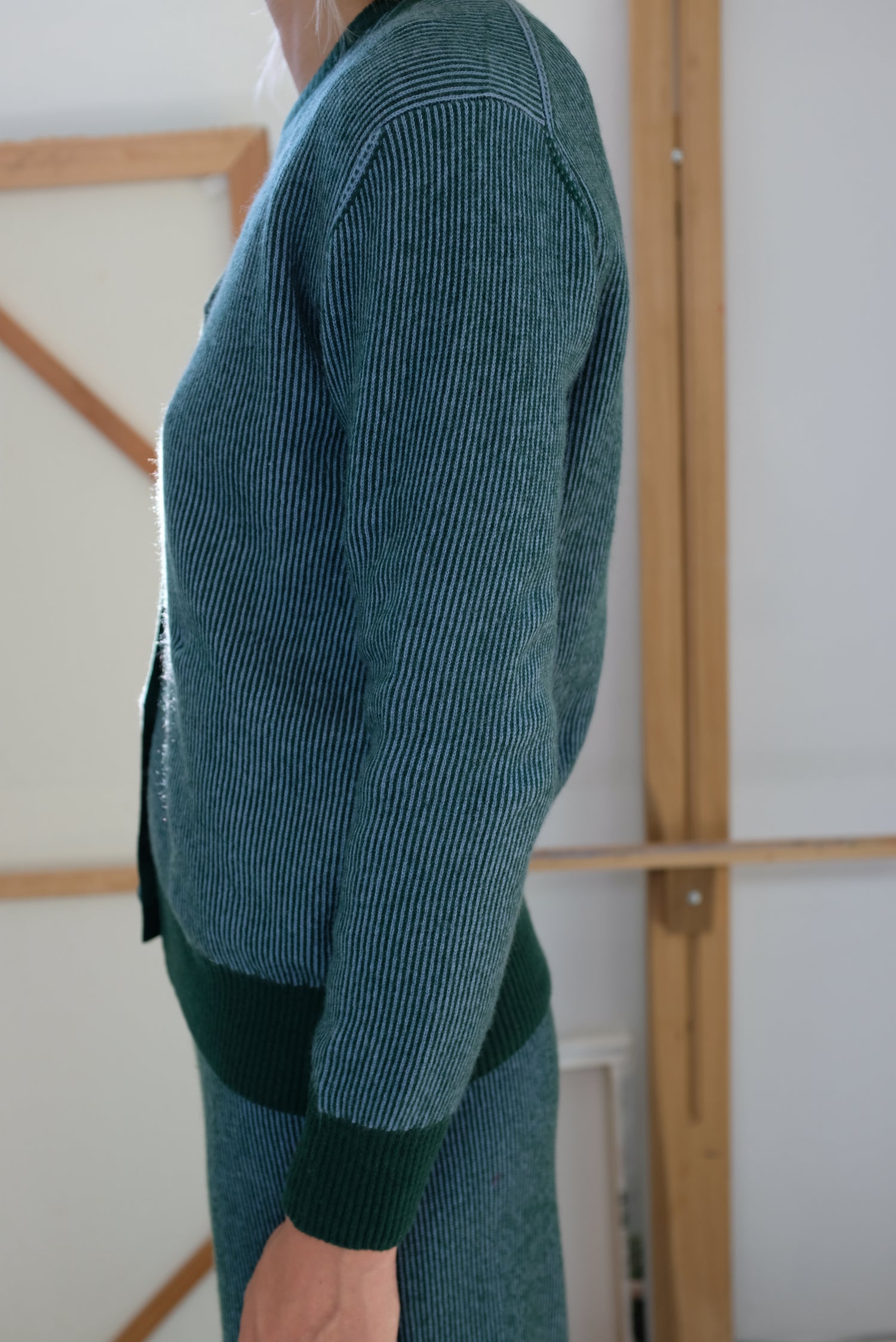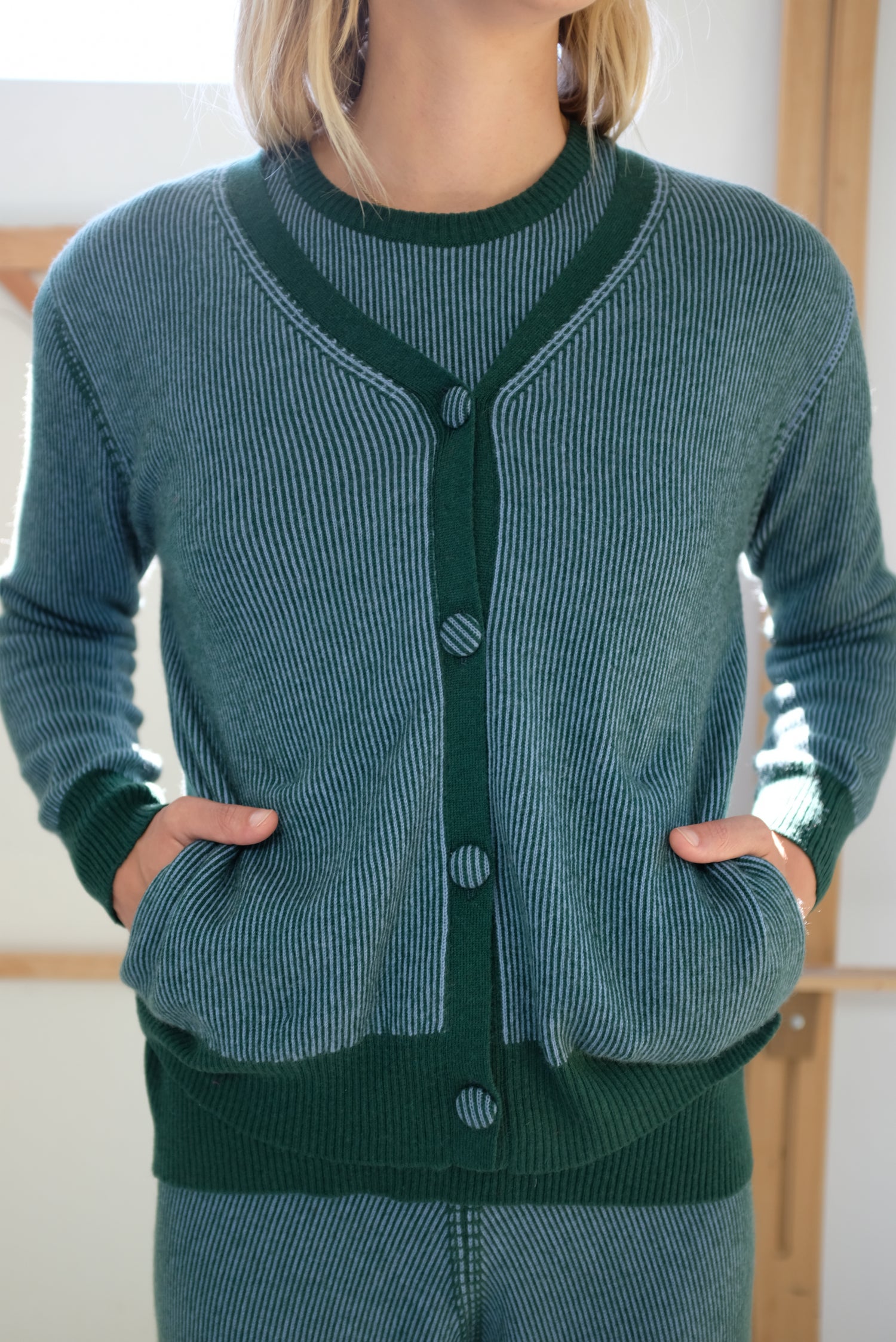 100% Cashmere two-tone ribbed cardigan sweater, luxuriously thick cashmere, 3” ribbed cuffs and hem, covered buttons down front, long sleeve, side pockets. Exclusive to Beklina. These cardigans came out beautifully.