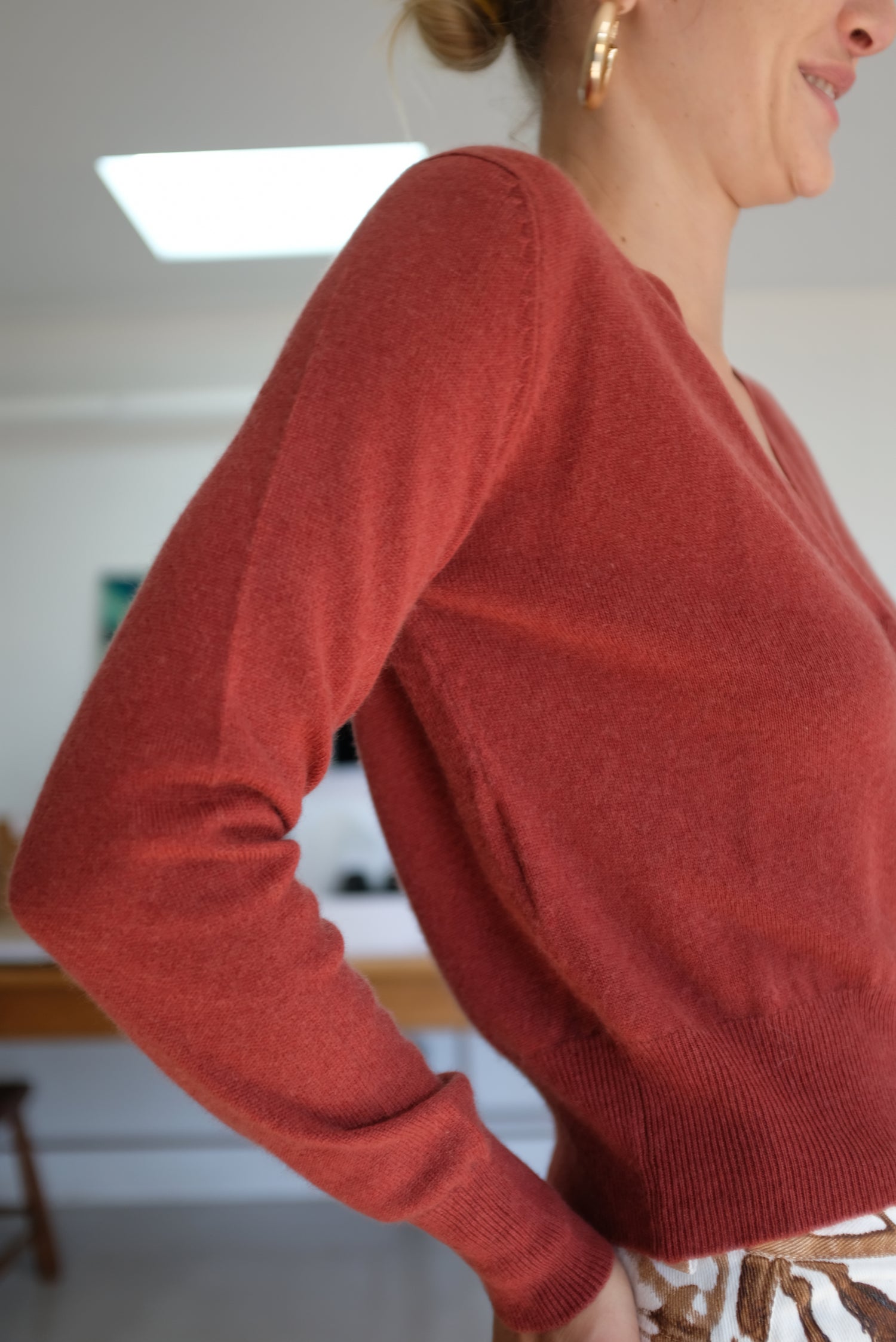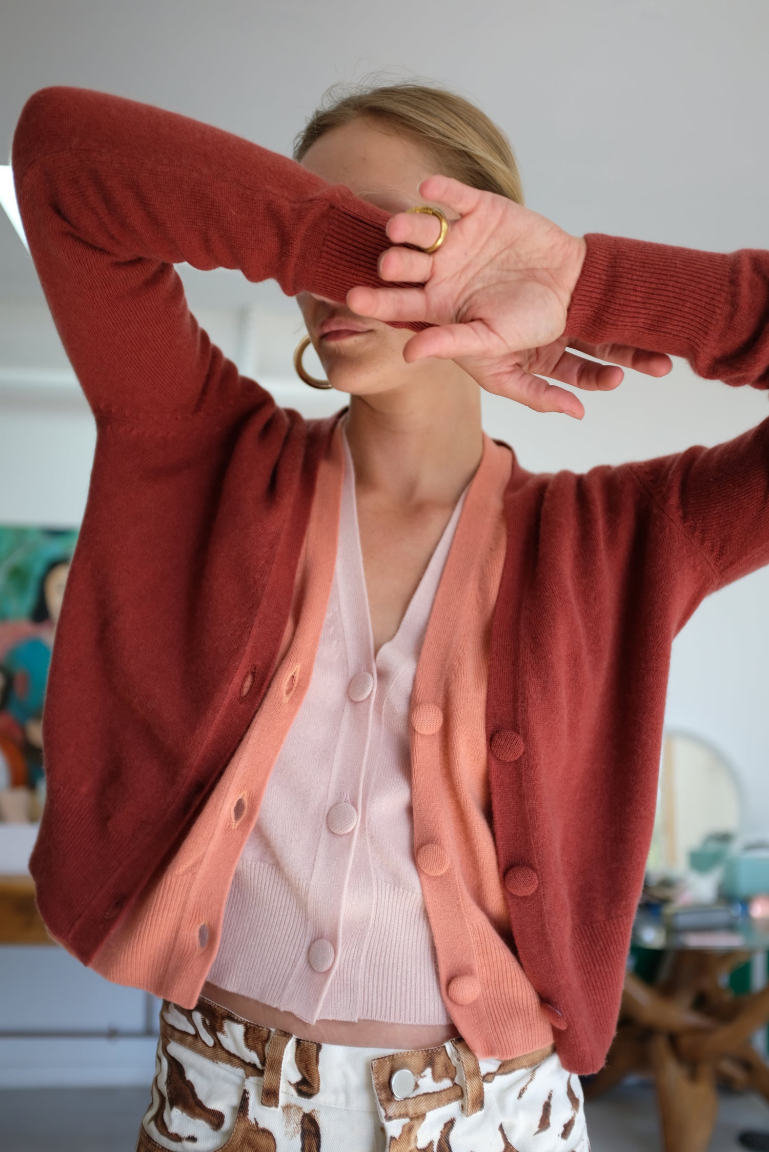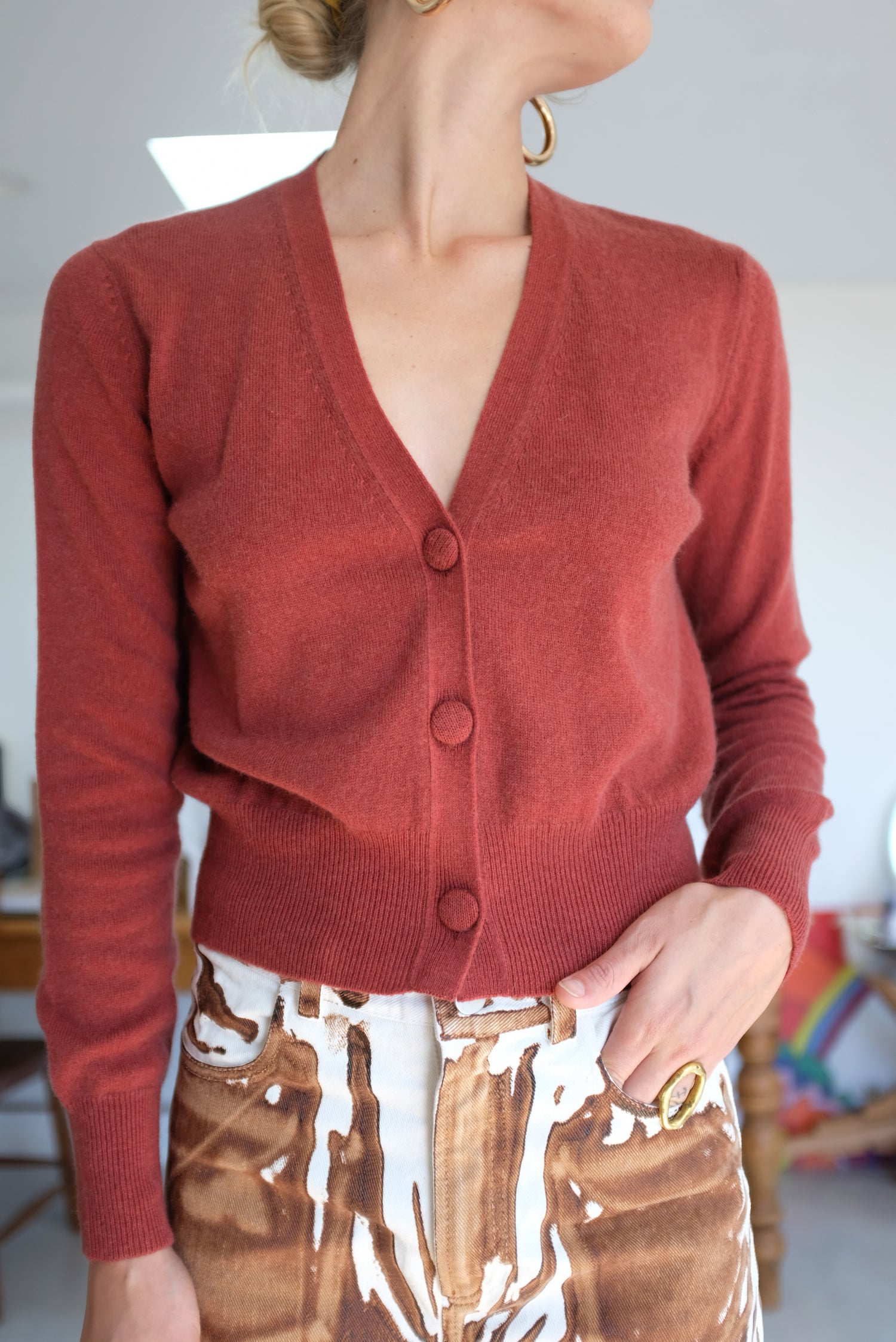 Best selling cardigan. 100% cashmere. Classic v-neck cardigan, slightly cropped, cashmere covered buttons down front. Medium weight, not sheer, wear as a layering piece or on it's own, solo. Size up for a less cropped look, and down for a more cropped look. Alexis is wearing size small/medium. Exclusive to Beklina.