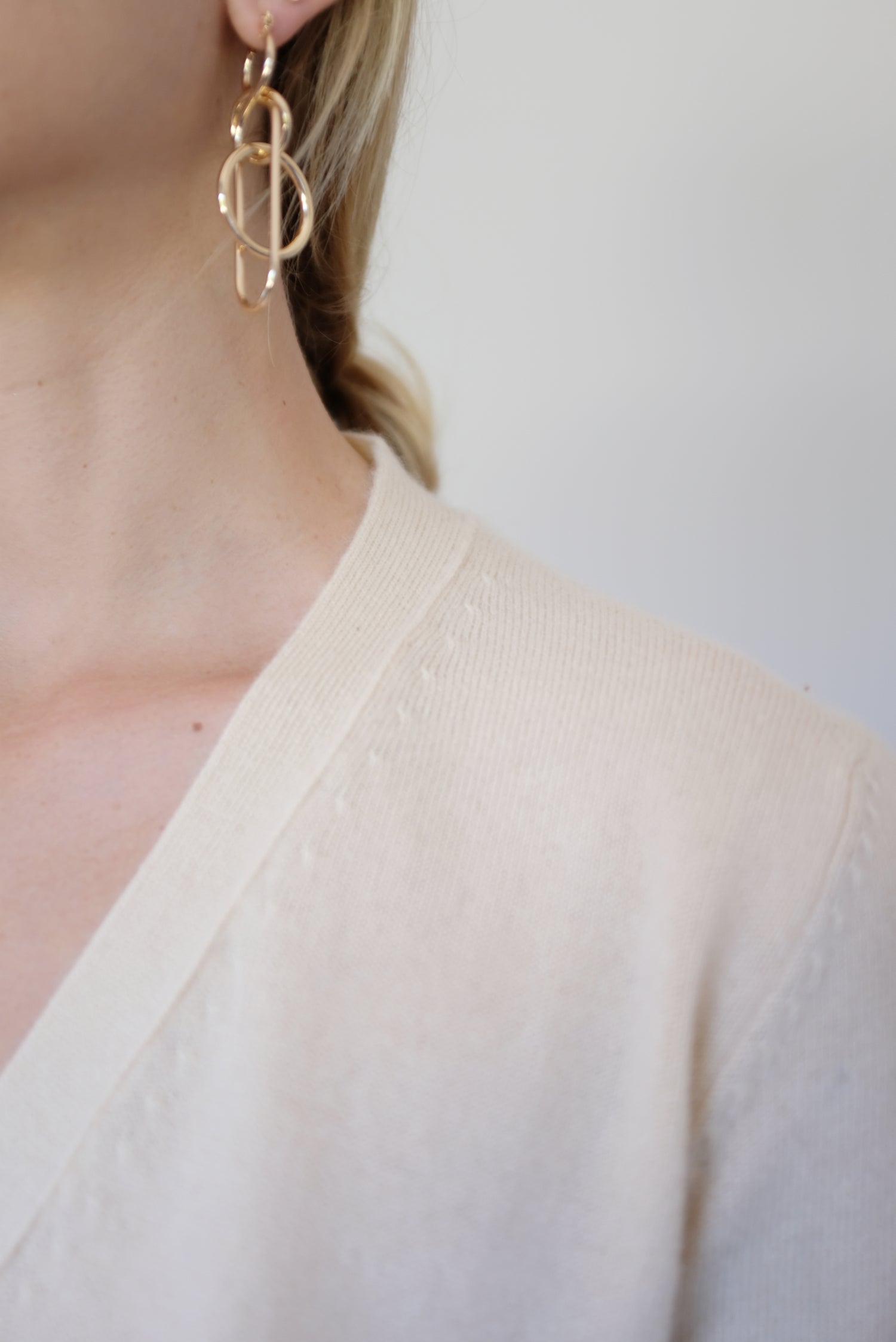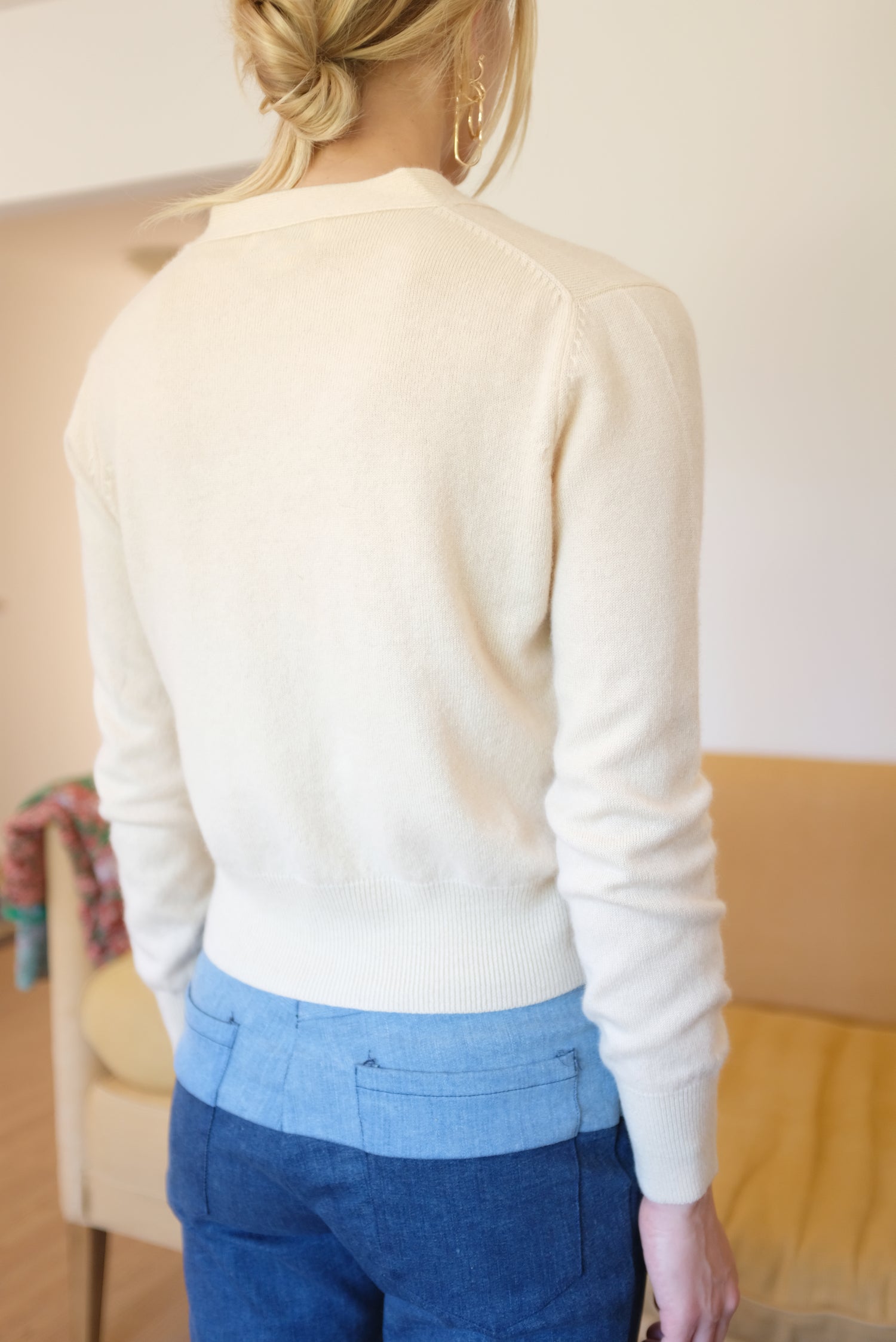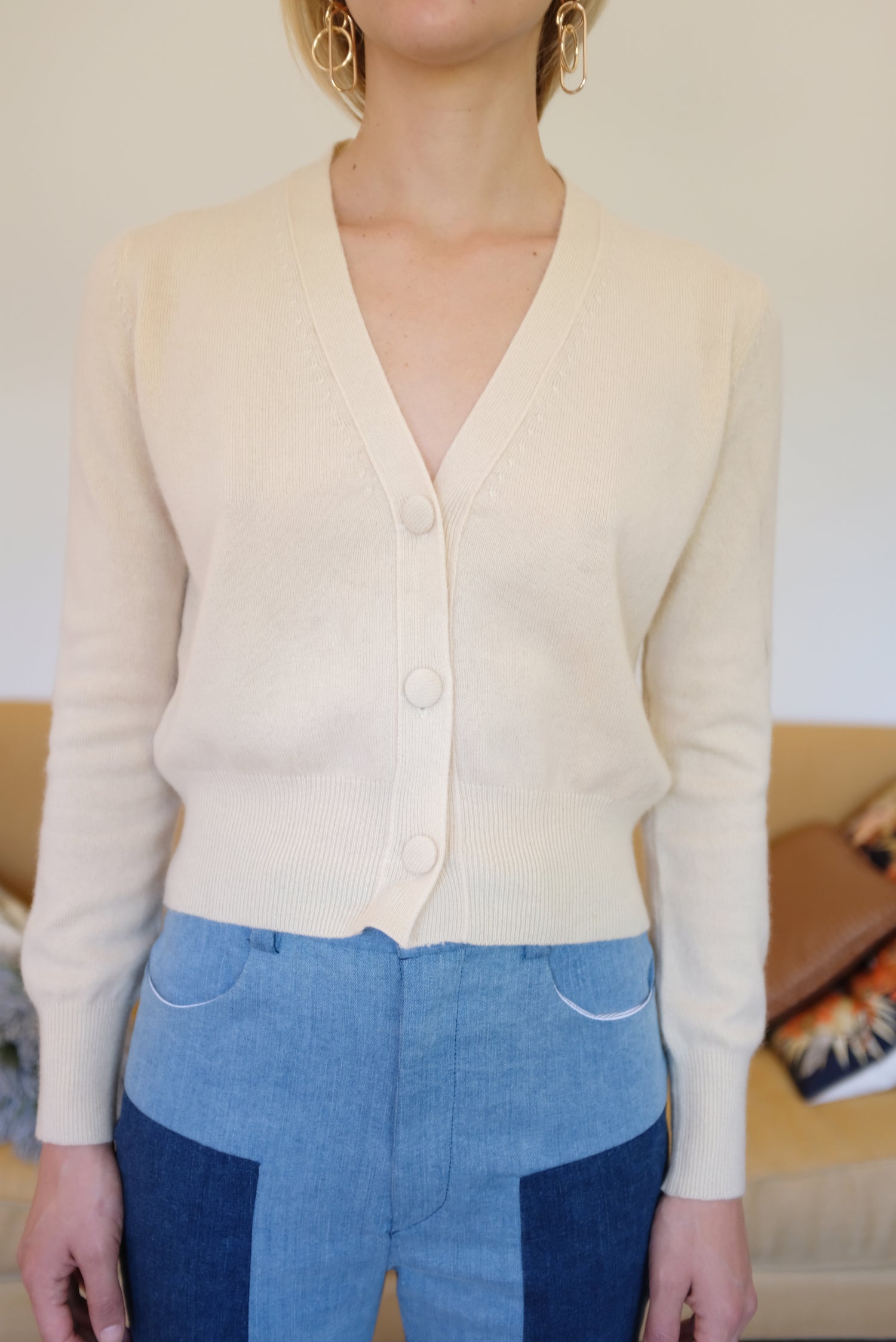 Best selling cardigan. 100% cashmere. Classic v-neck cardigan, slightly cropped, cashmere covered buttons down front. Medium weight, not sheer, wear as a laying piece or on it's own, solo. Size up for a less cropped look, and down for a more cropped look. Exclusive to Beklina.