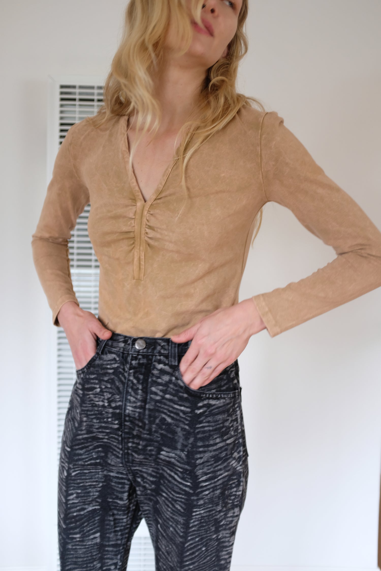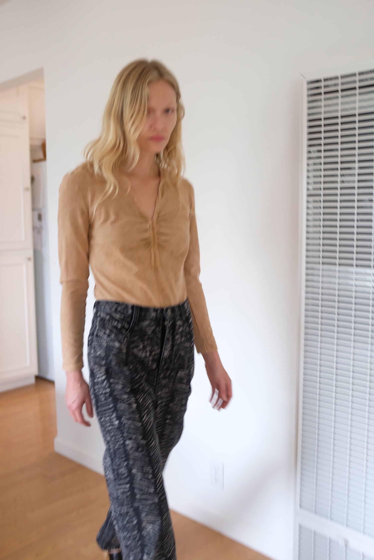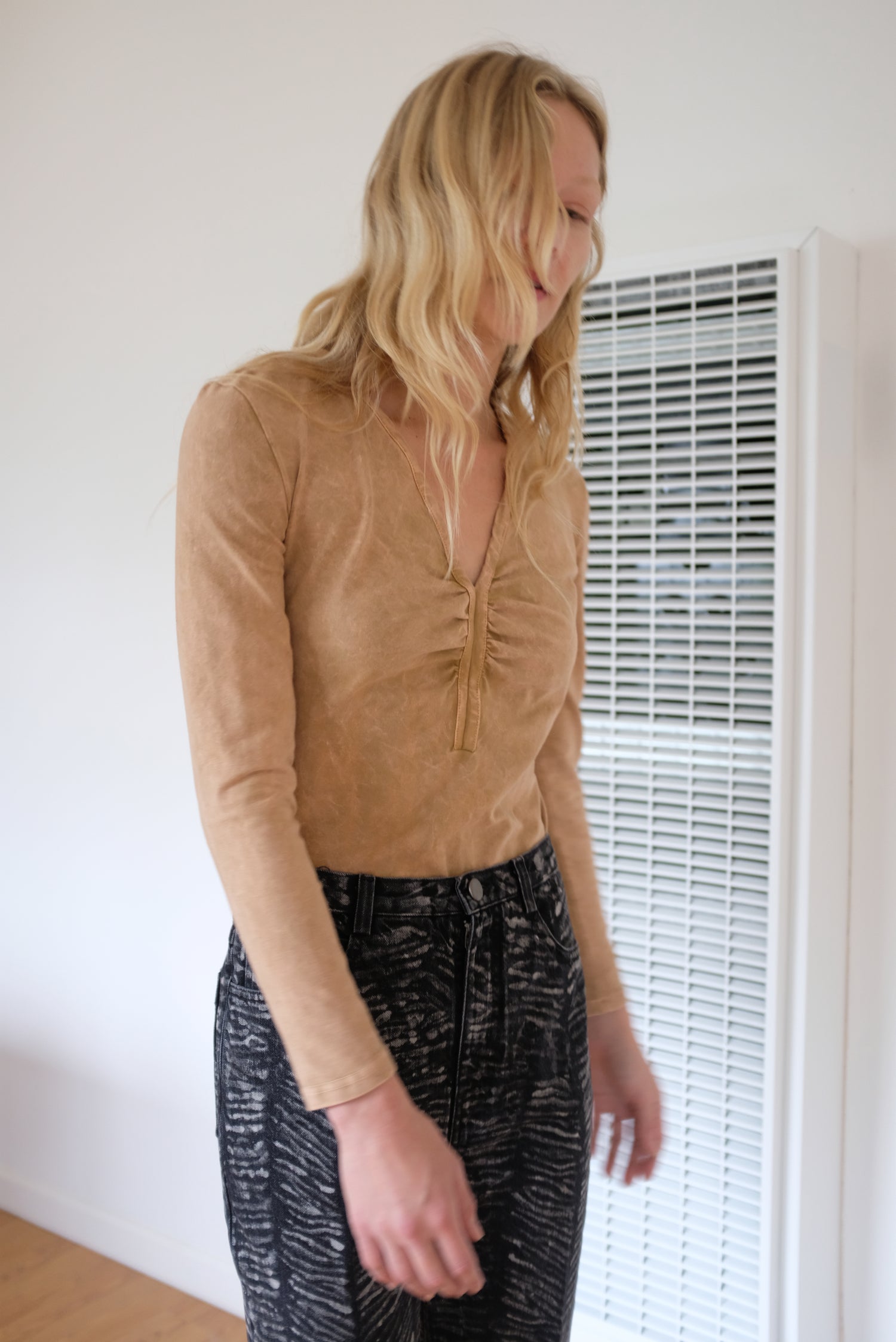 100% organic cotton, ultra soft dreamy thick jersey. Feels wonderful! Deep gathered v neckline, long sleeve. It's a cozy stretchy tee that dresses up or down depending on one's mood.