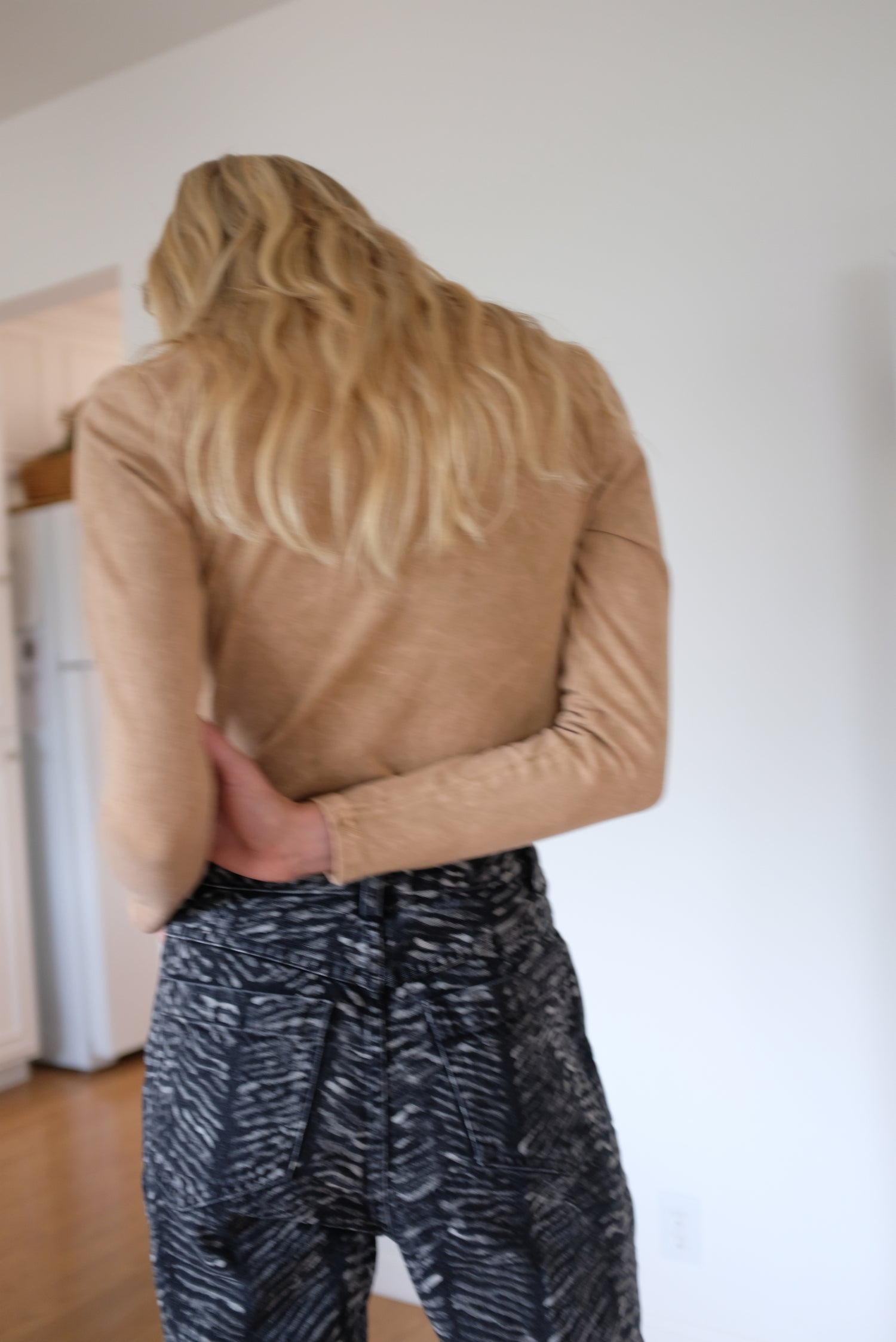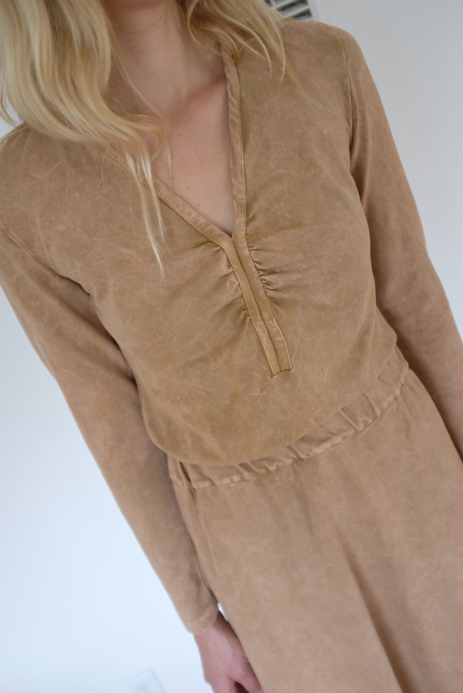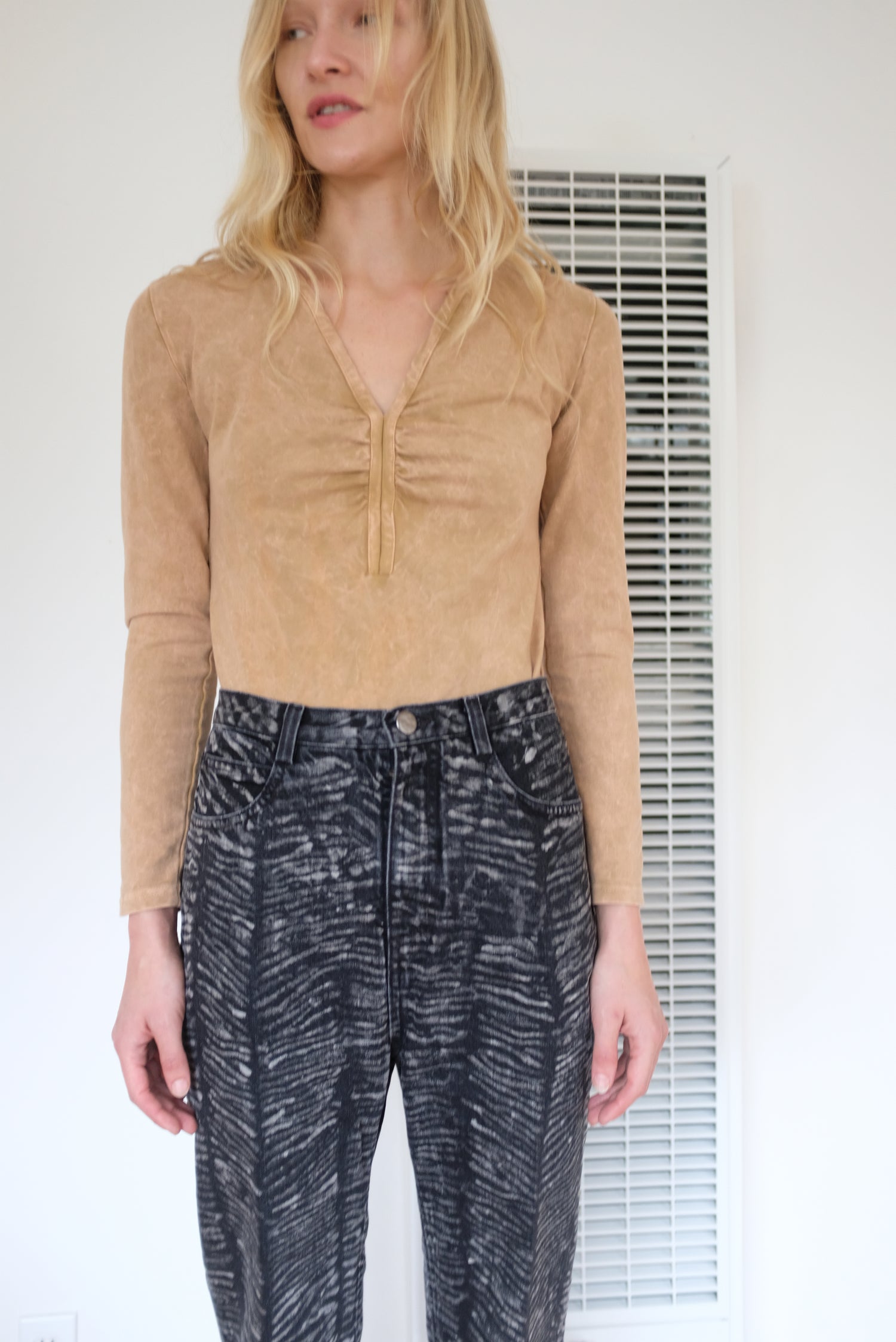 100% organic cotton, ultra soft dreamy thick jersey. Feels wonderful! Deep gathered v neckline, long sleeve. It's a cozy stretchy tee that dresses up or down depending on one's mood.
