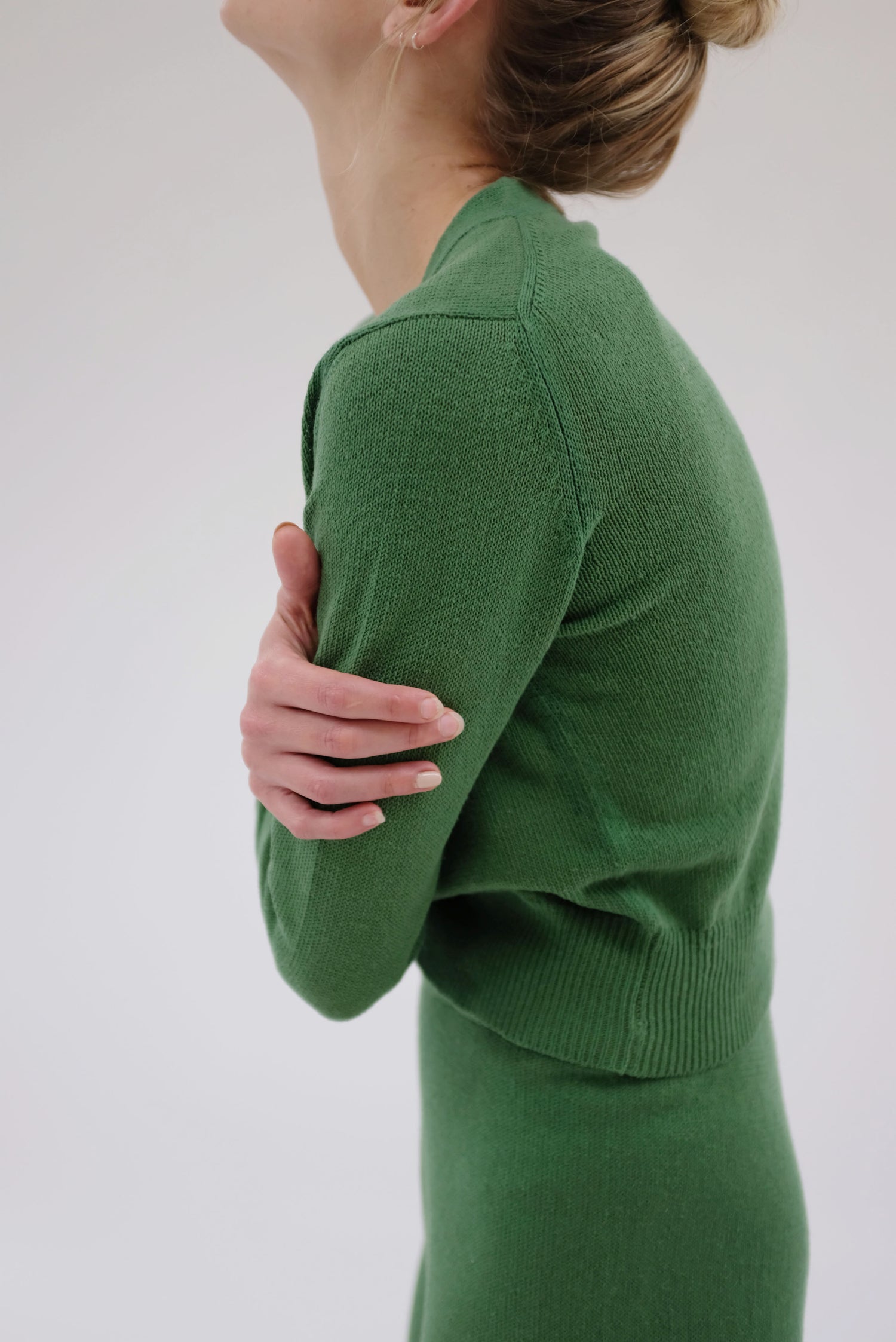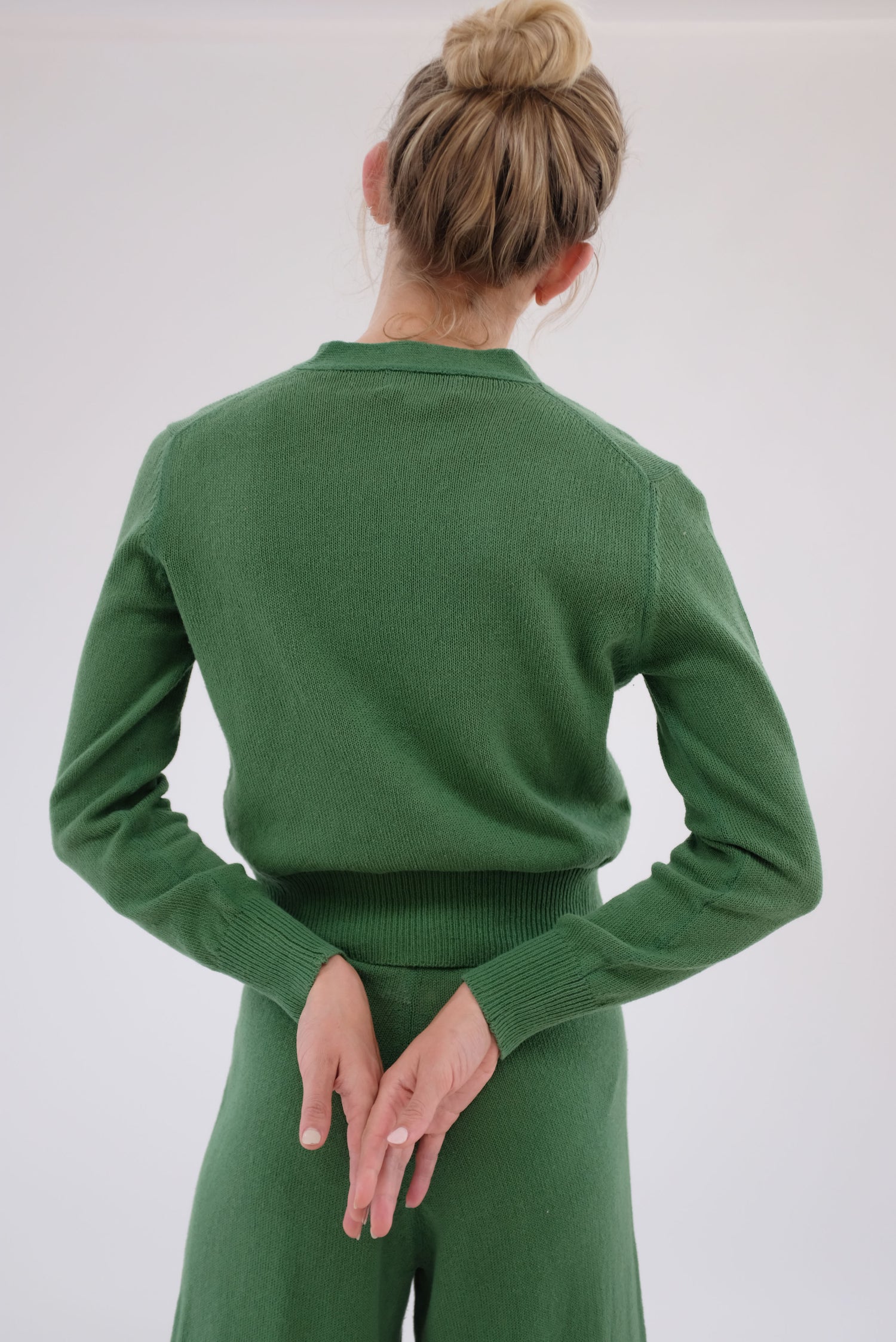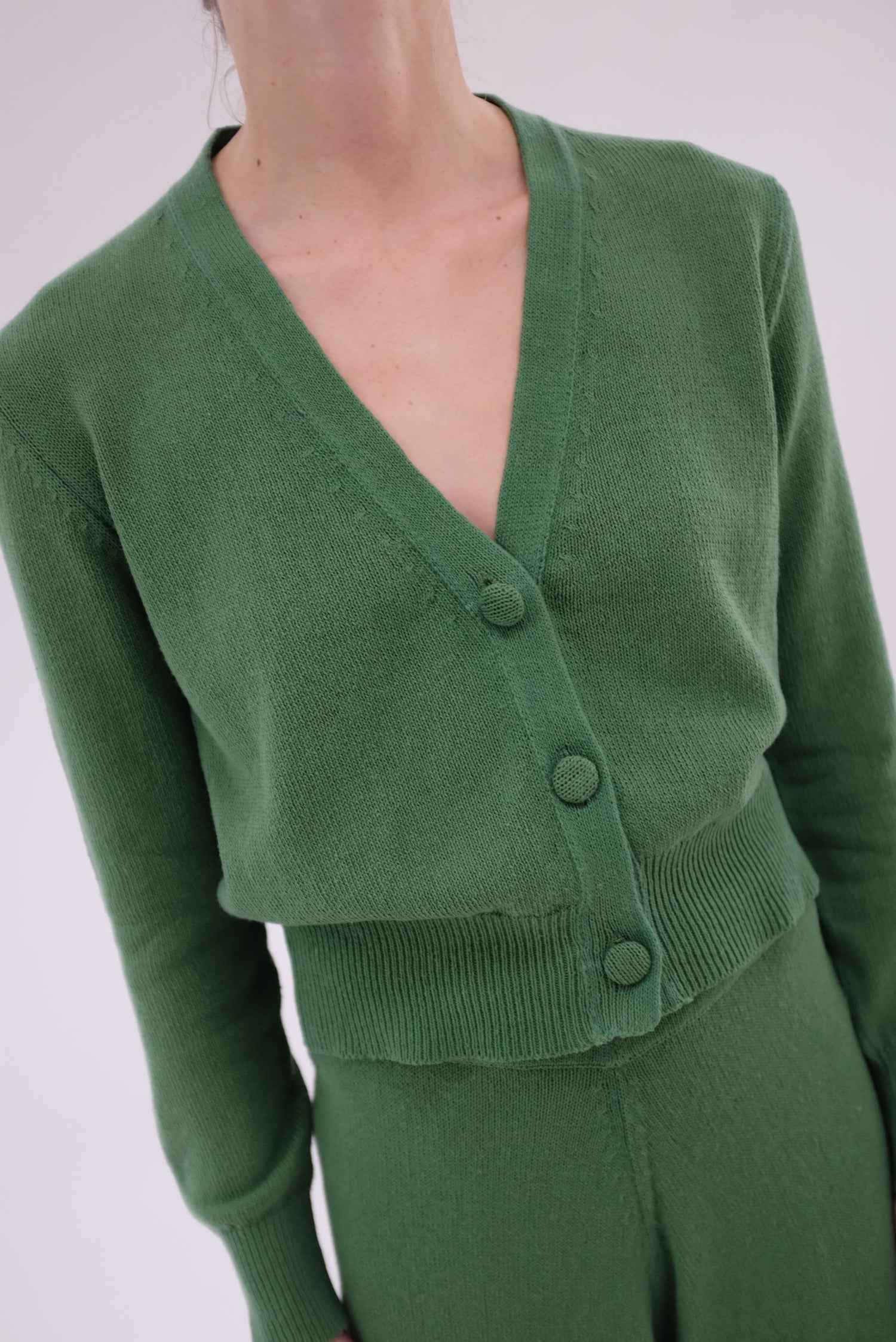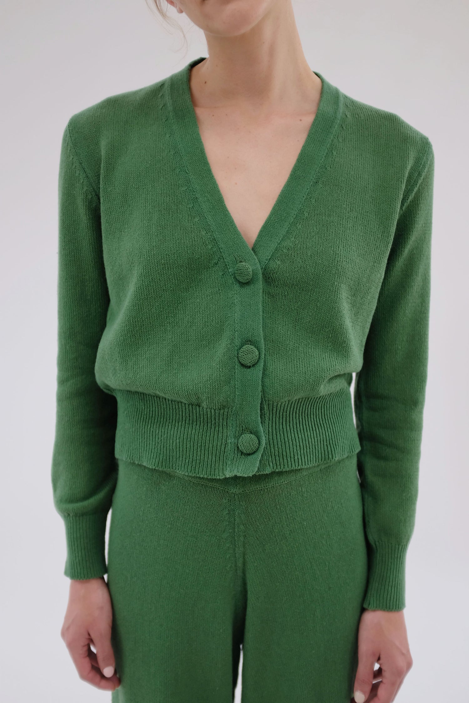100% Organic cotton knit, long sleeved, classic v-neck cardigan, fabric covered buttons down front. Medium weight, not sheer, soft cotton, wear as a layering piece or on it's own, solo.