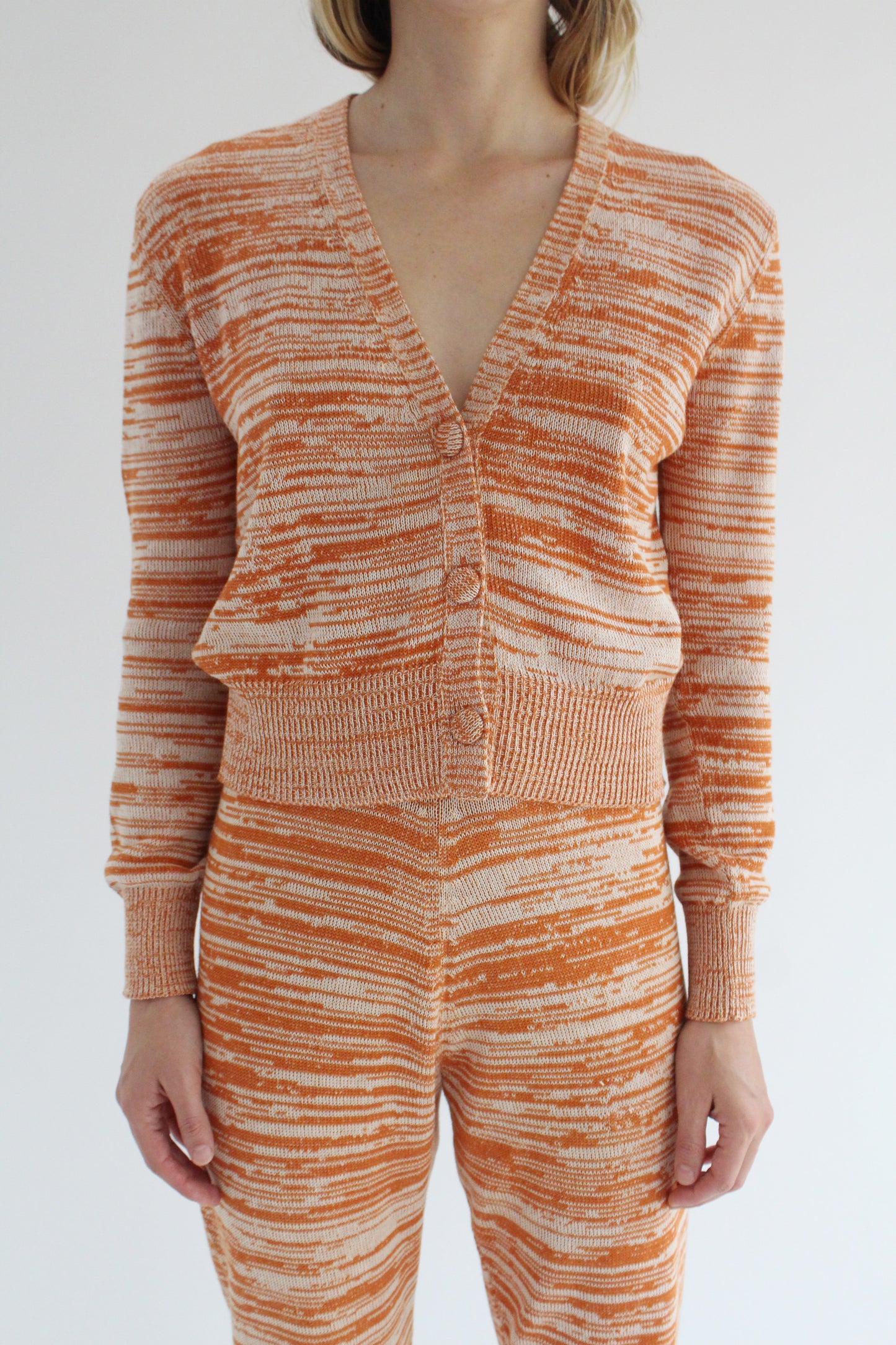 Space dye knit, long sleeved, classic v-neck cardigan, fabric covered buttons down front. Medium weight, not sheer, soft cotton, wear as a layering piece or on it's own, solo. 100% Cotton. Exclusive to Beklina.