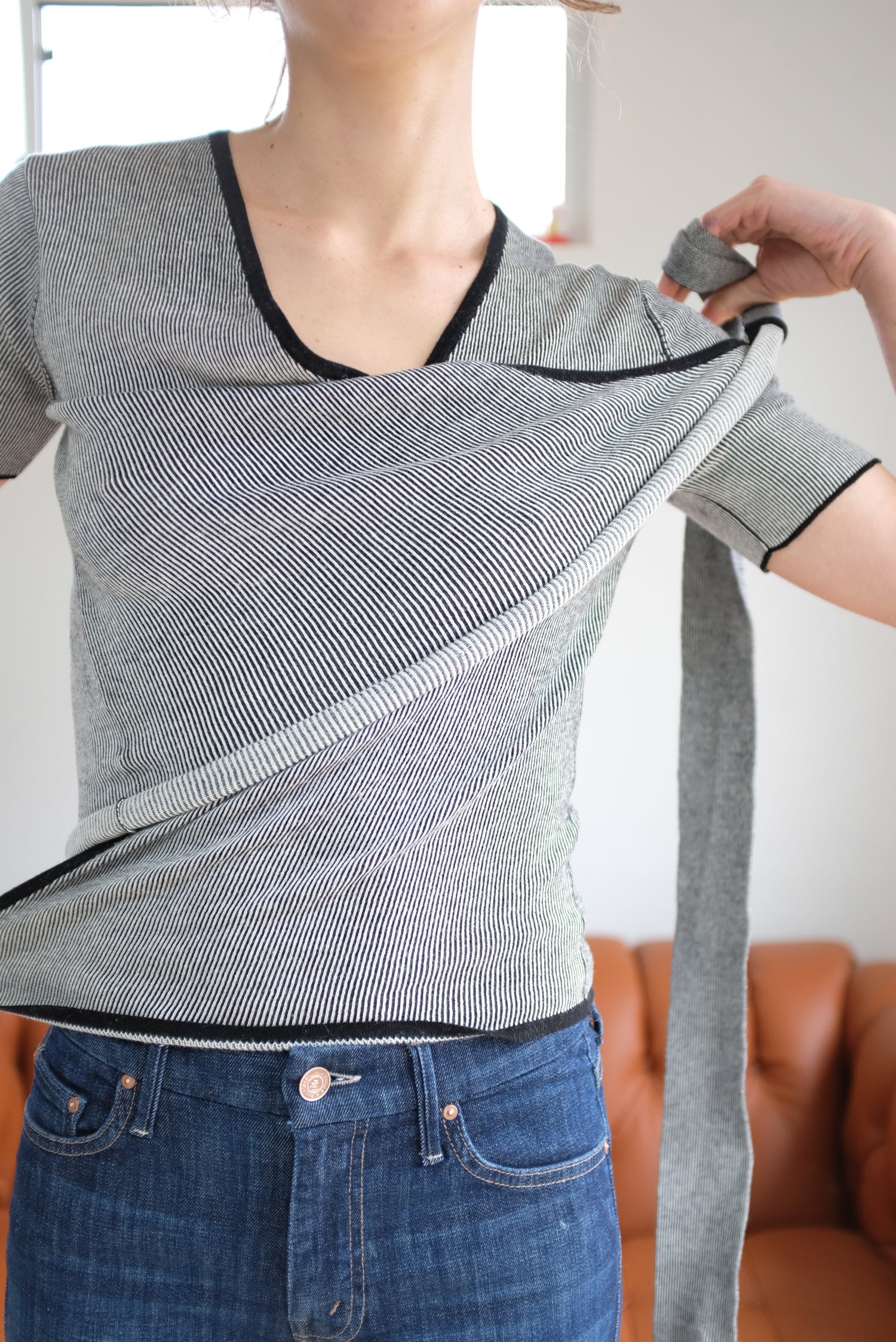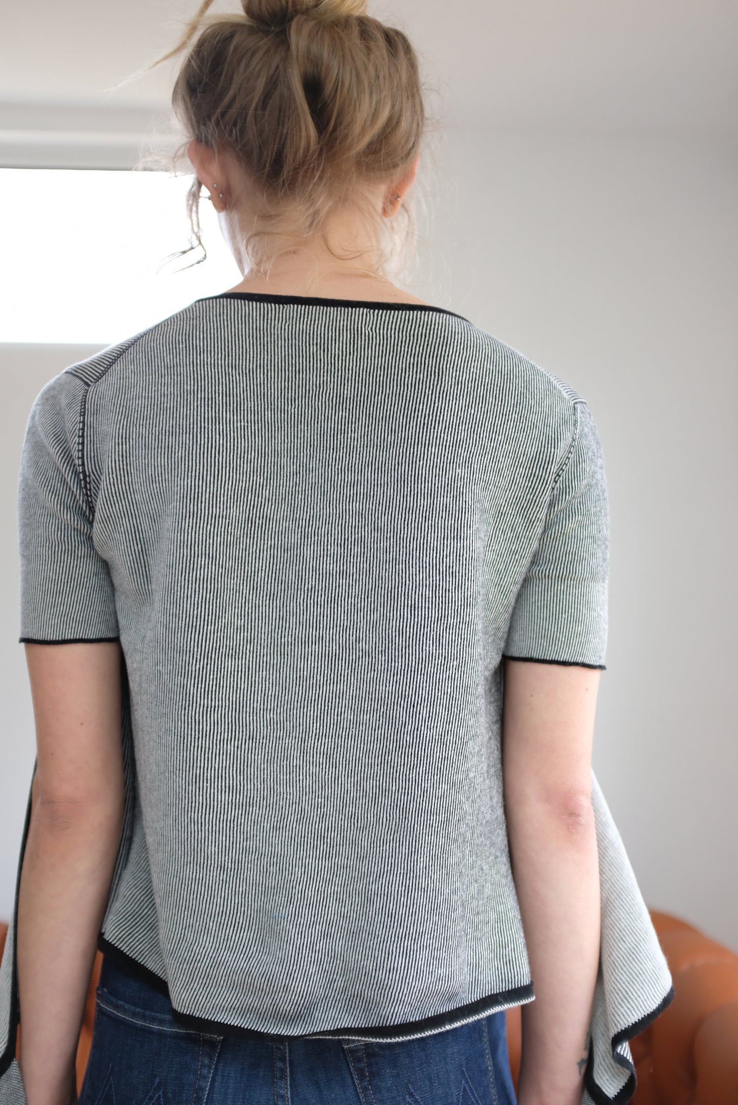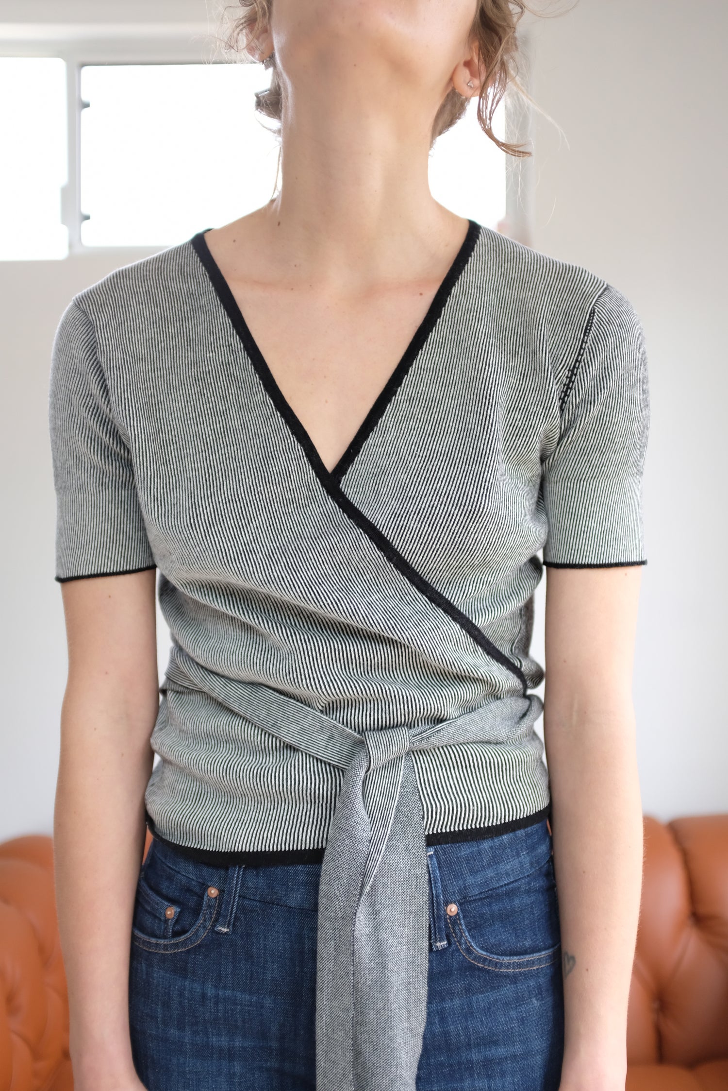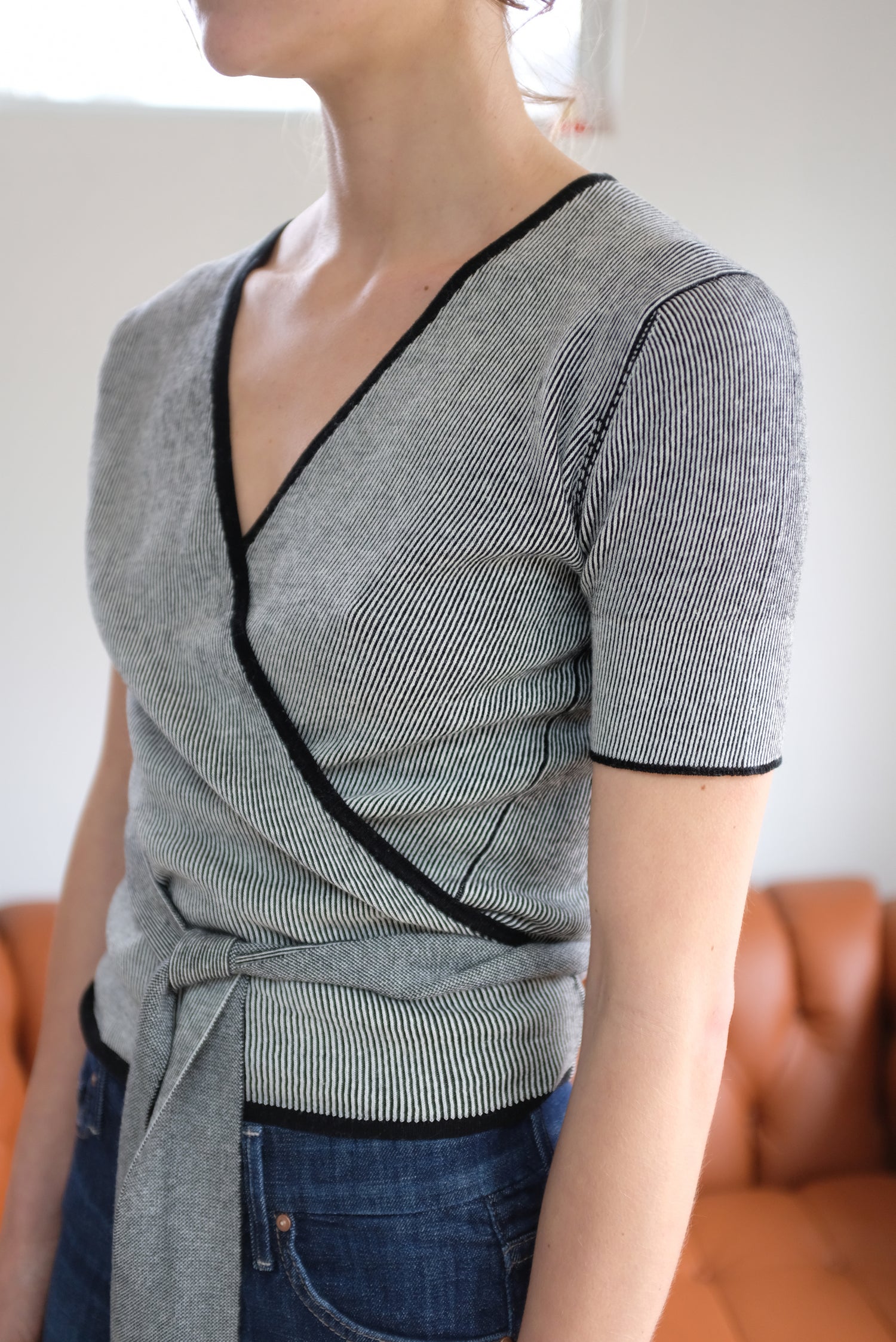 100% Organic Cotton knit, short sleeved, ballet wrap with long and wide adjustable wrap ties that make sweater completely adjustable. Medium weight, soft cotton, wear as a layering piece or on it's own, solo.
