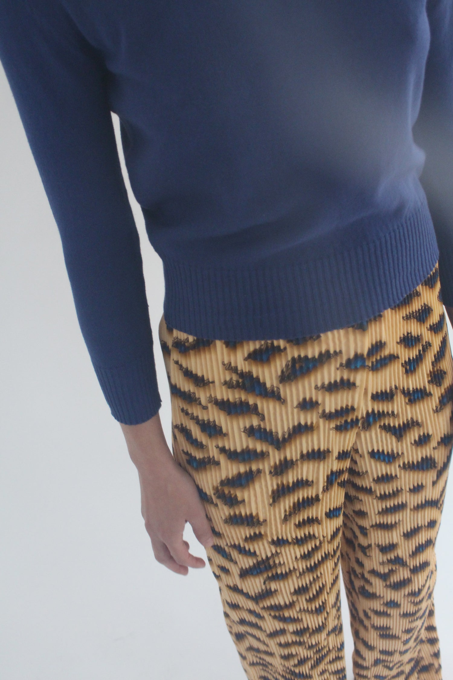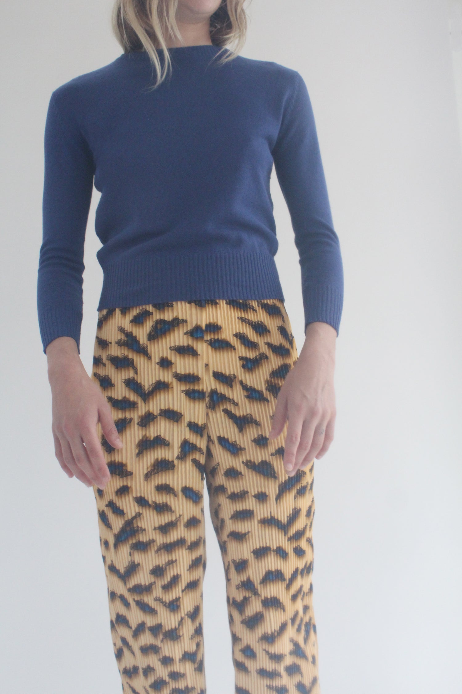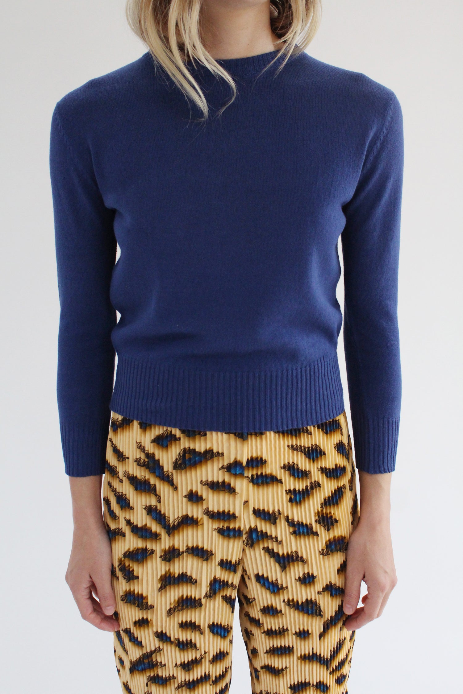 Crewneck cotton knit top. Pairs perfectly with high waisted pants. Light weight, not sheer, wear as a second skin, or on its own. 3" ribbing at cuffs and waist. 100% Cotton. Exclusive to Beklina.