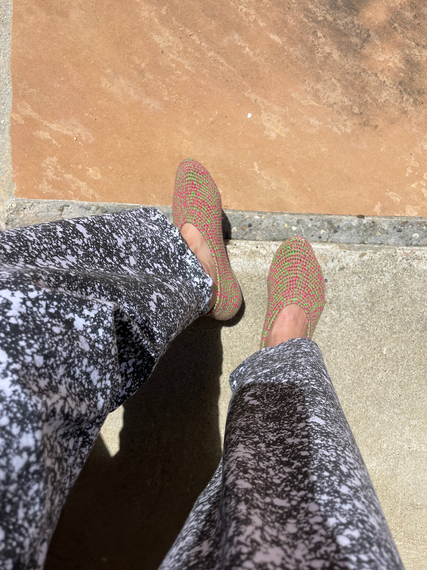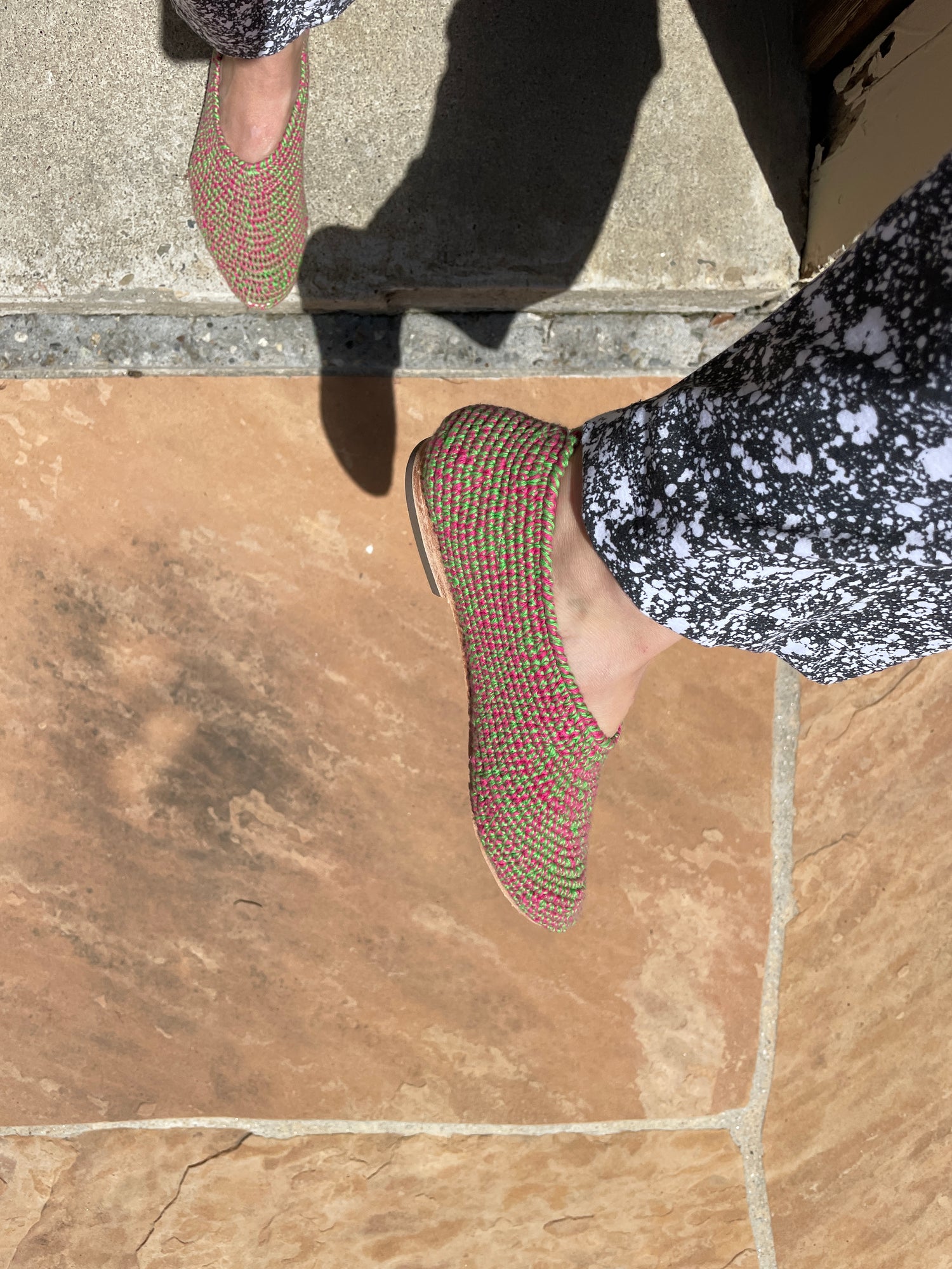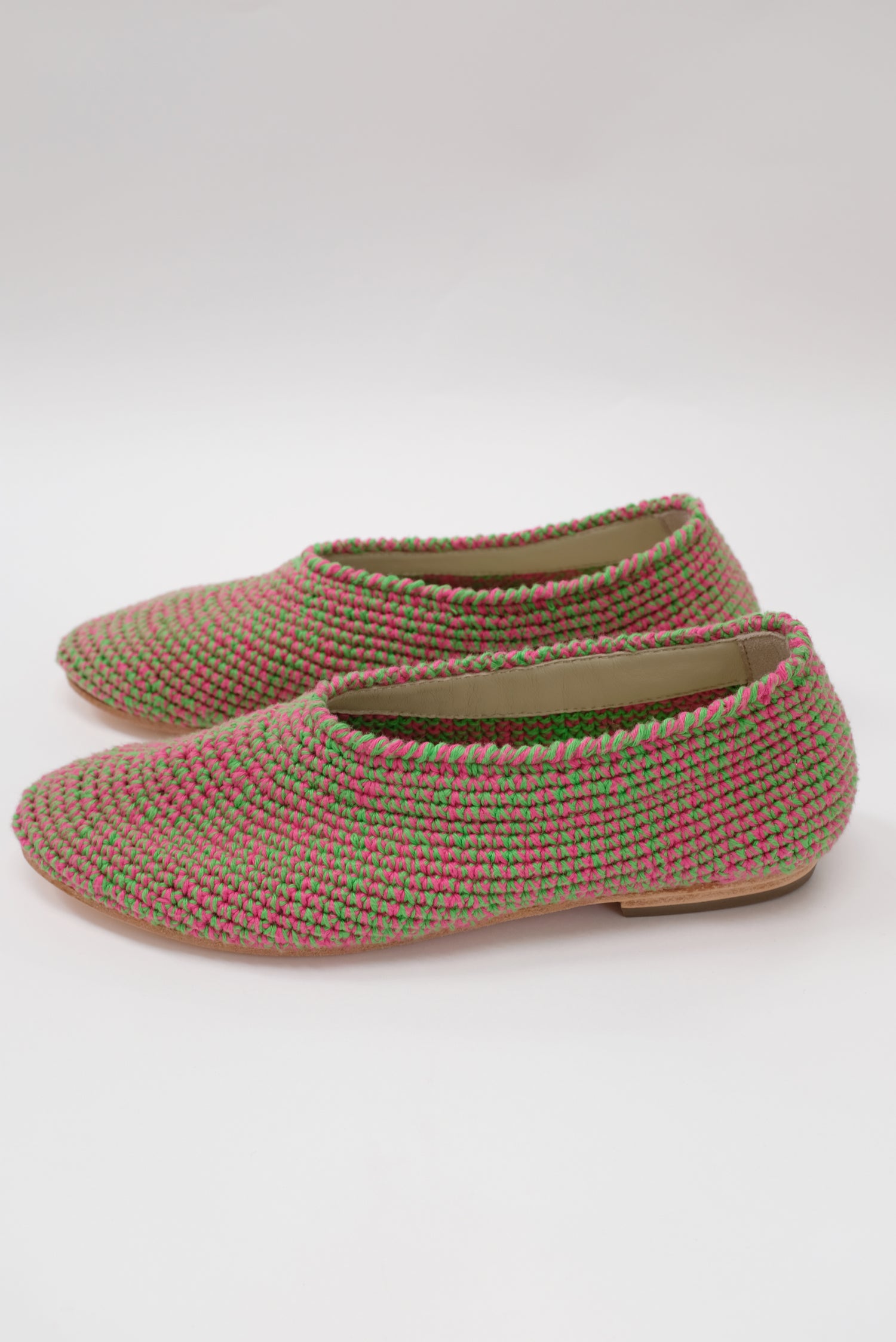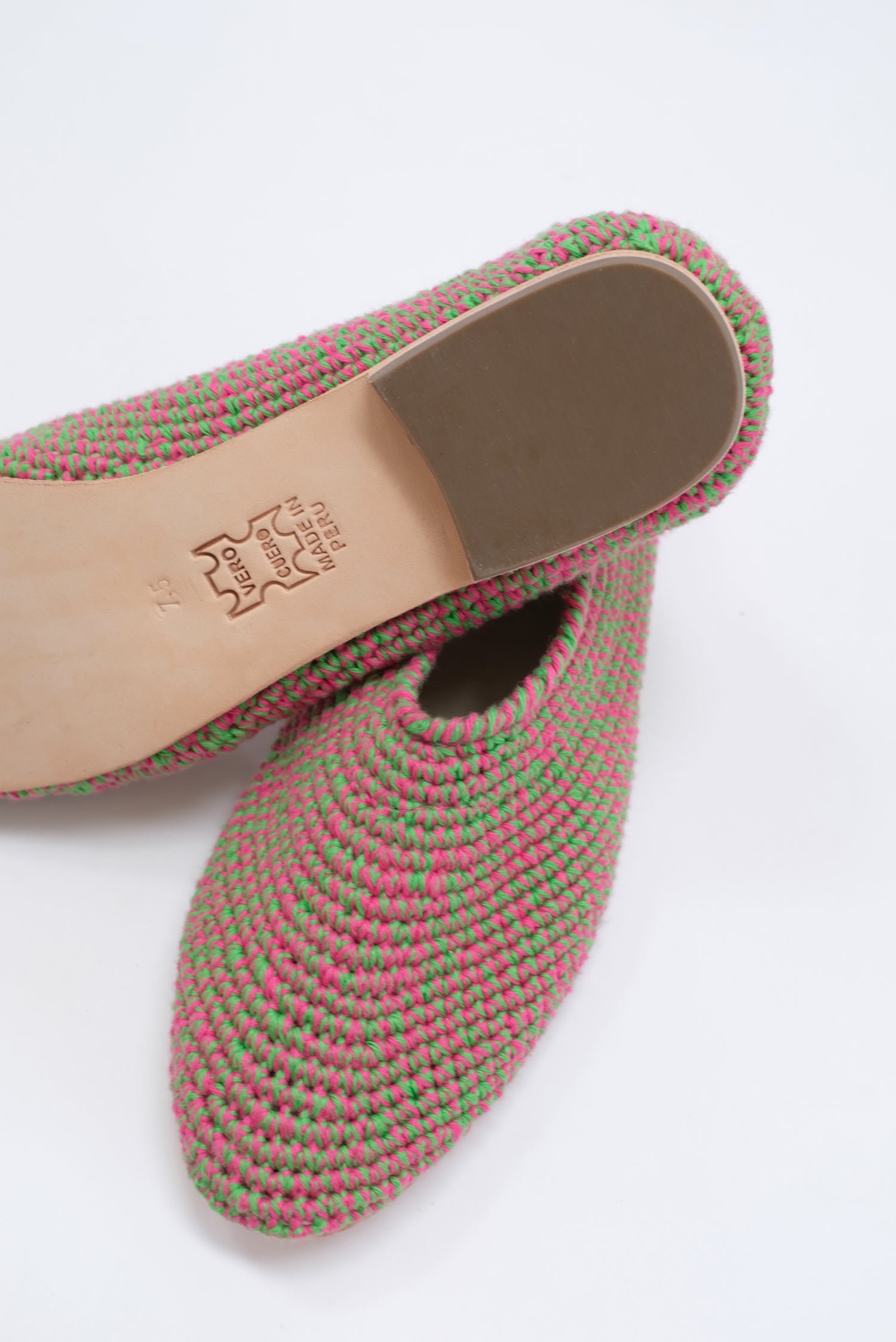 100% Hand crocheted Peruvian cotton. Luxurious glove fitting flats that mold to your feet and breathe. We're extremely proud of these beautiful handmade shoes.