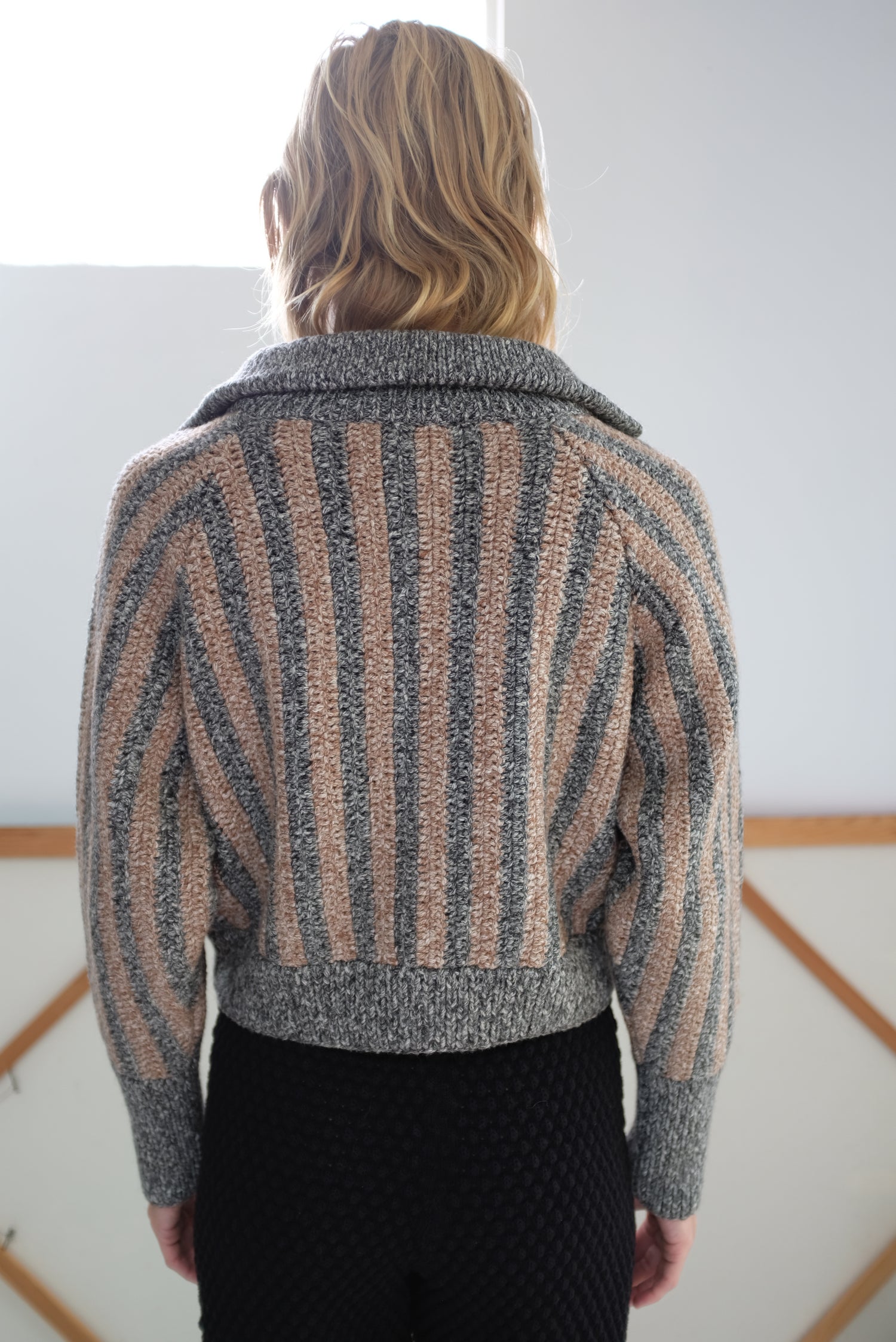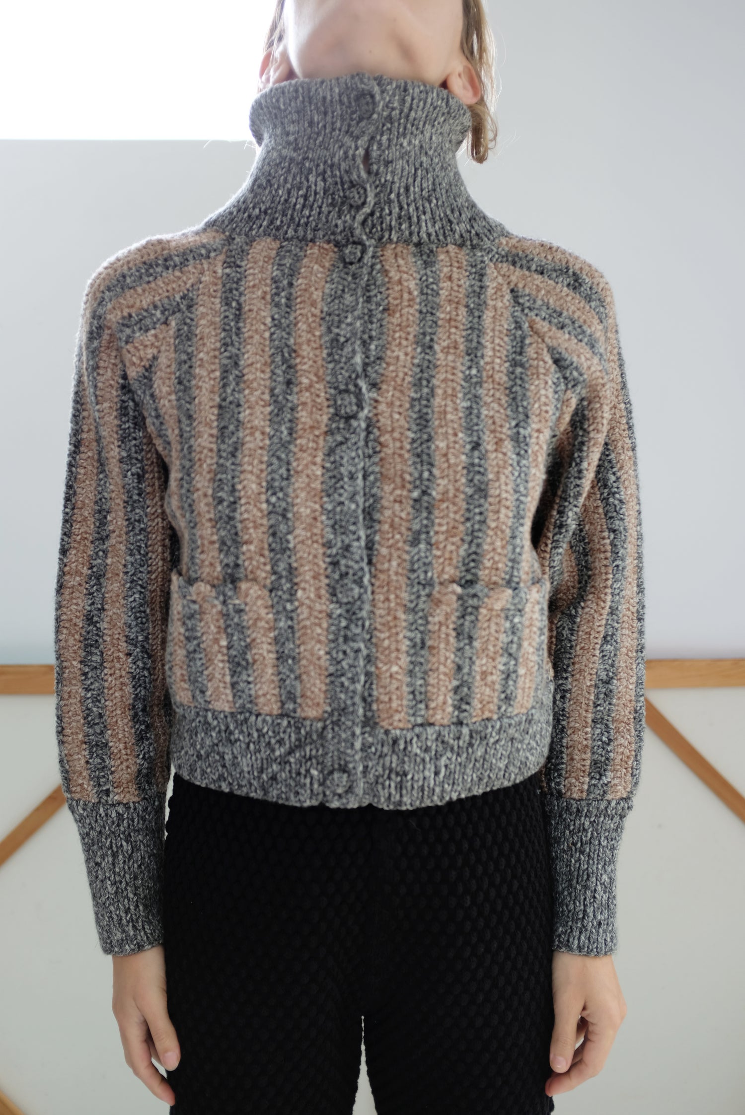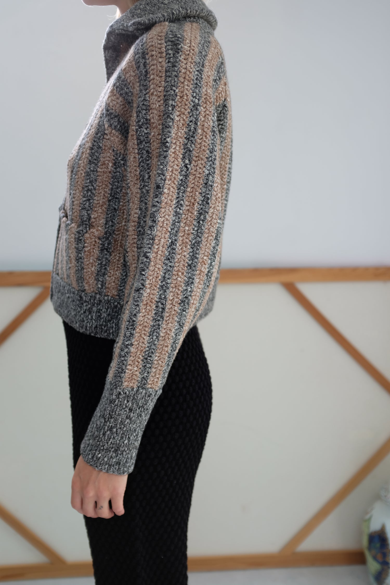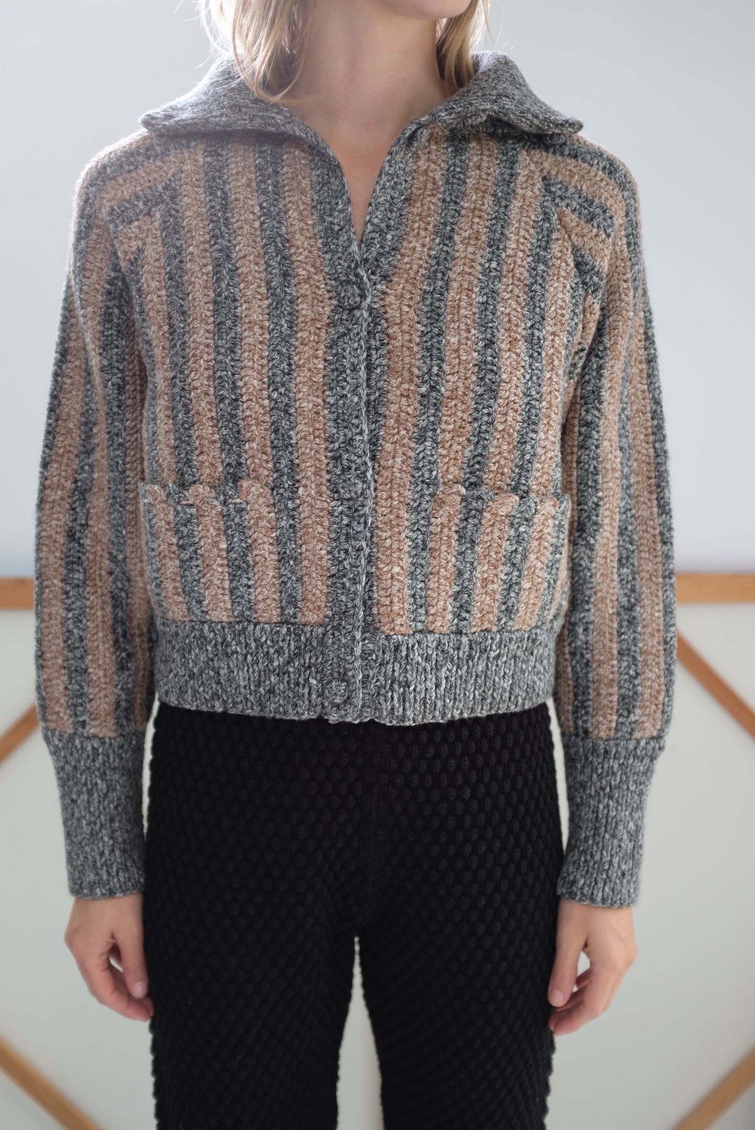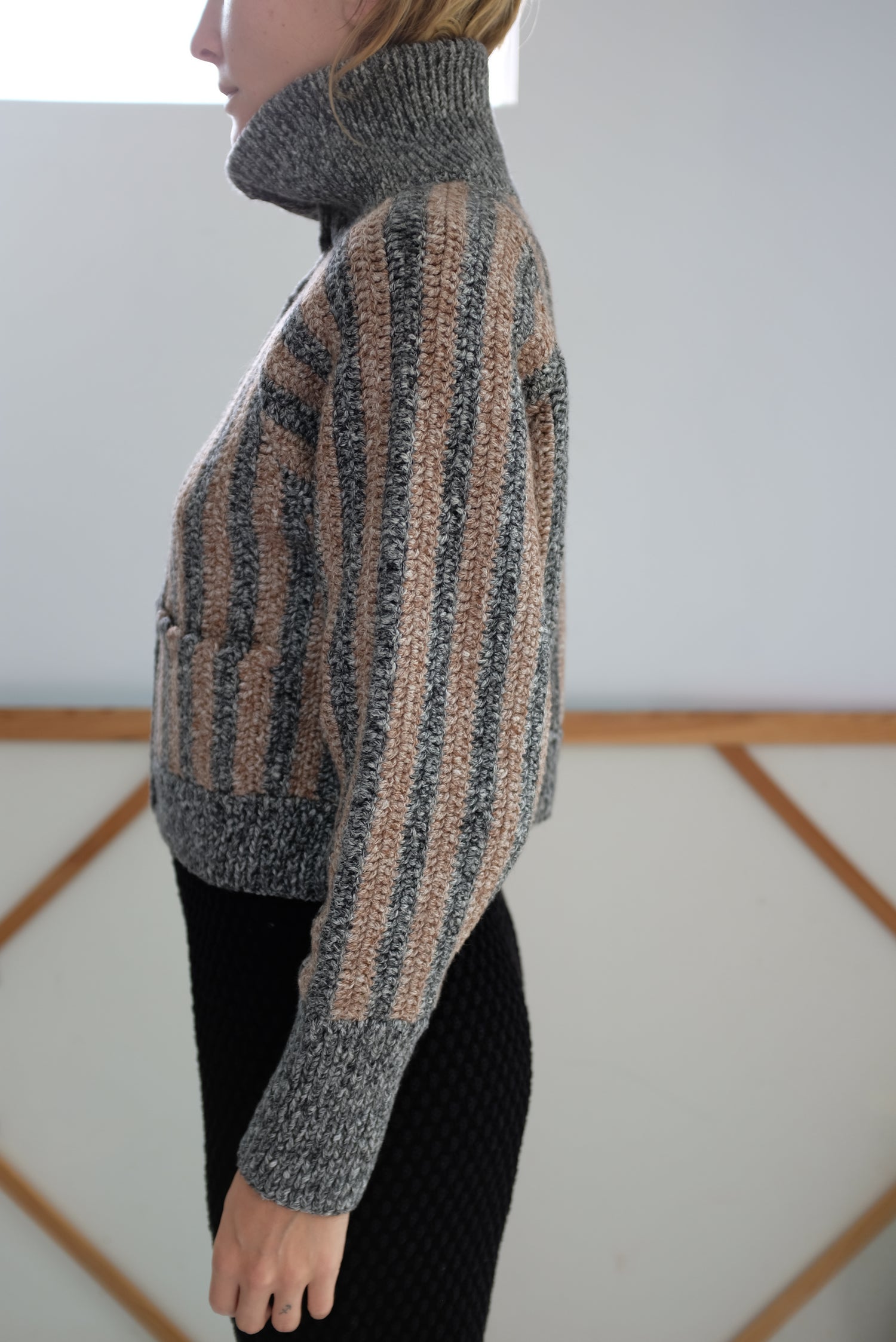 Ultra luxurious baby alpaca, organic cotton blend, thick and warm with the perfect amount of structure and weight. Crocheted by hand, cropped jacket, long sleeved, button up front with a 5" ribbed stand-up collar for warmth and soft comfort. 5.5” ribbed cuff at wrist, front pockets. Functions as a cardigan, but substantial enough to be worn as a true jacket. 68% Baby alpaca, 32% pima organic cotton.