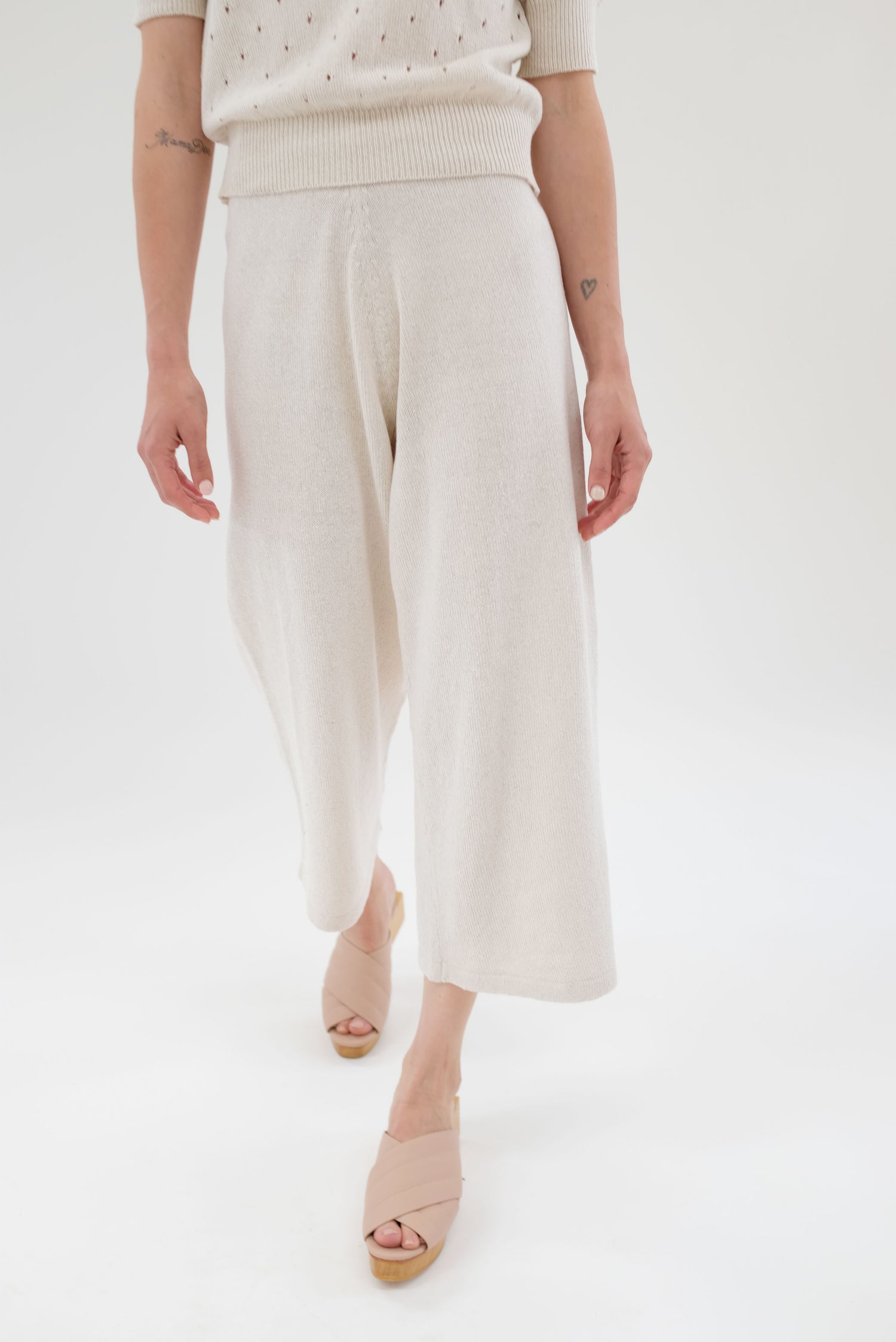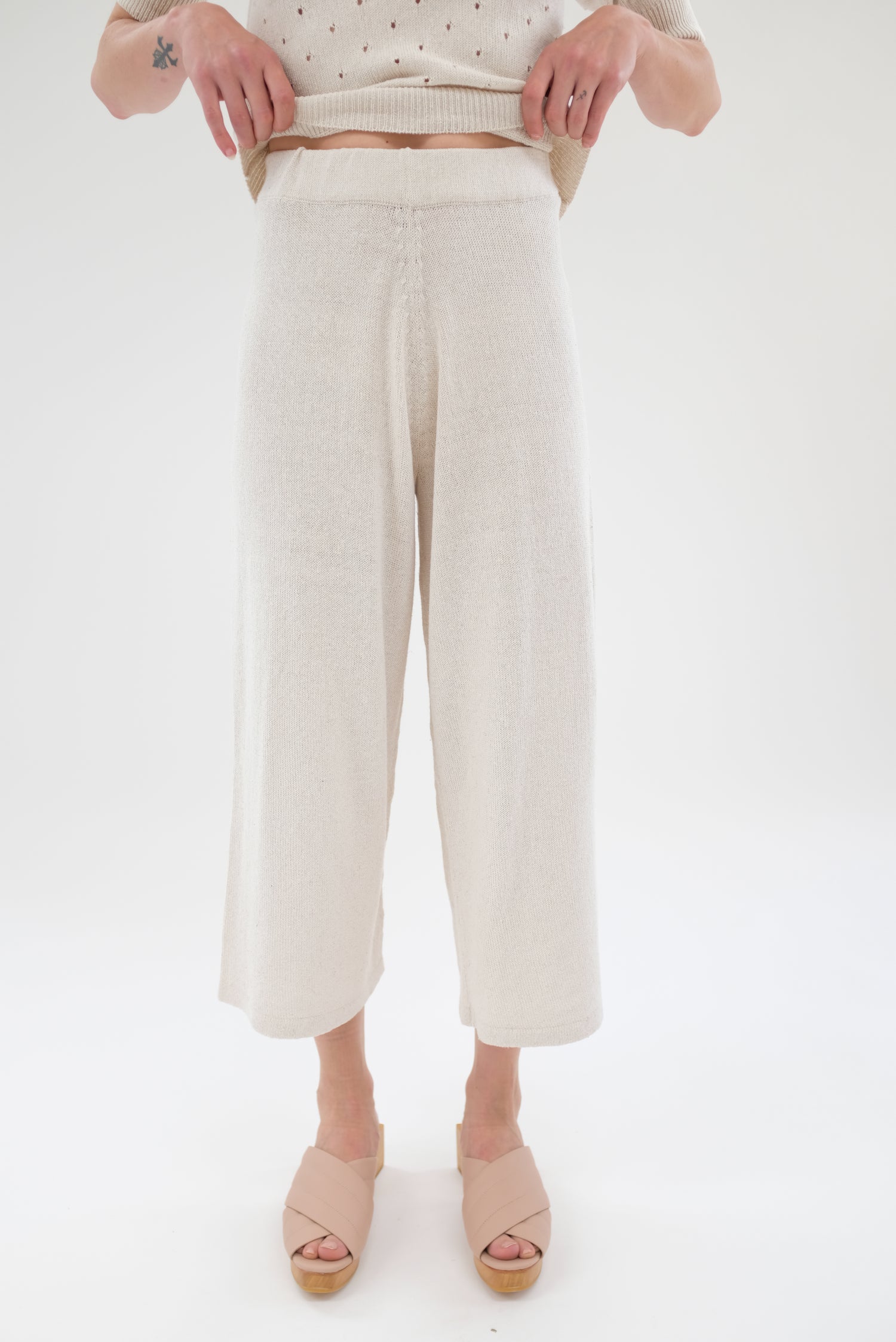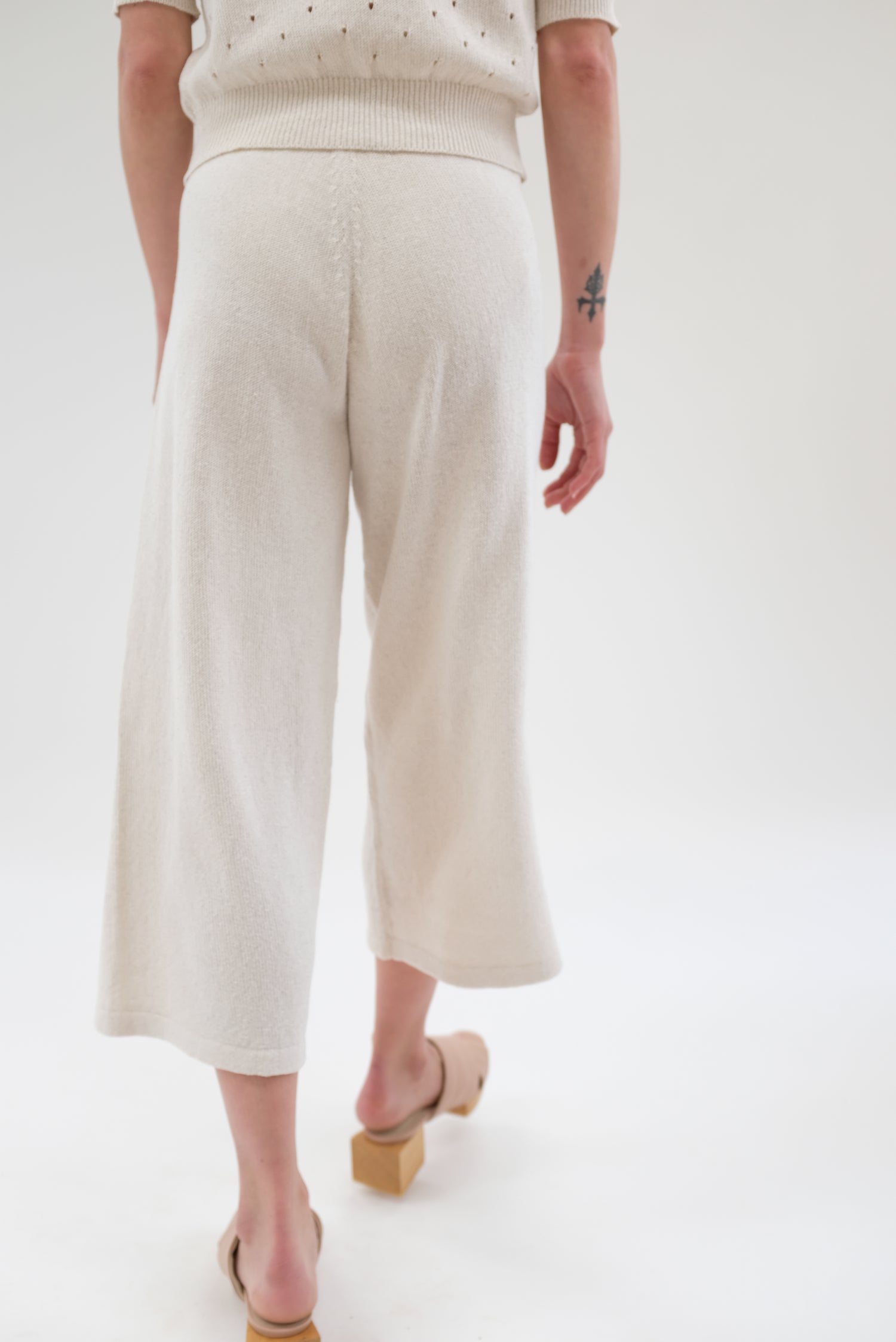 Cropped, high waisted, wide leg pant. Hand knit. 100% Organic cotton. Not a bright white, more of an off white, natural raw unbleached organic cotton color/yarn.