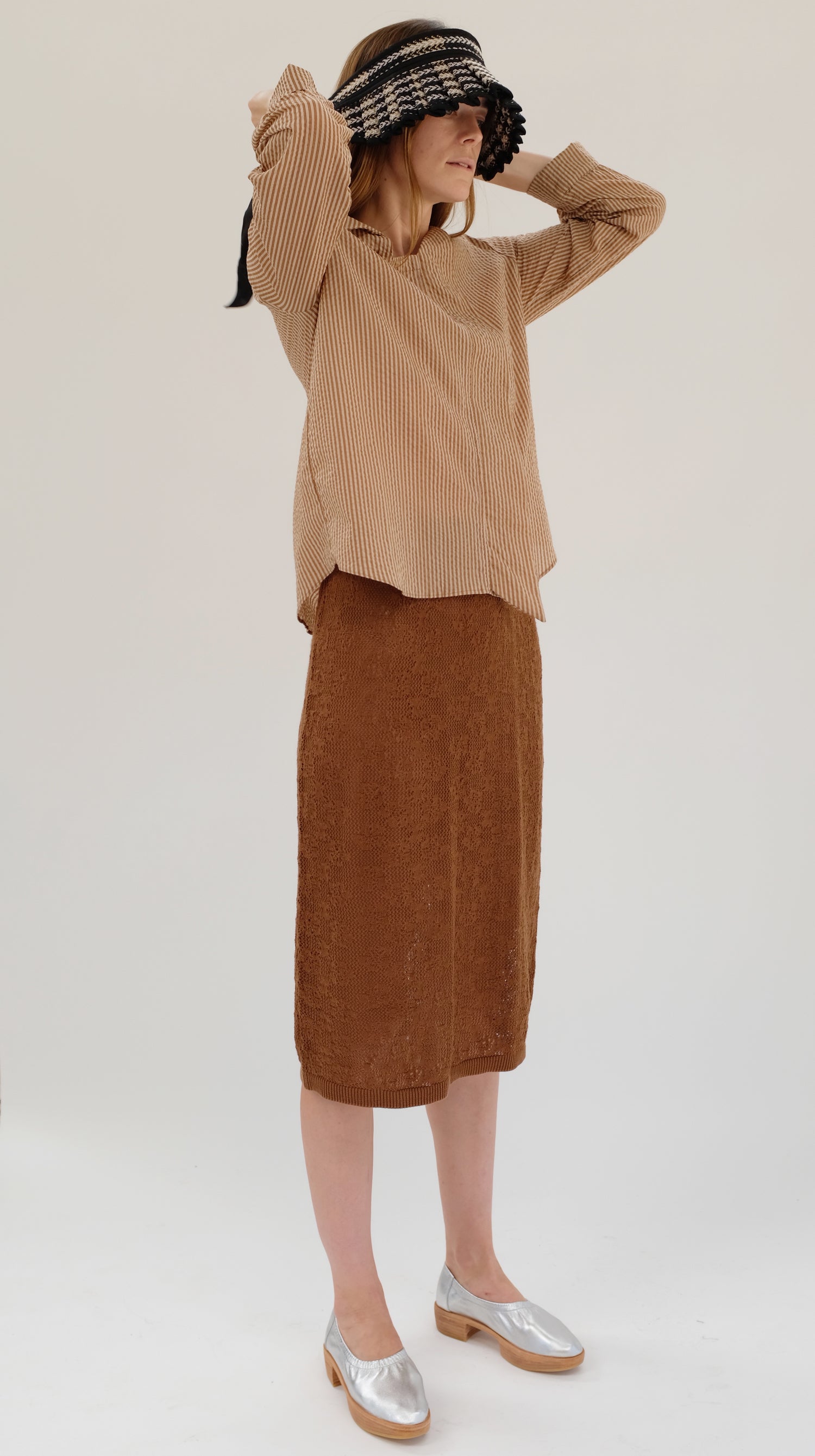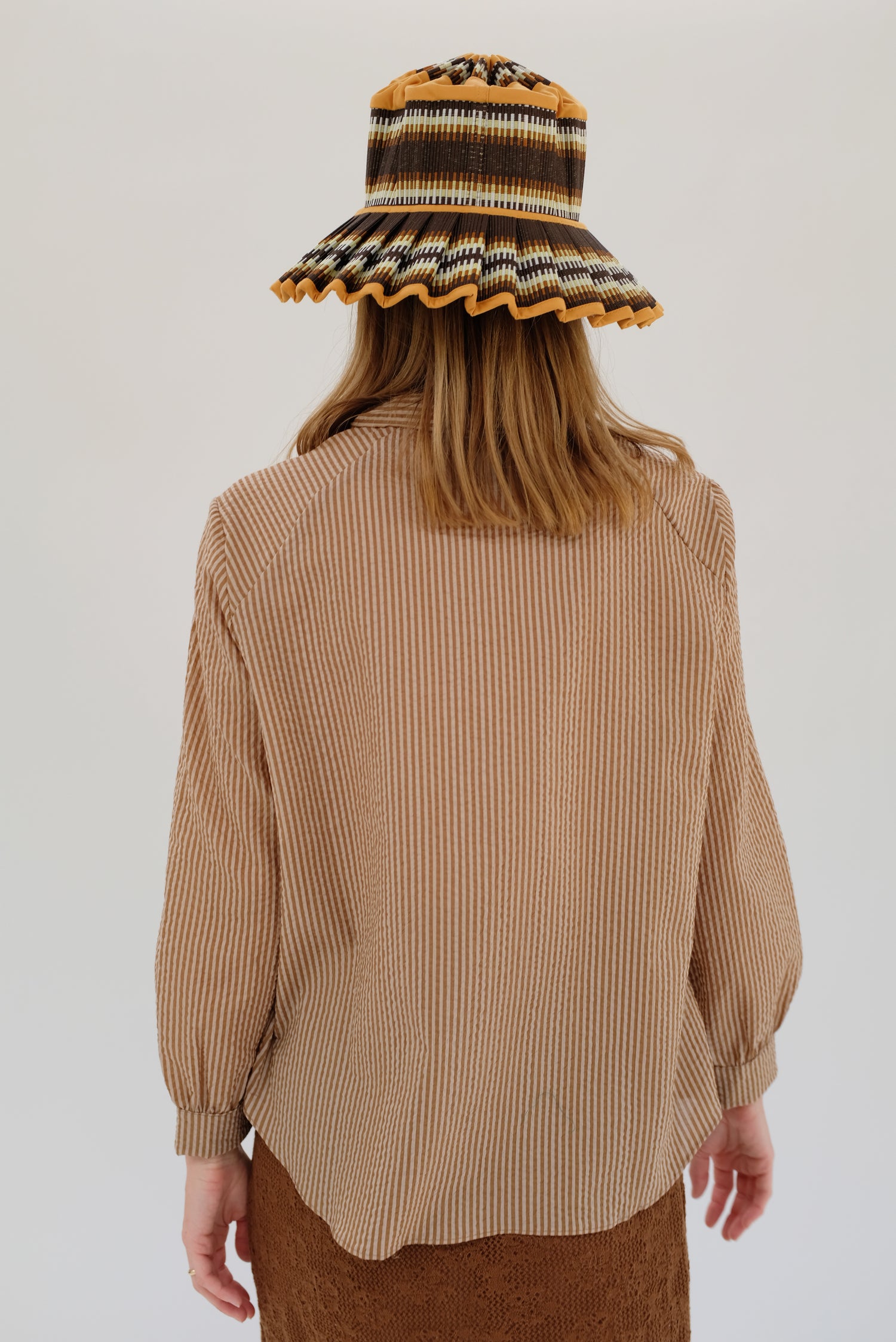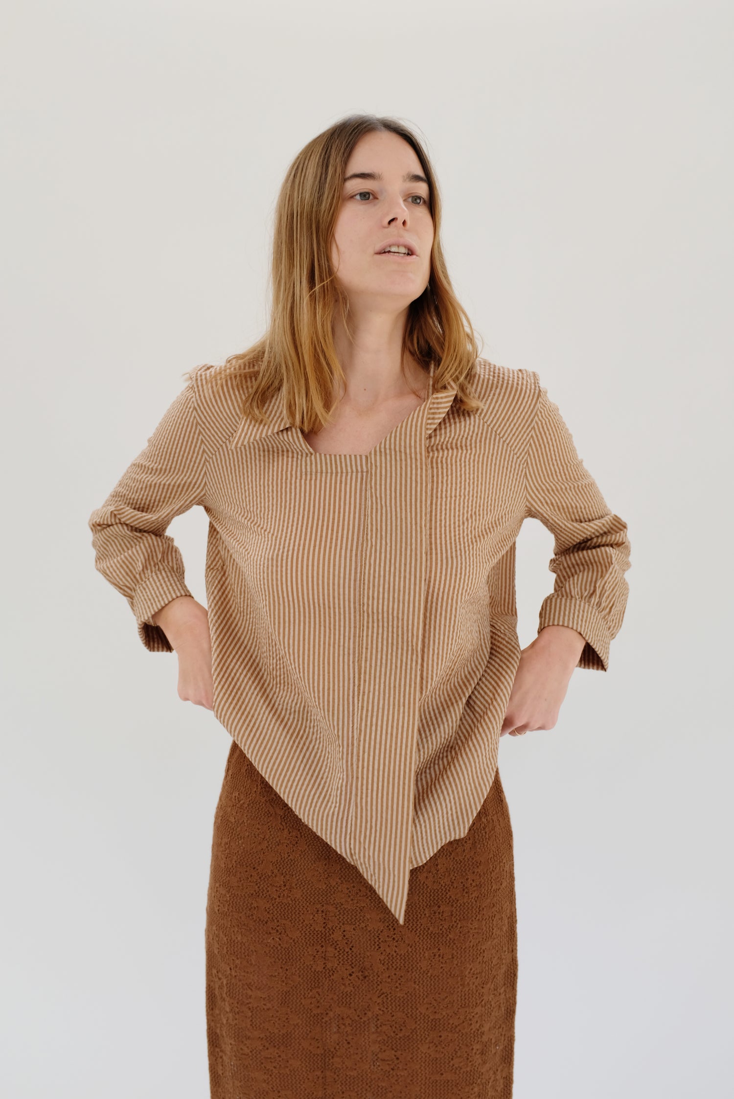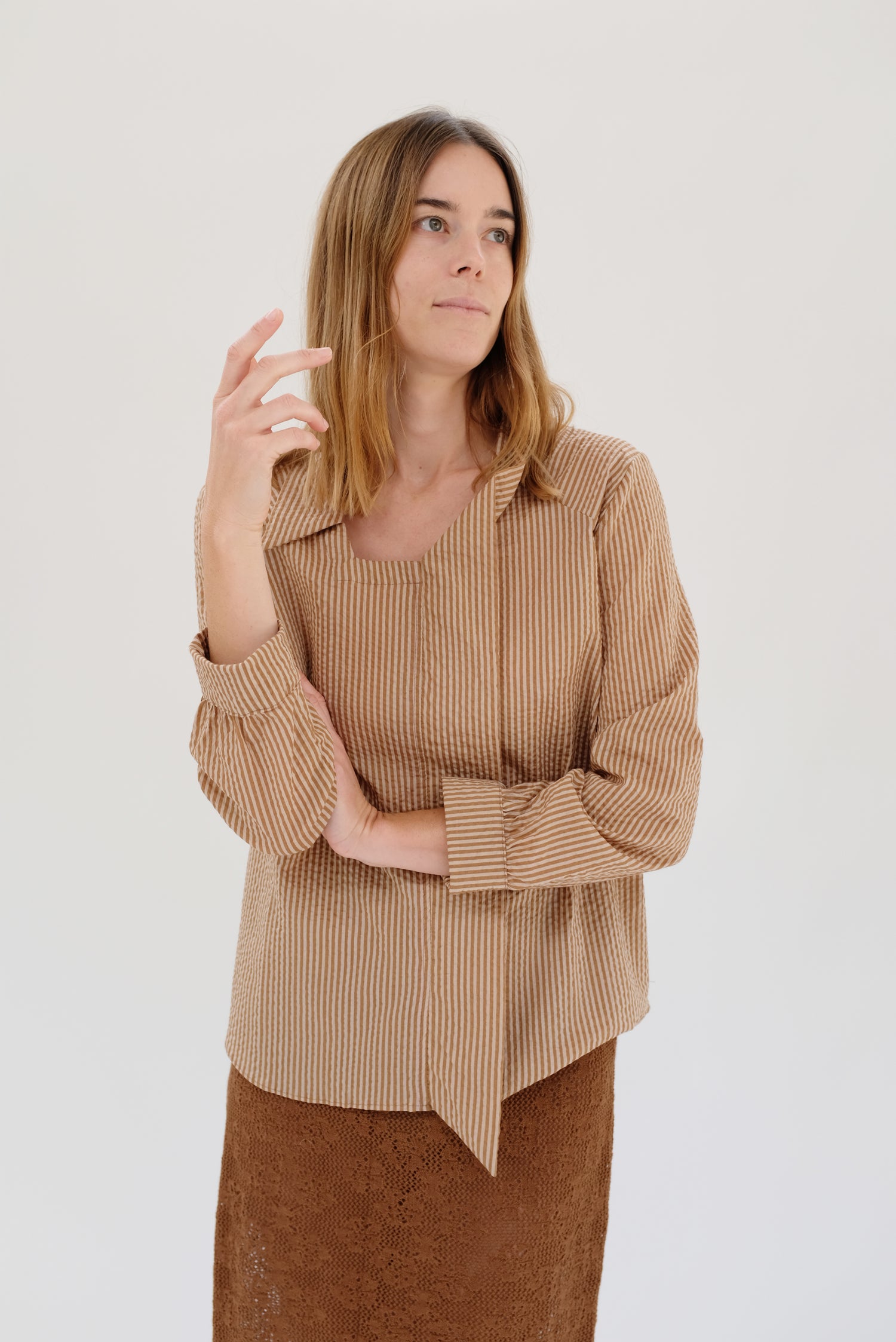 100% Japanese woven cotton, 1/2 collar detail, enclosed seams, cuff and gathered sleeves, pull over head style. This pullover cotton blouse is a shop favorite.
