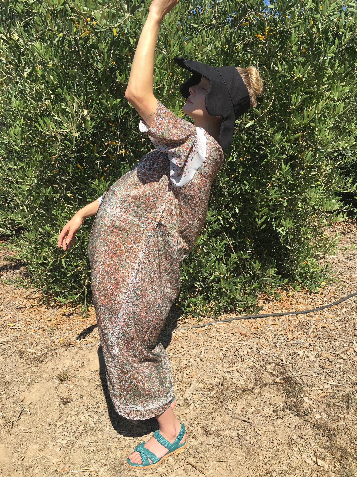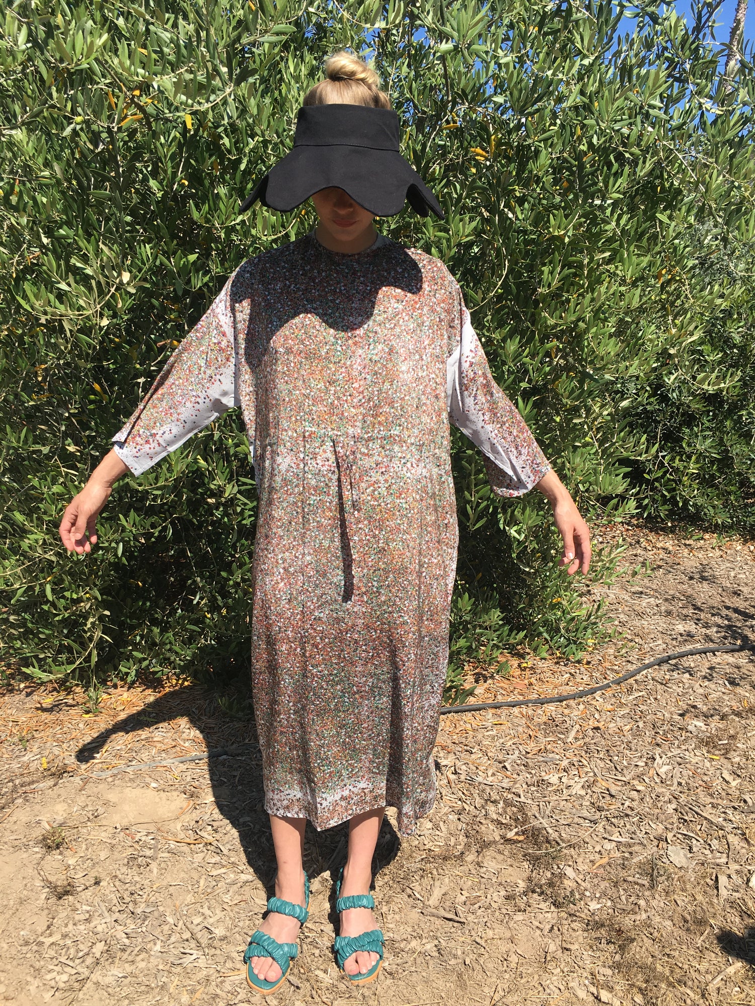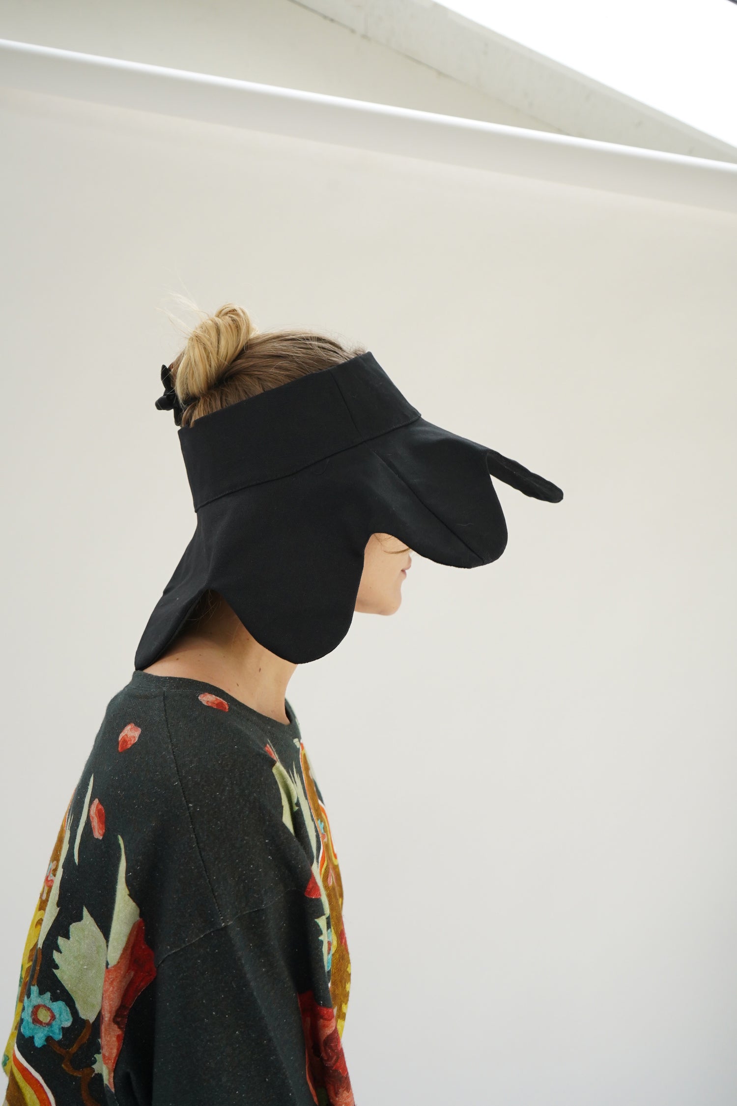 100% Heavy organic cotton canvas, topless sunhat, functional sun protection, very packable and great for travel. Casts a lovely shadow necklace when in full sun. Semi-floppy but with structure.