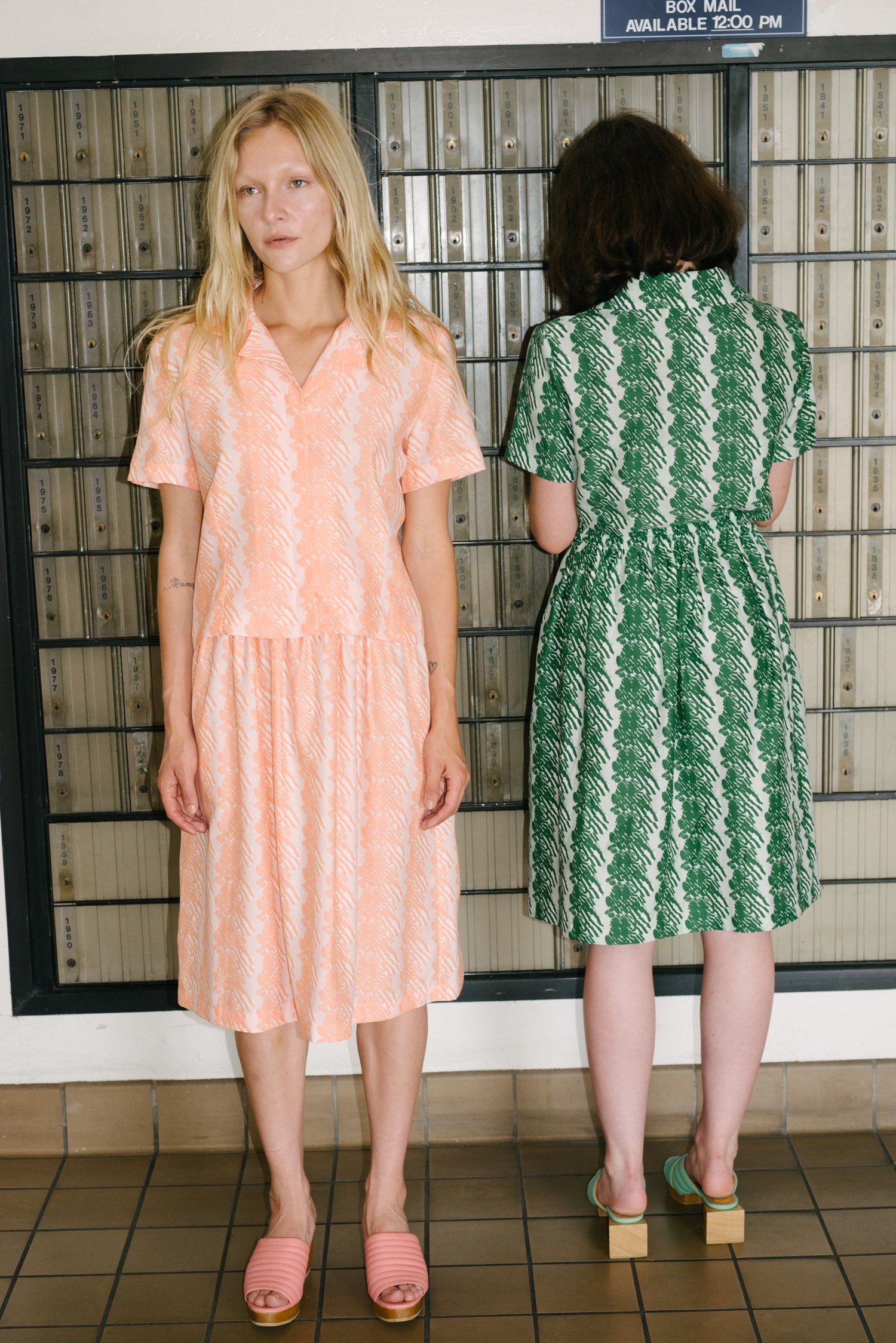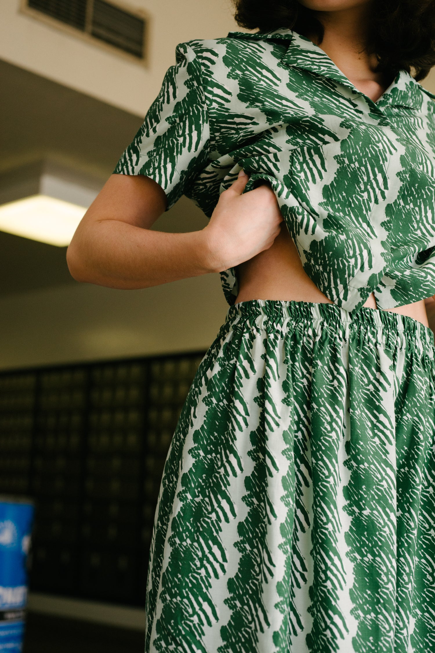 Midi skirt, side pockets, elastic waist. Not sheer. Silk cotton woven blend, hand printed in Los Angeles & sewn in San Francisco. French Ribbon limited edition print.