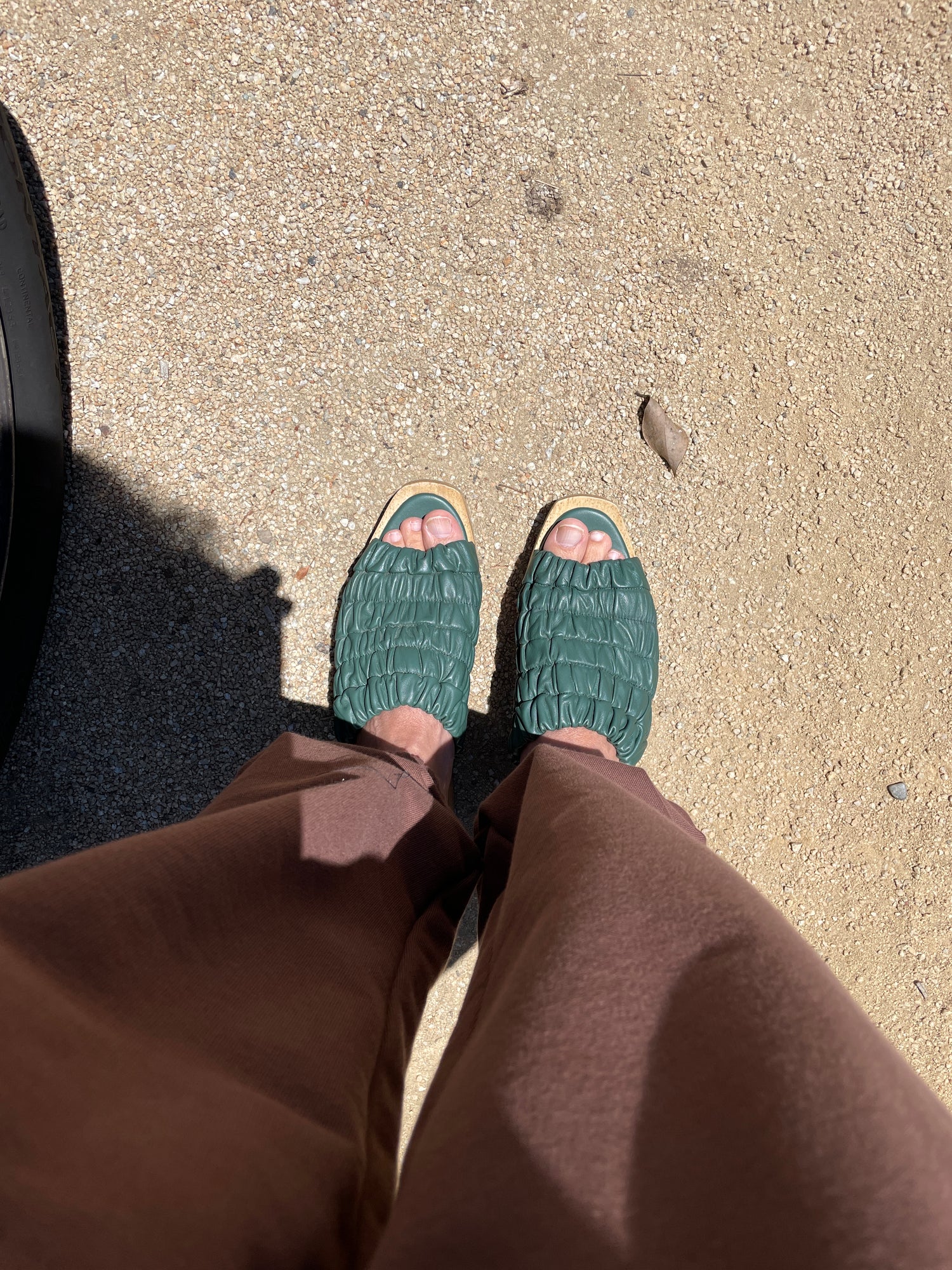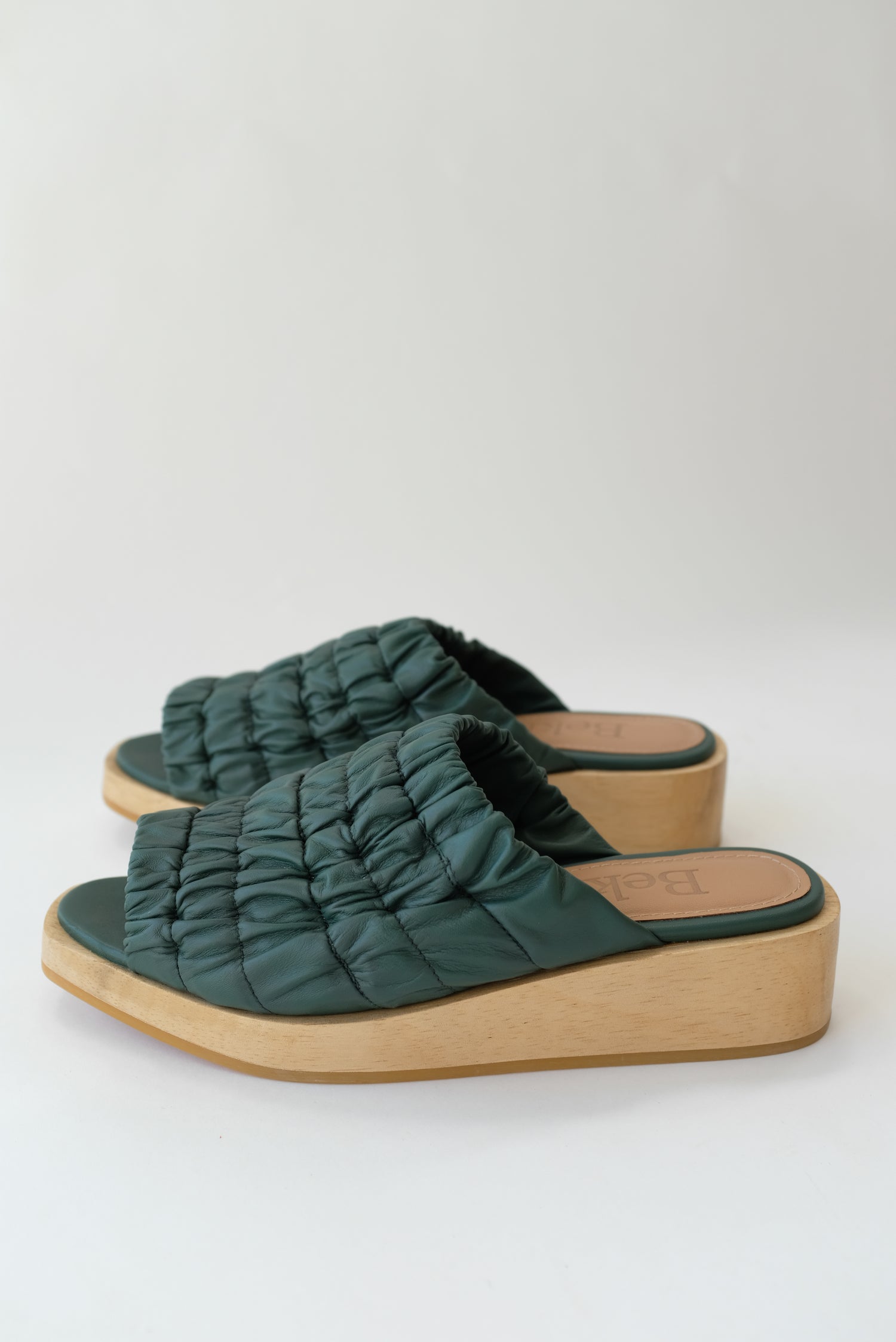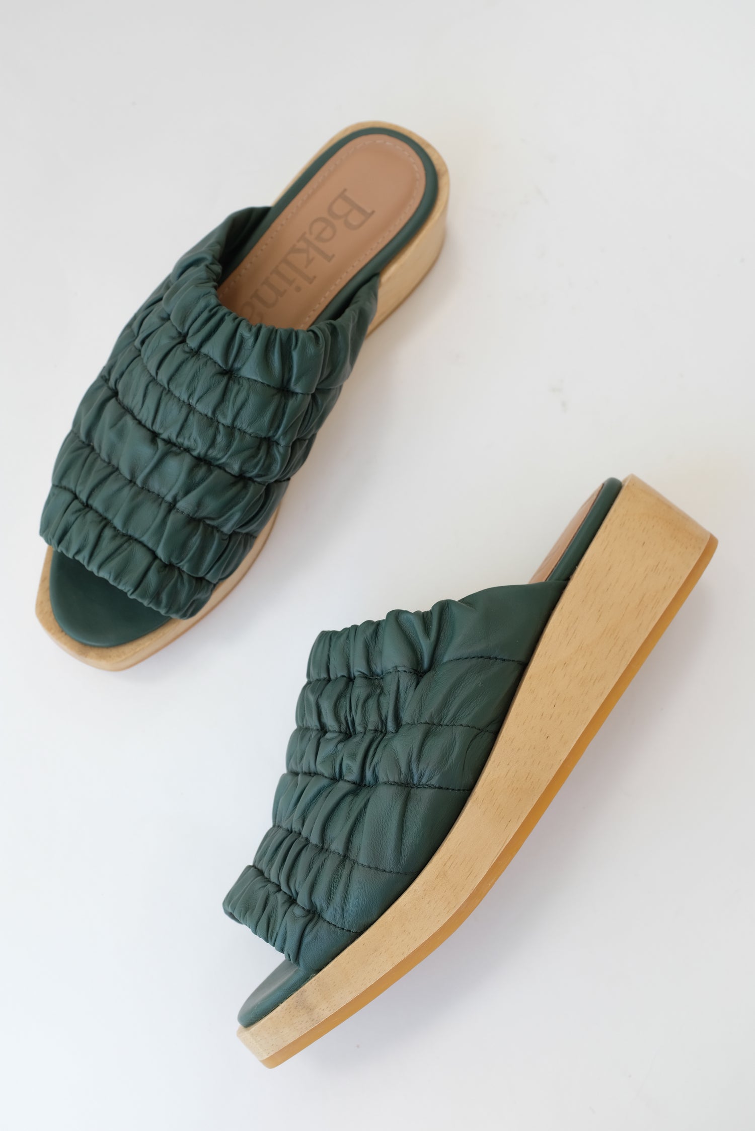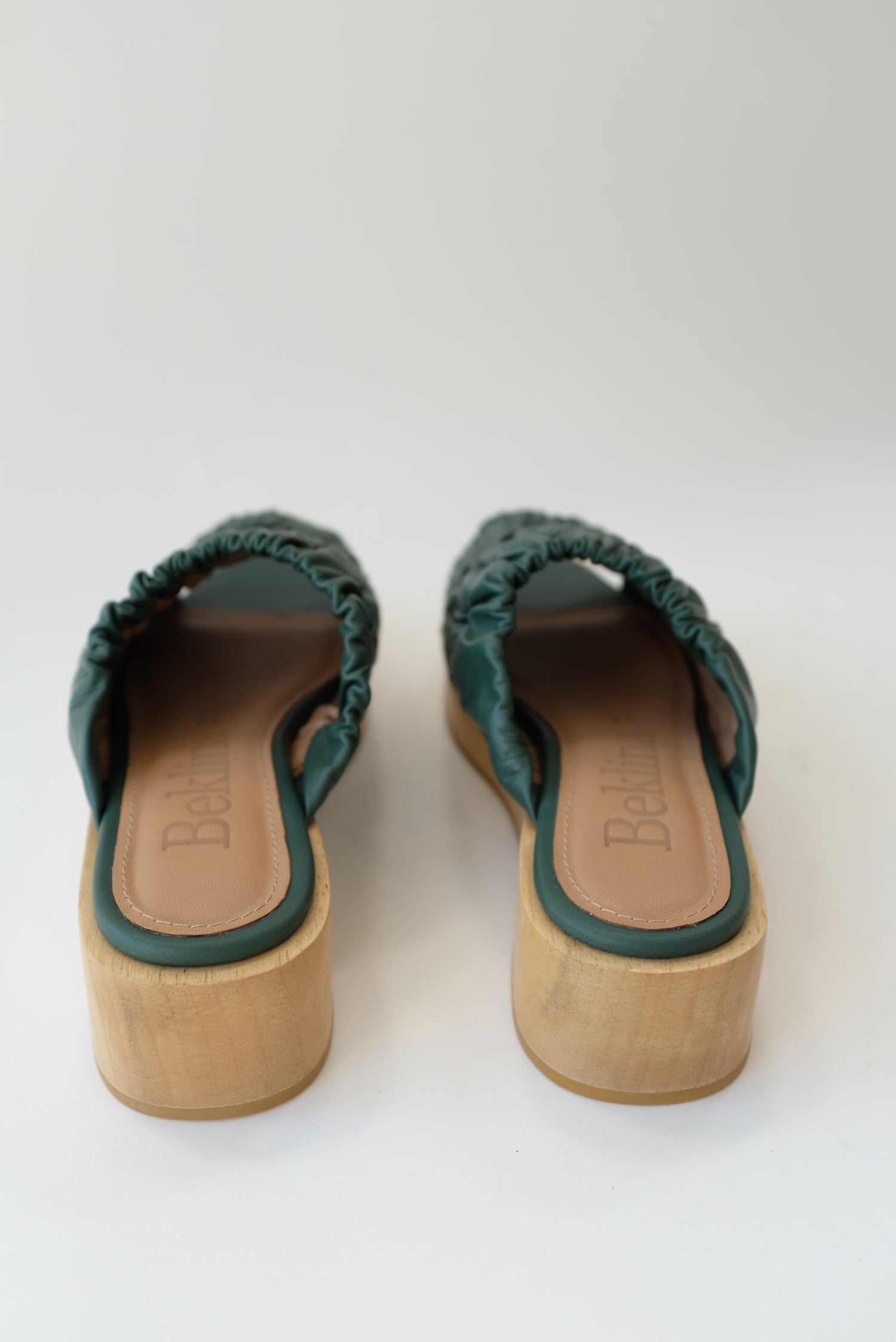 Beautiful mid-height hand carved wooden wedge clog, with a soft gathered 100% leather upper, open toe, and leather lined. Total heel height is 1 1/2"