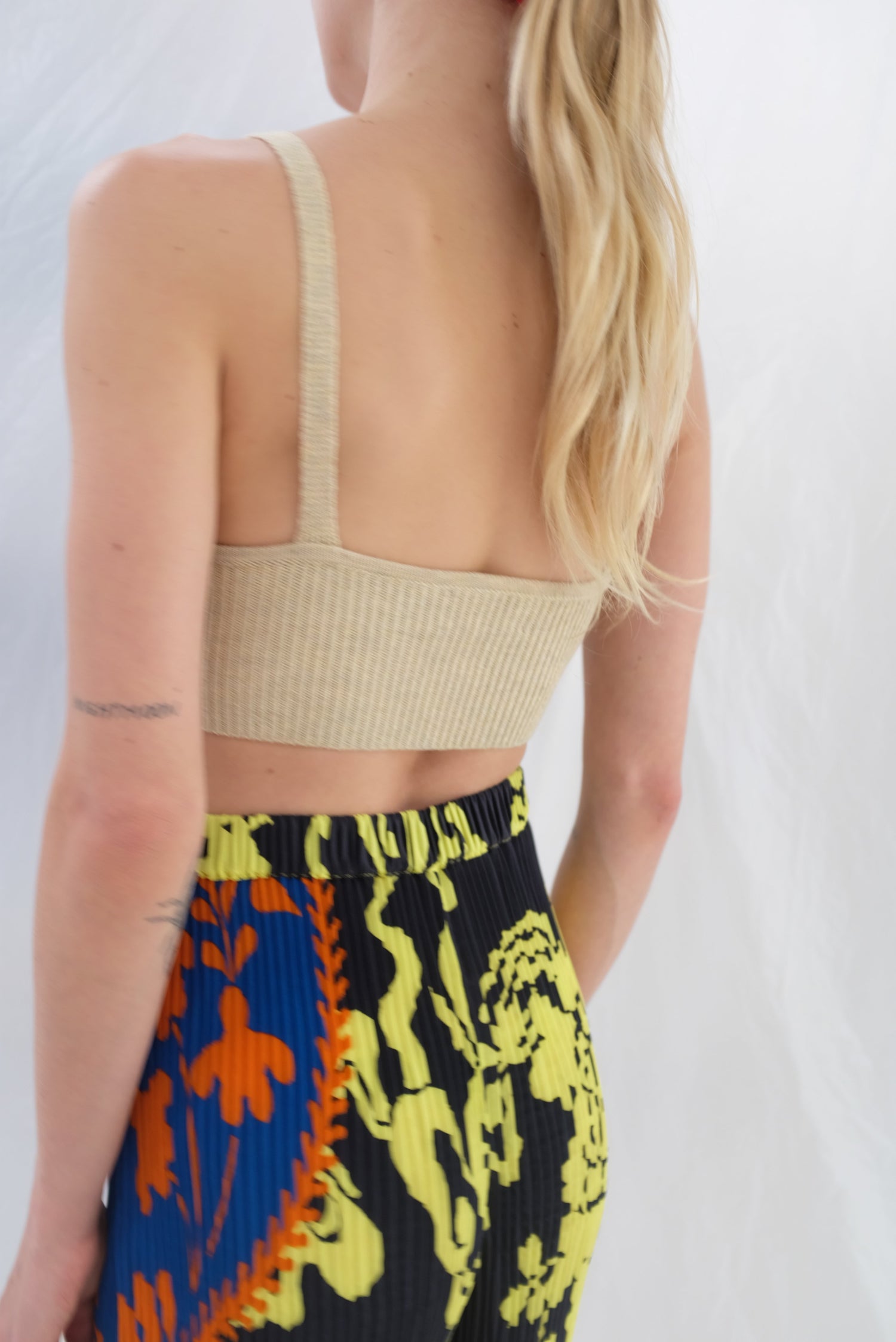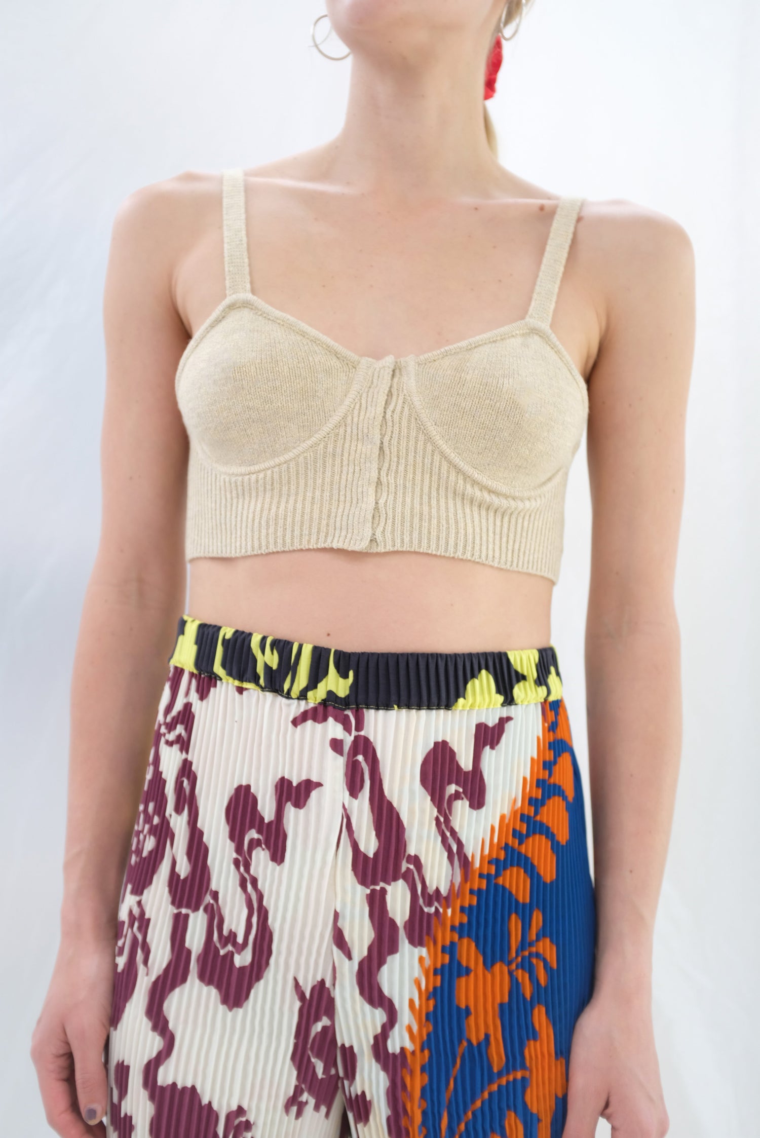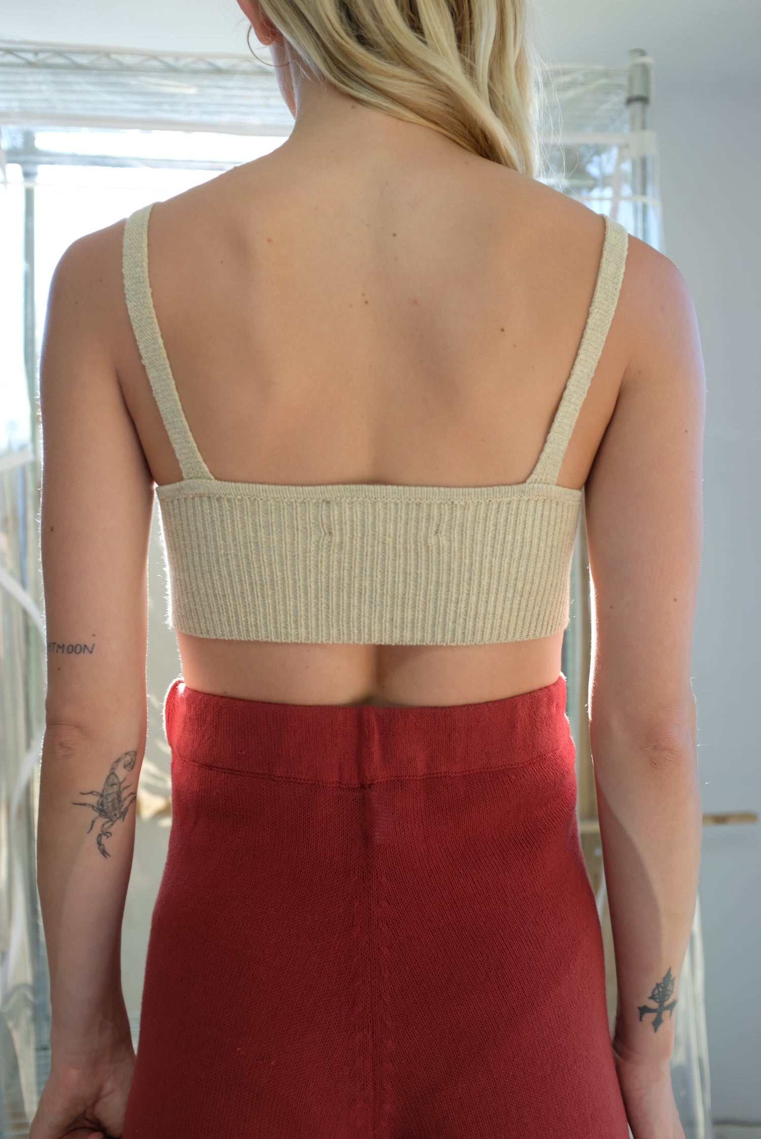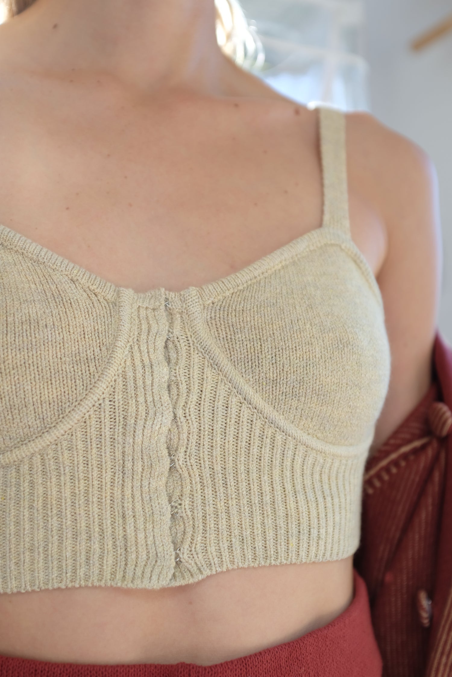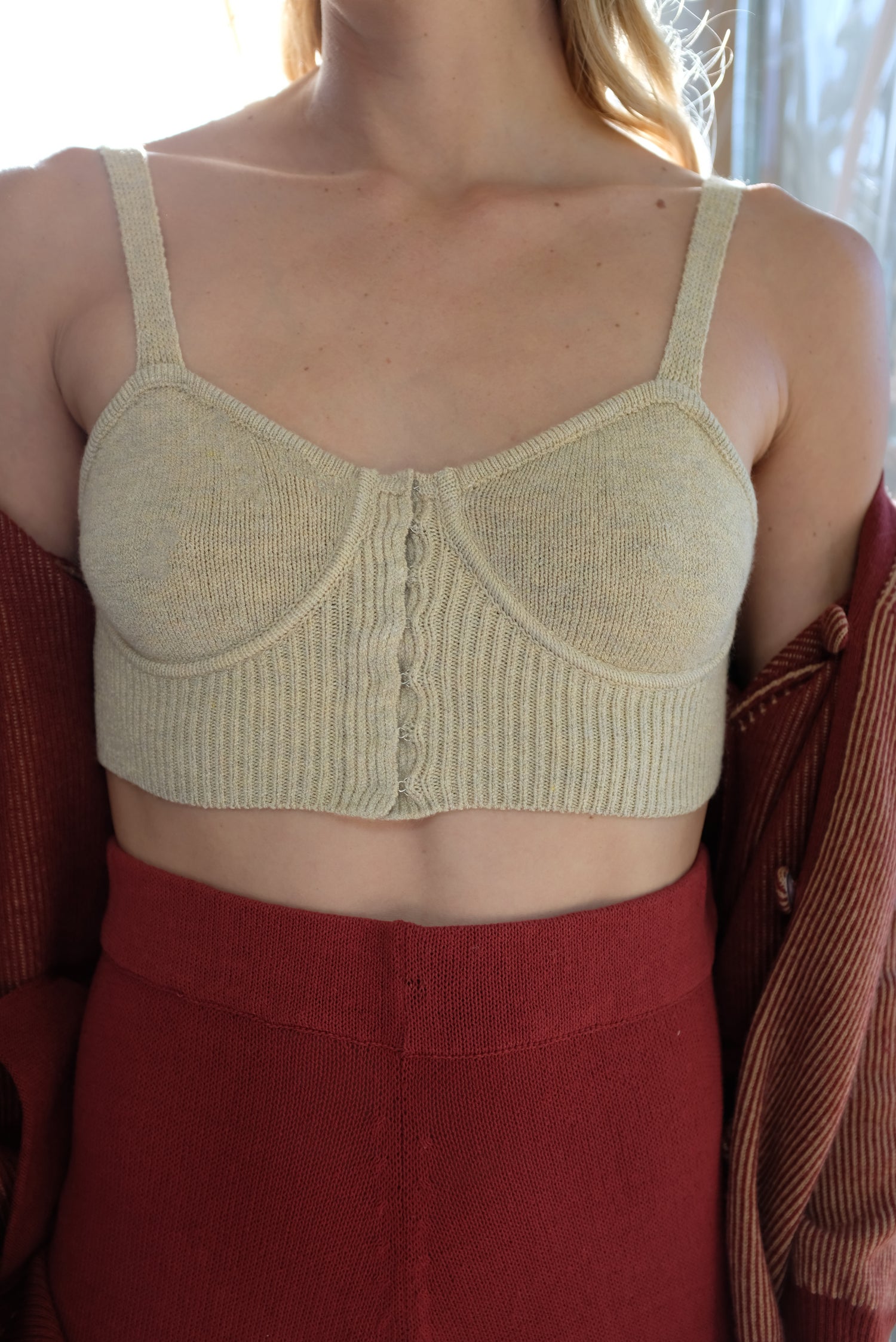 100% Knit top, wear solo, or as bra, or a layering piece. Underwire, full coverage, not sheer, medium support. Hook and eye closure down front. Alexis is wearing size small/medium. 92% viscose, 6% nylon, 2% spandex. Soft and cozy. Runs true to size.