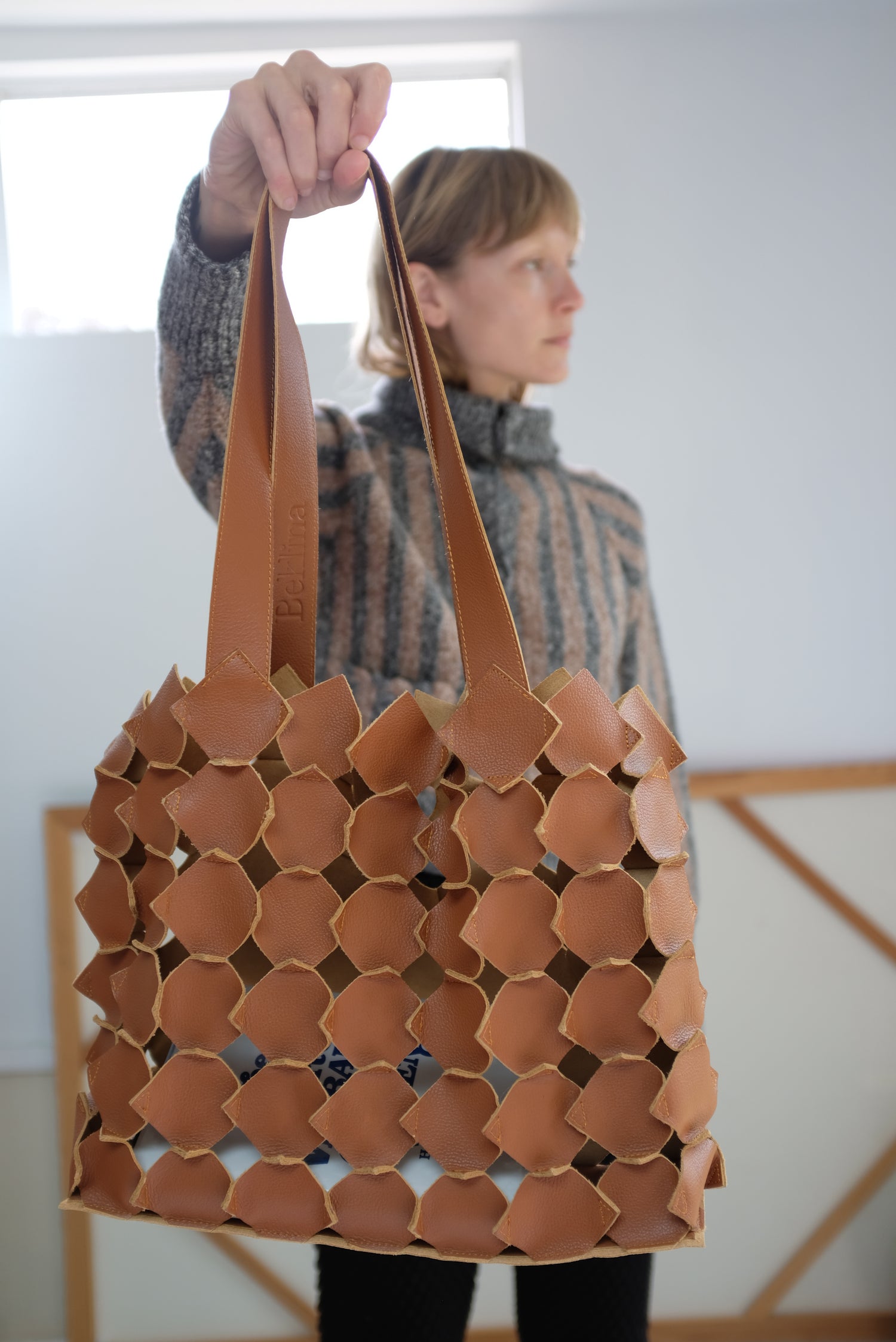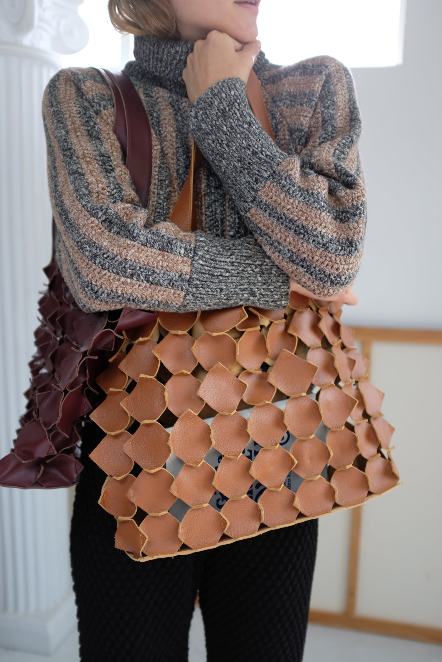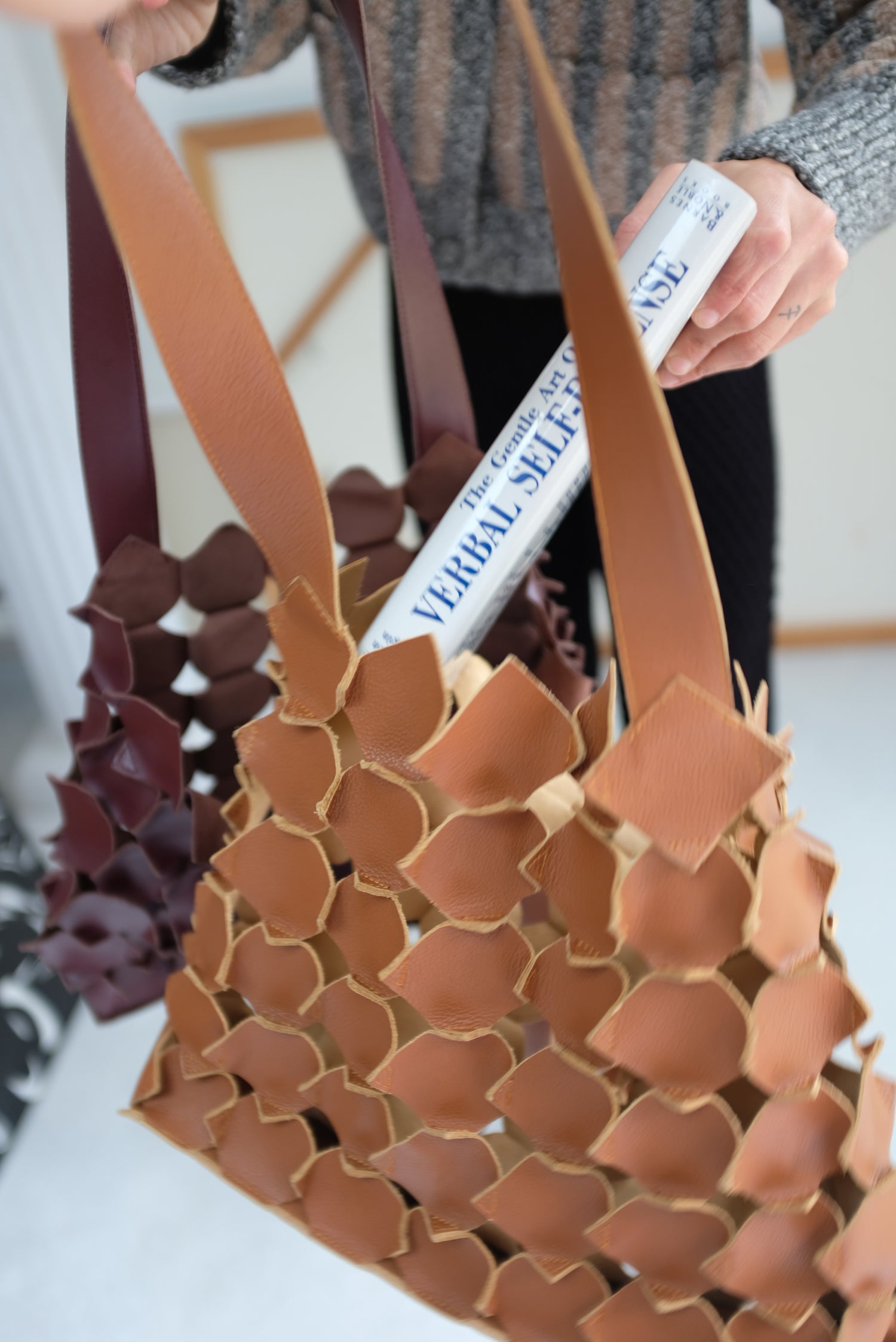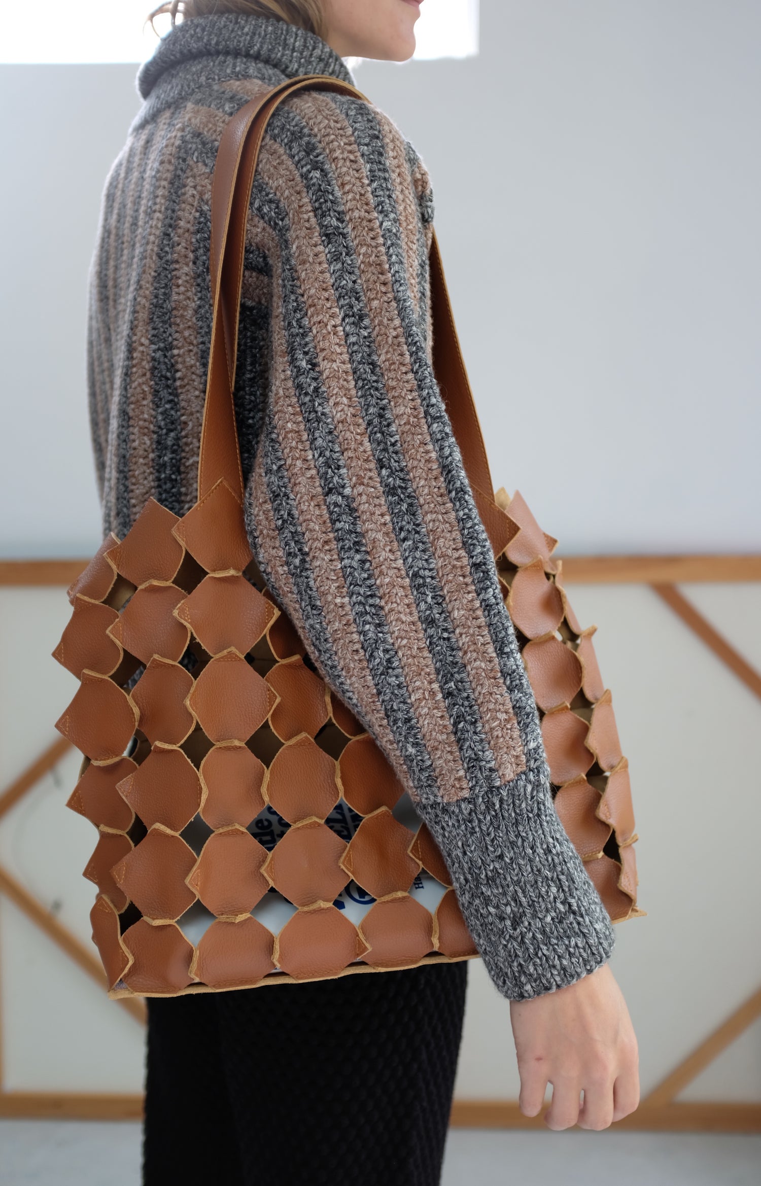 100% Leather tote, made from leather scraps. Sturdy and strong bag, perfect size… even holds a 14 inch laptop.