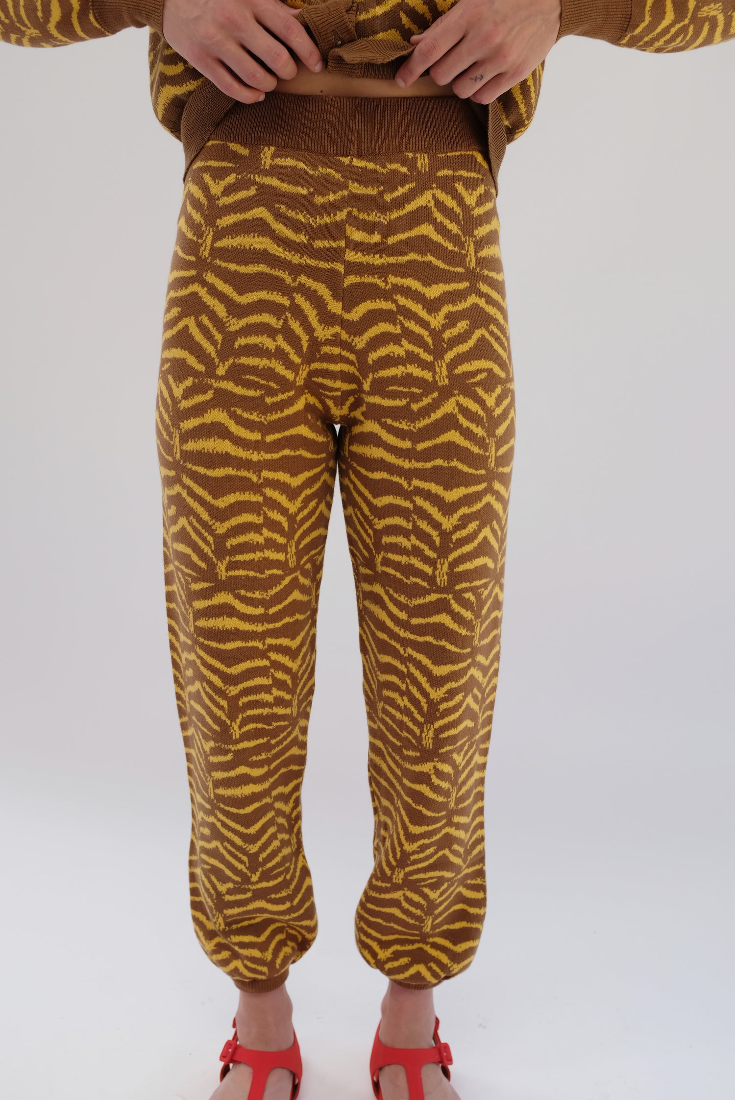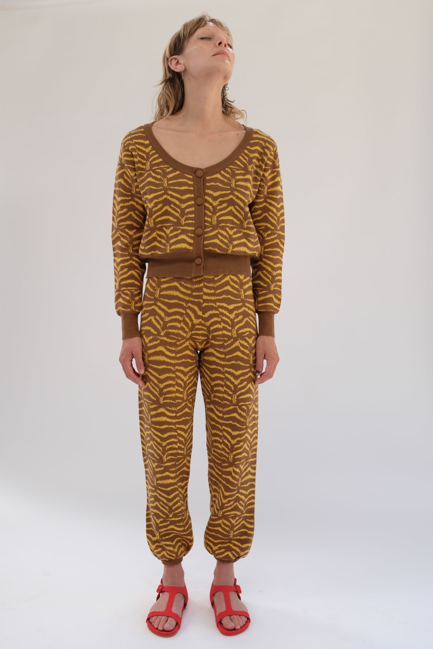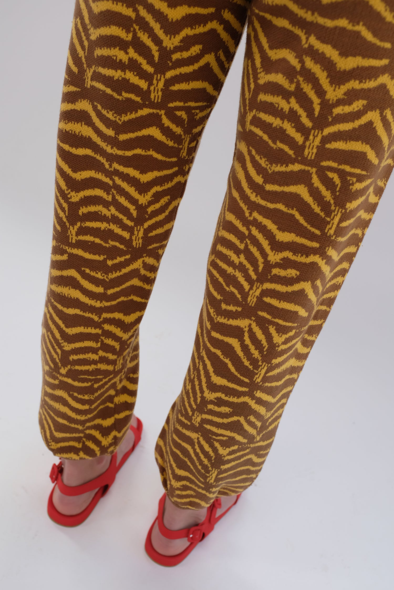 Cotton jacquard knit, high waisted pants. Mid-weight, ribbed covered elastic waistband and hem. 100% Cotton. Exclusive to Beklina.