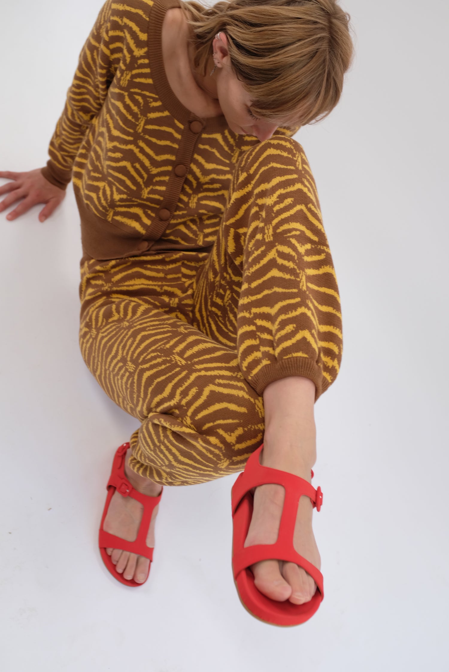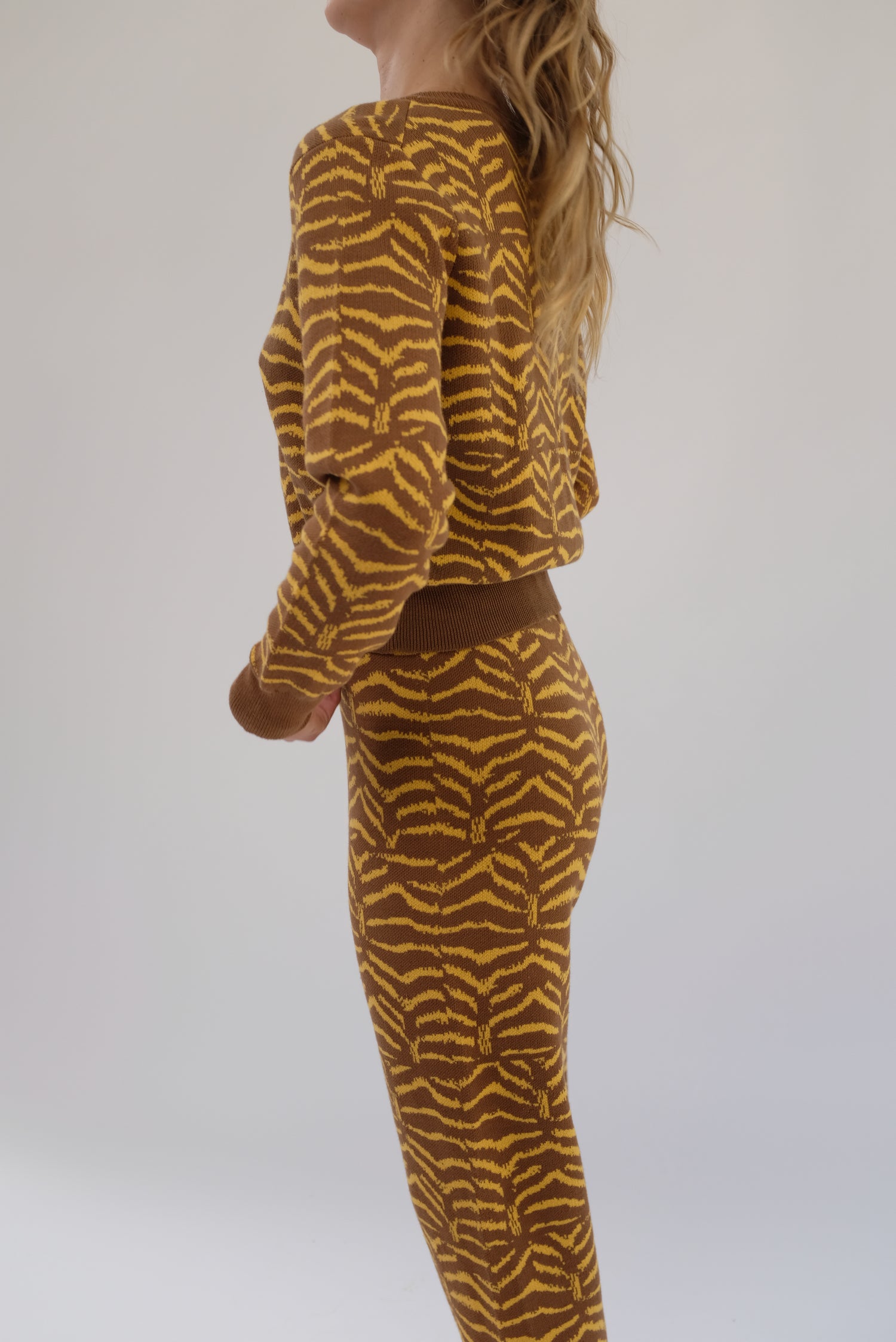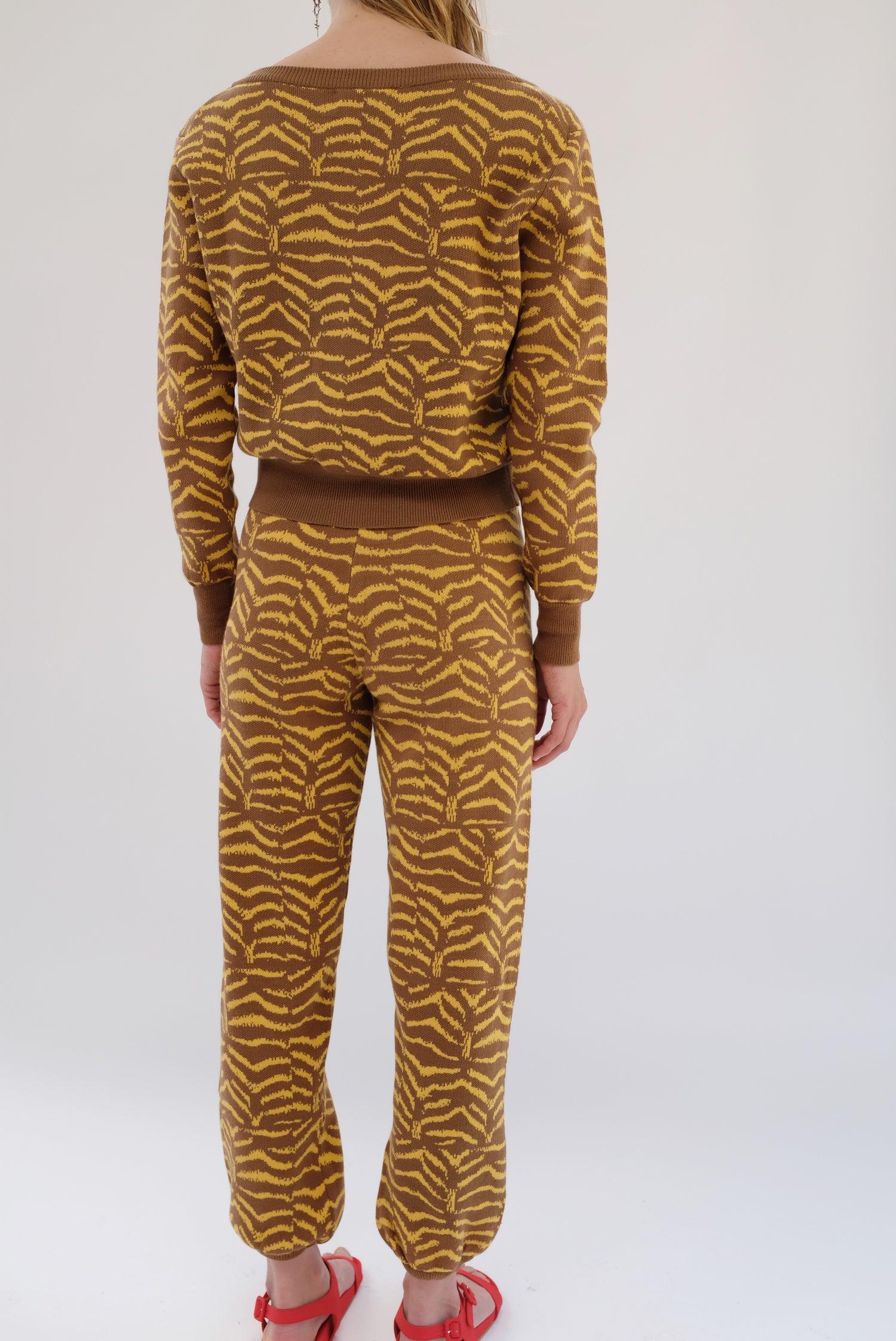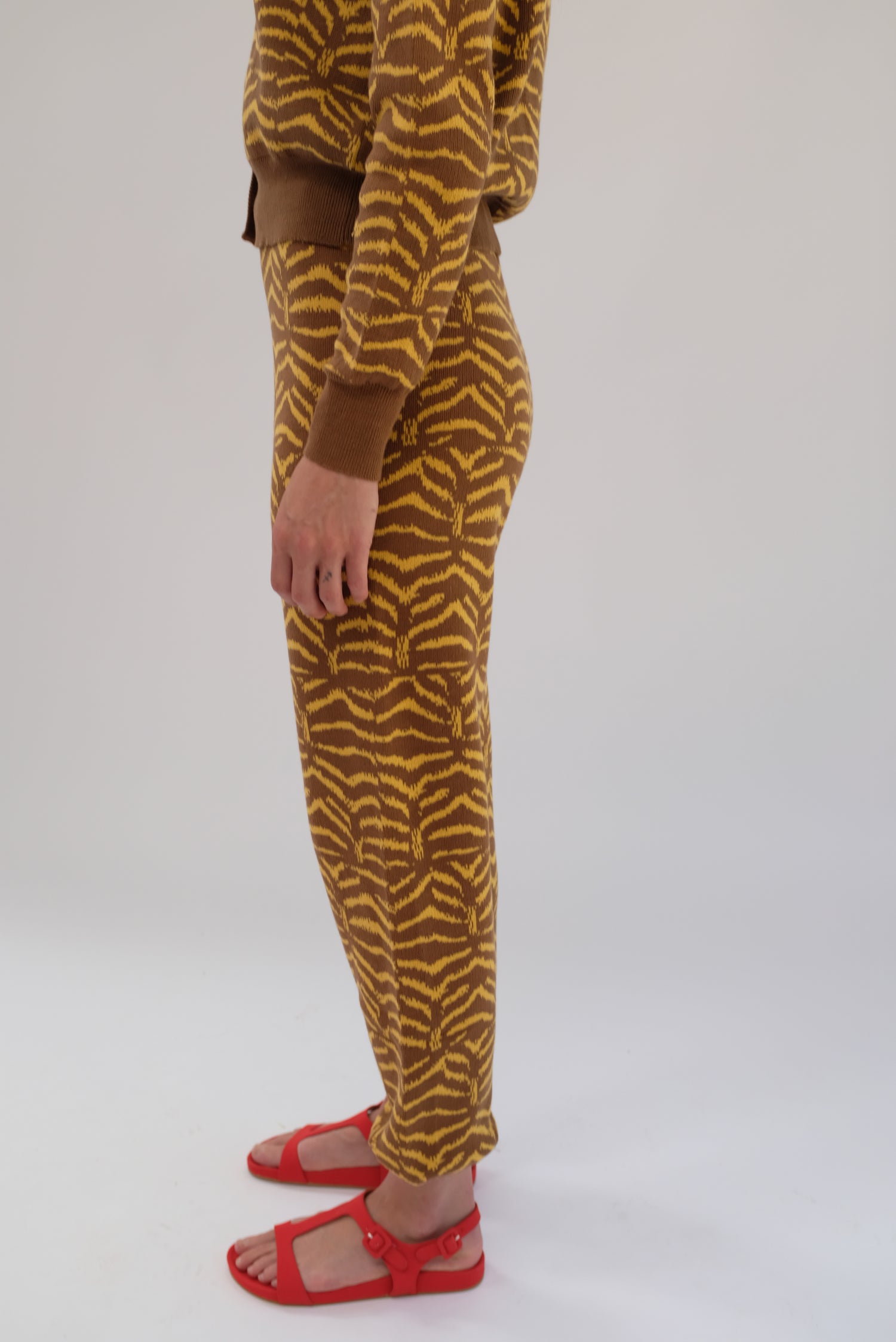 Cotton jacquard knit, high waisted pants. Mid-weight, ribbed covered elastic waistband and hem. 100% Cotton. Exclusive to Beklina.