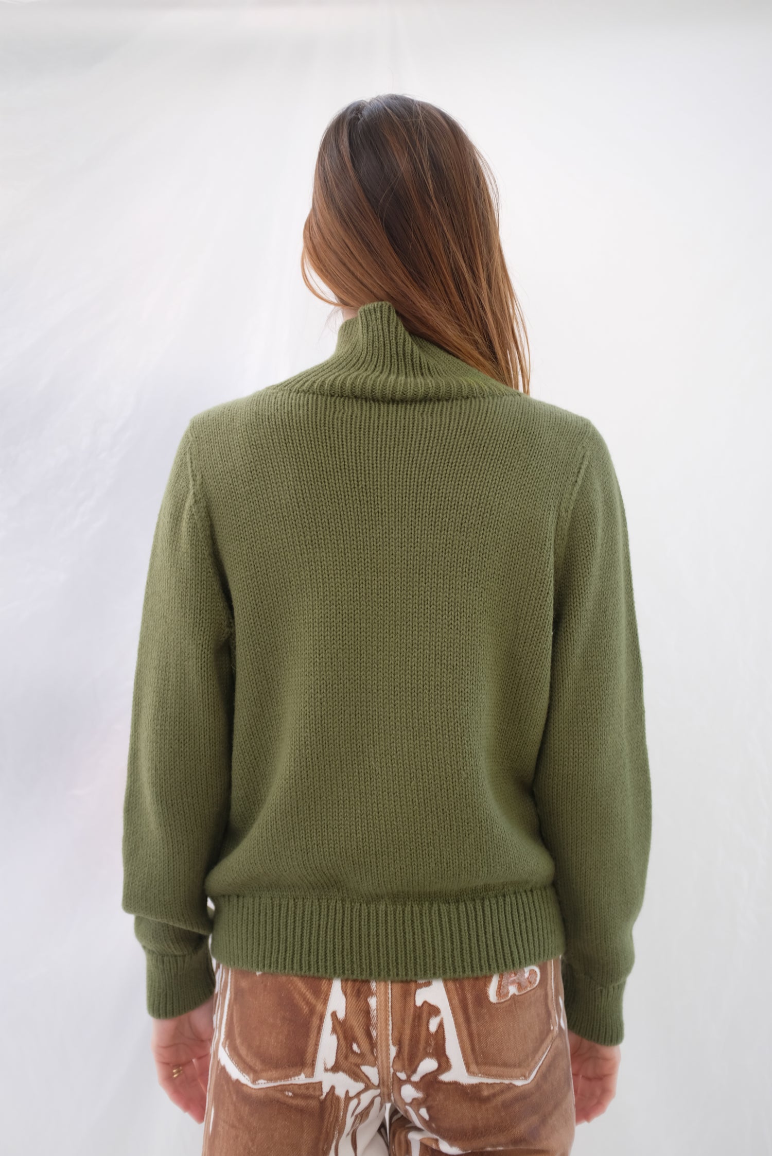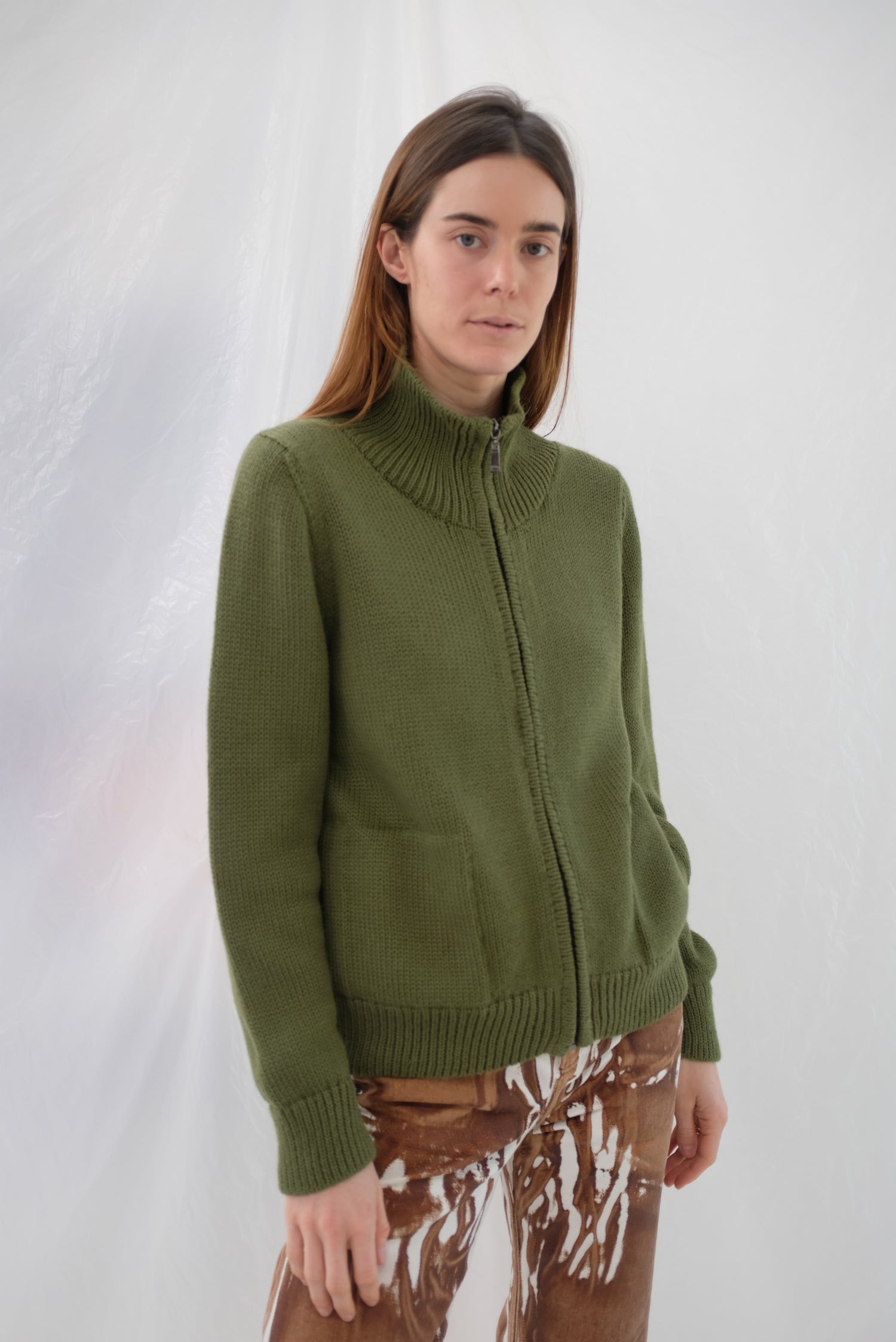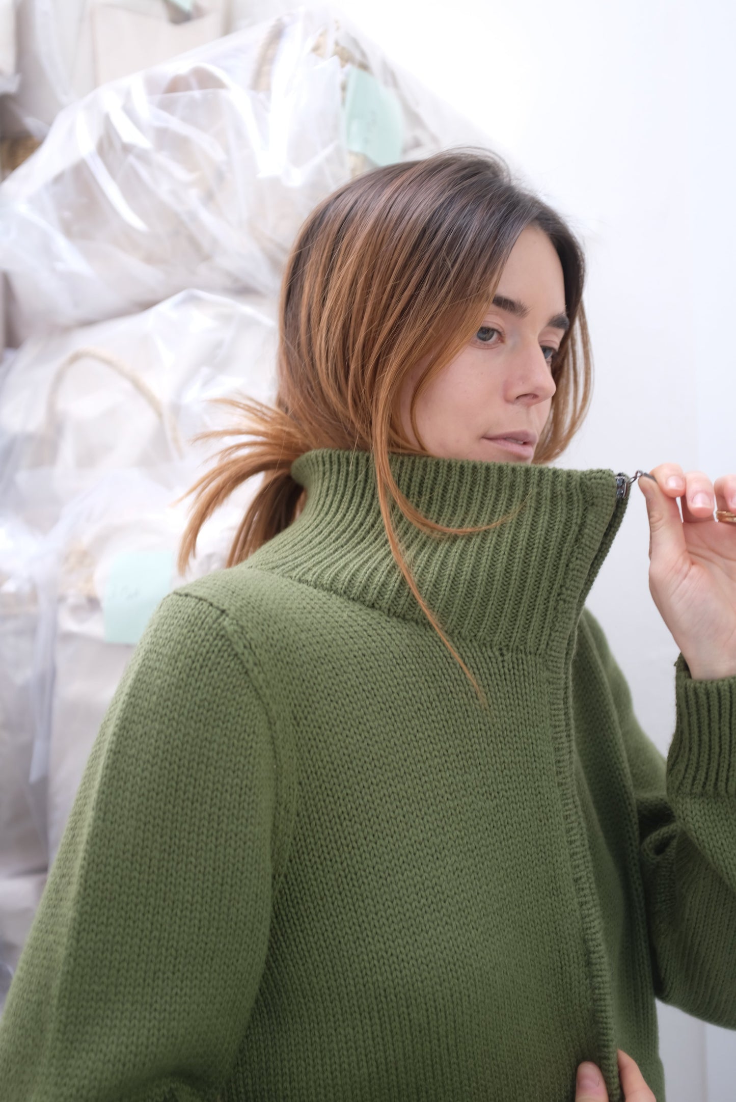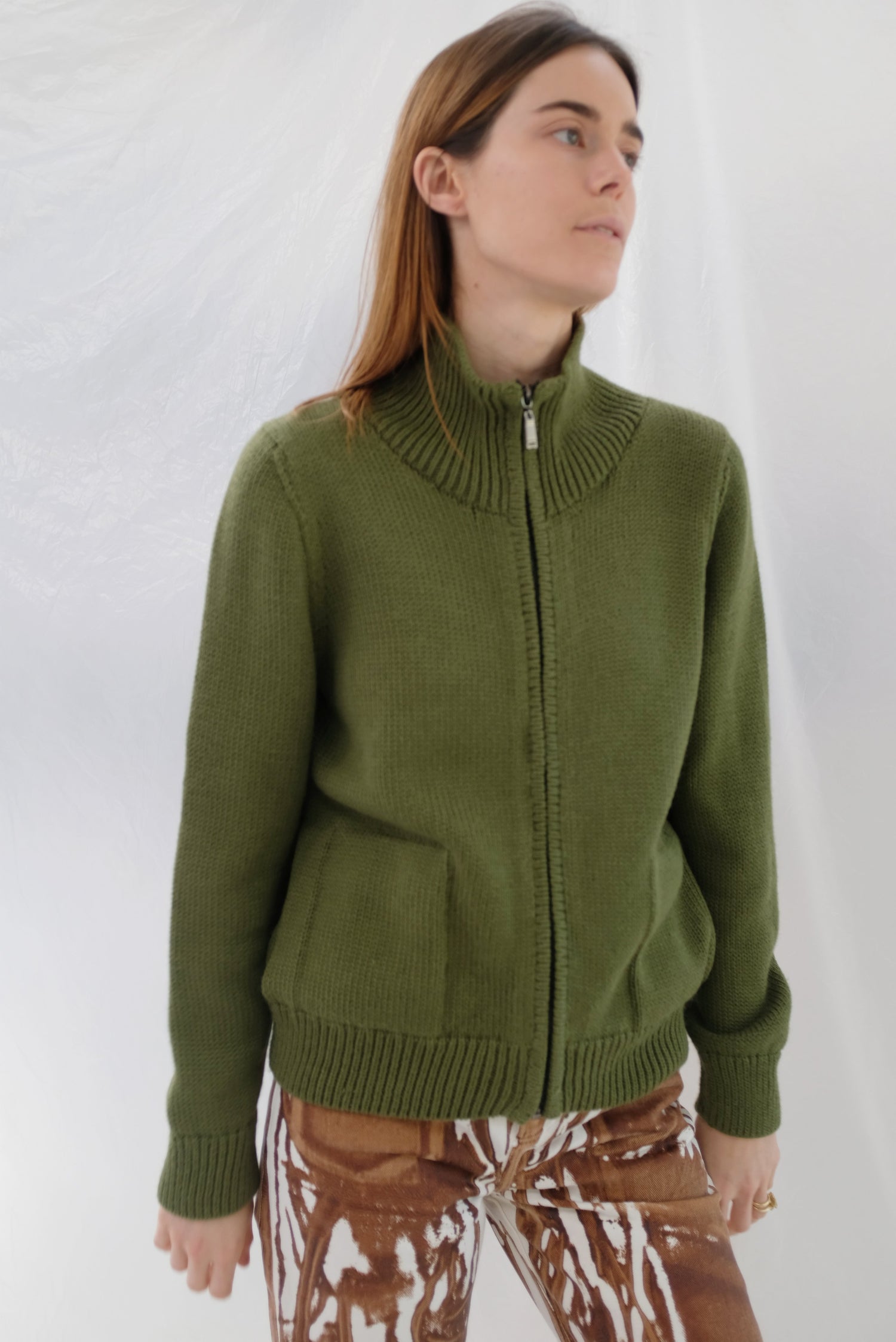 100% Baby Alpaca ultra luxurious hand knit, long sleeved, full zip-up front with a 5" ribbed zip-through stand-up collar for warmth and soft comfort. 2.5” ribbed cuff at waist and wrist, generous side pockets. Functions as a sweater or jacket.