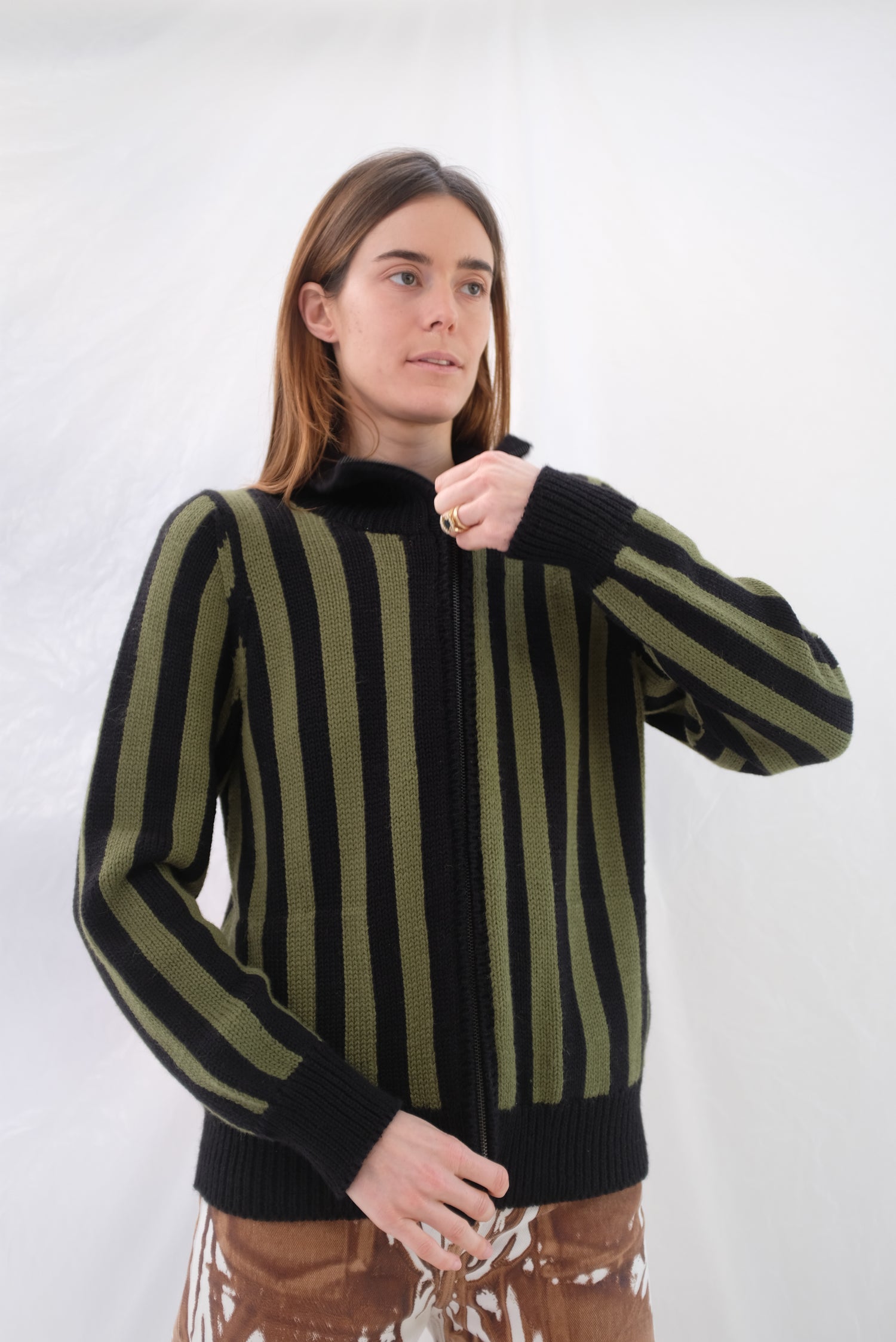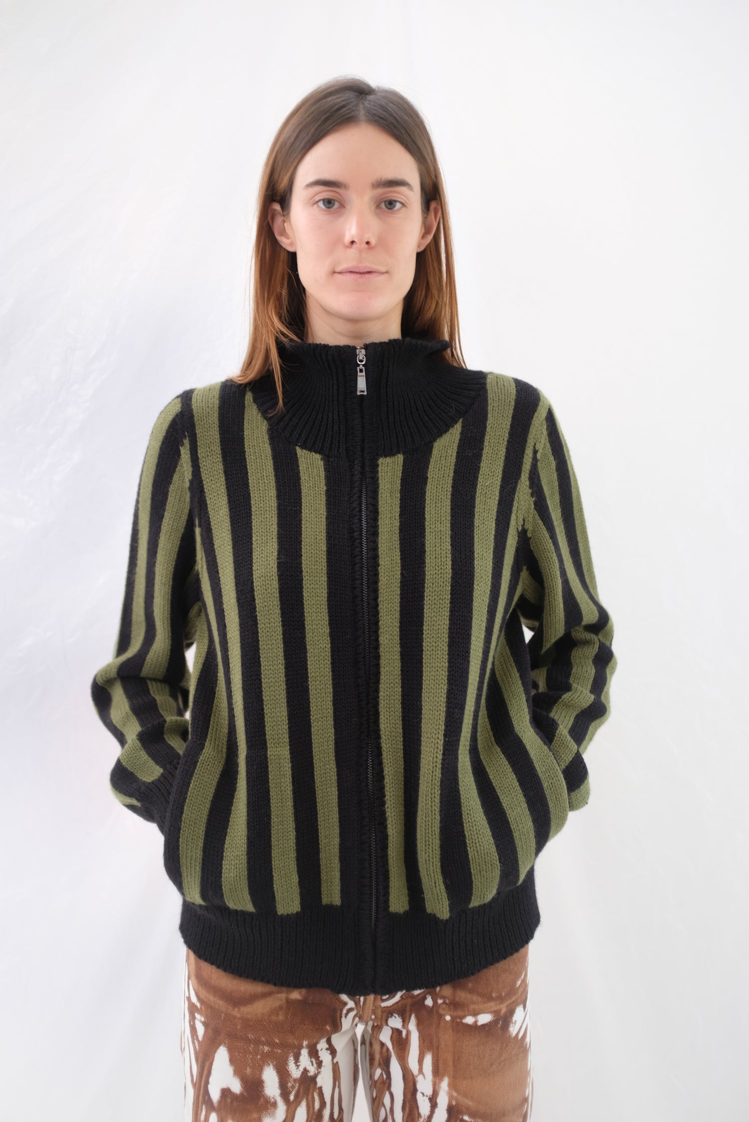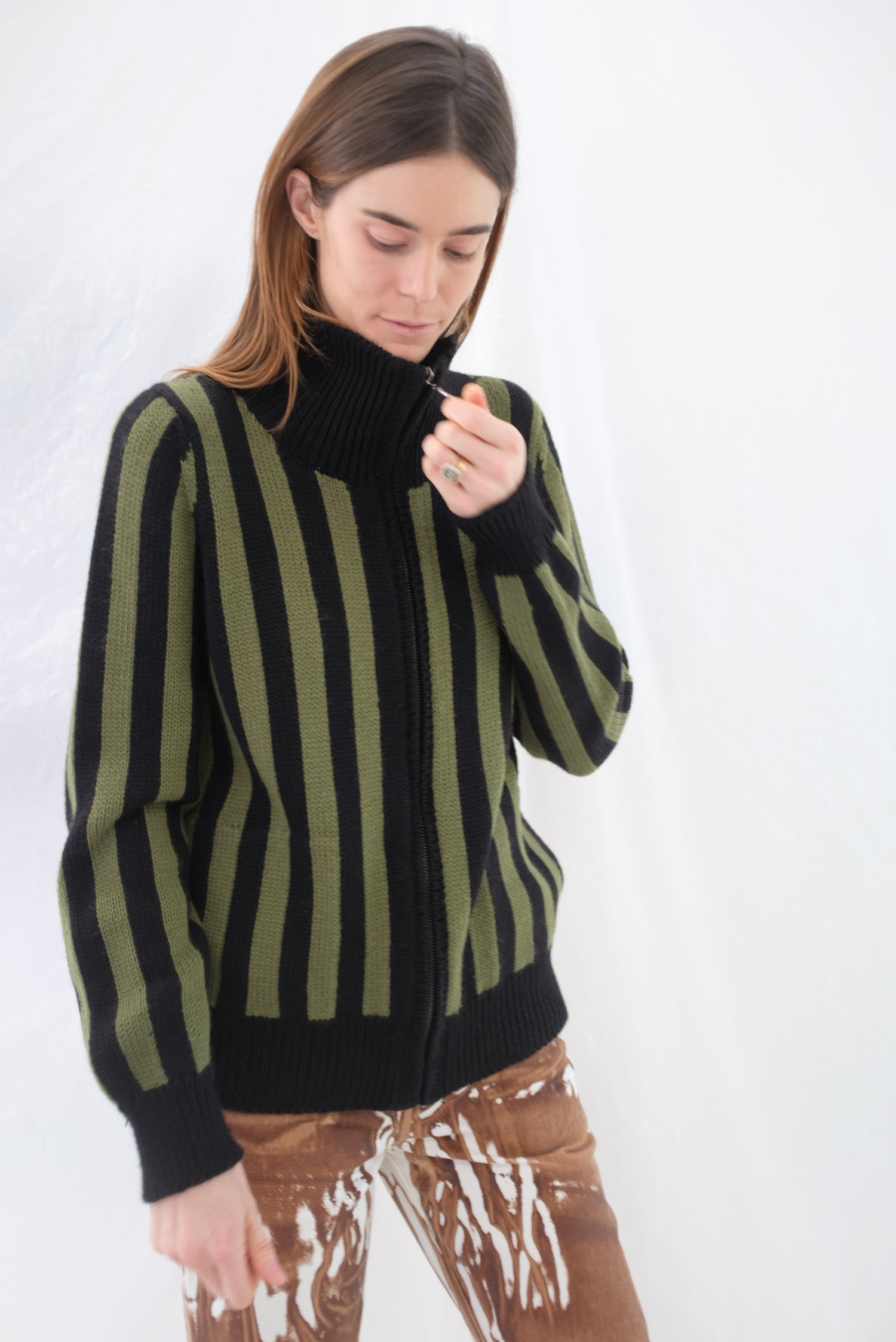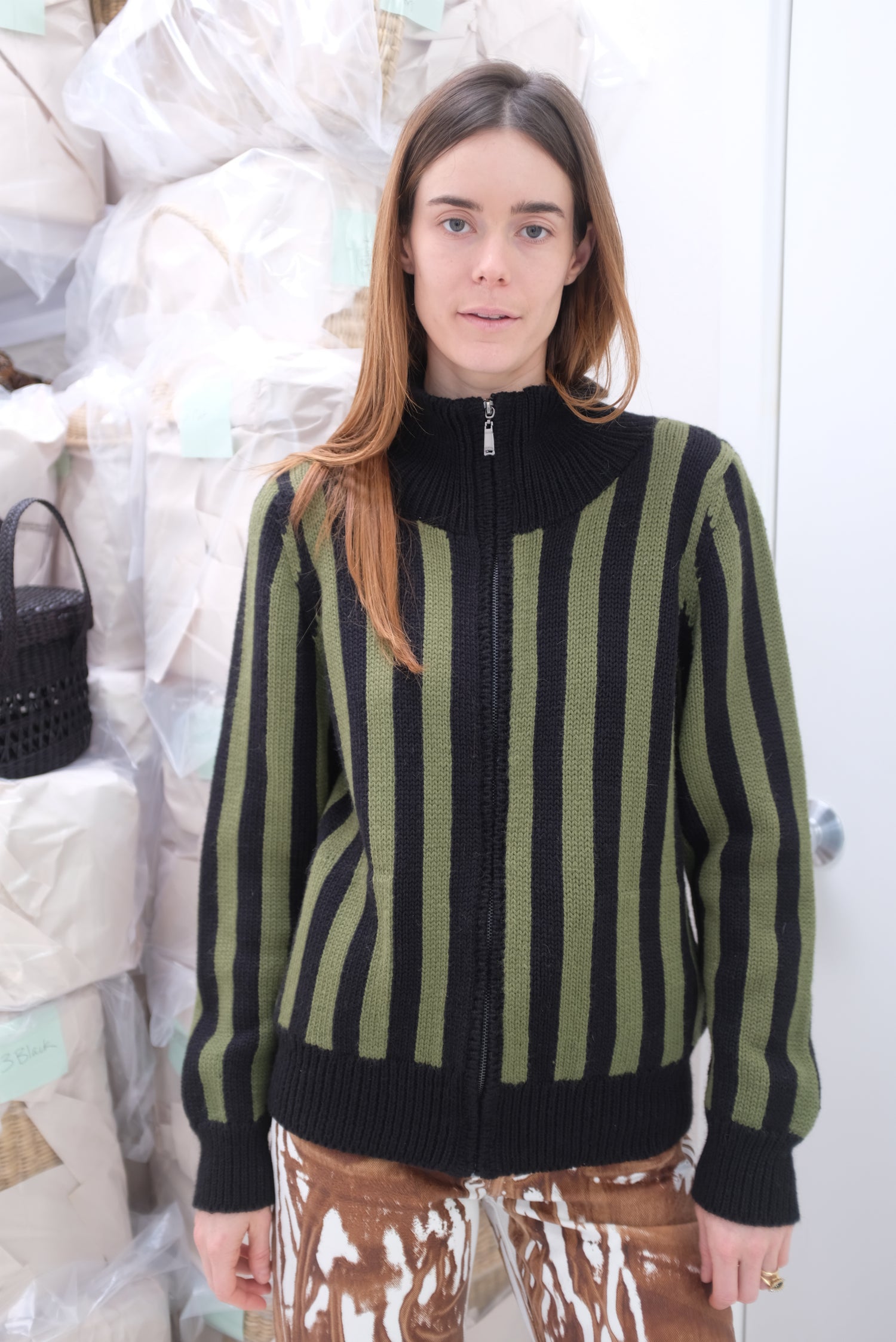 100% Baby Alpaca ultra luxurious hand knit, long sleeved, full zip-up front with a 5" ribbed zip-through stand-up collar for warmth and soft comfort. 2.5” ribbed cuff at waist and wrist, generous side pockets. Functions as a sweater or jacket.