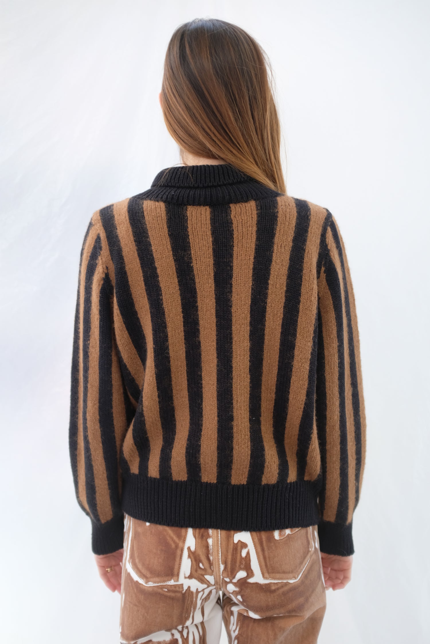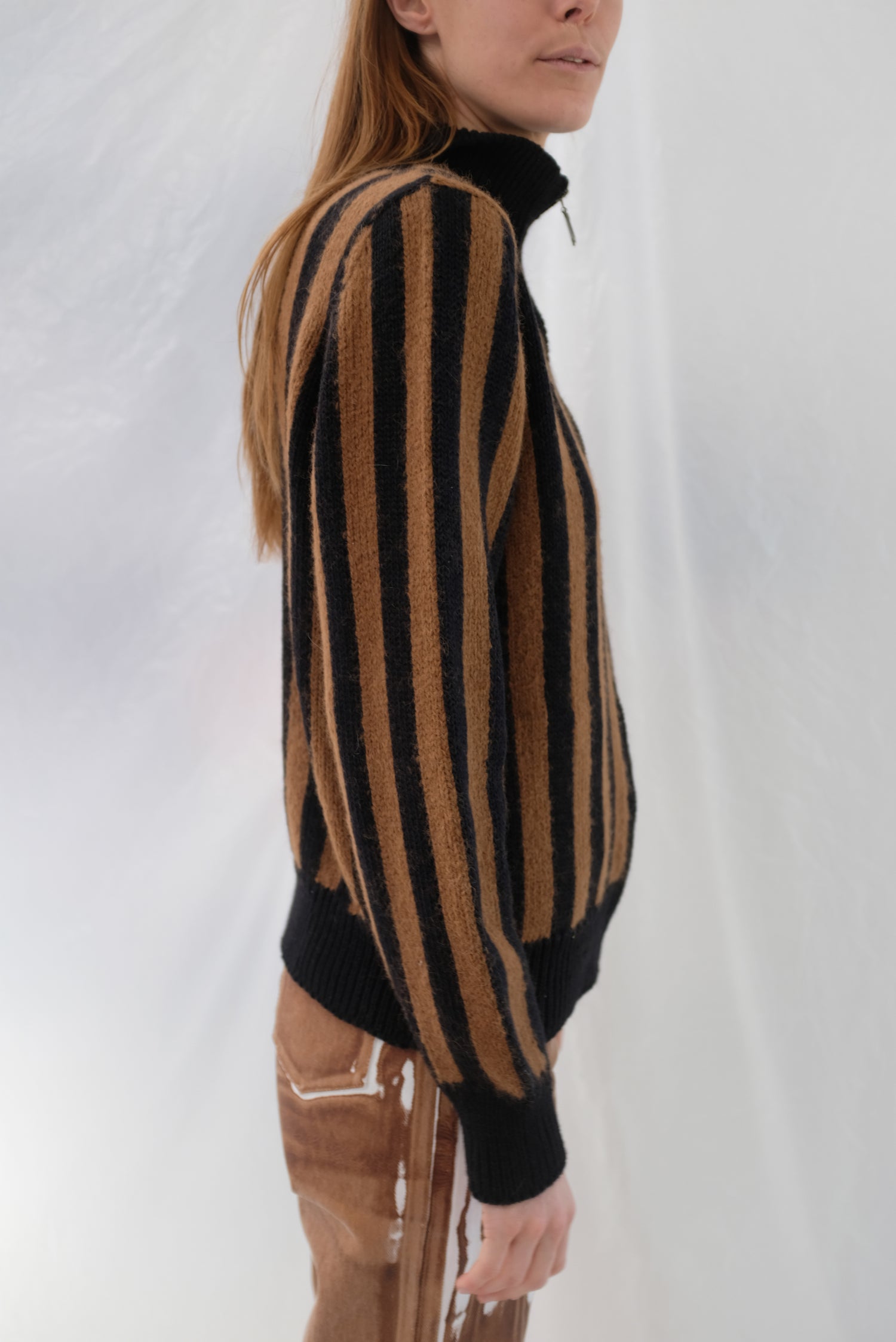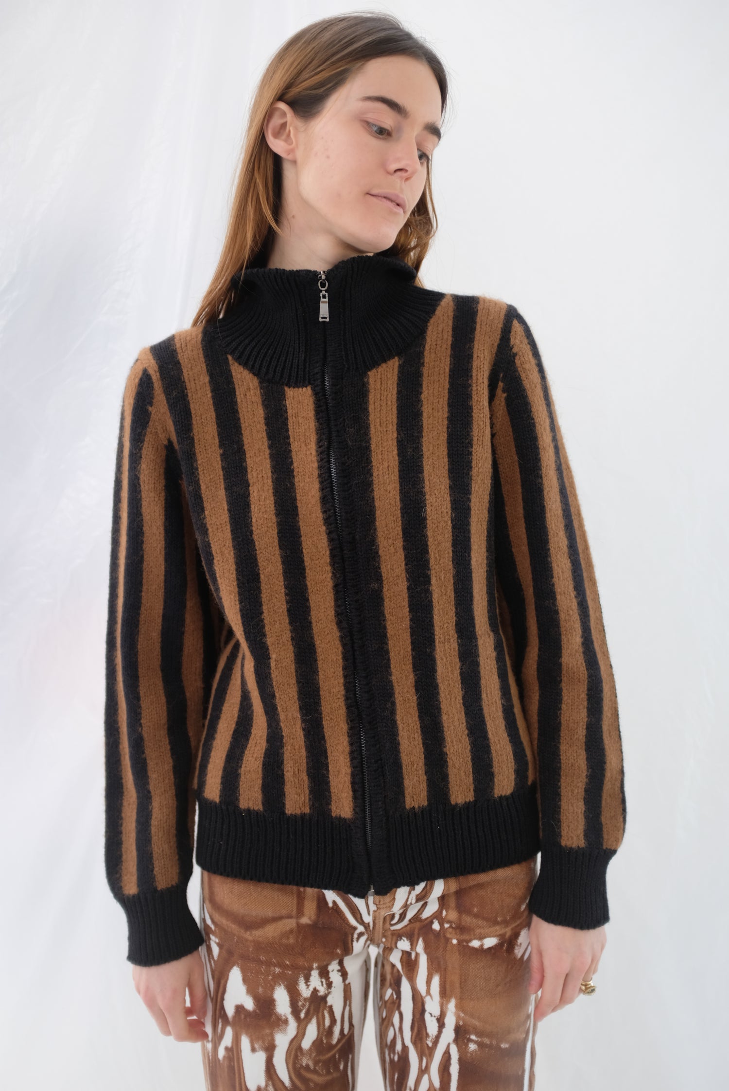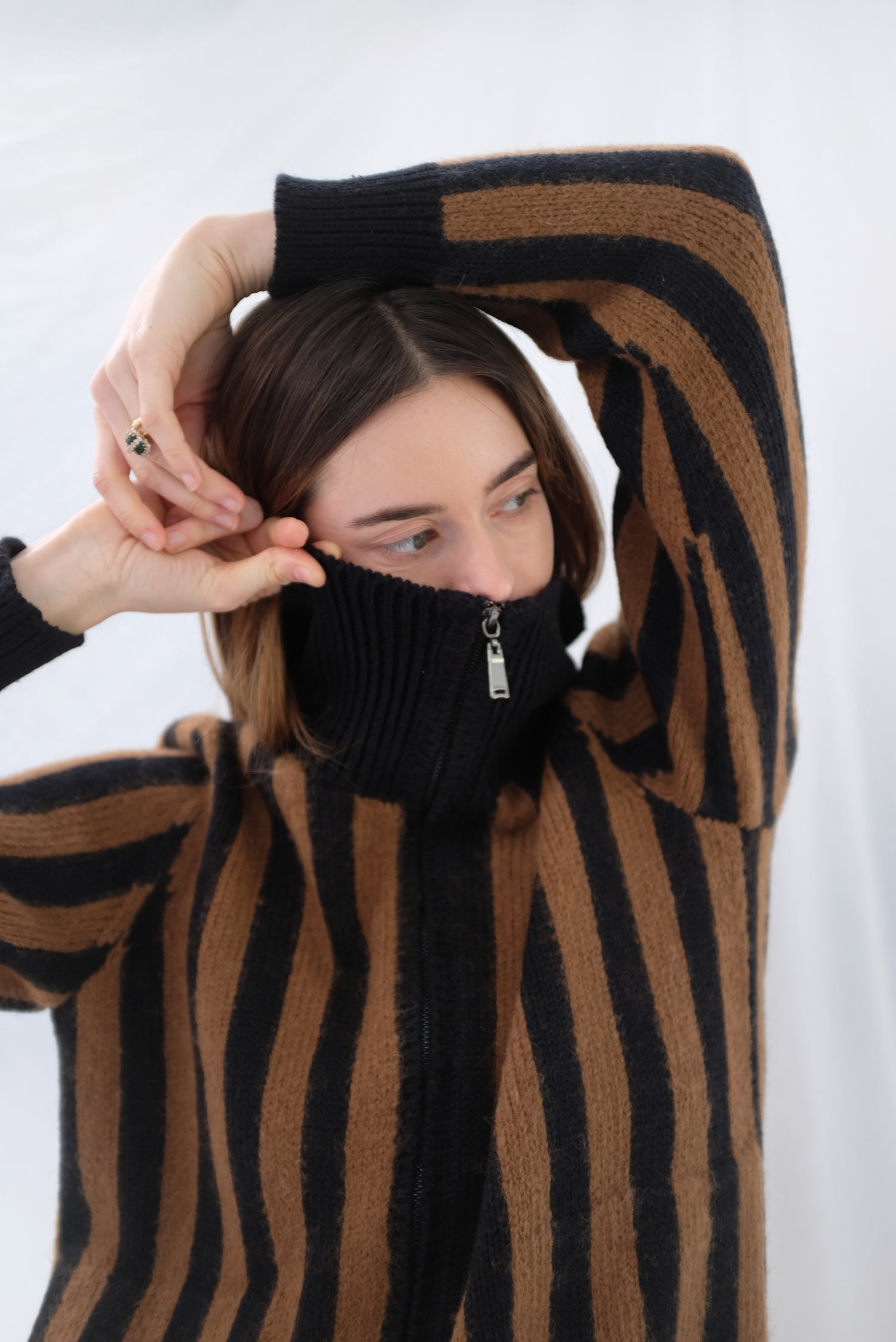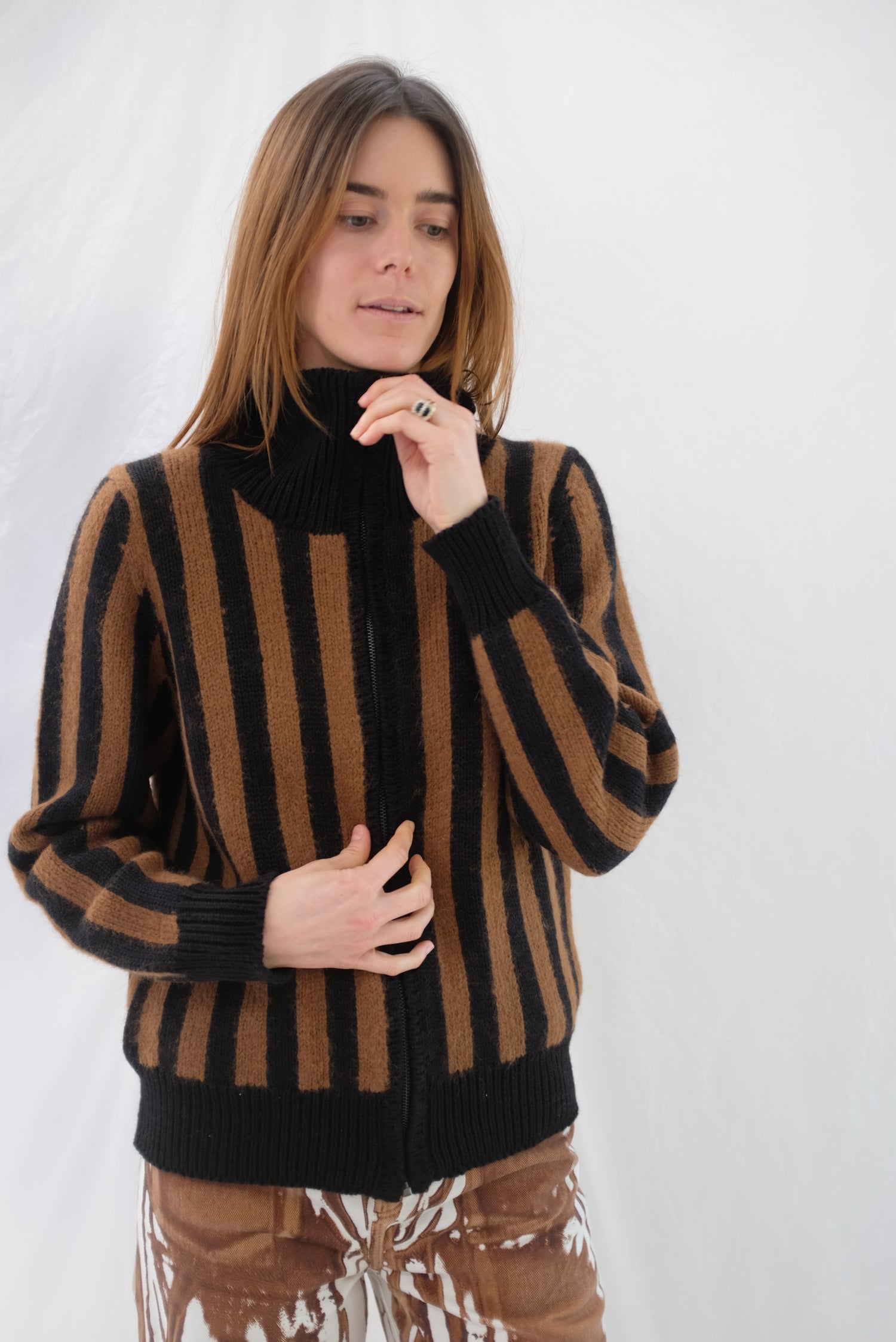100% Baby Alpaca ultra luxurious hand knit, long sleeved, full zip-up front with a 5" ribbed zip-through stand-up collar for warmth and soft comfort. 2.5” ribbed cuff at waist and wrist, generous side pockets. Functions as a sweater or jacket.