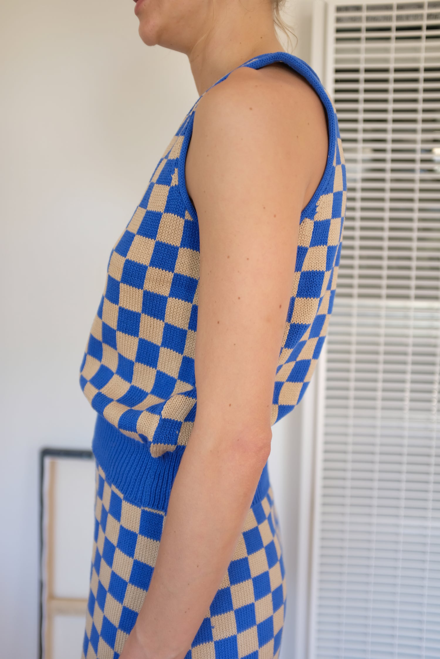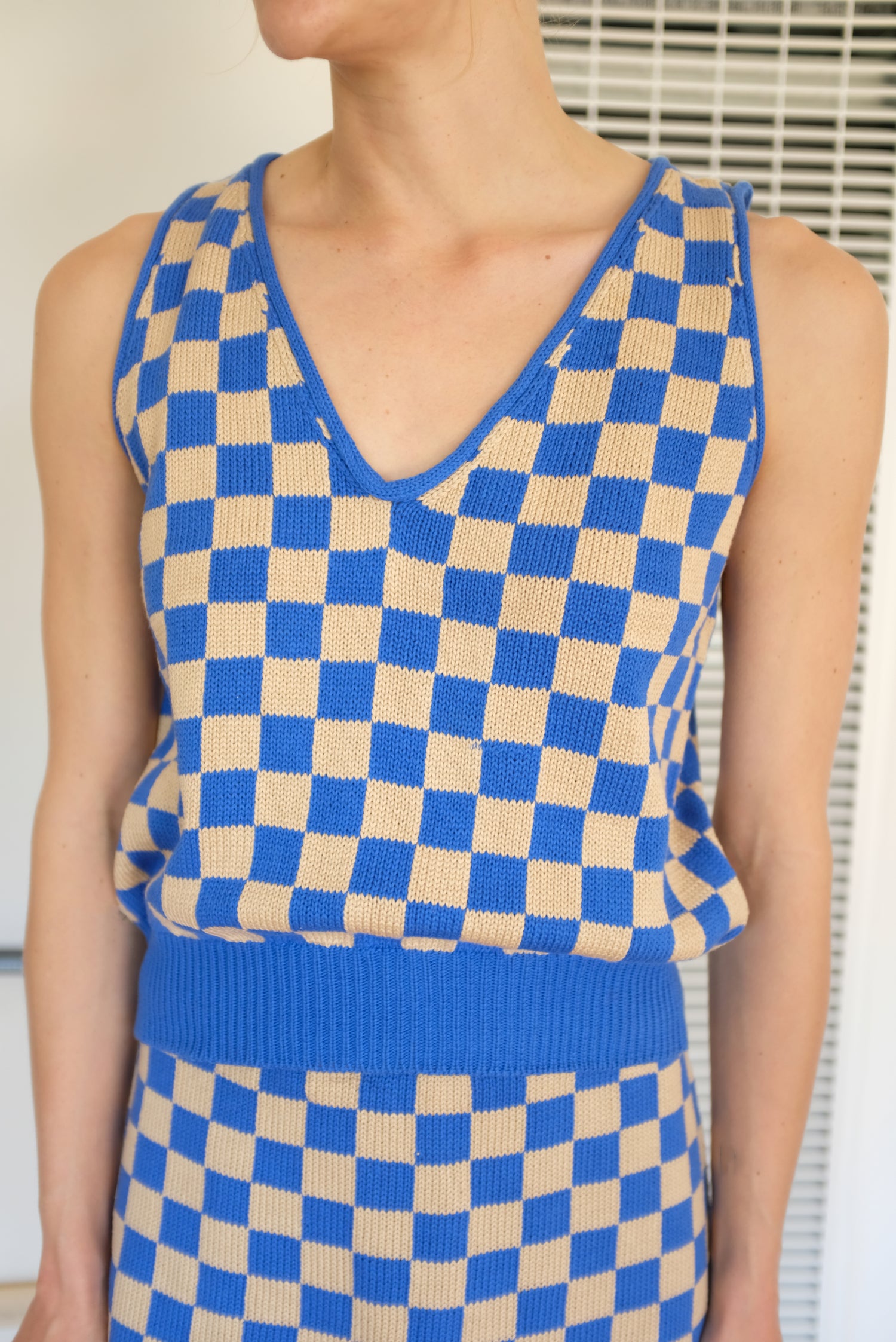 Hand knit v-neck top, sleeveless, rests at true waist, flattering feminine cut. Rolled edges at neckline and armholes, ribbed hem that defines the waist. 100% medium weight cotton. Soft washable cotton.
