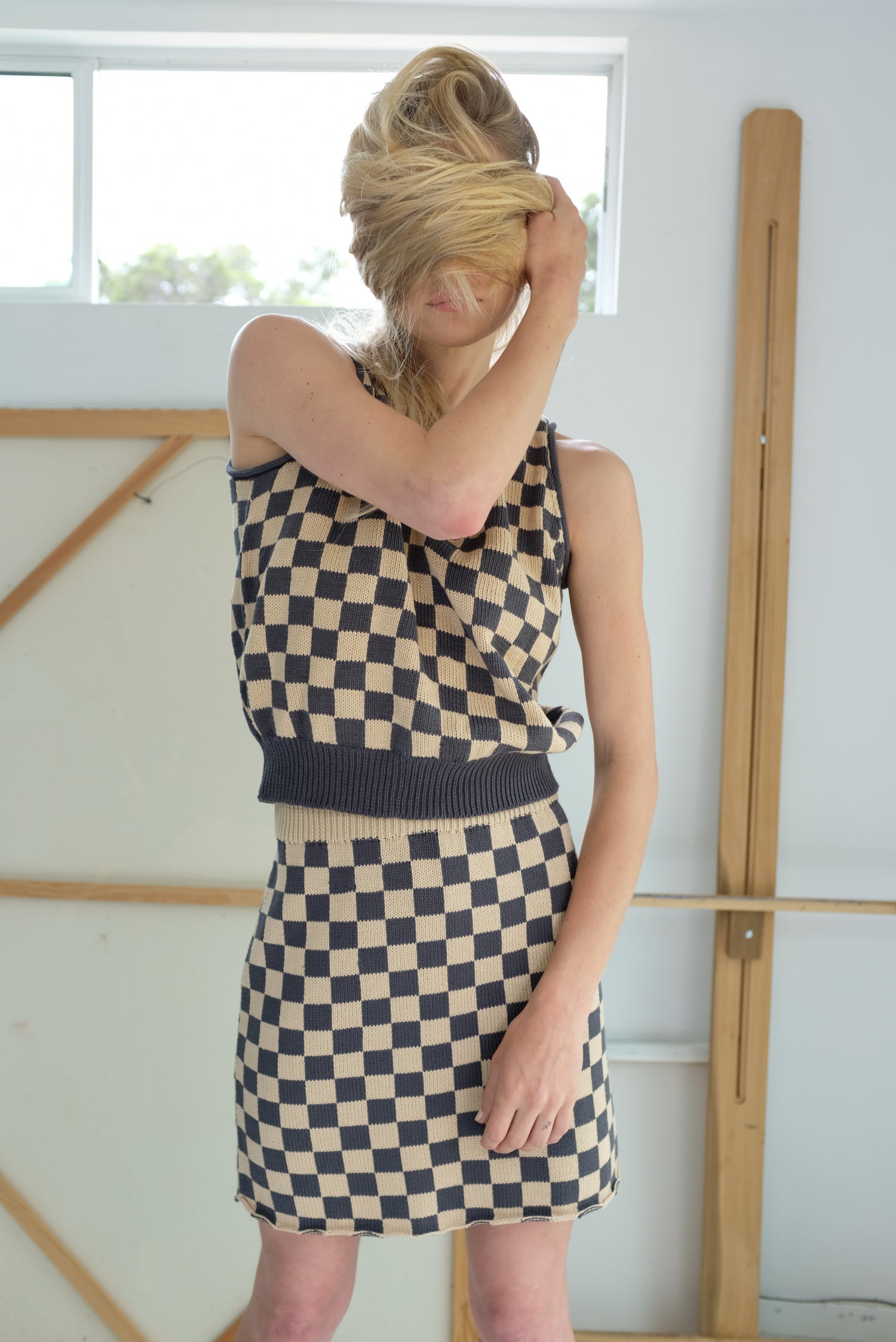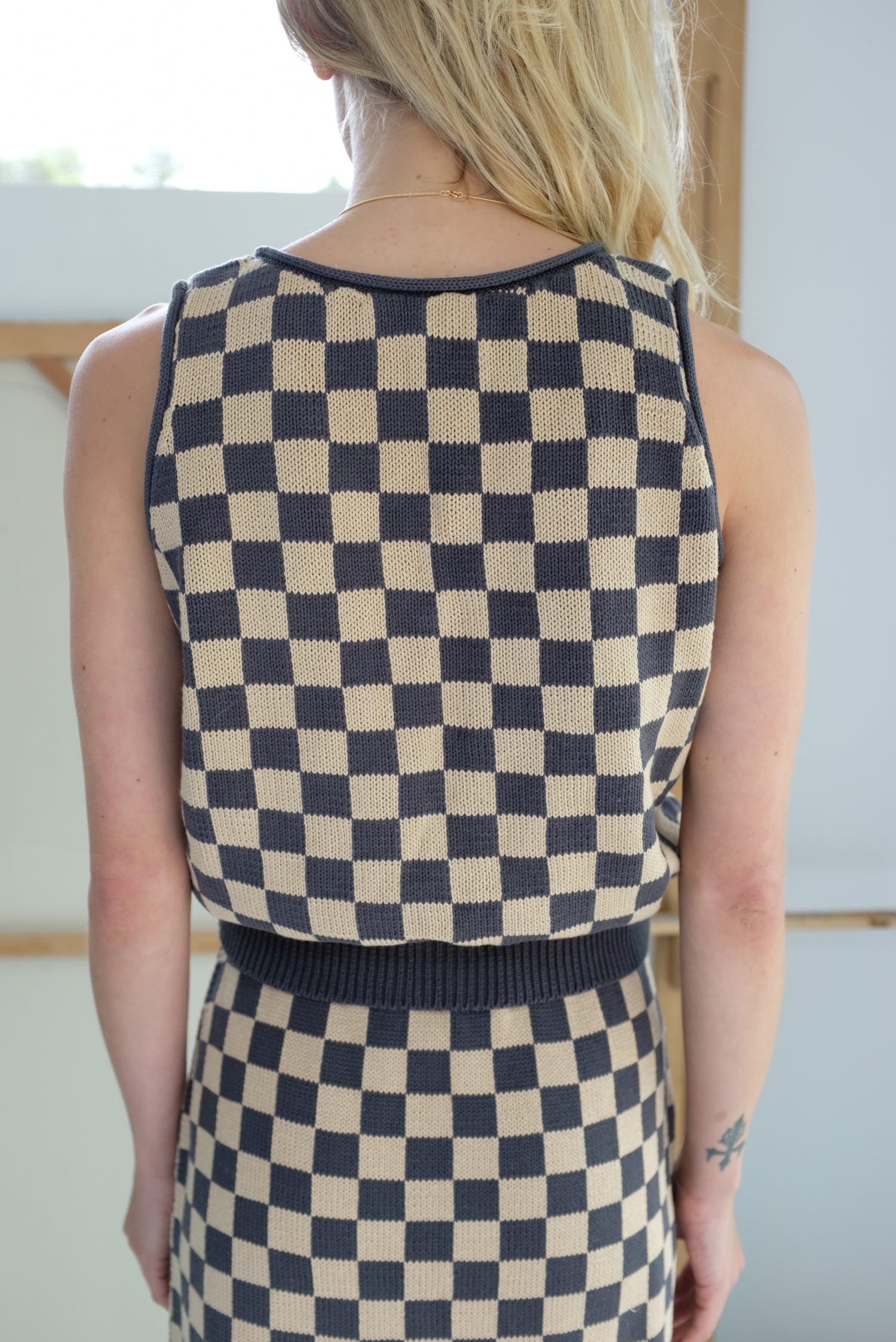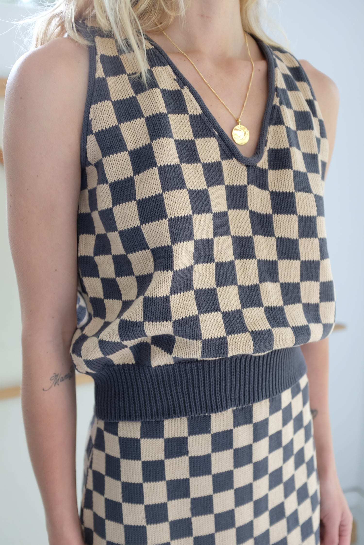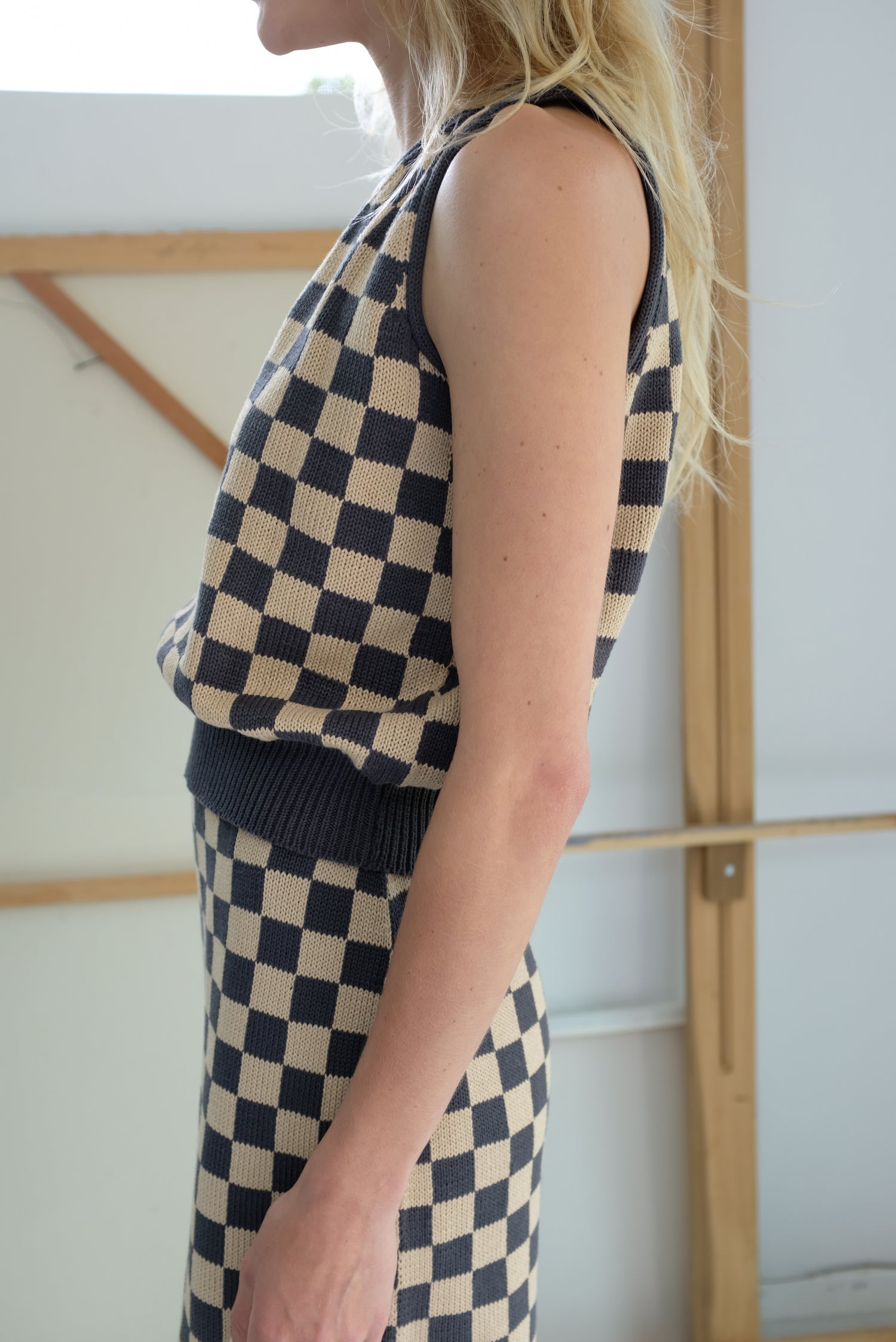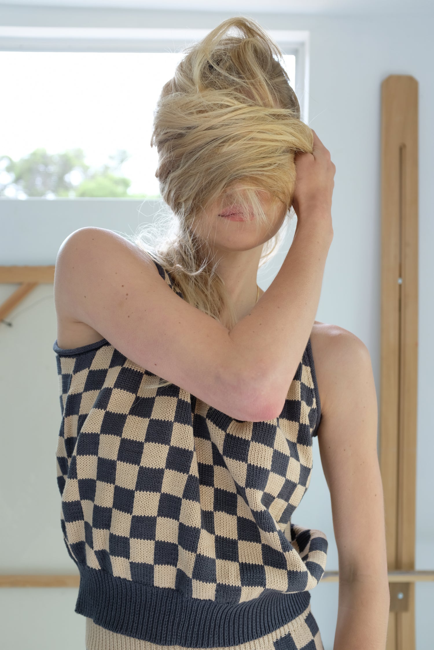 Hand knit v-neck top, sleeveless, rests at true waist, flattering feminine cut. Rolled edges at neckline and armholes, ribbed hem that defines the waist. 100% medium weight cotton. Soft washable cotton.