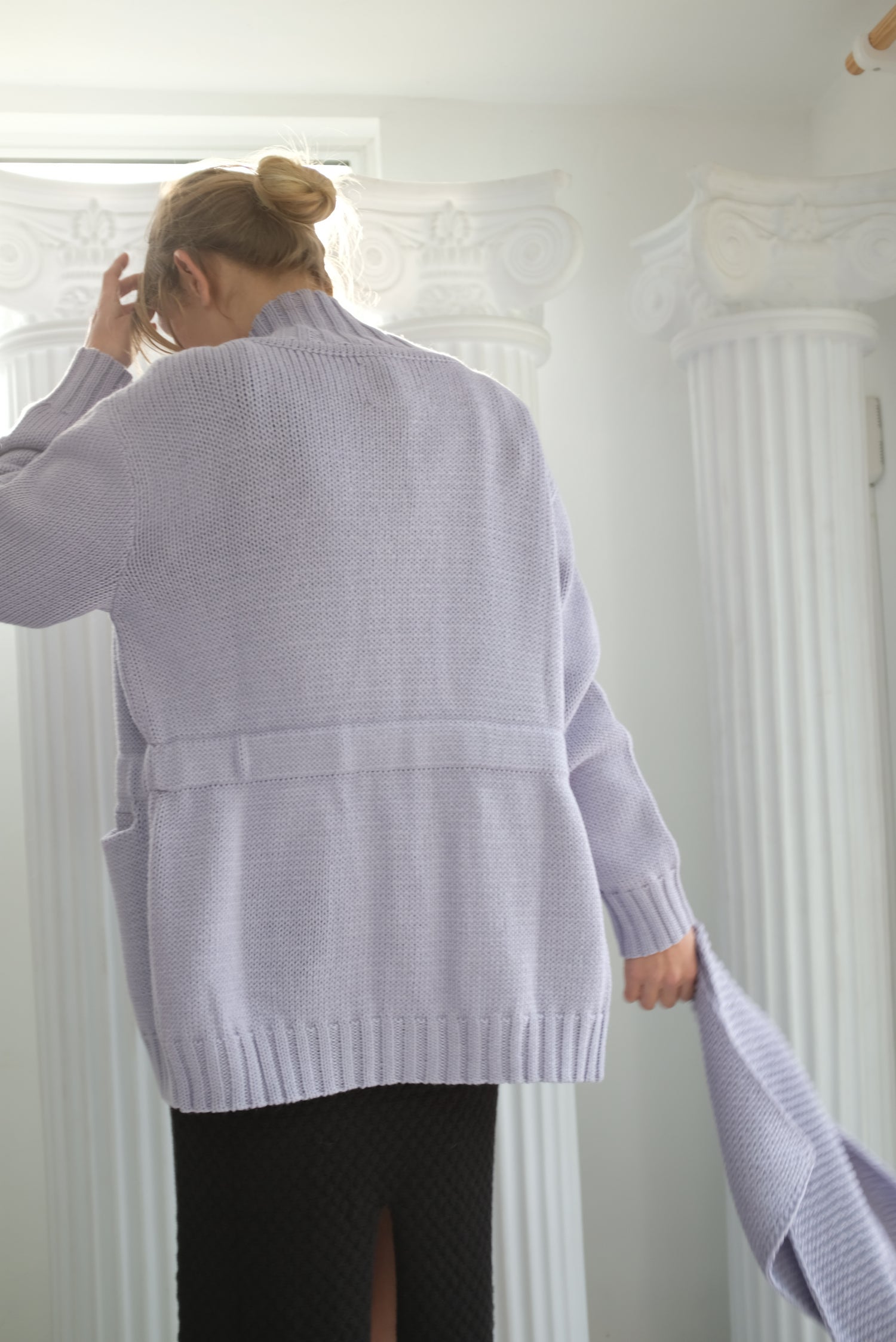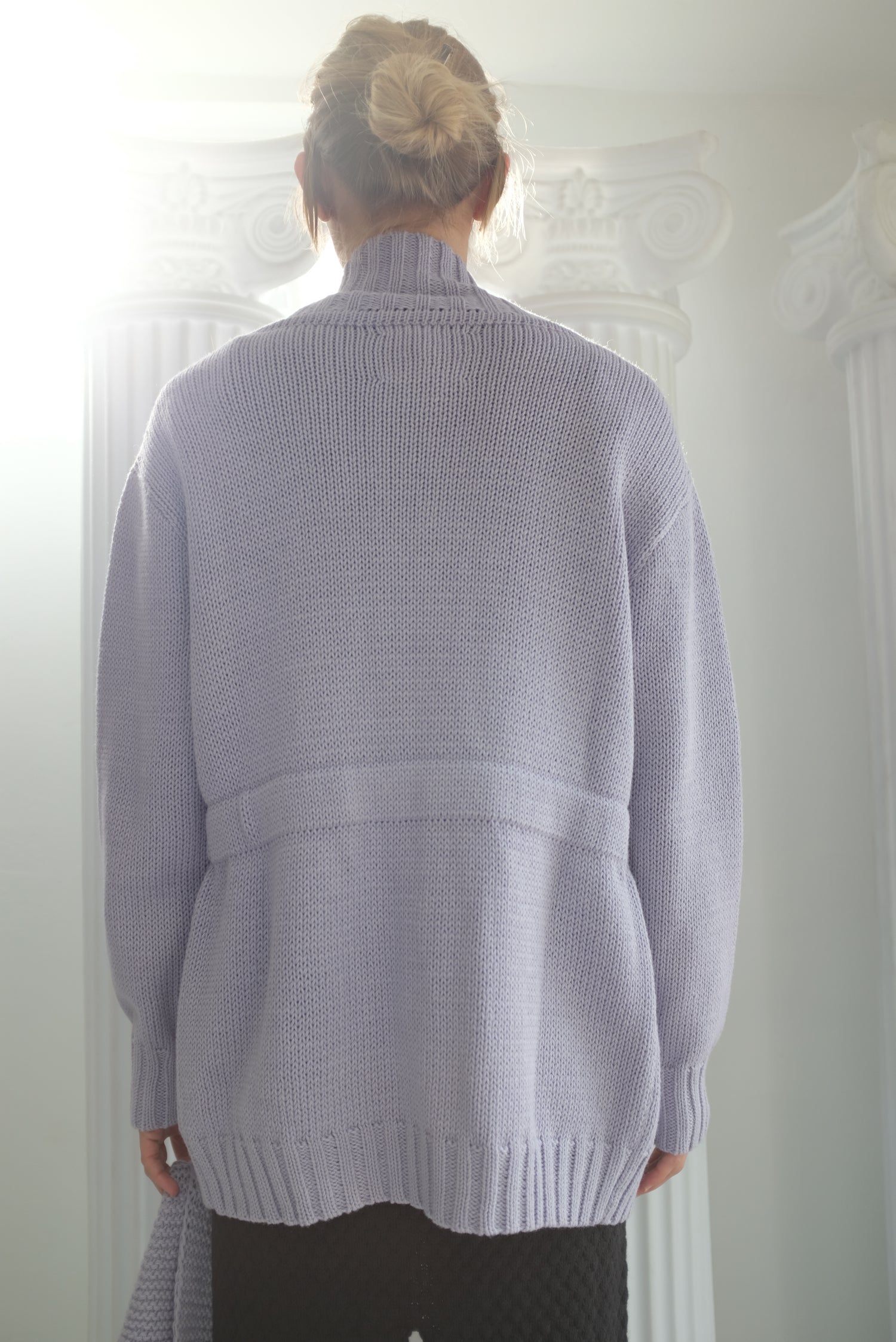 Long and warm, front pockets, high ribbed collar, every-day go-to knit outerwear. Ever so slightly oversized, with a semi fitted waist, and internal elastic structure, encouraging a gentle hourglass silhouette. Substantial weight knit.