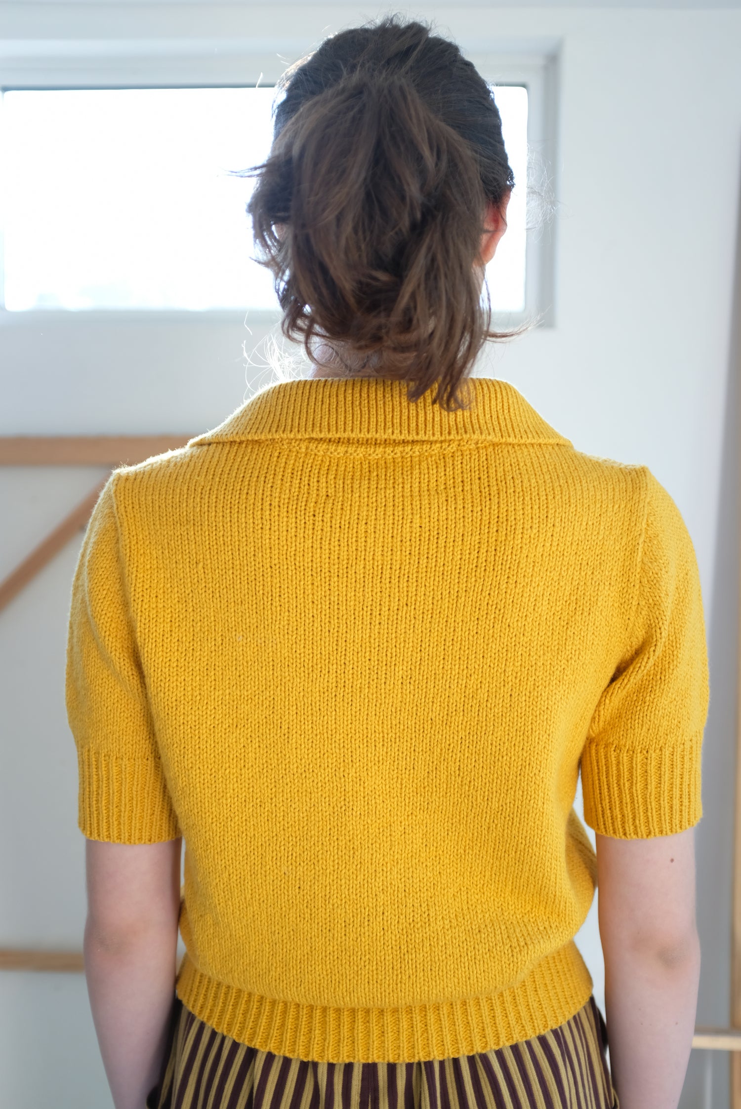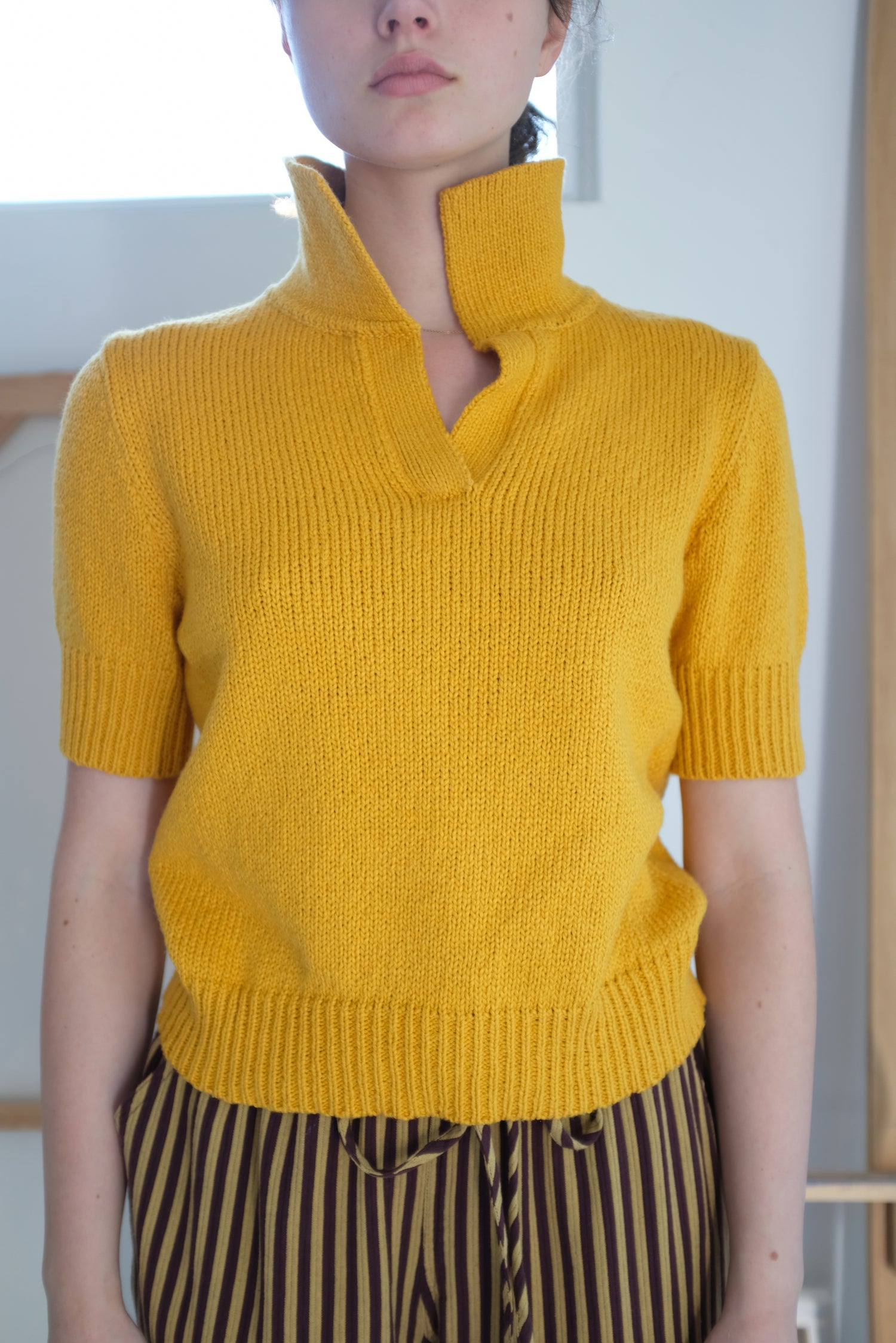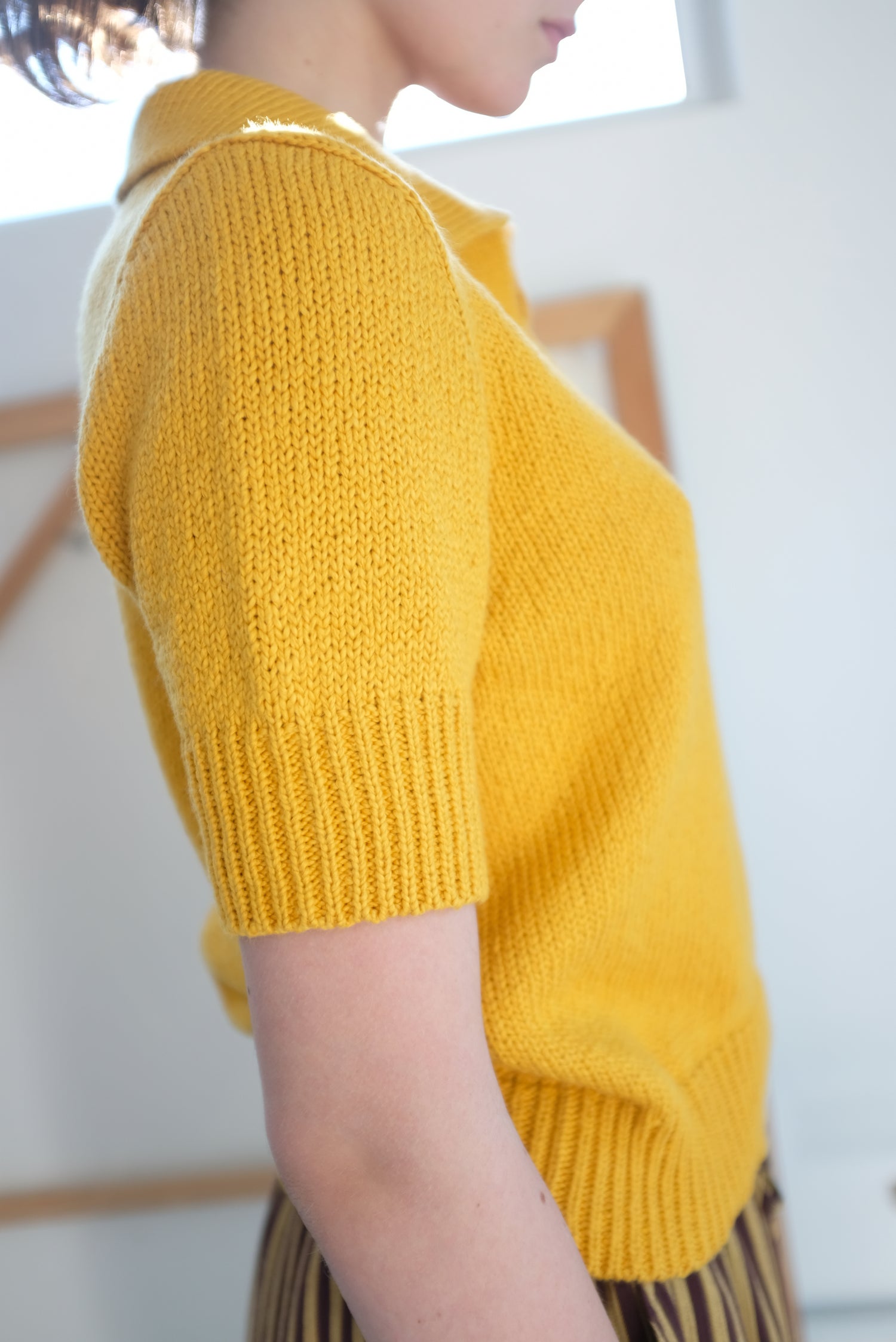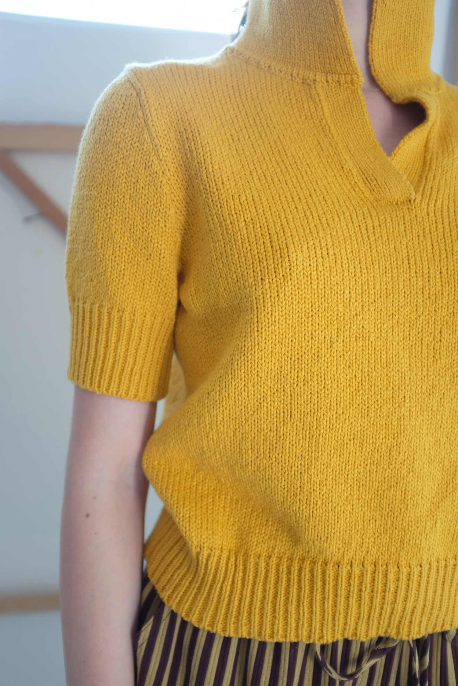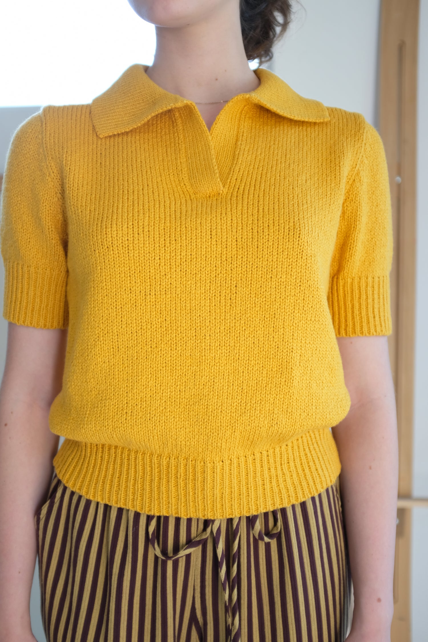 Hand knit polo sweater top, super soft. Perfect flattering fit, collared v-neck. Runs true to size. Carmella is wearing a small/medium. 100% Cotton.