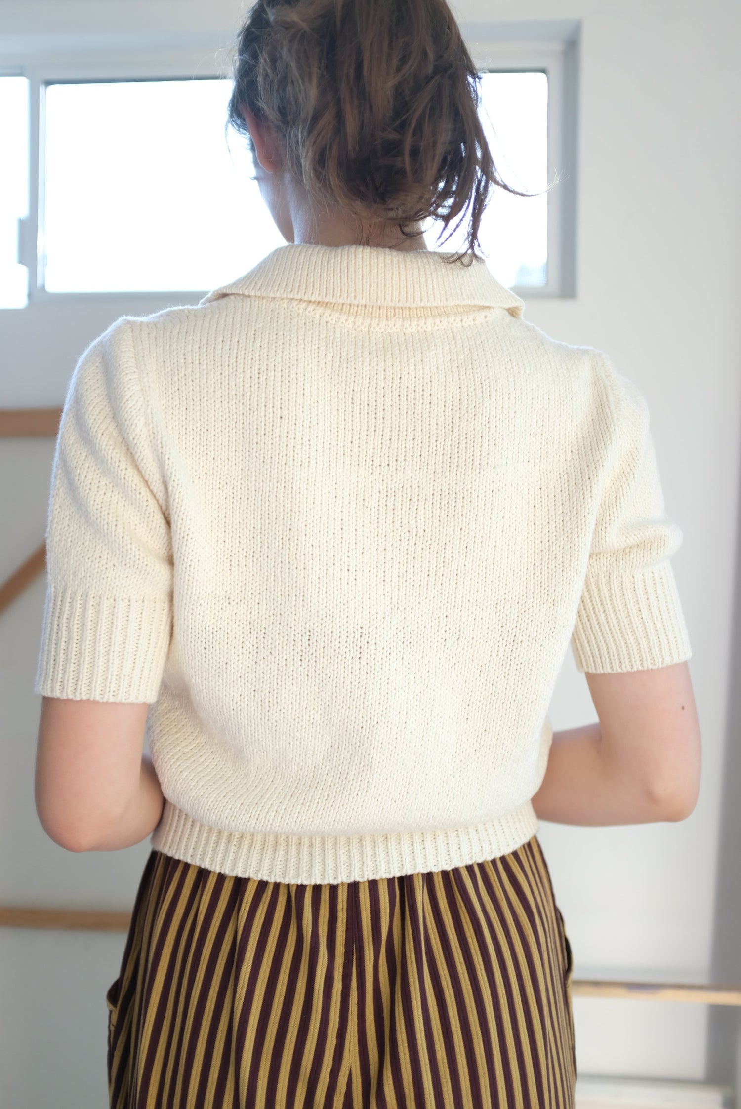 Hand knit polo sweater top, super soft. Perfect flattering fit, collared v-neck. Runs true to size. Carmella is wearing a small/medium. 100% Cotton.