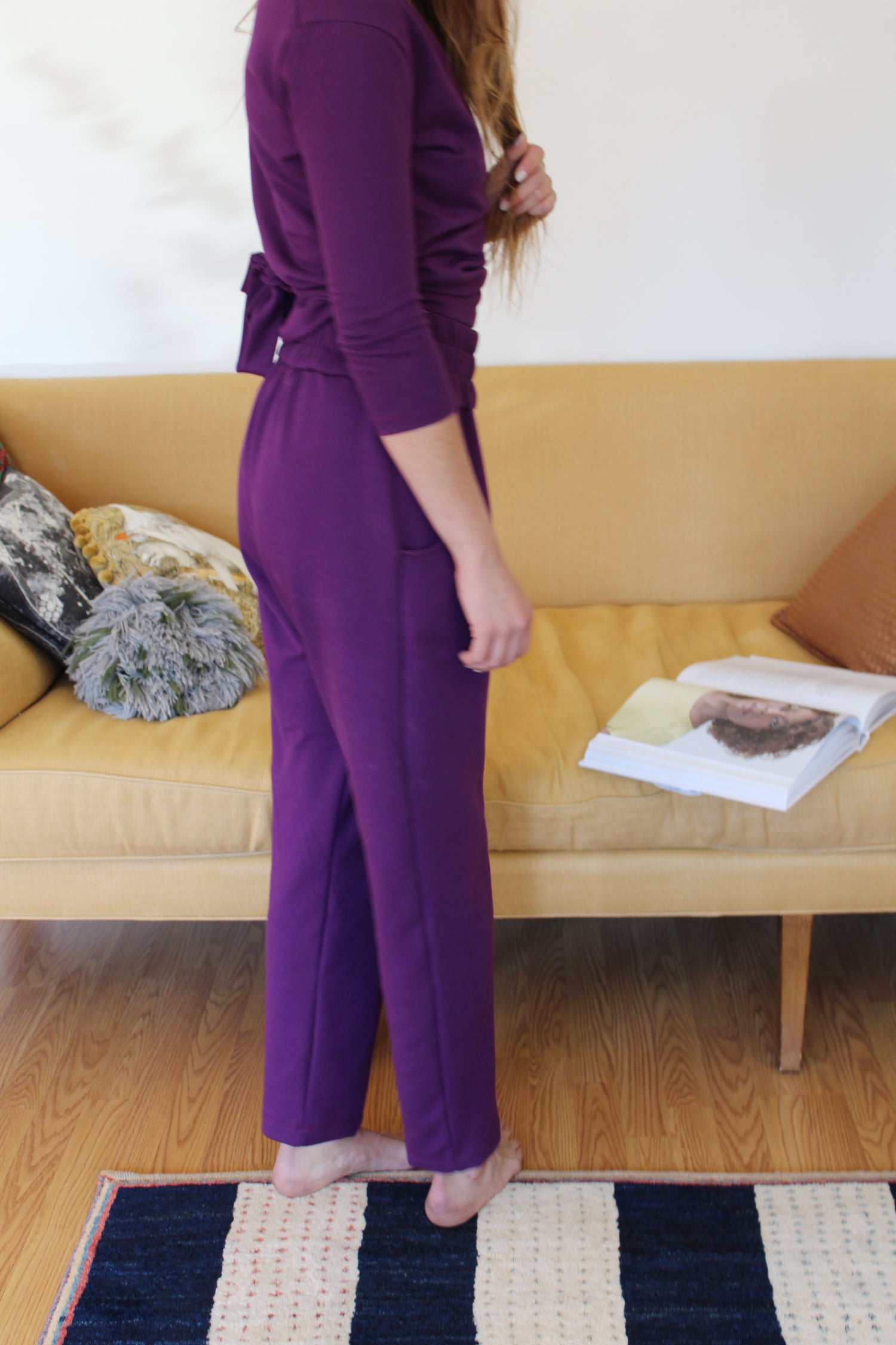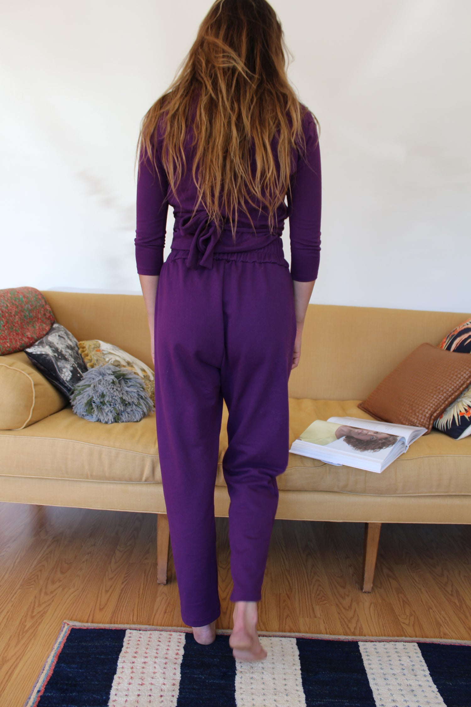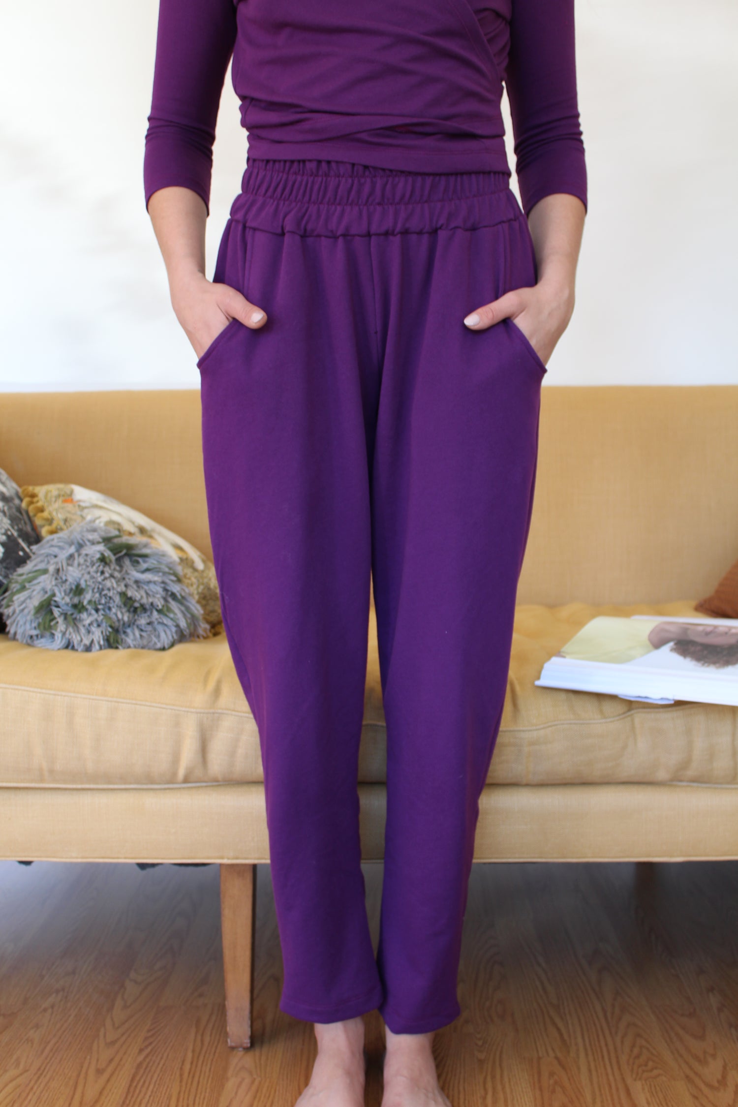 100% Organic cotton terry, hand dyed in small batches. Very gentle high and double wide waistband. Side pockets, loose fitting, running roomy.