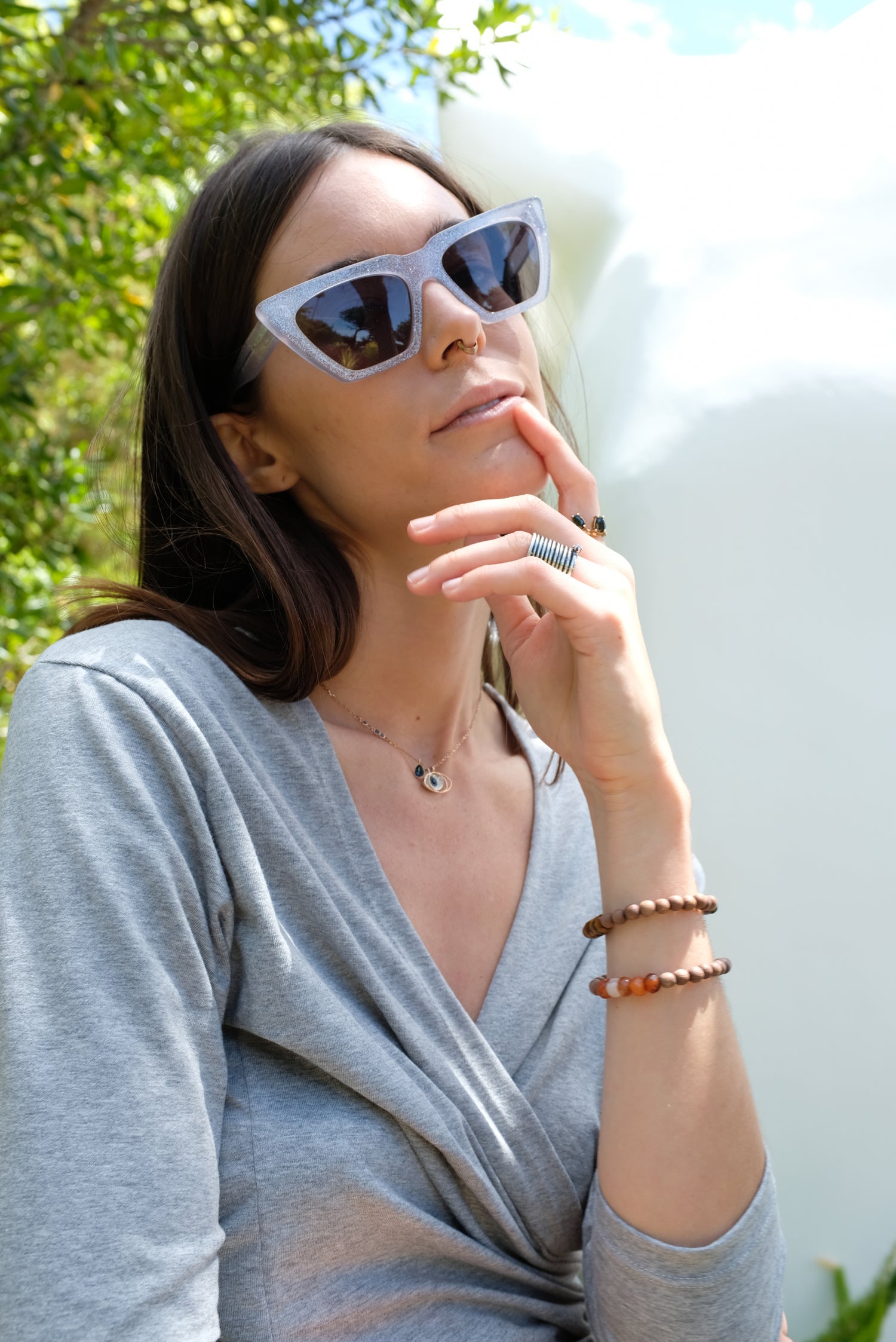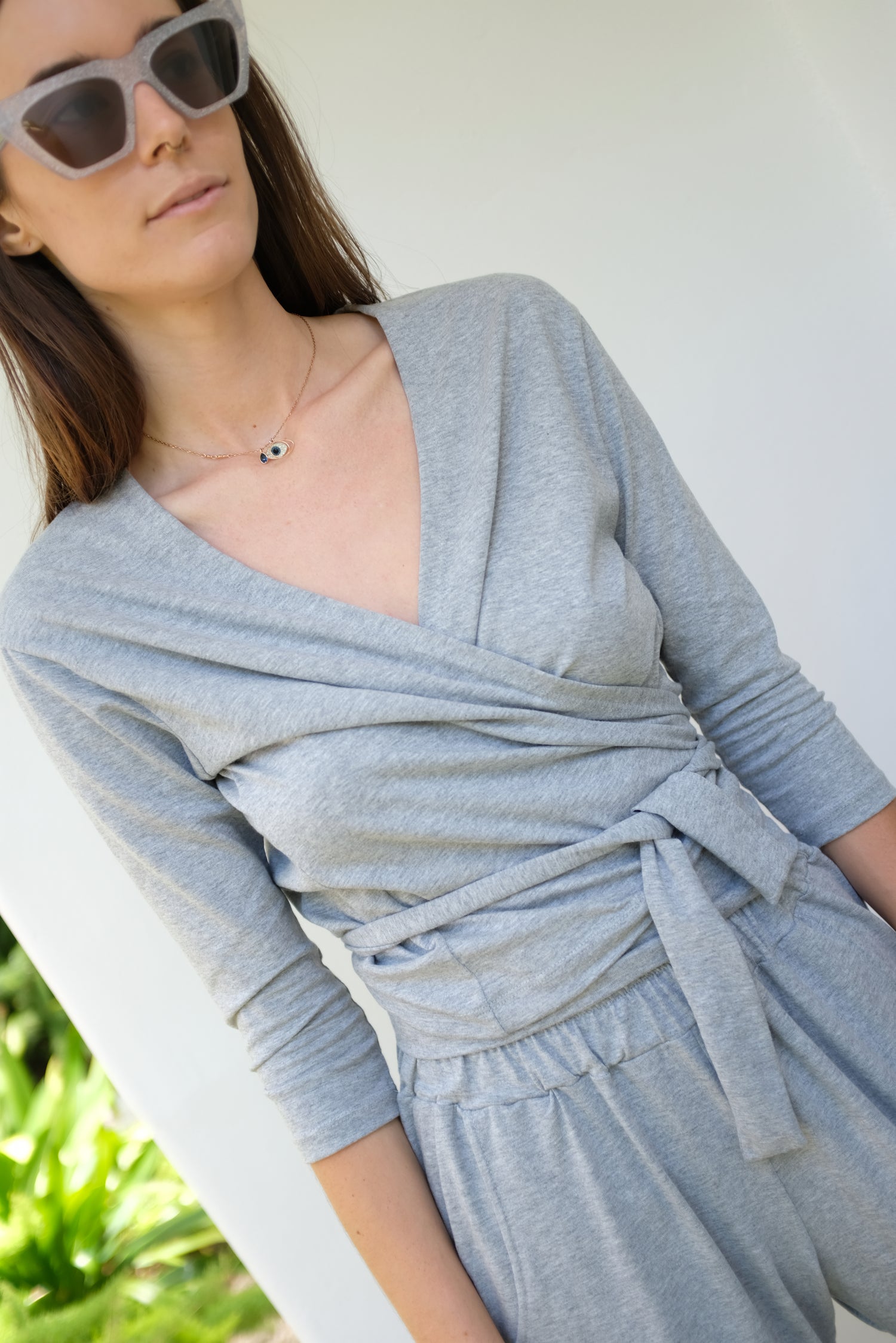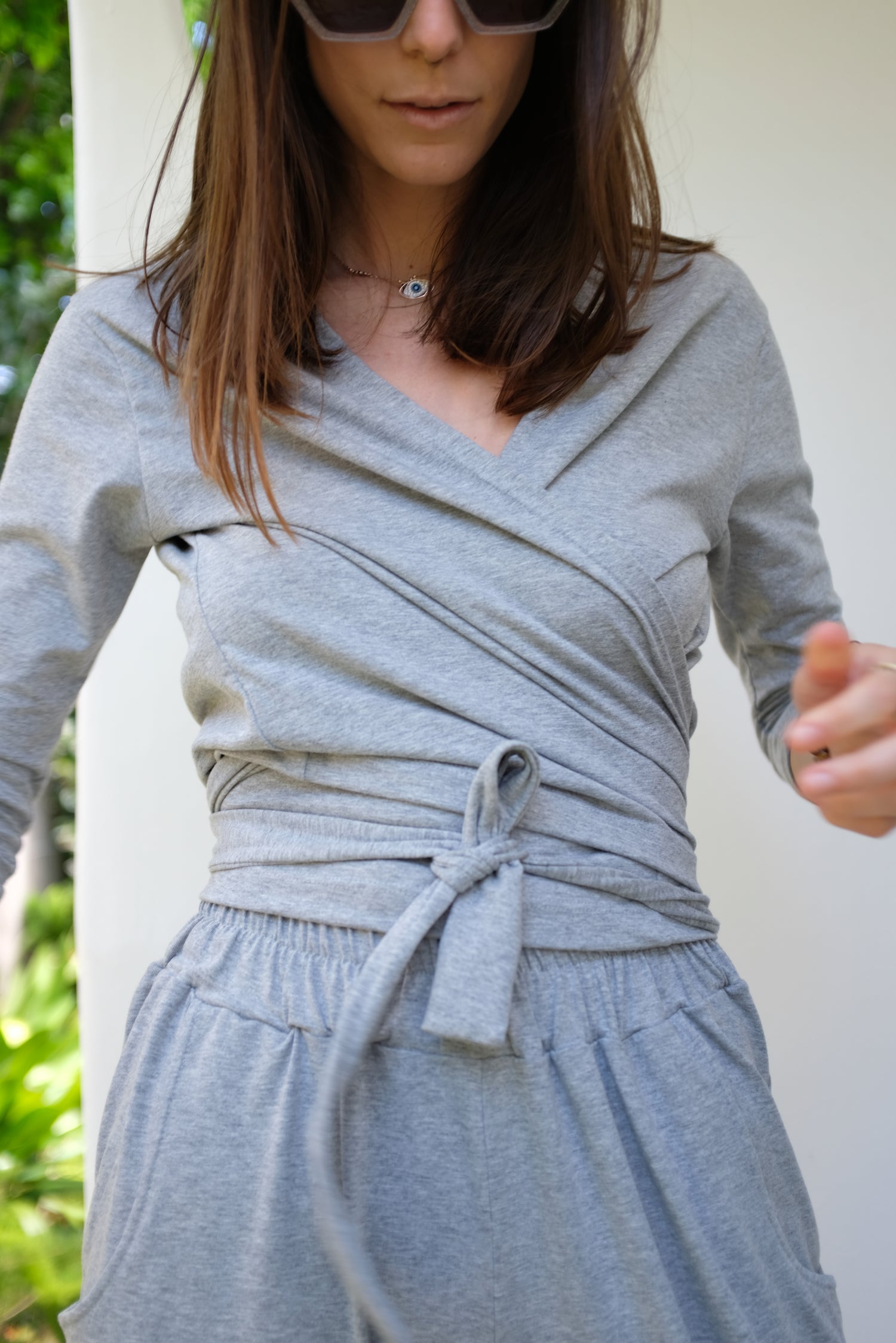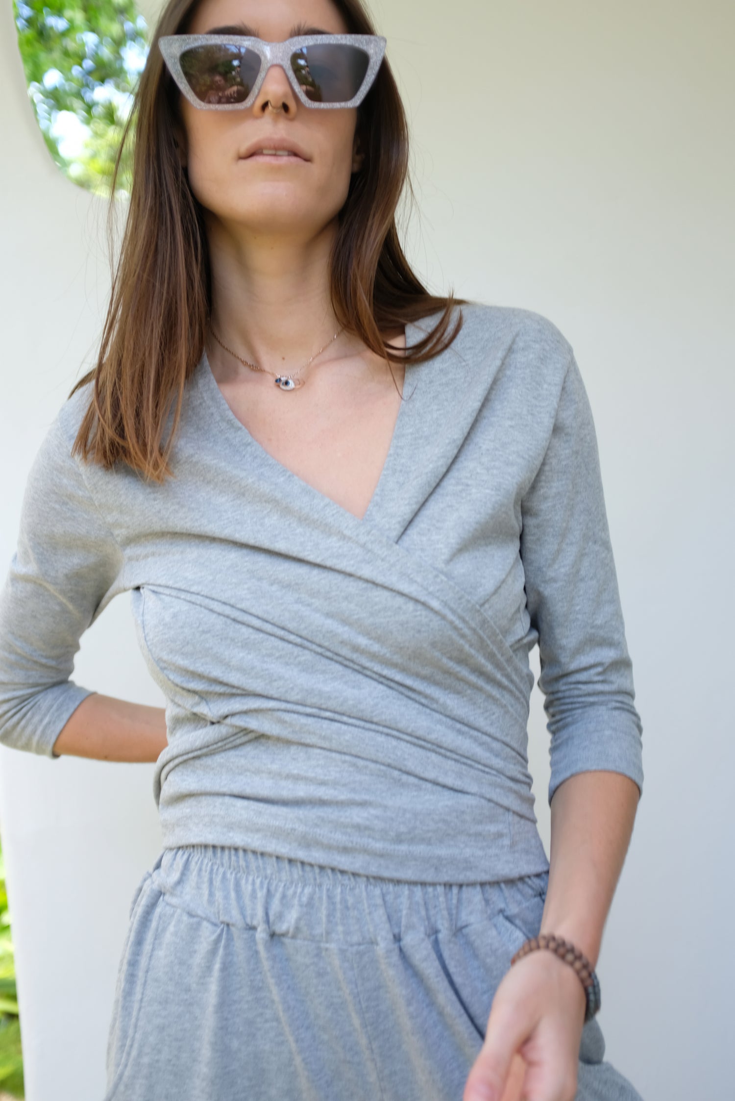 100% Heathered grey organic cotton jersey. Versatile wearings, tie in front, back, wear fitted or loose, or open. One size fits most, 3/4 sleeve, wear to the office or the gym!
