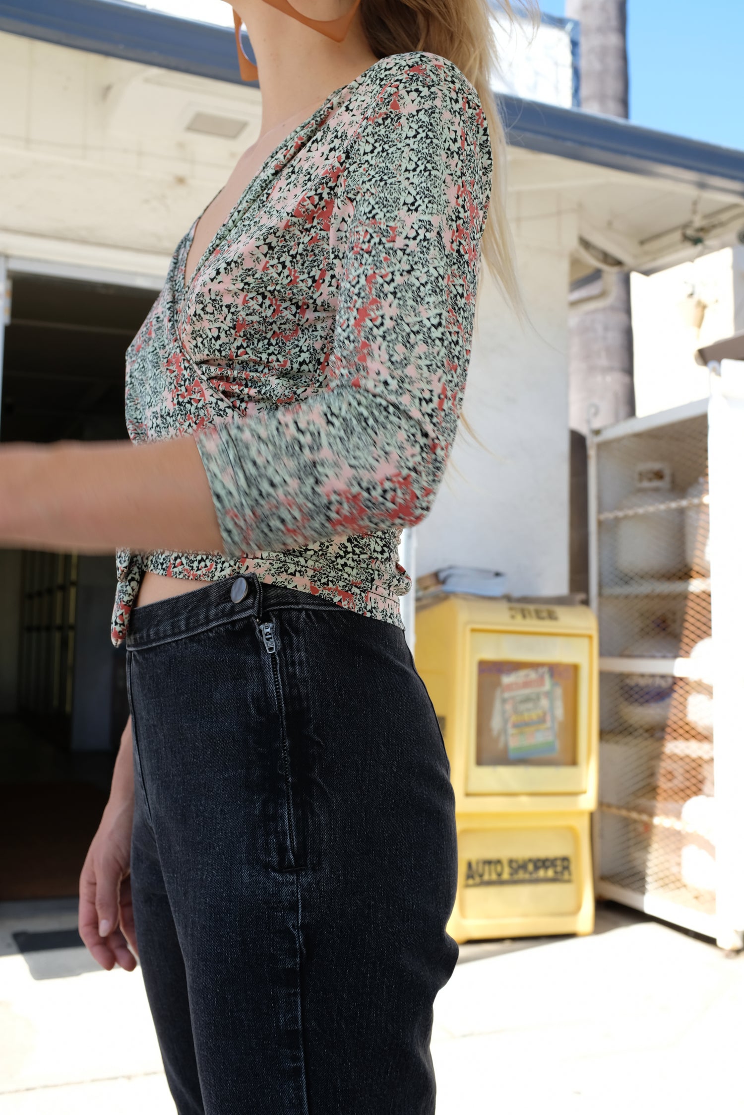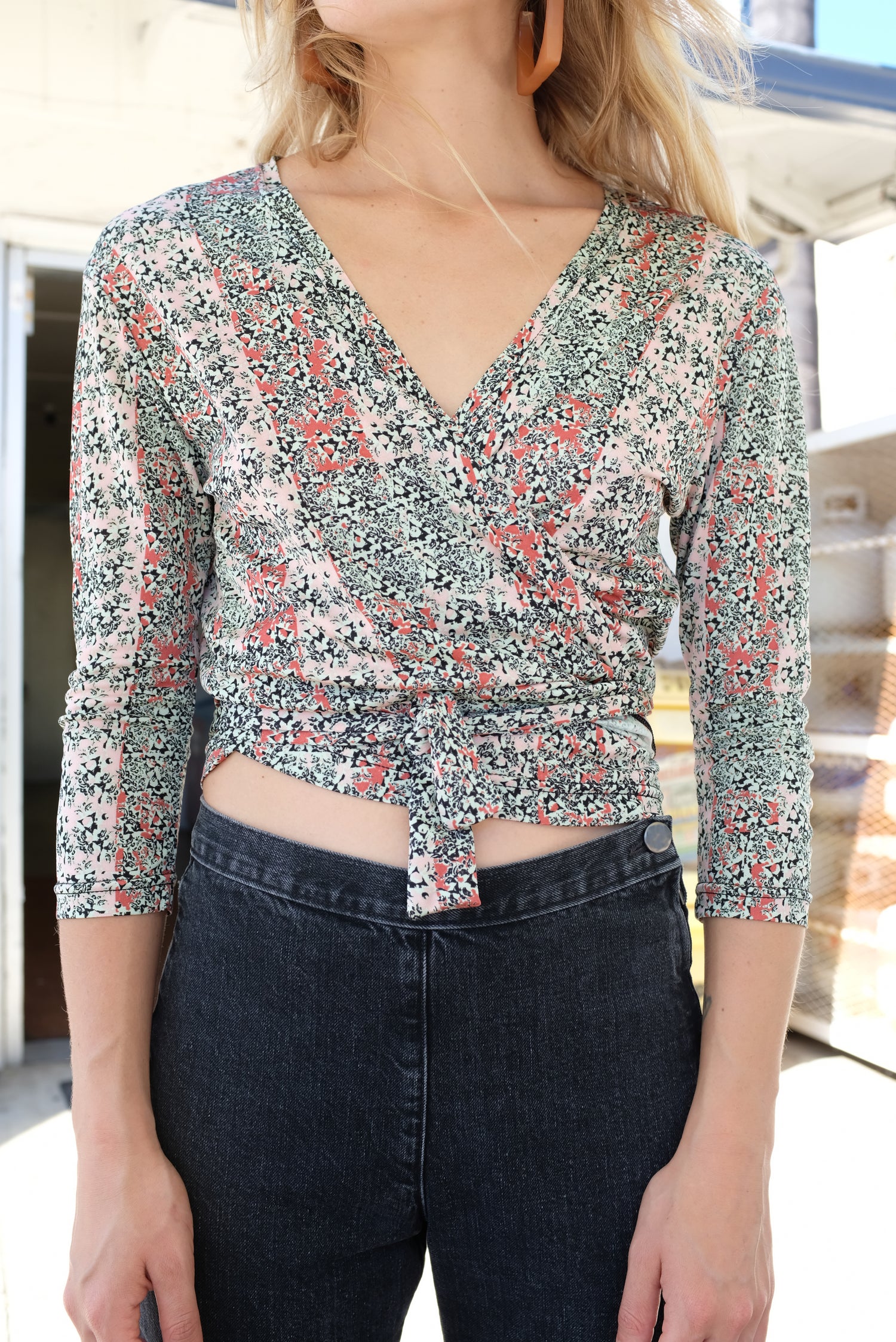 100% Silk jersey. One of a kind limited edition Lips and Noses print. Versatile wearings, tie in front, back, wear fitted or loose, or open. One size fits most, 3/4 sleeve, wear to the office or for a night out.