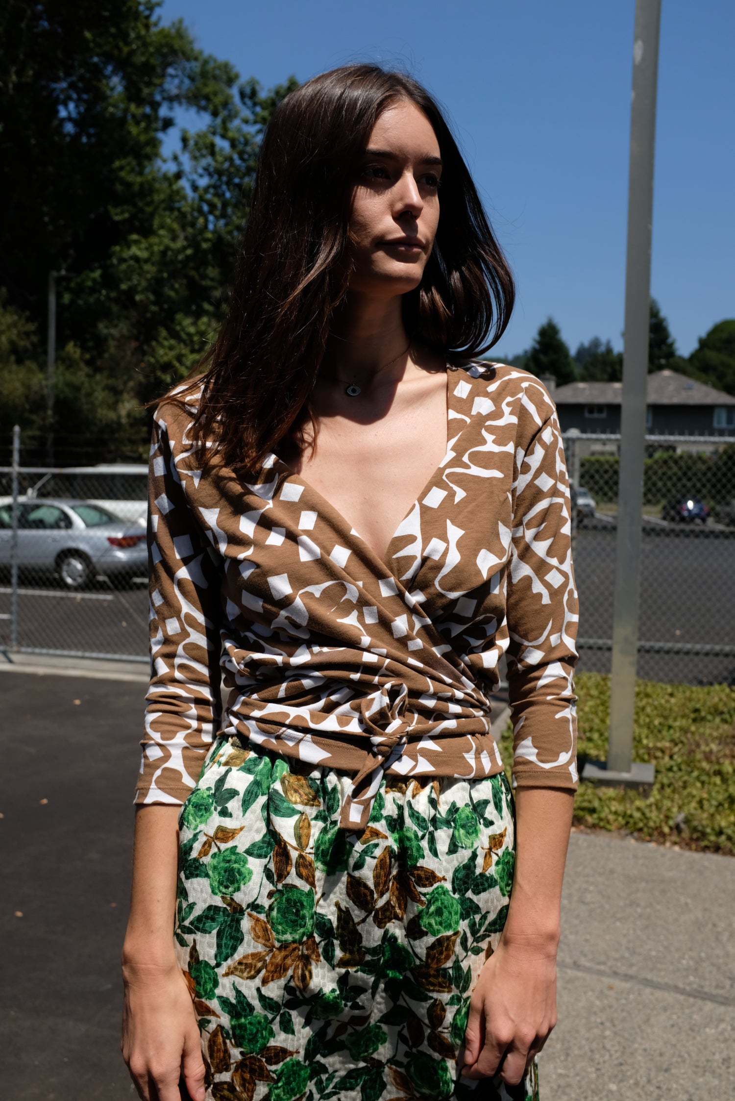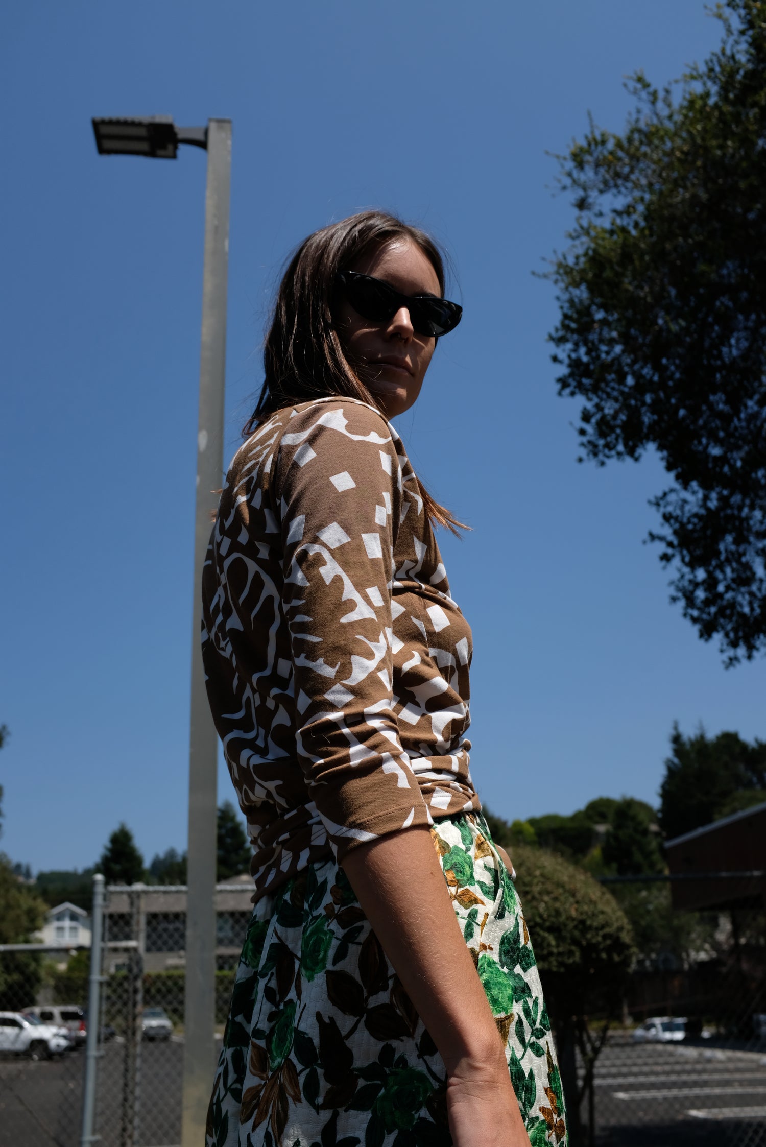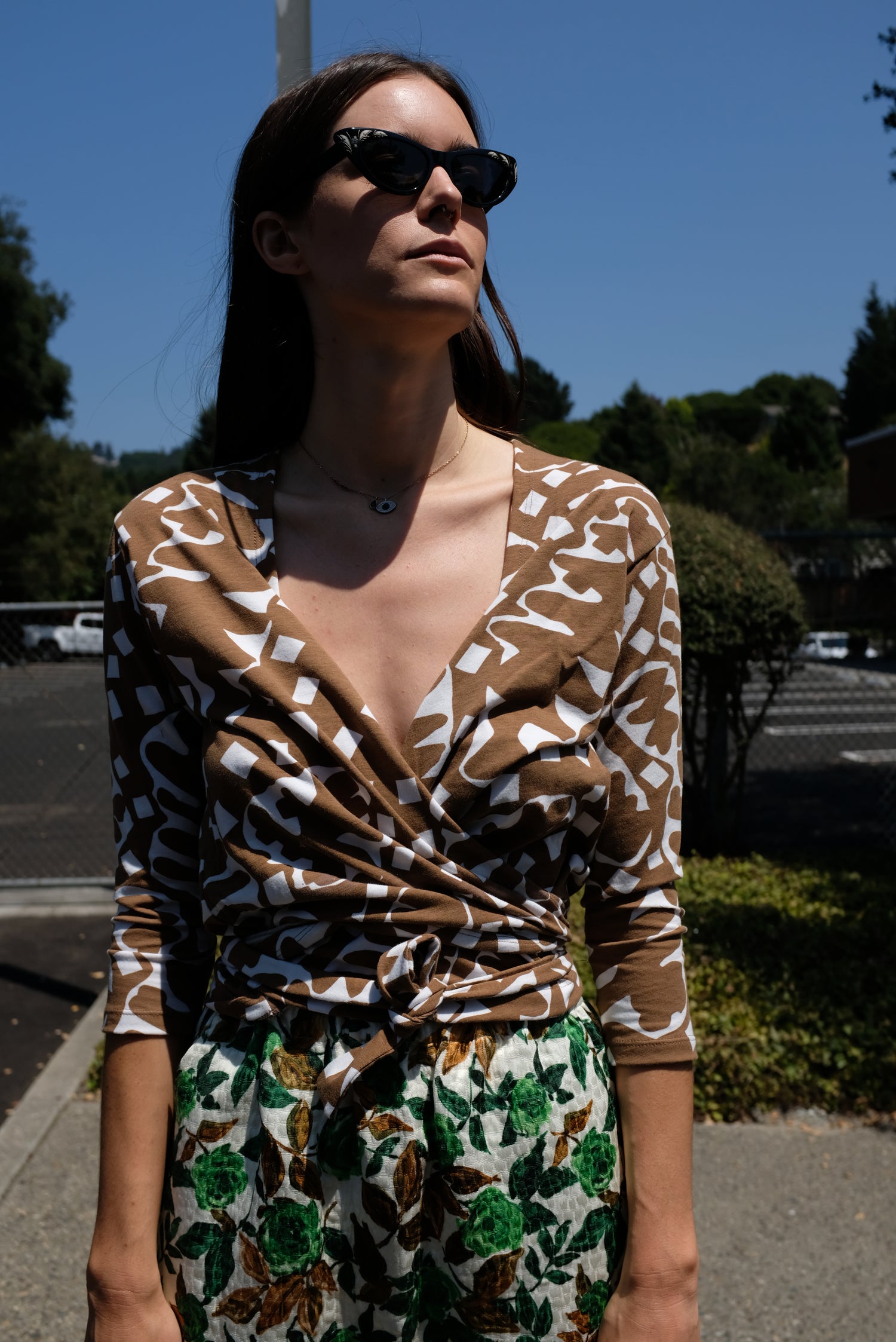 Limited edition Mexican Divorce print, hand printed, coco brown on ivory. 100% organic cotton jersey. Versatile wearings, tie in front, back, wear fitted or loose, or open. One size fits most, 3/4 sleeve, wear to the office or the gym!