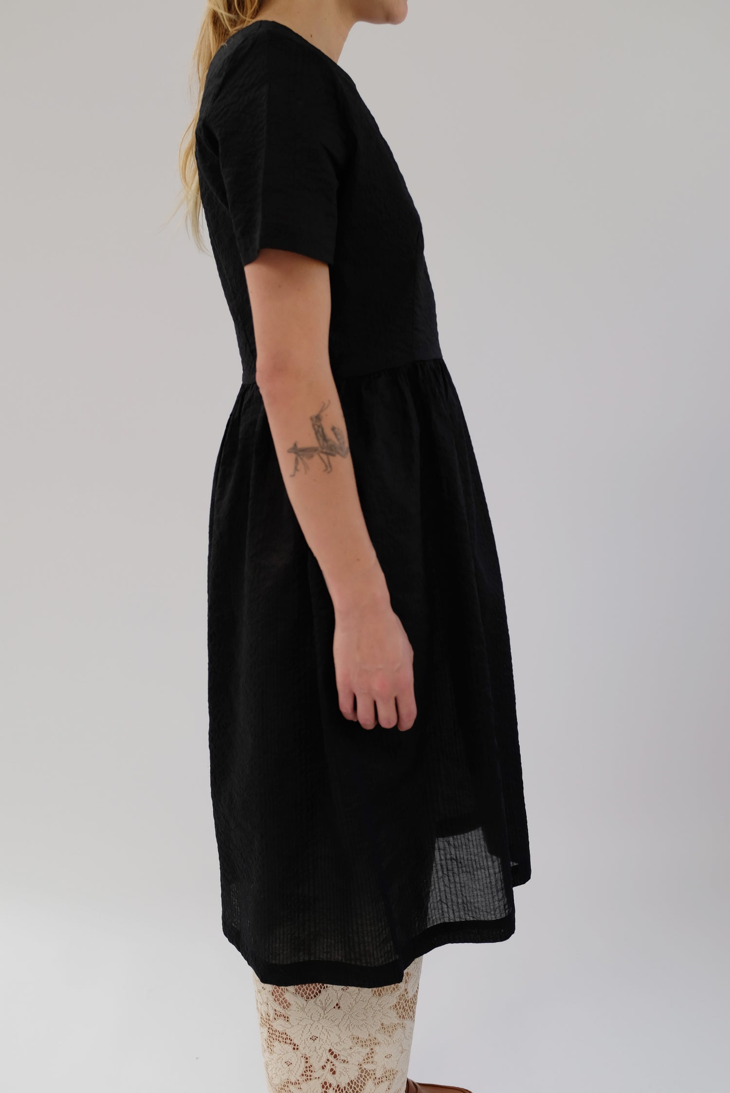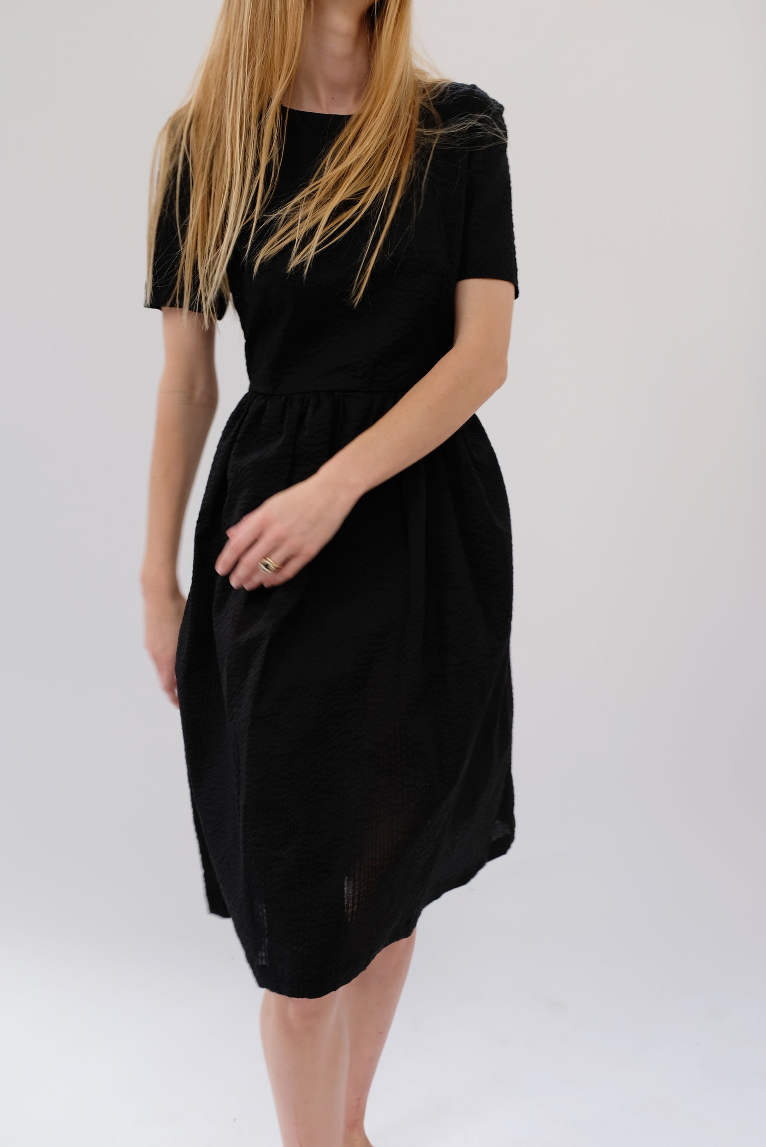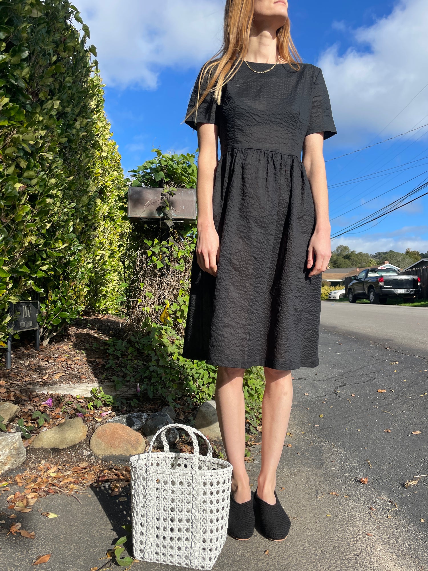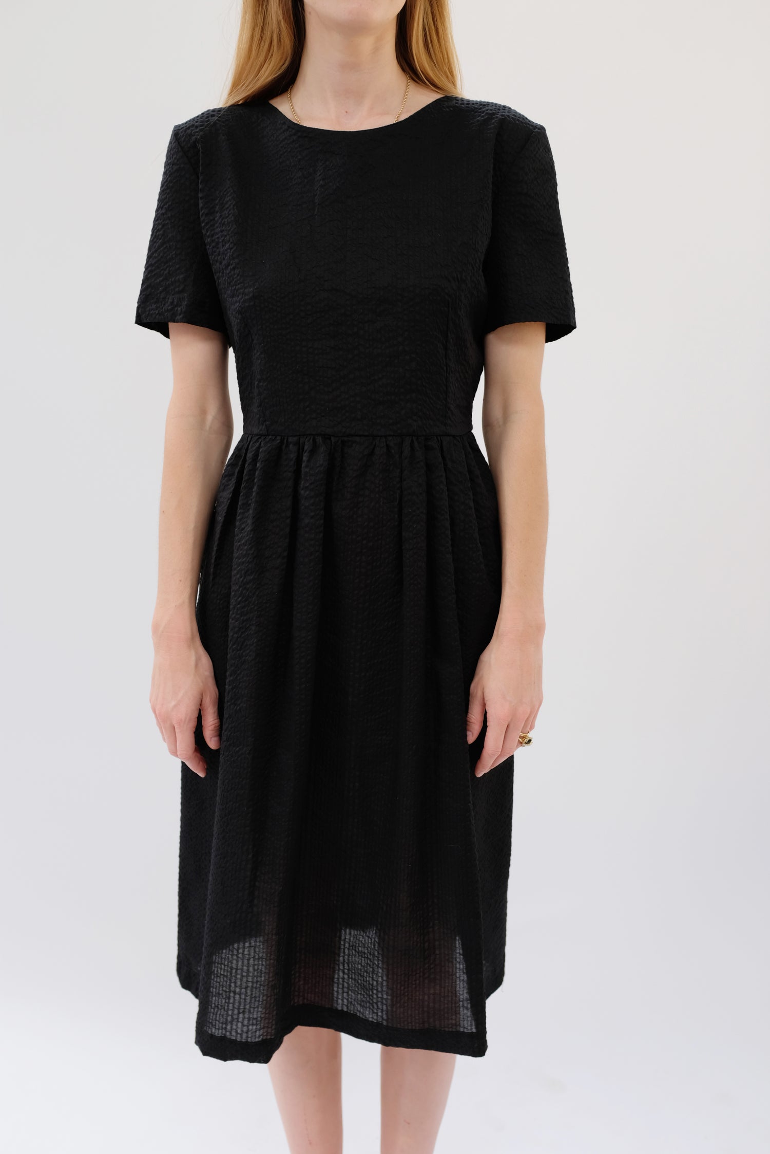 100% Woven textured Japanese cotton, fitted waist and upper, short sleeve, full skirt hits just below knee, zipper in back. Semi-sheer fabric, classic fit. Total length 41"